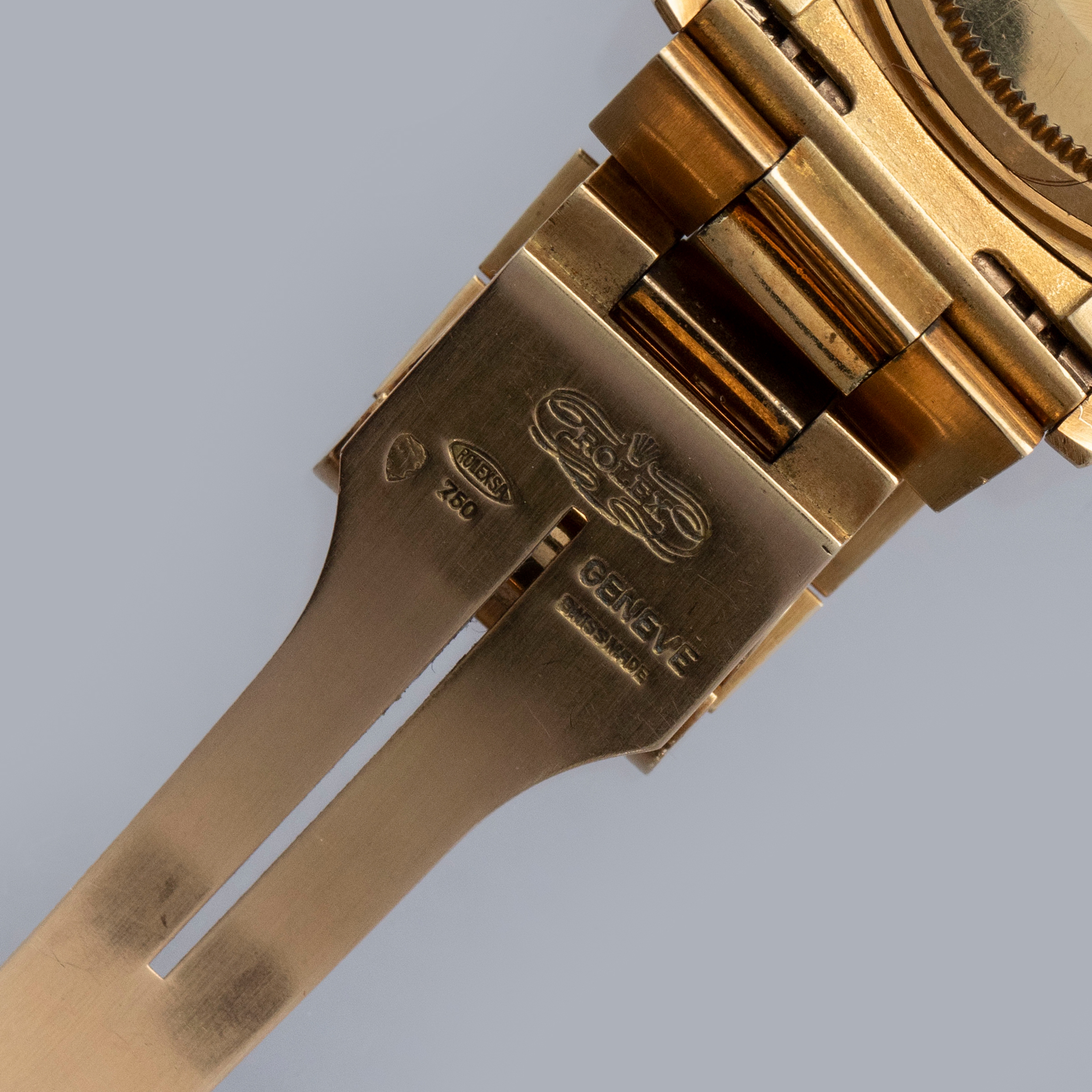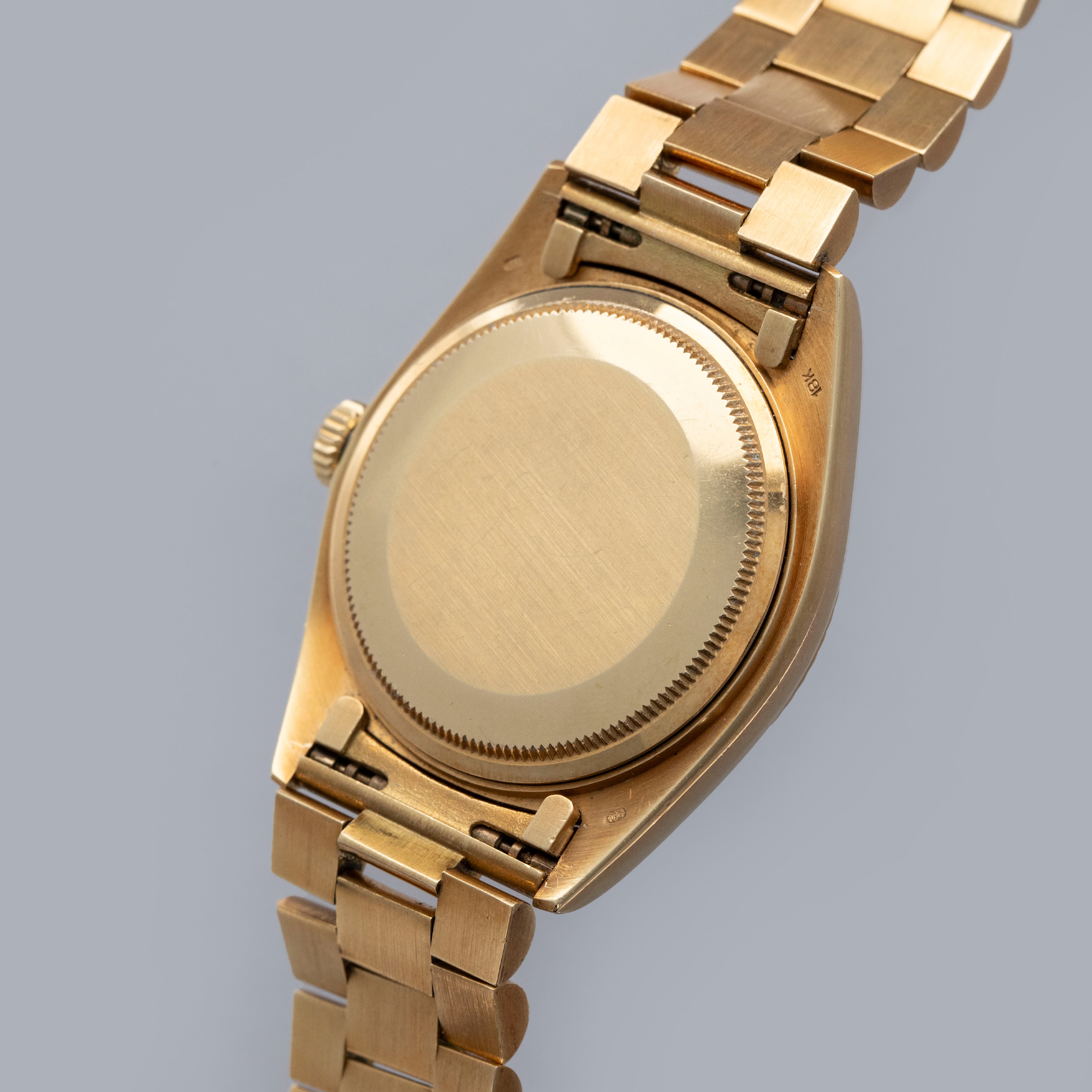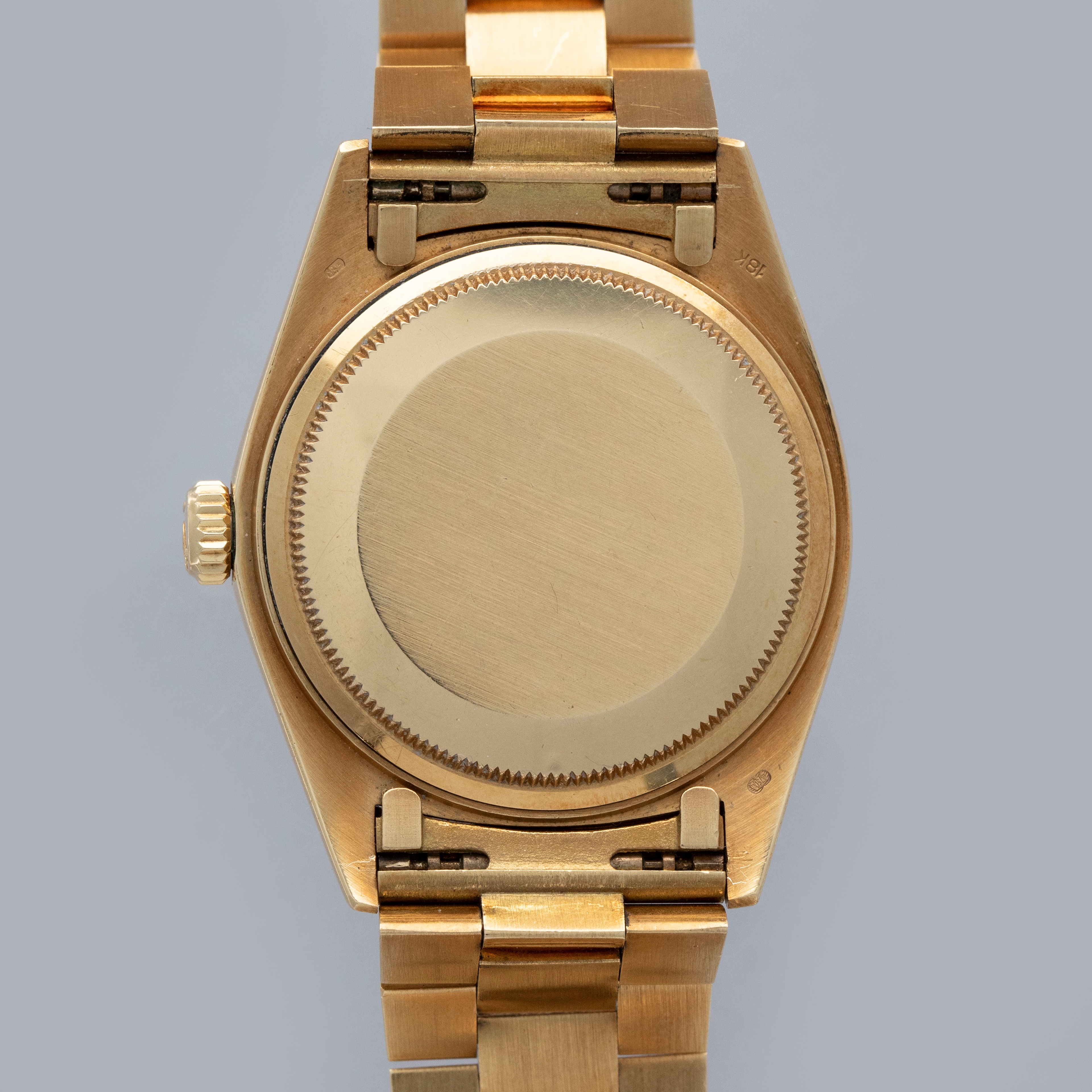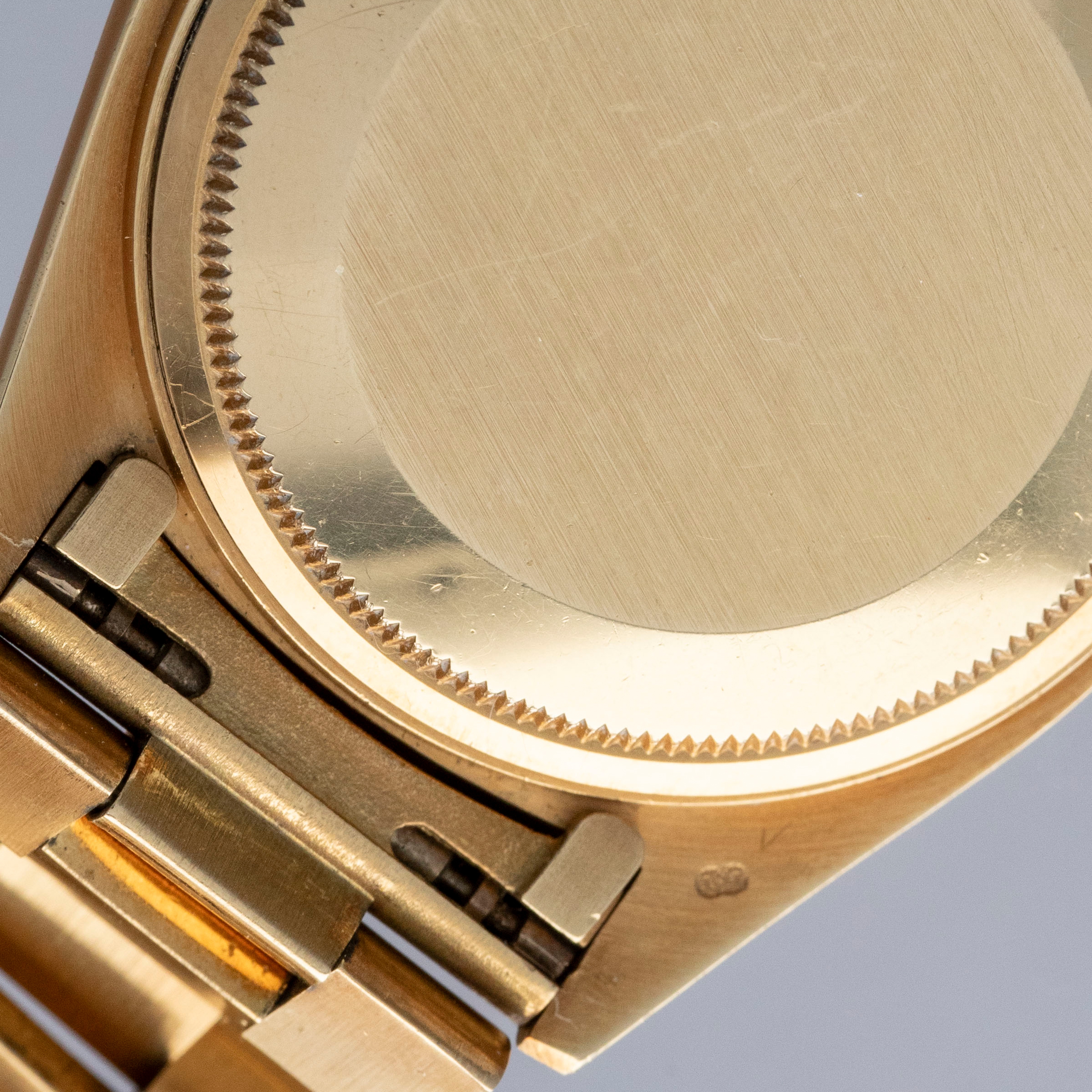The watch is in overall excellent condition. The yellow gold case is excellent, with well-defined symmetrical lugs and some surface scratches, commensurate with a watch of this vintage. The hallmarks are all fully legible. The bezel is well defined. The blue so-called Buckley dial is in excellent condition, with a small amount of crazing around the lume plots and some light degradation around the dial edge. The yellow gold hands have some light patina but remain very clean. The yellow gold President bracelet has a concealed clasp, with some surface marks and moderate play between the links. The bracelet currently fits a 7 1/4” wrist and has 21 links, 4 of which are removable.