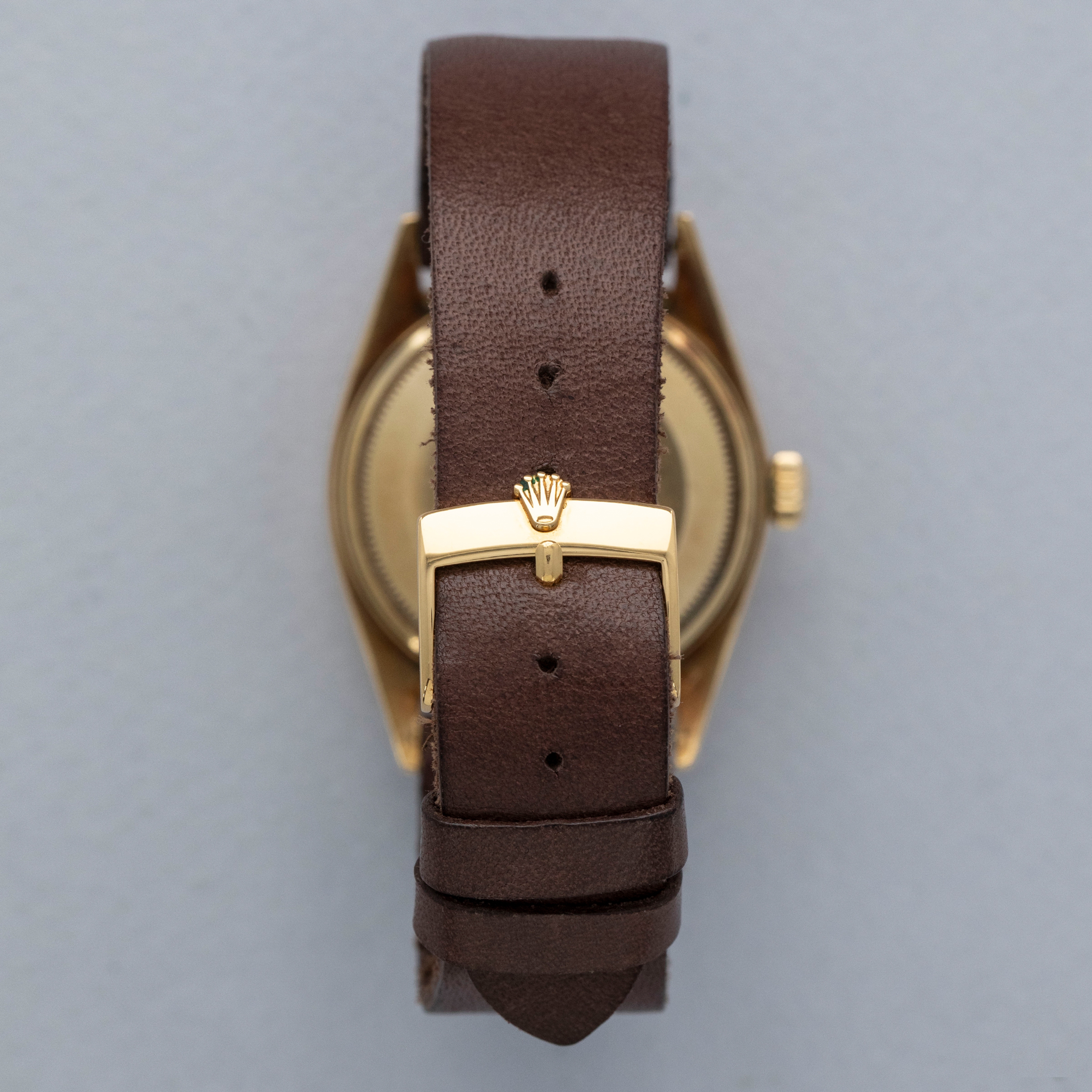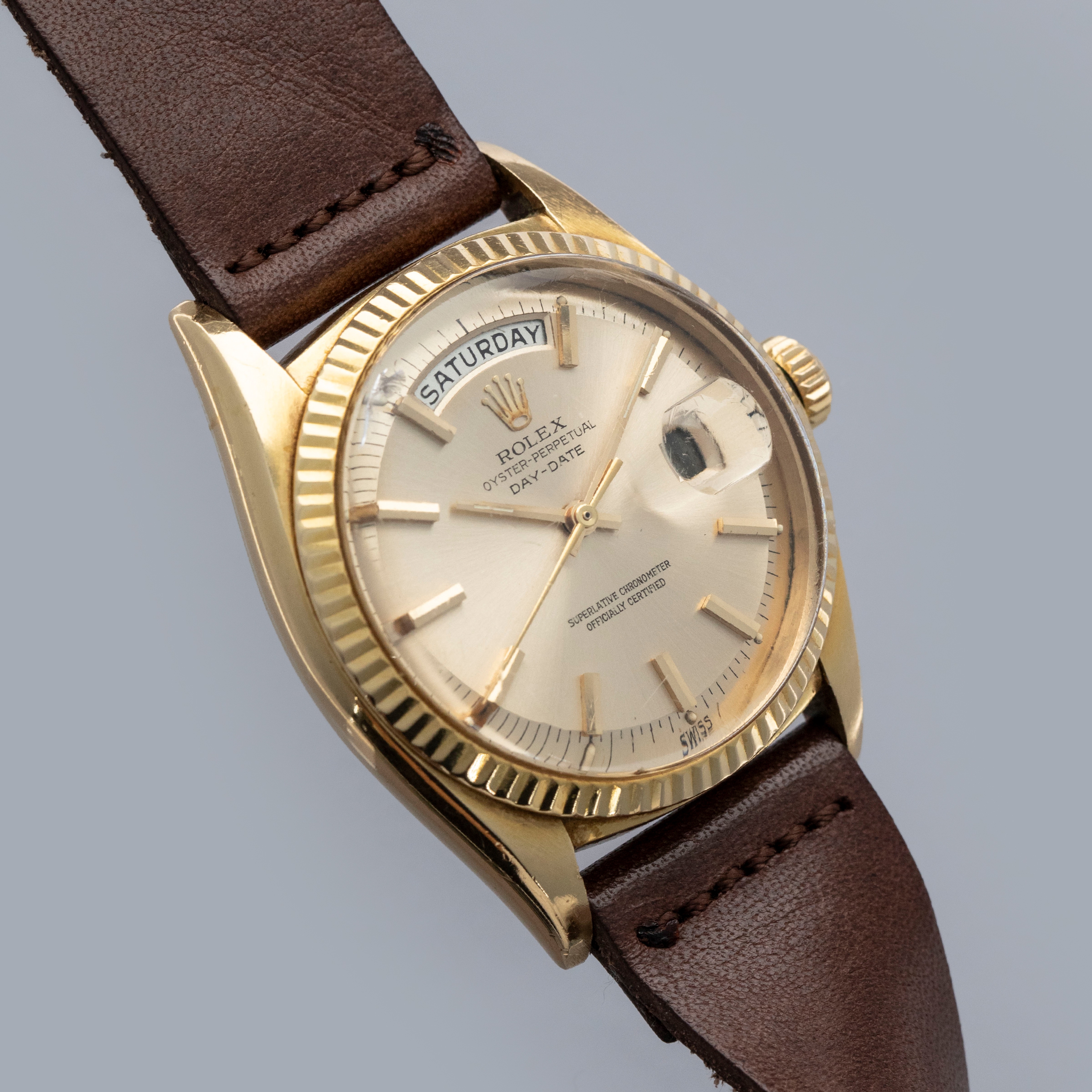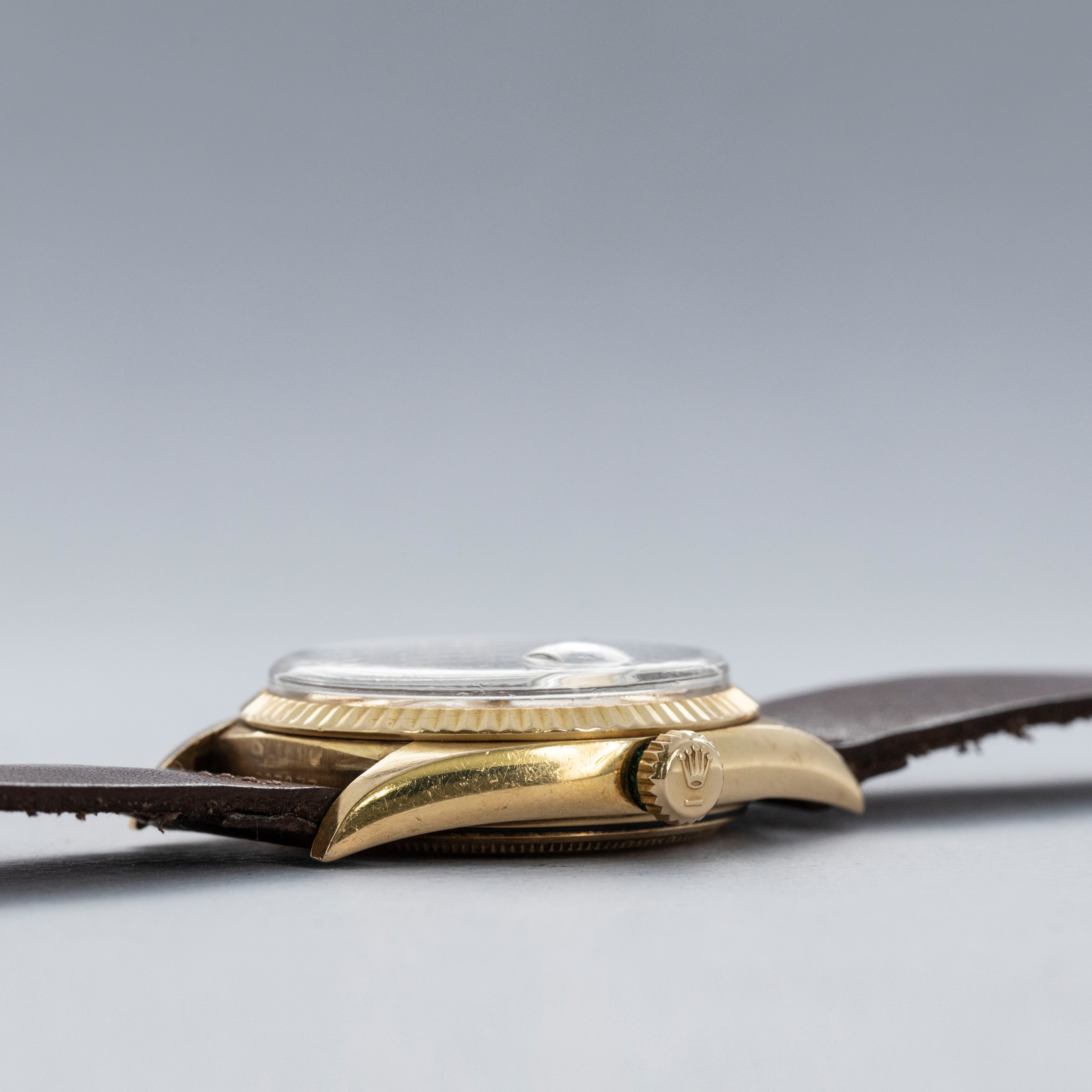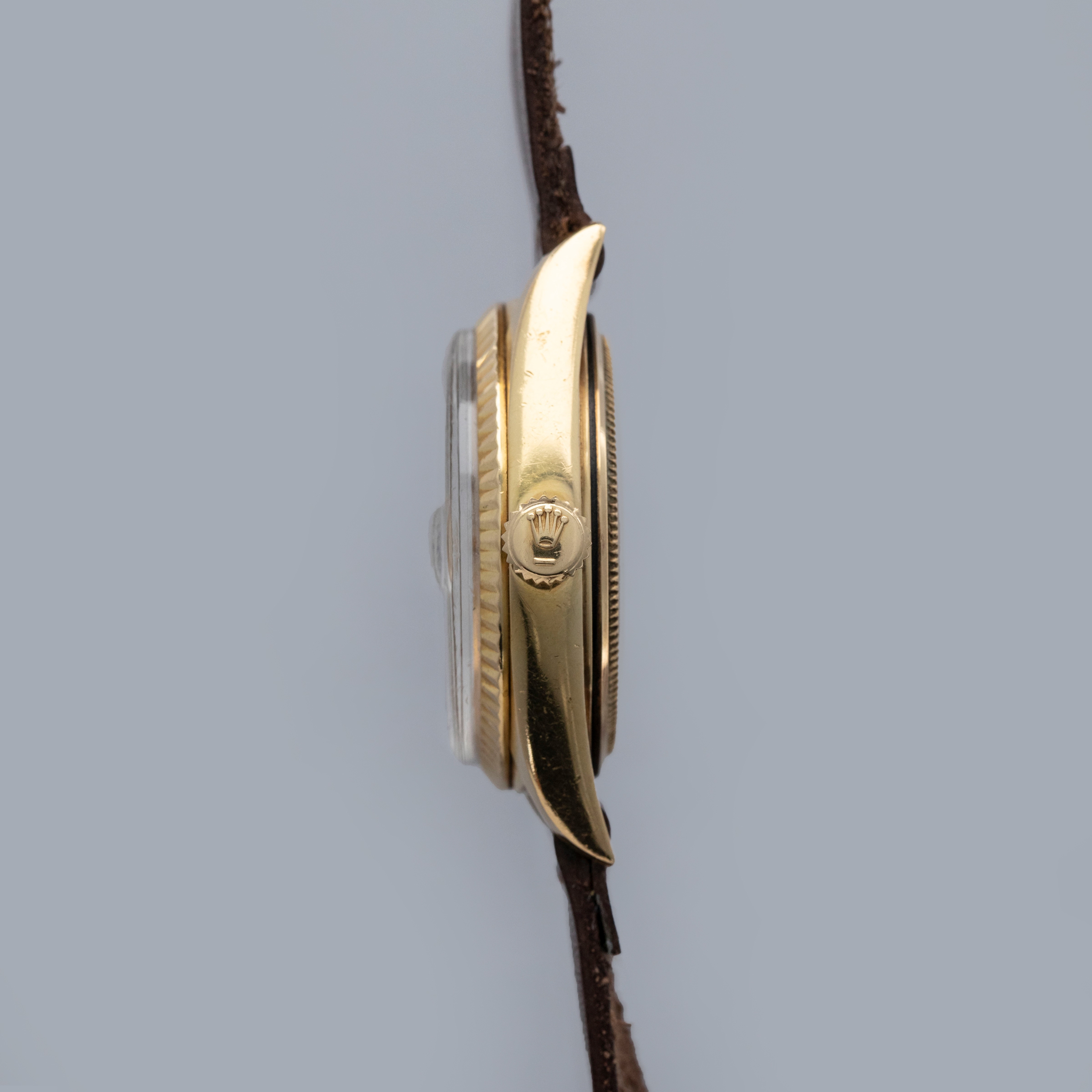 The watch is in overall very good condition. The yellow gold case shows wear consistent with age, including some nicks and softened lug edges. There are endlink marks visible between the lugs on the case back. The fluted bezel has some scratches and a slightly softened profile. The Swiss only signed dial shows signs of age, with damage around the edge and some discoloration around the lume plots which have been relumed at some point. The crystal has a noticeable crack at 11 o’clock. The watch is fitted with a brown leather strap and a gold-plated Rolex buckle.