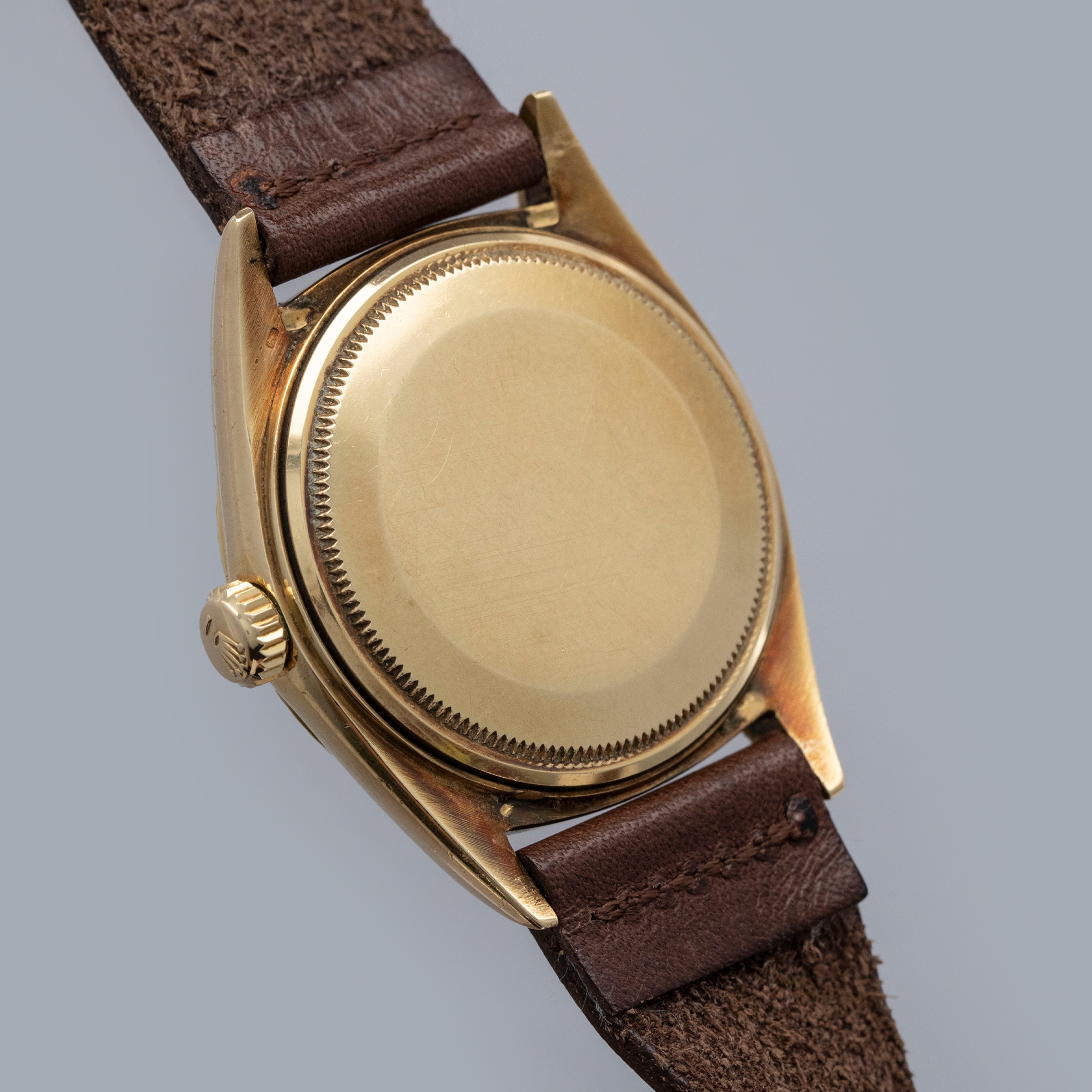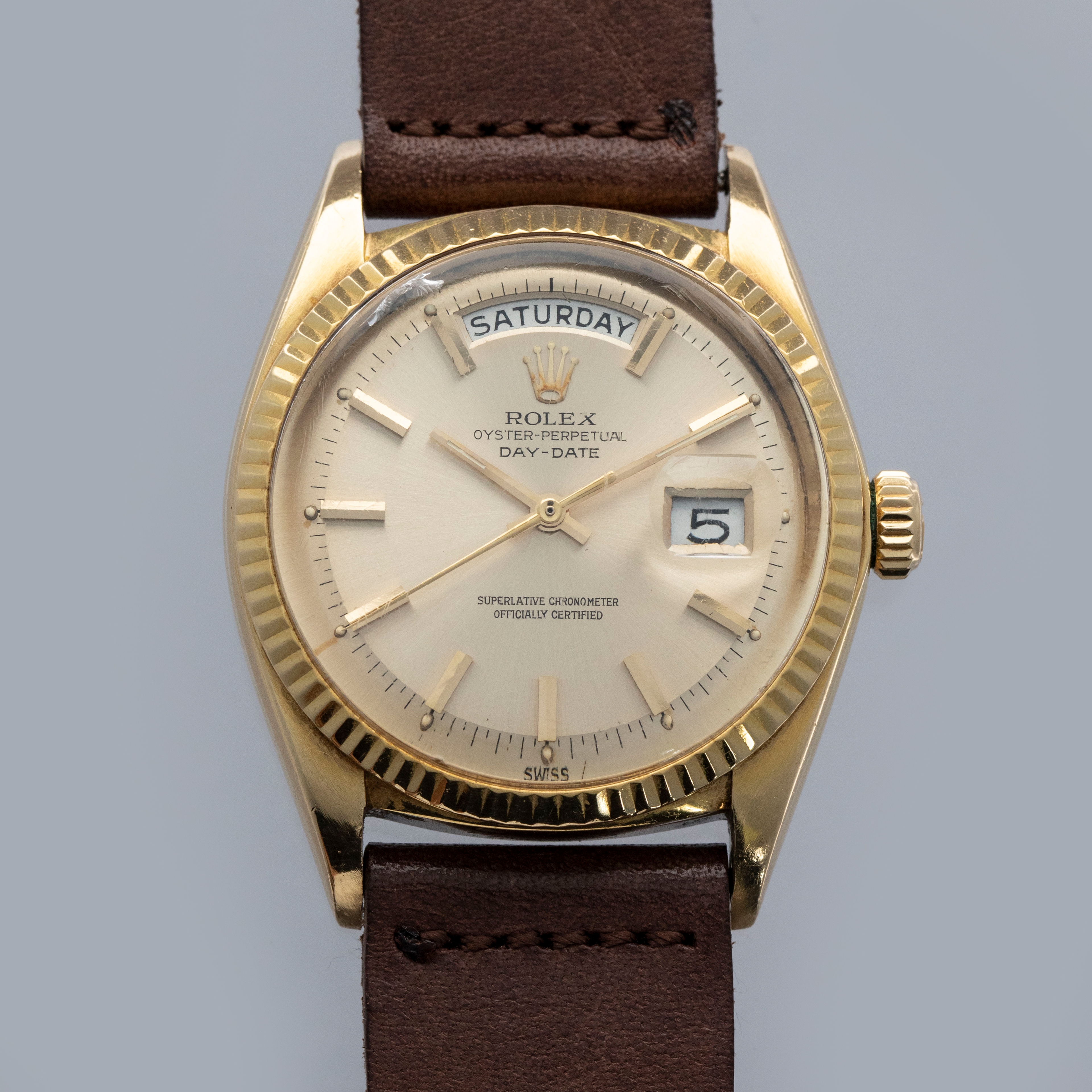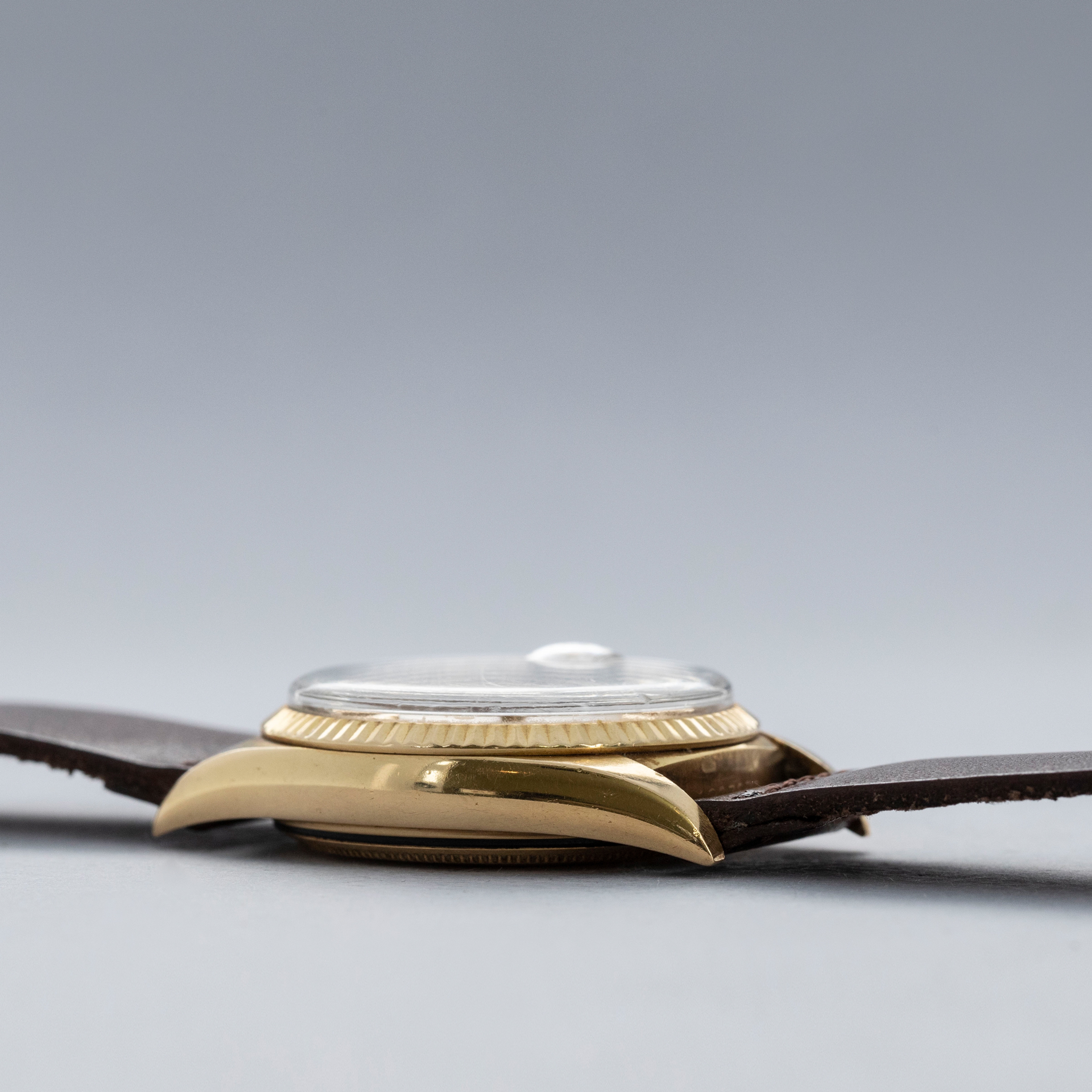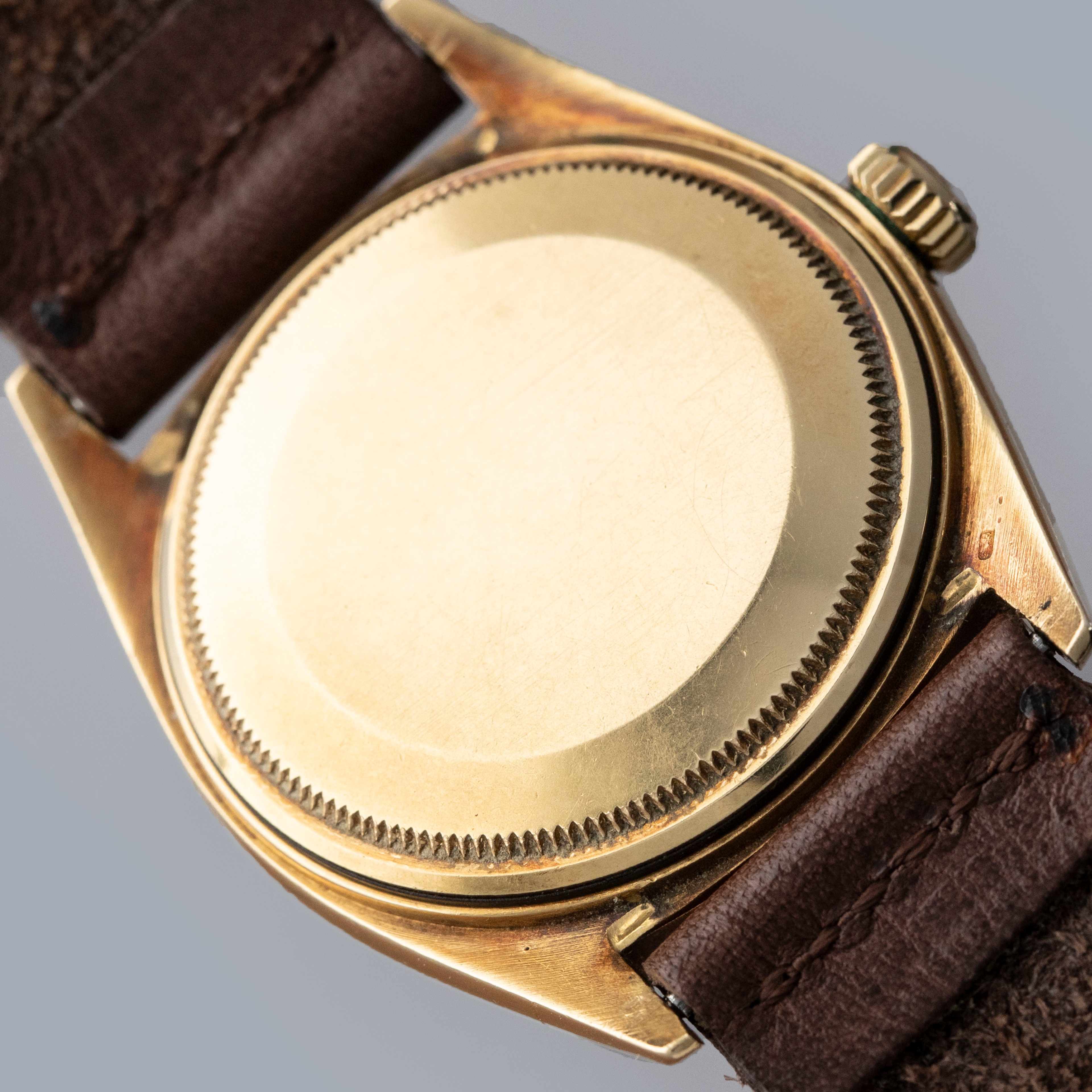 The watch is in overall very good condition. The yellow gold case shows wear consistent with age, including some nicks and softened lug edges. There are endlink marks visible between the lugs on the case back. The fluted bezel has some scratches and a slightly softened profile. The Swiss only signed dial shows signs of age, with damage around the edge and some discoloration around the lume plots which have been relumed at some point. The crystal has a noticeable crack at 11 o’clock. The watch is fitted with a brown leather strap and a gold-plated Rolex buckle.