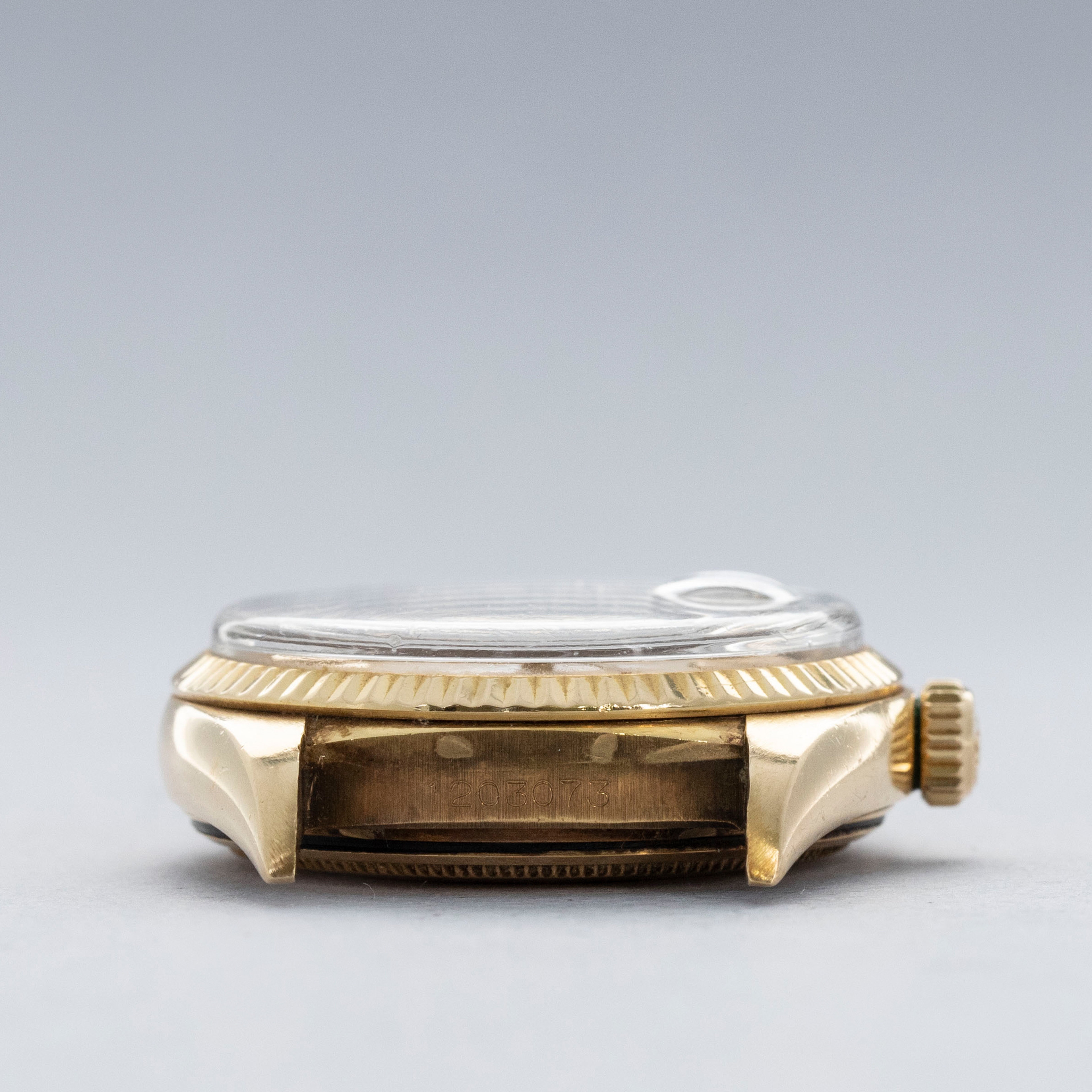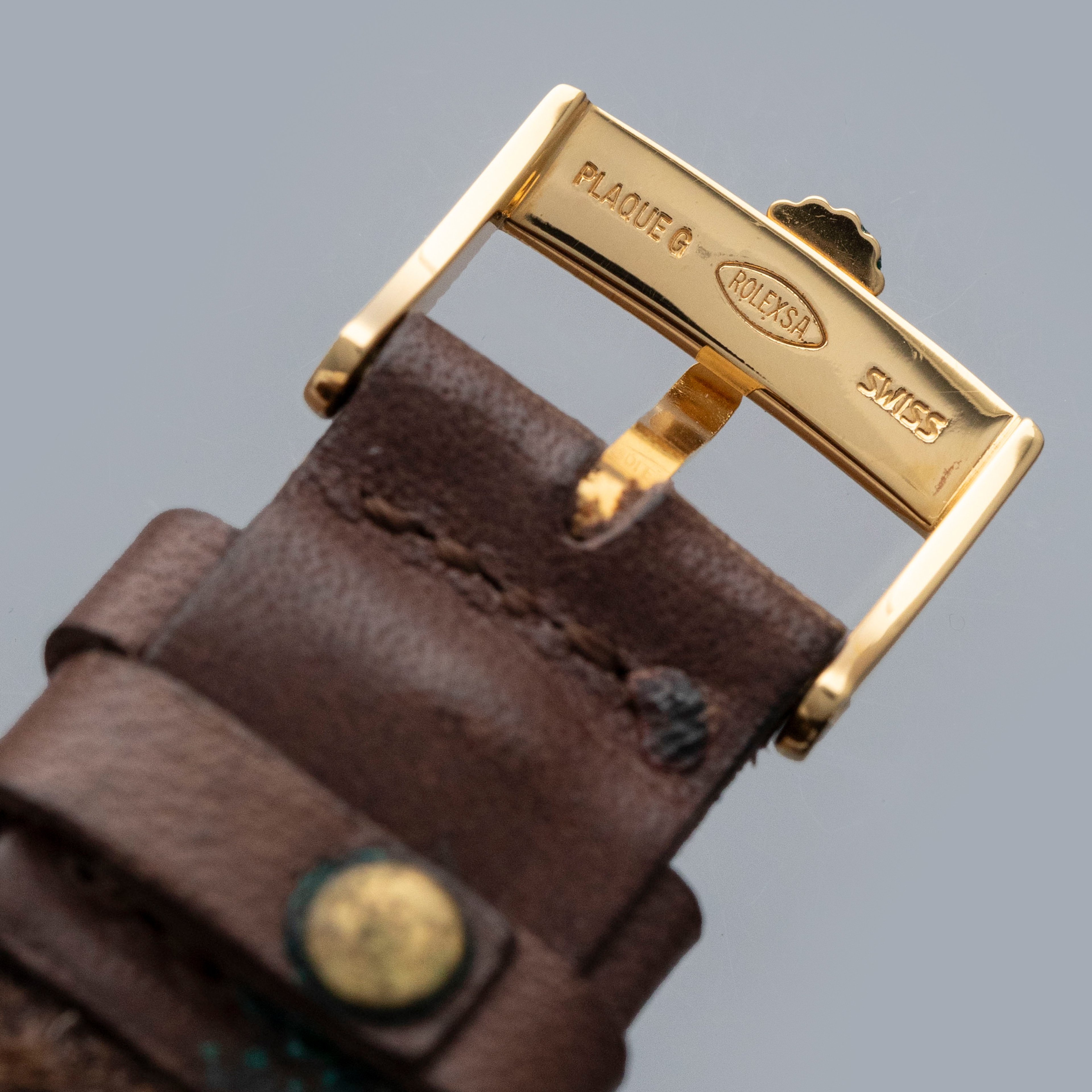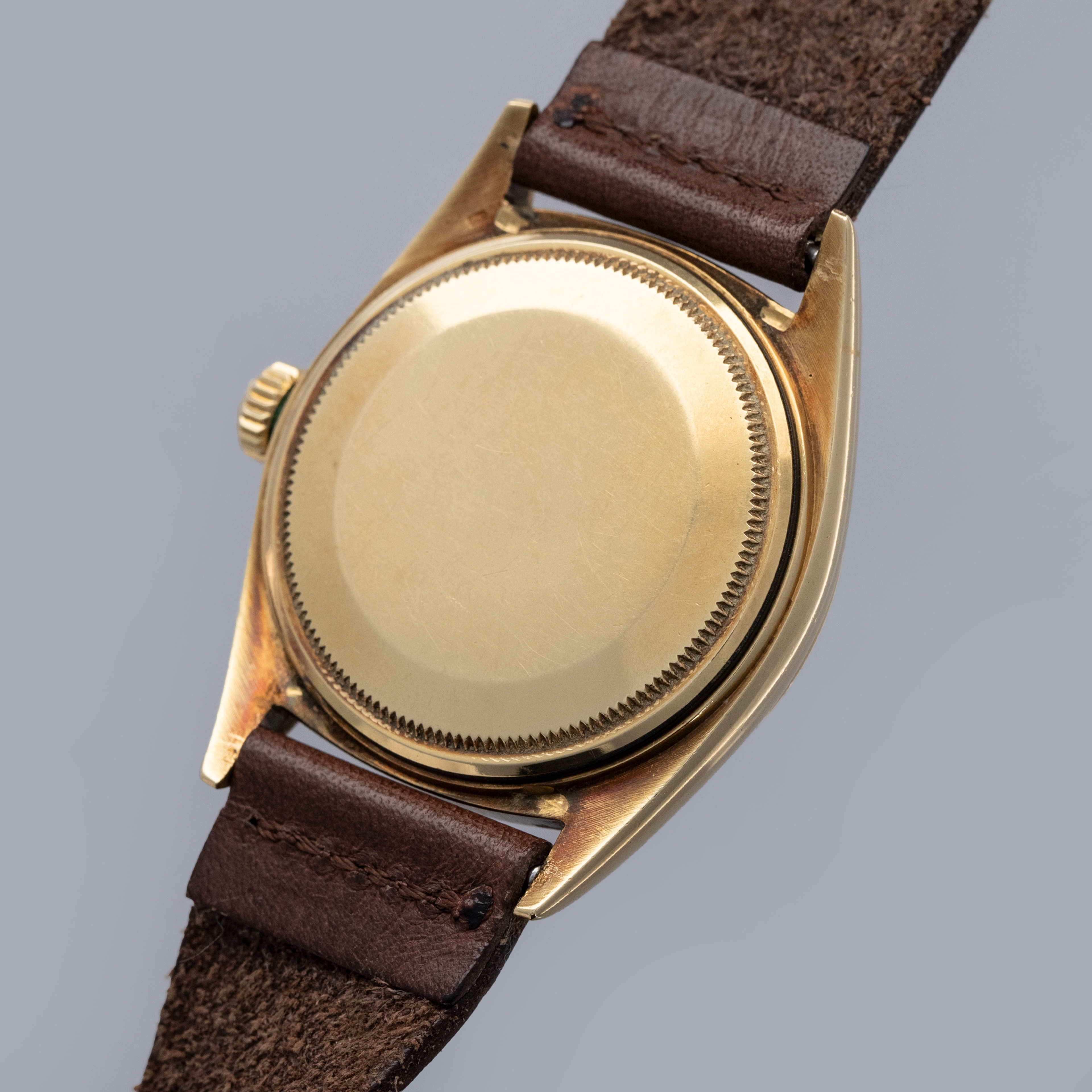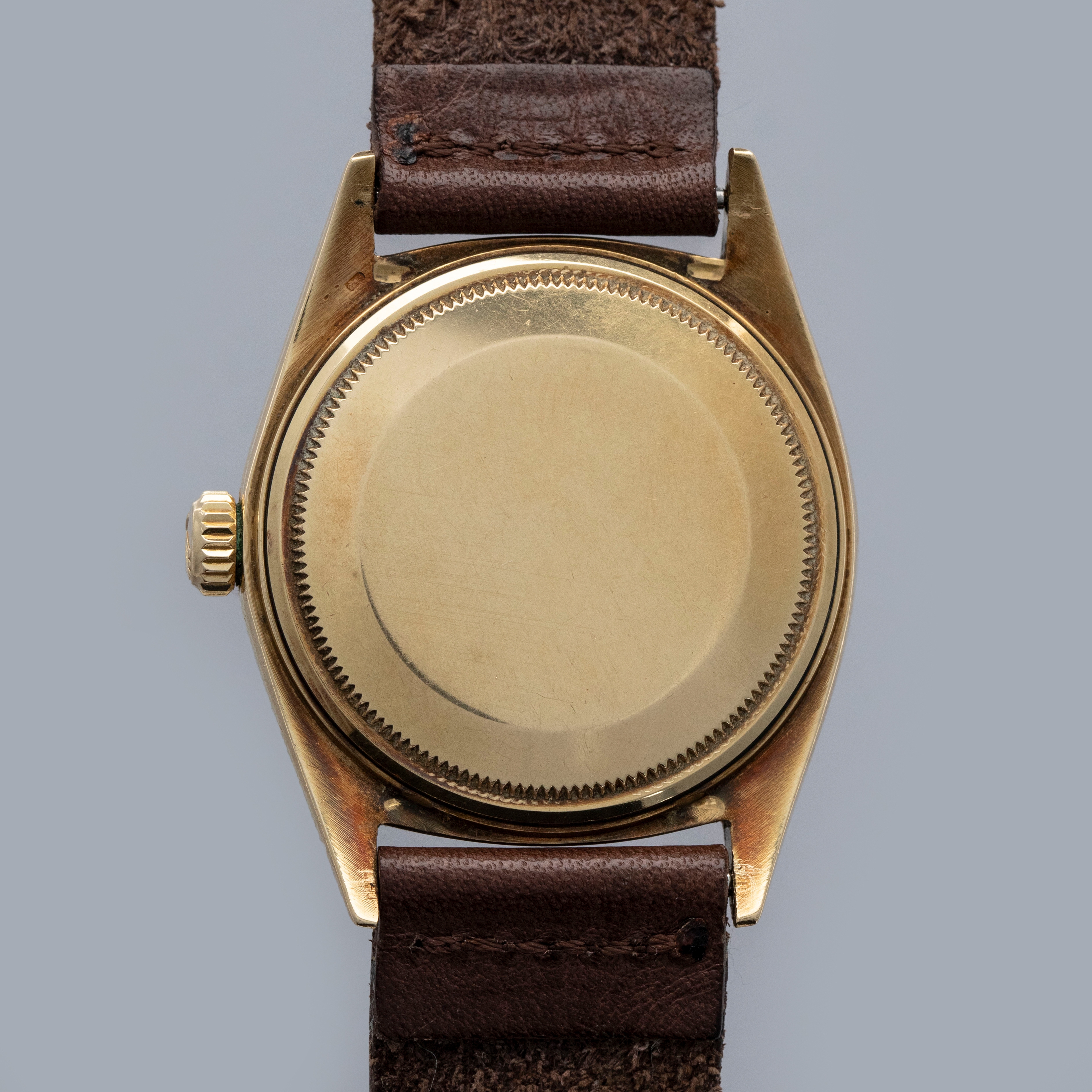 The watch is in overall very good condition. The yellow gold case shows wear consistent with age, including some nicks and softened lug edges. There are endlink marks visible between the lugs on the case back. The fluted bezel has some scratches and a slightly softened profile. The Swiss only signed dial shows signs of age, with damage around the edge and some discoloration around the lume plots which have been relumed at some point. The crystal has a noticeable crack at 11 o’clock. The watch is fitted with a brown leather strap and a gold-plated Rolex buckle.