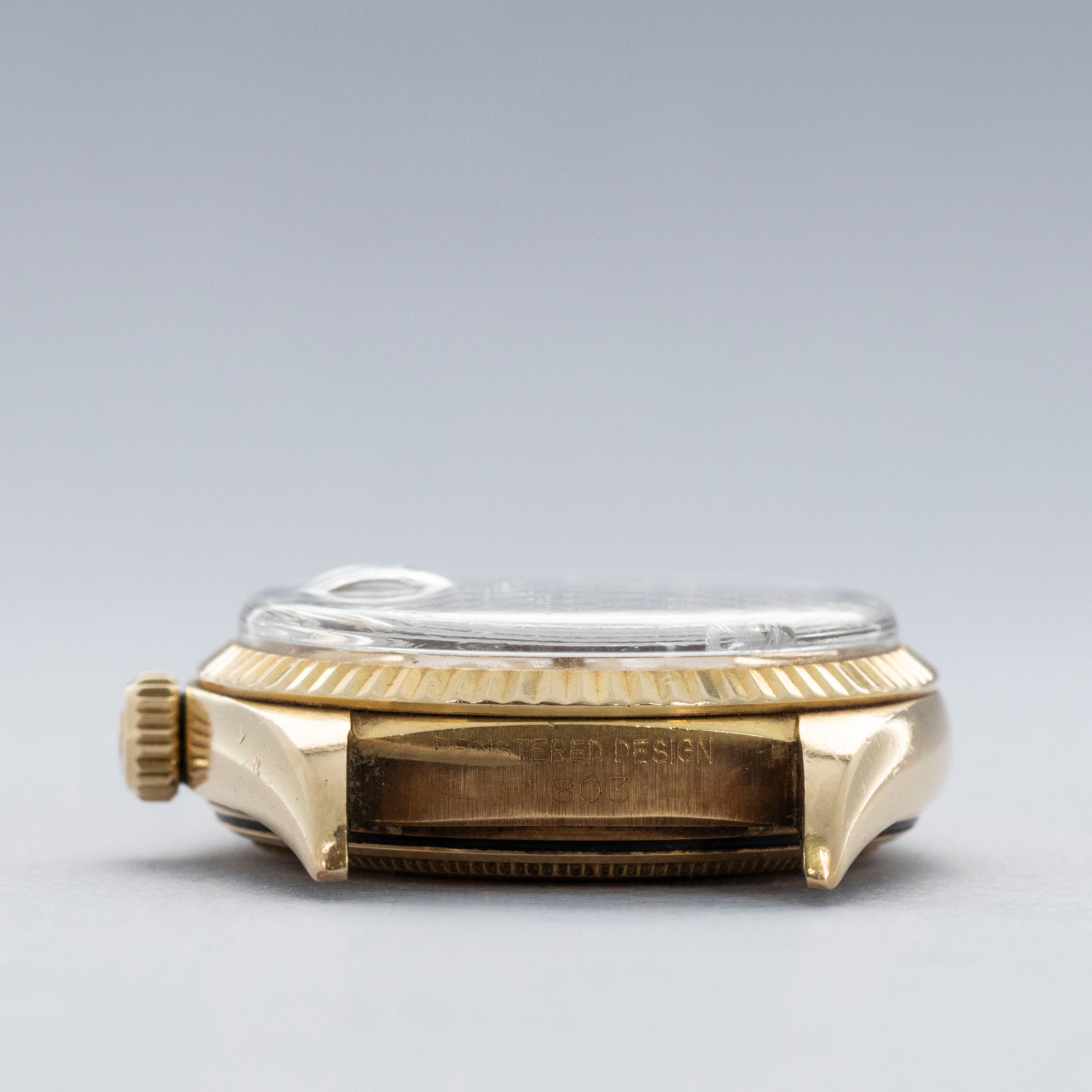 Featuring a stunning champagne pie-pan dial with tall applied hour markets, this example's dial is full of vintage character, especially when covered by the ref. 1803's acrylic crystal.