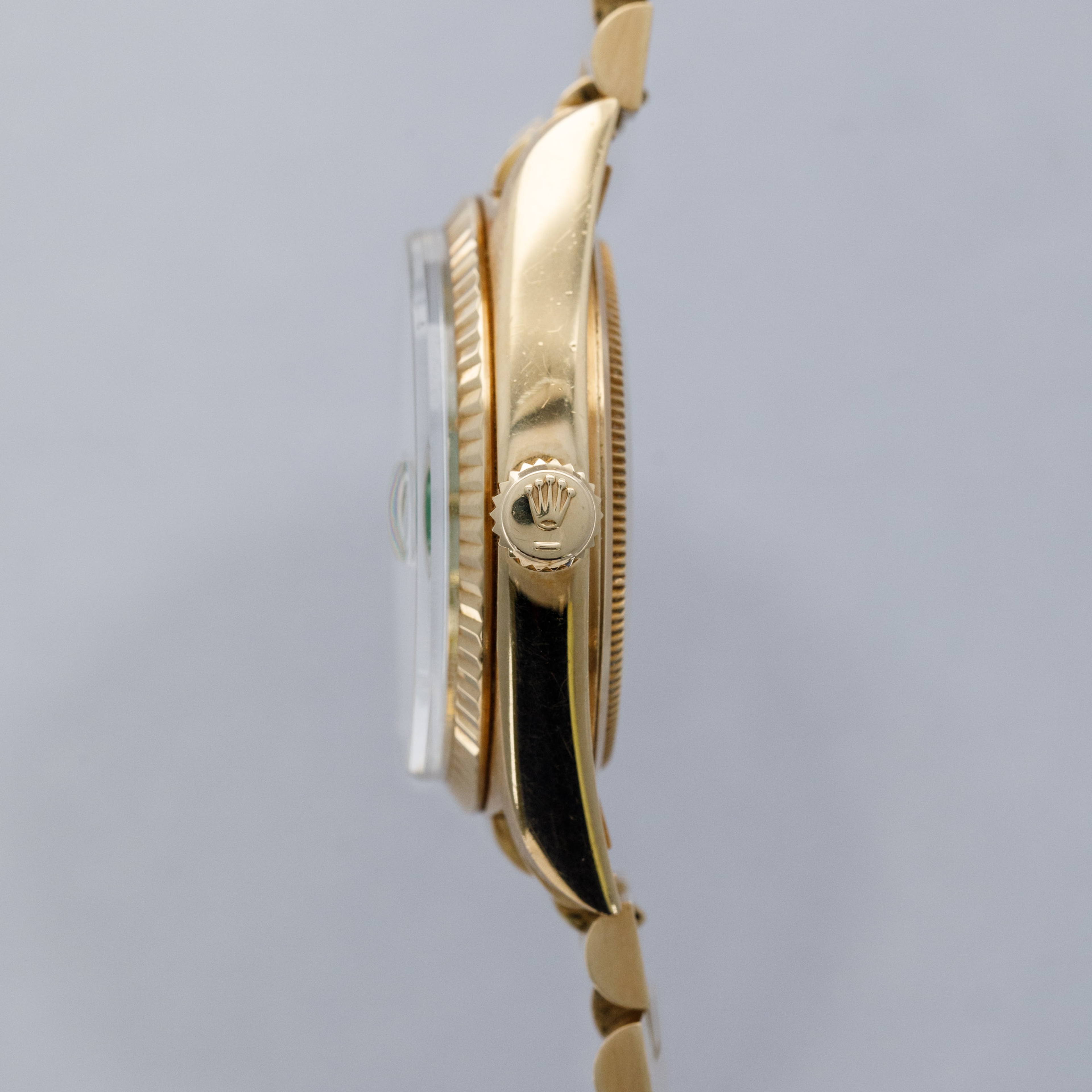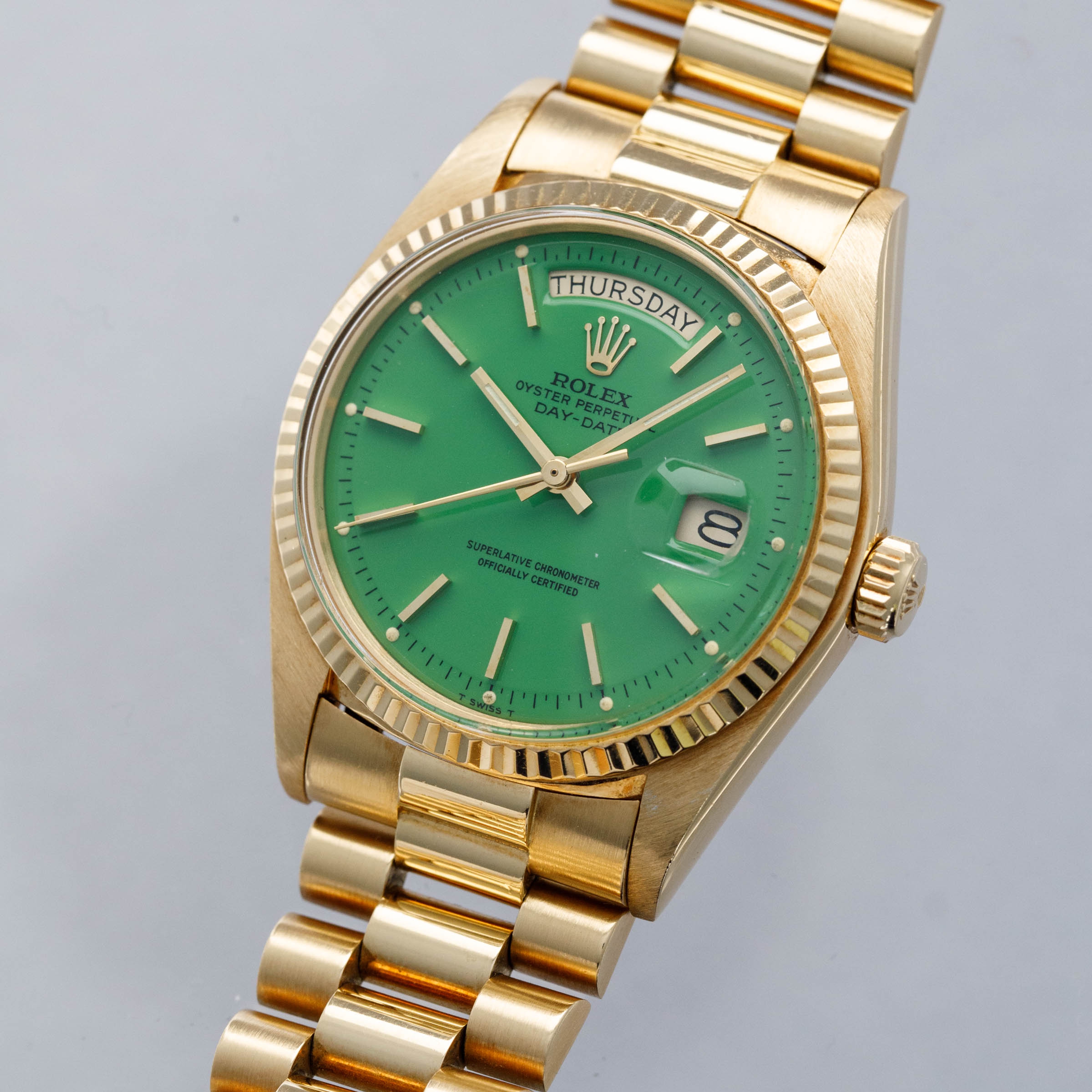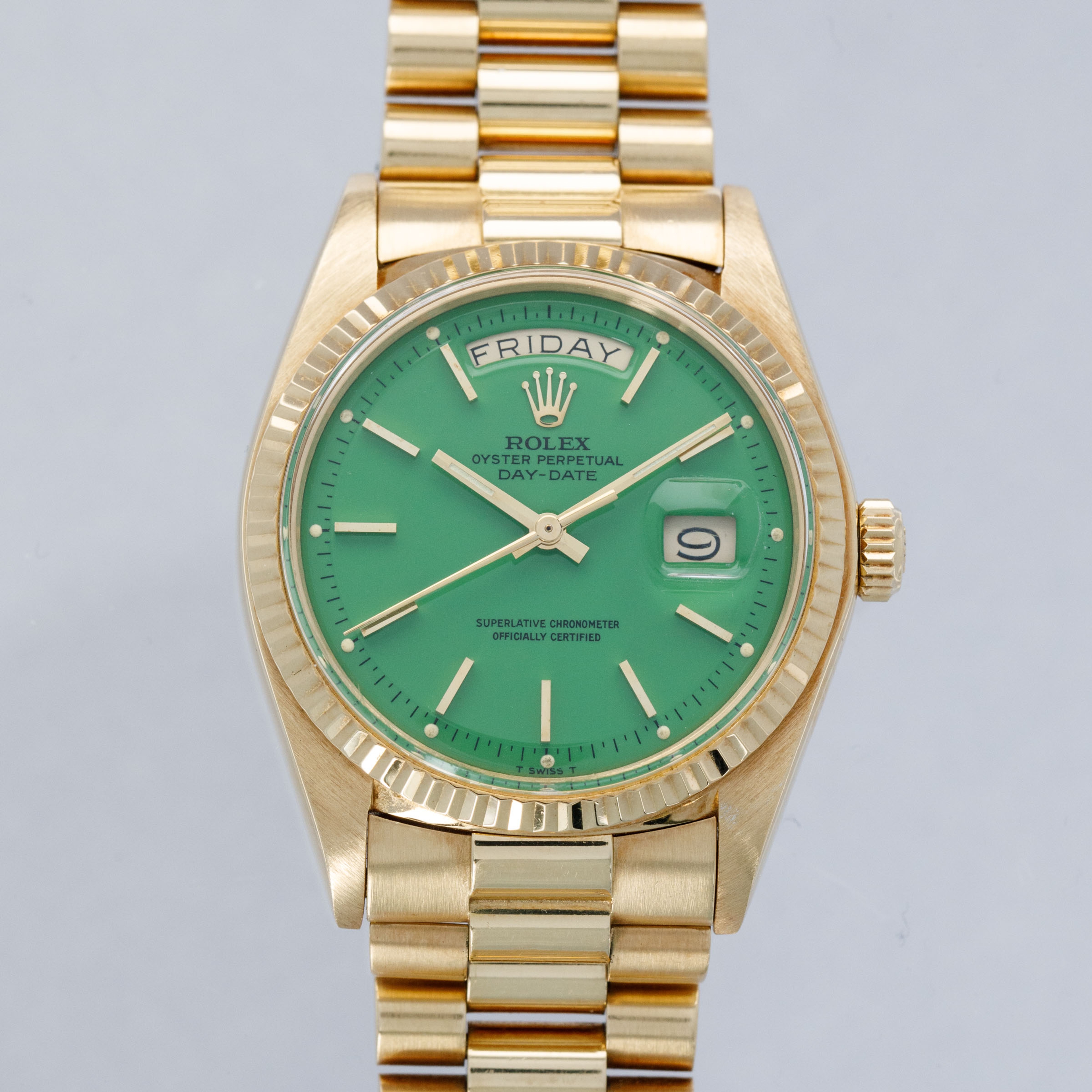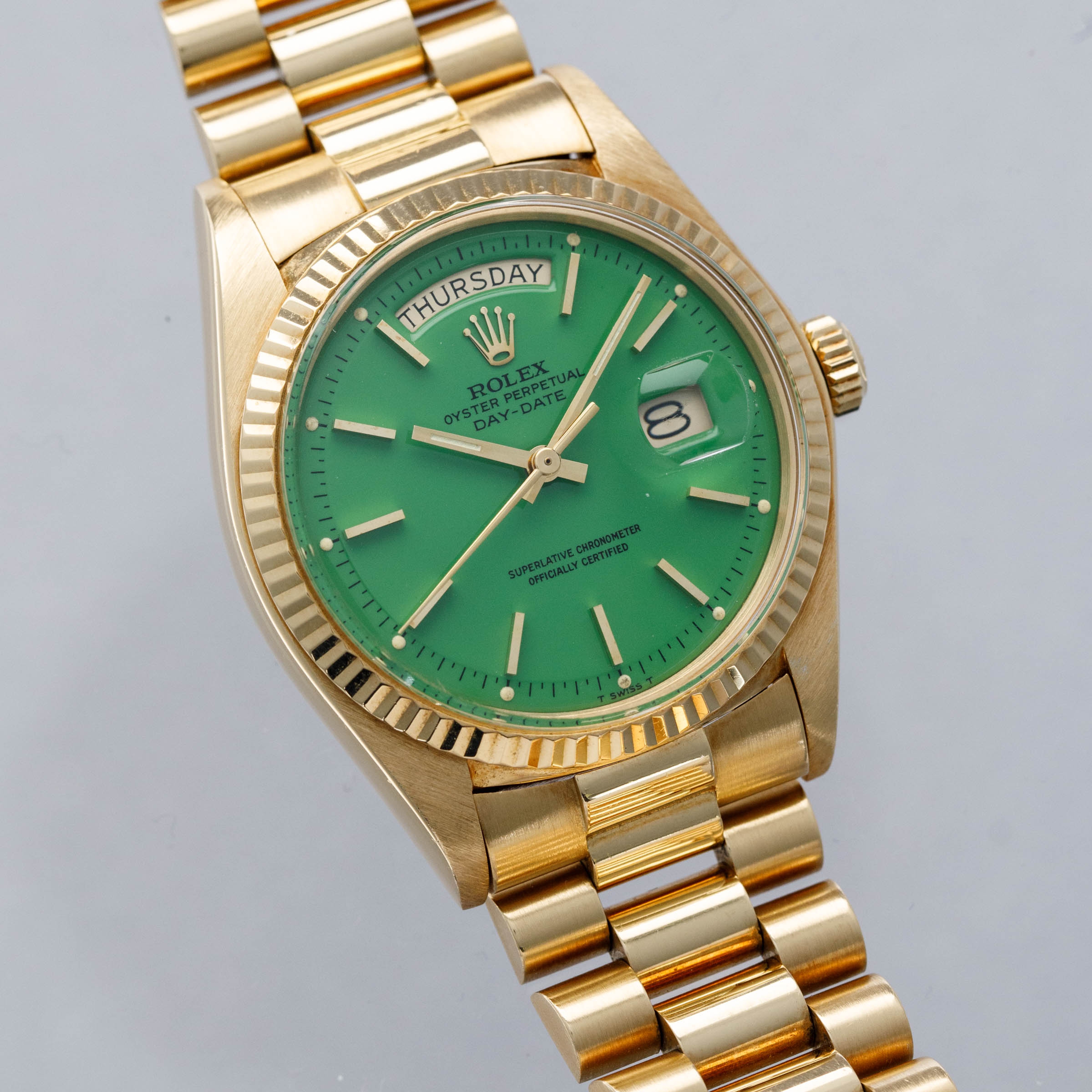 While its pie-pan green Stella dial is certainly the star of the show, this ref. 1803's well-preserved, subtlely oxidized 18kt yellow gold case, President bracelet, and fluted bezel all combine to top off its exceptional dial very nicely.