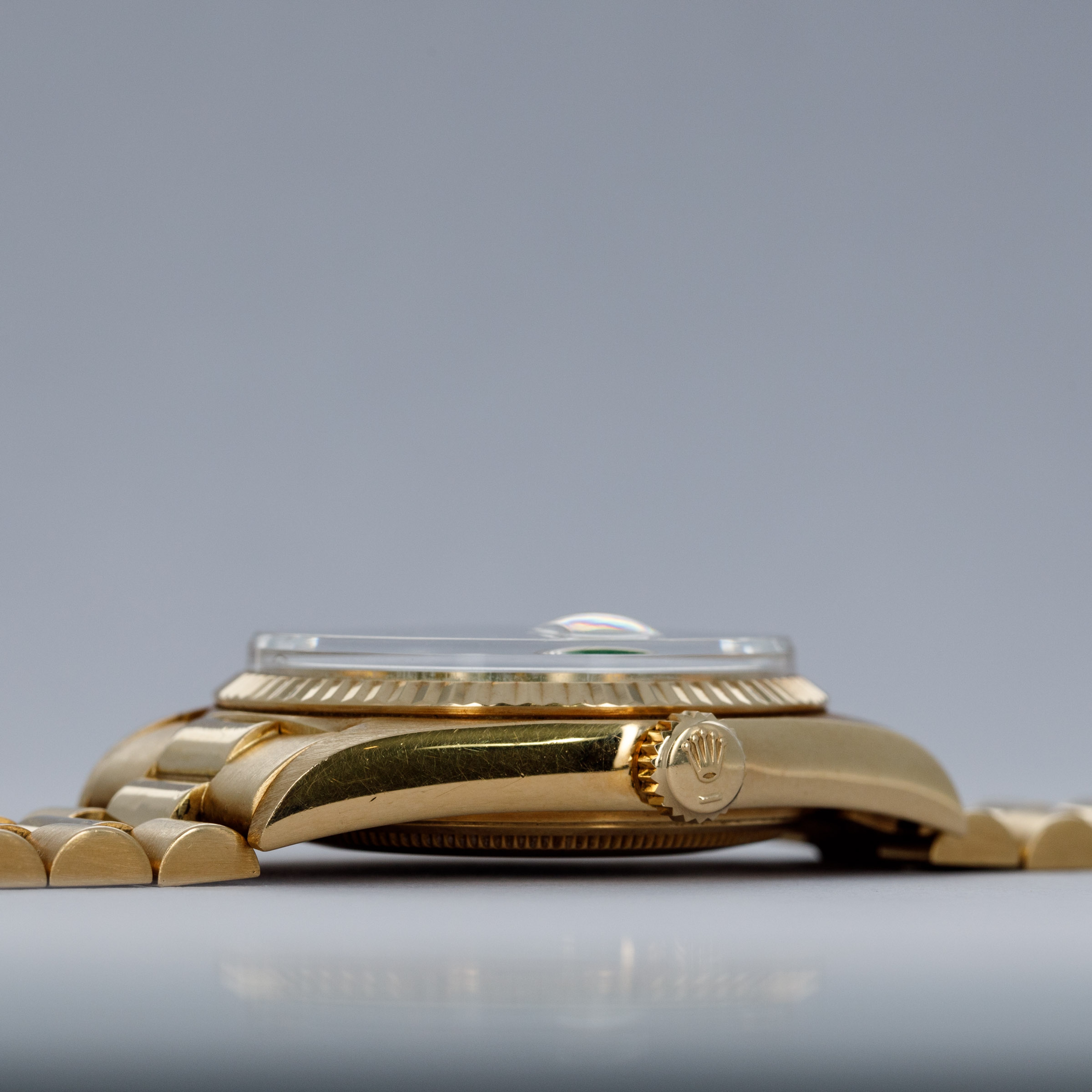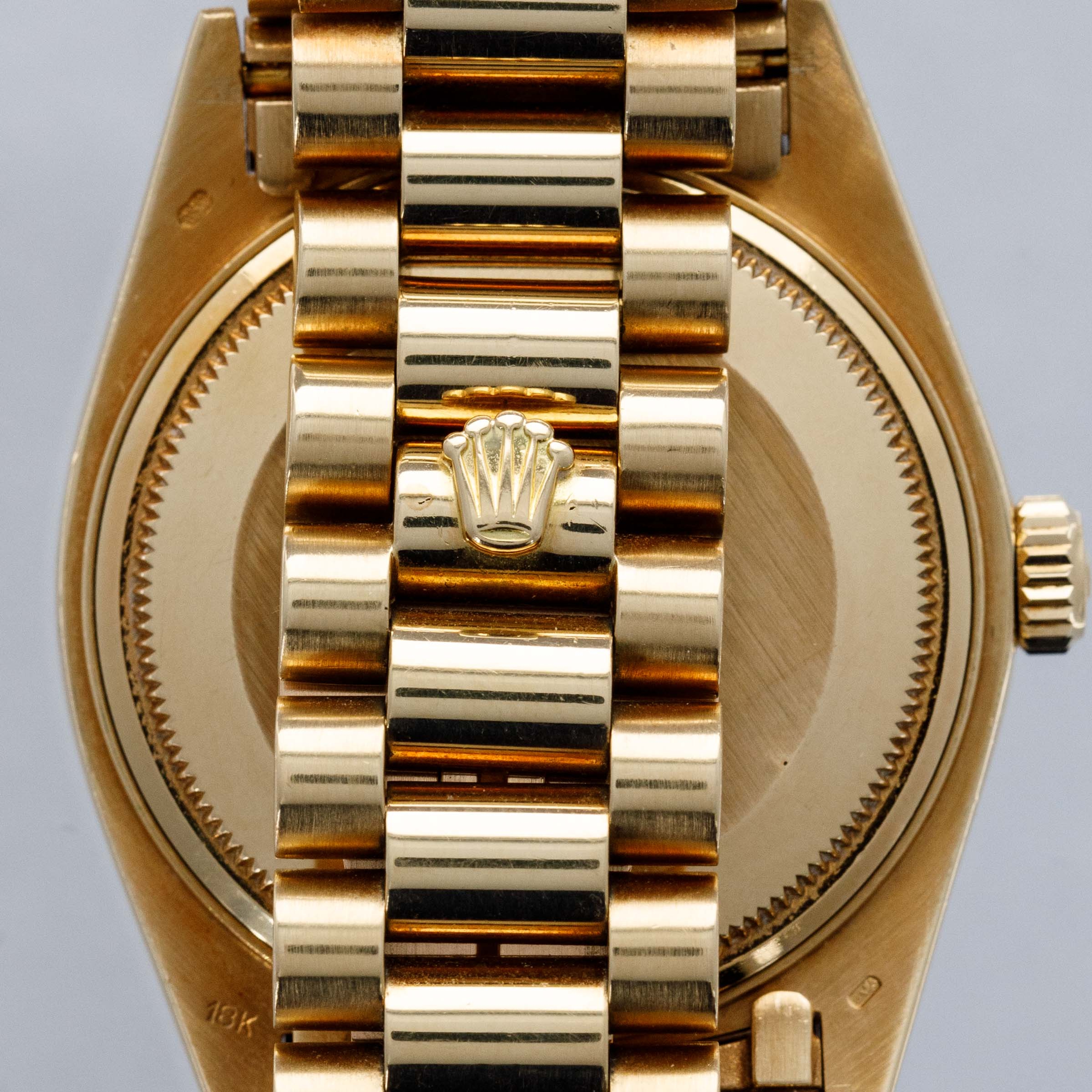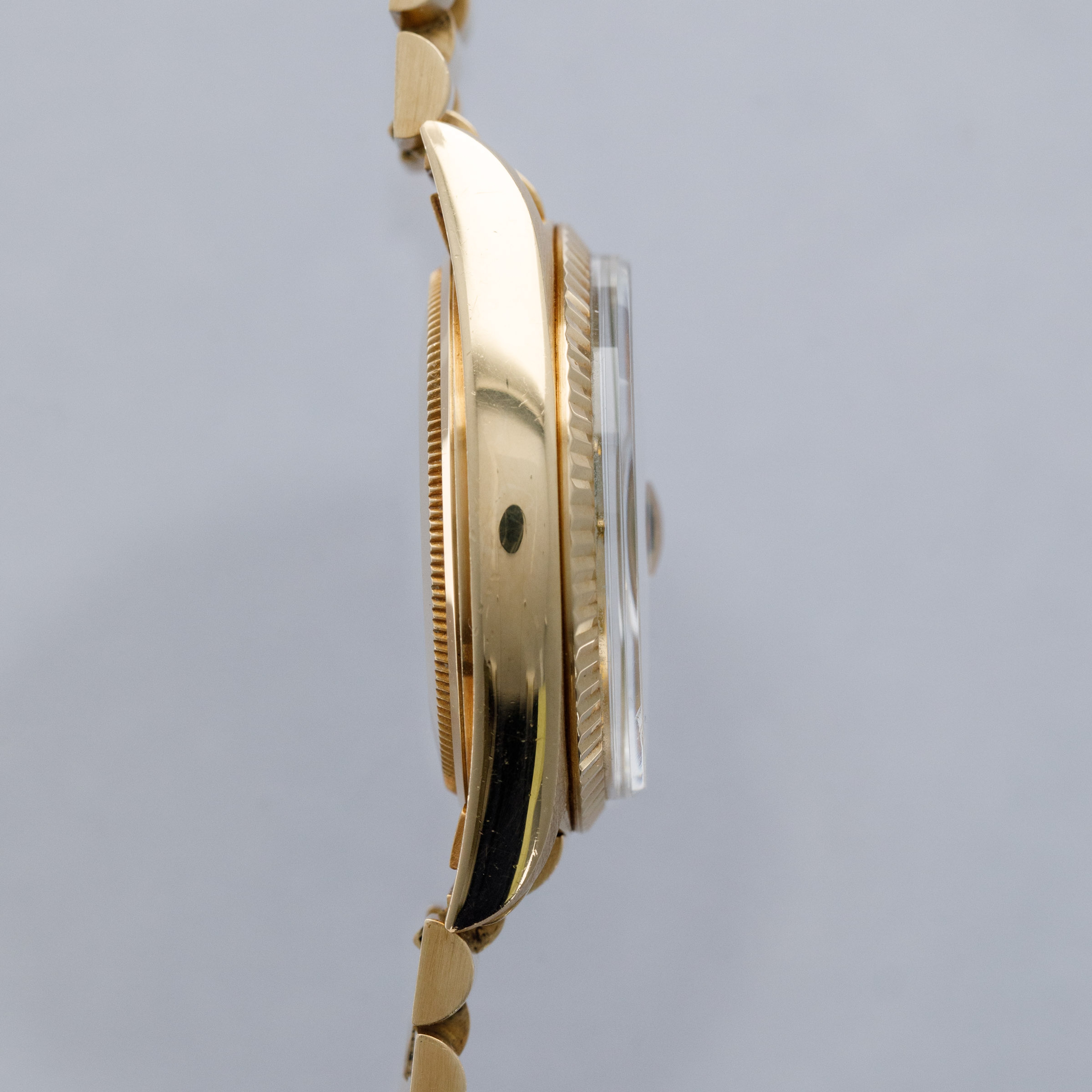 While its pie-pan green Stella dial is certainly the star of the show, this ref. 1803's well-preserved, subtlely oxidized 18kt yellow gold case, President bracelet, and fluted bezel all combine to top off its exceptional dial very nicely.