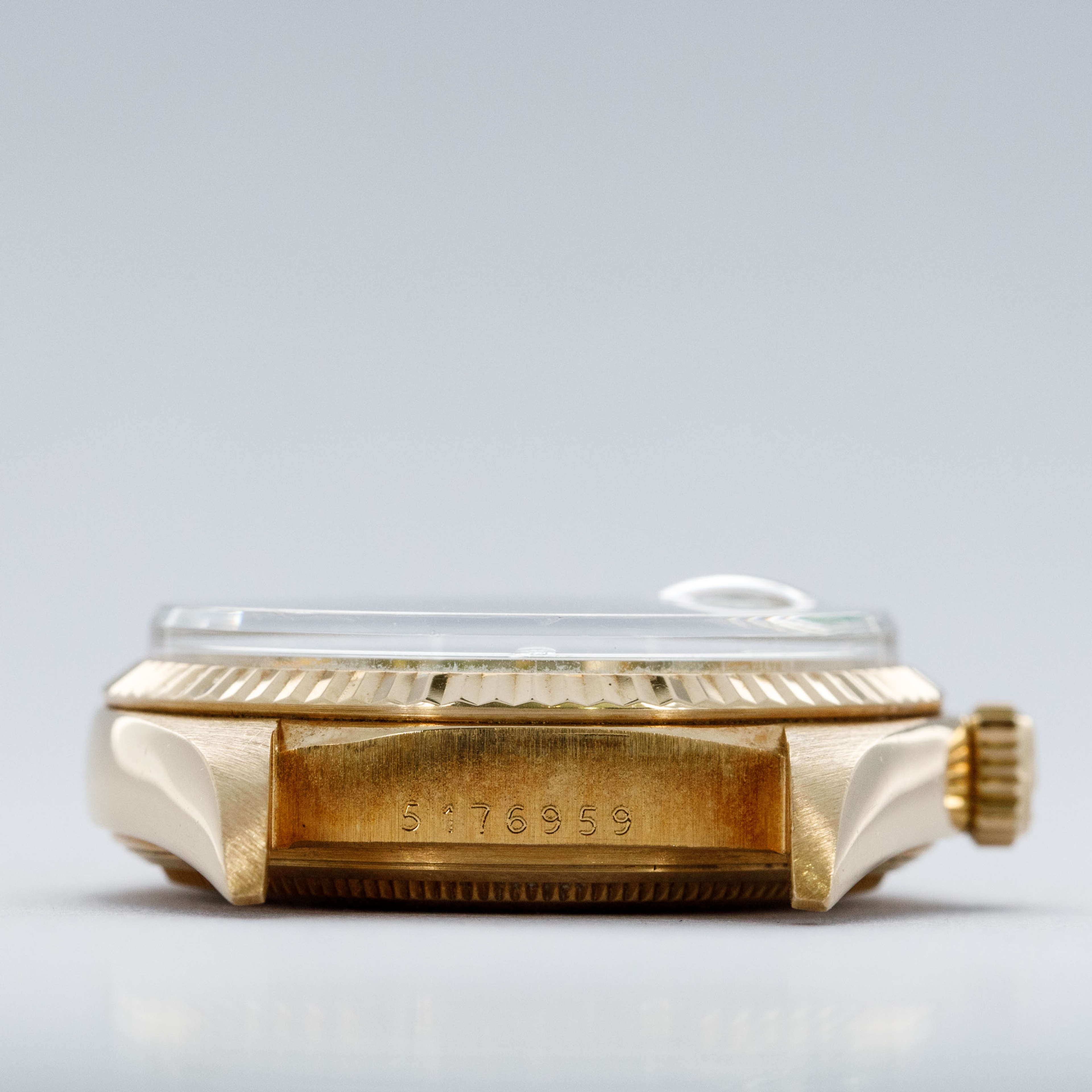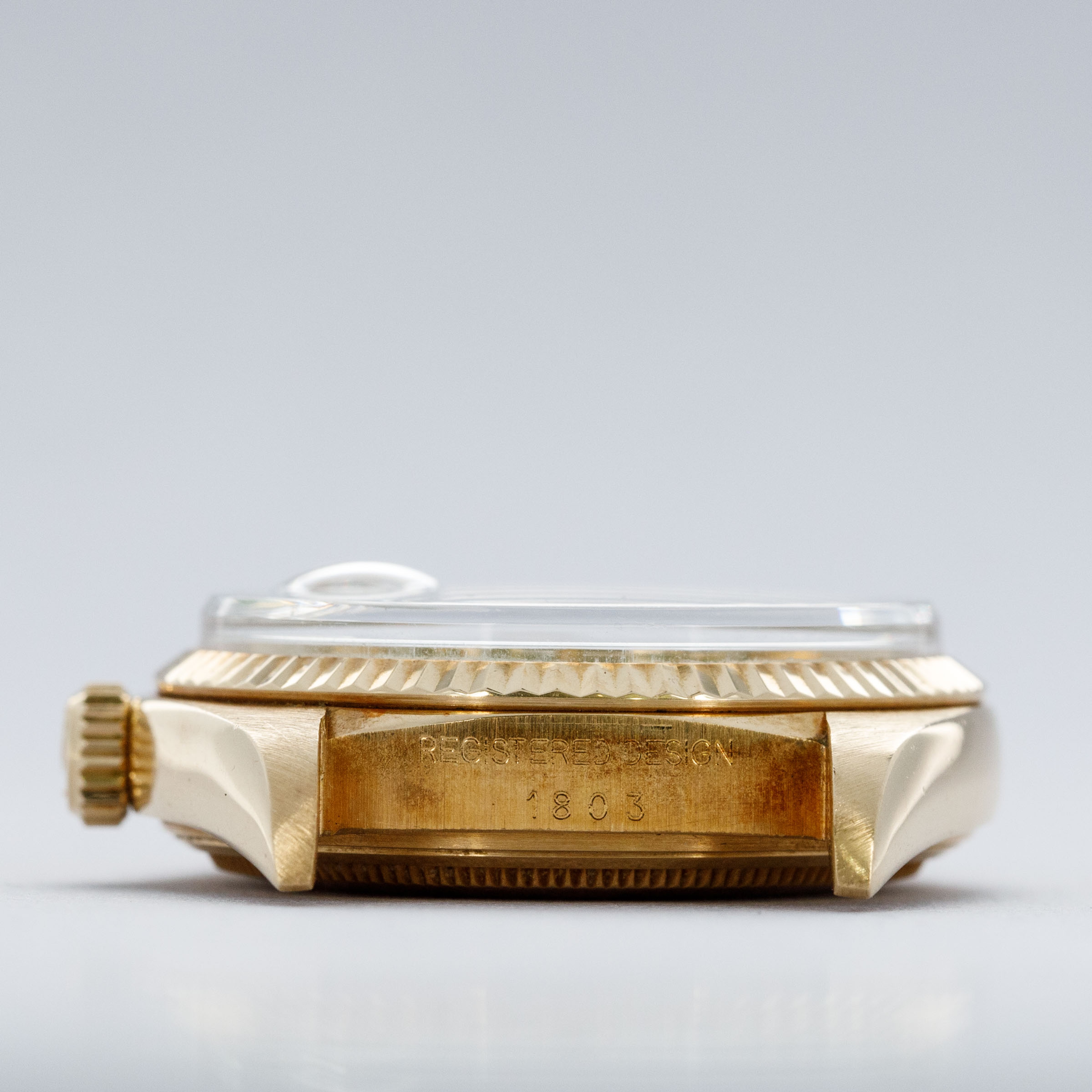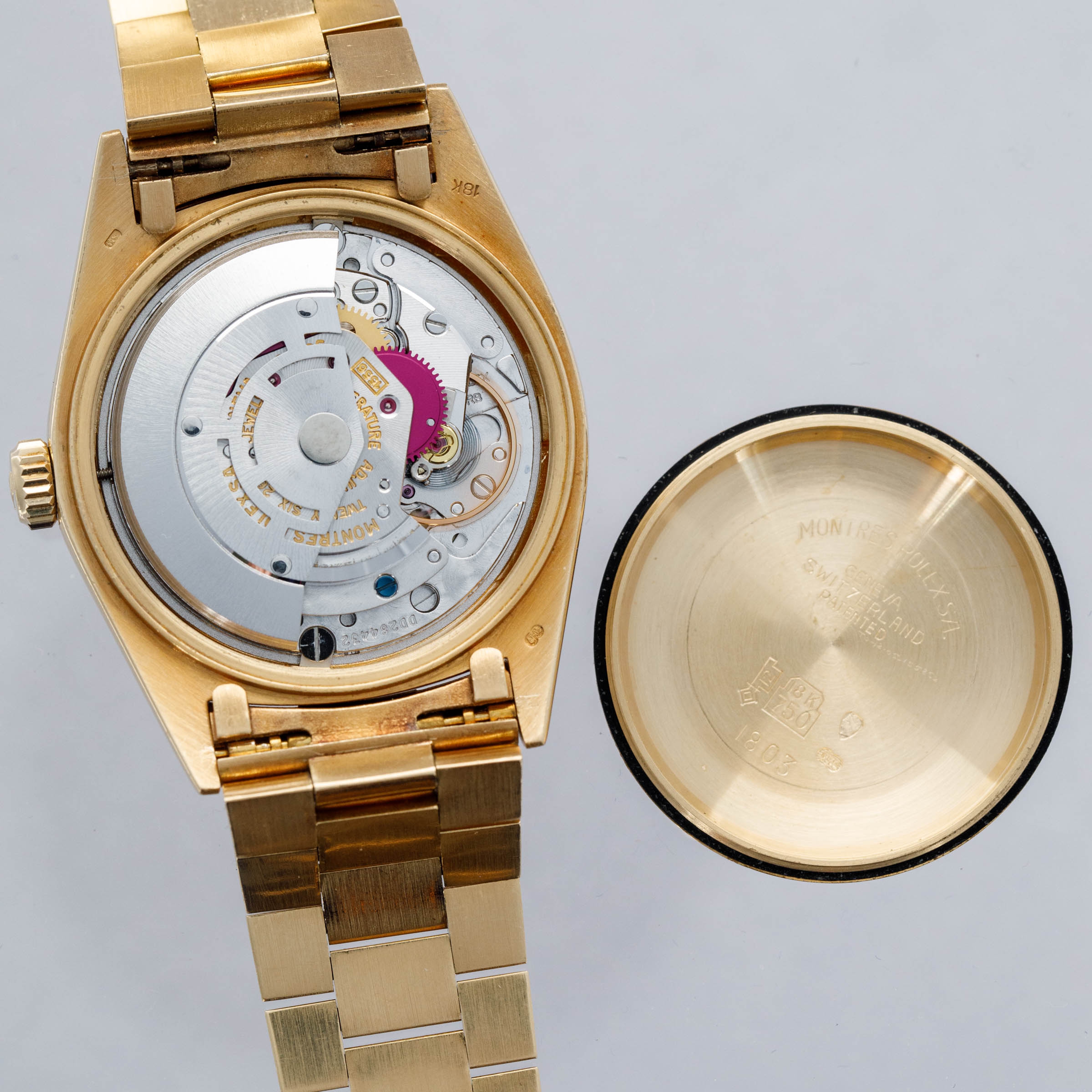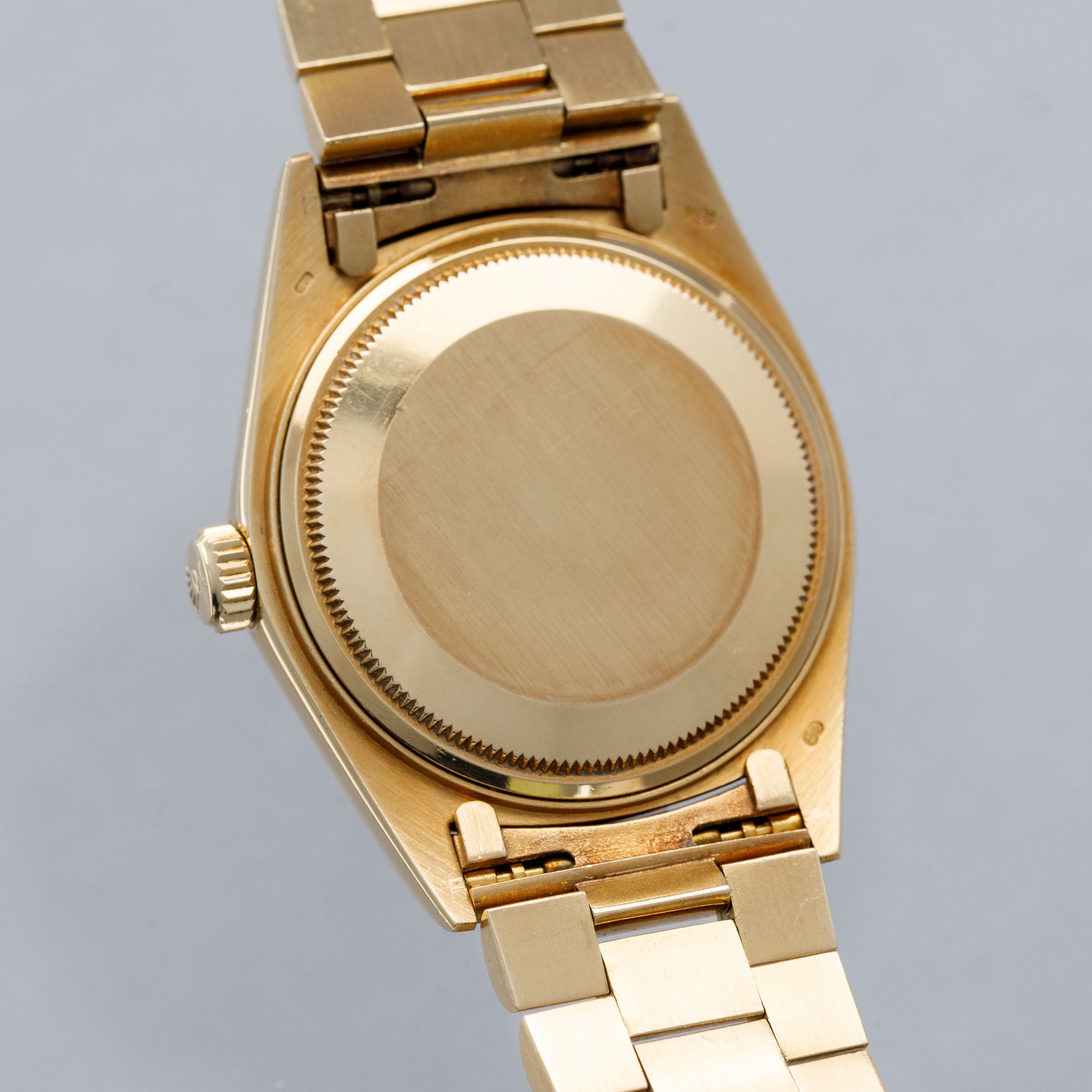 While its pie-pan green Stella dial is certainly the star of the show, this ref. 1803's well-preserved, subtlely oxidized 18kt yellow gold case, President bracelet, and fluted bezel all combine to top off its exceptional dial very nicely.