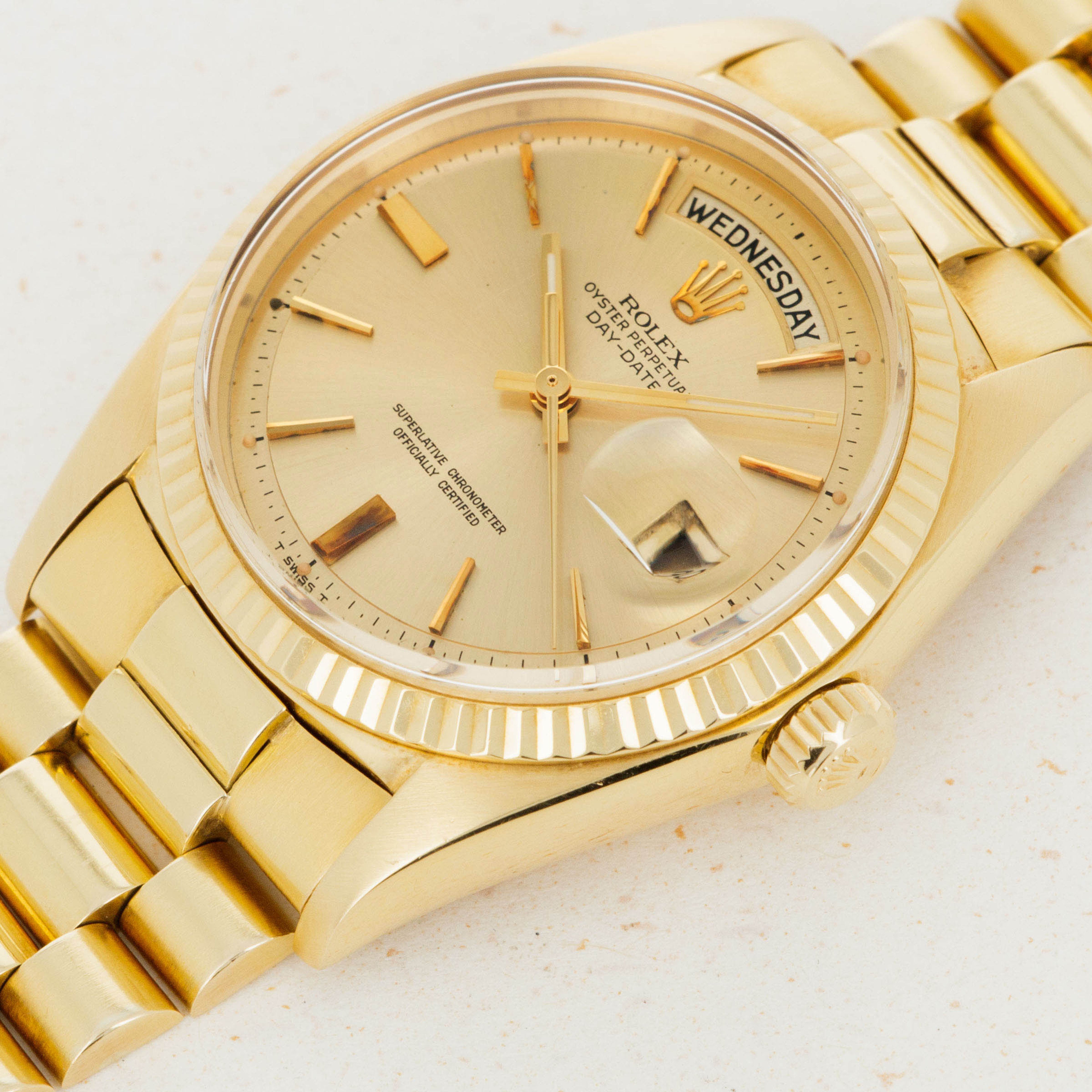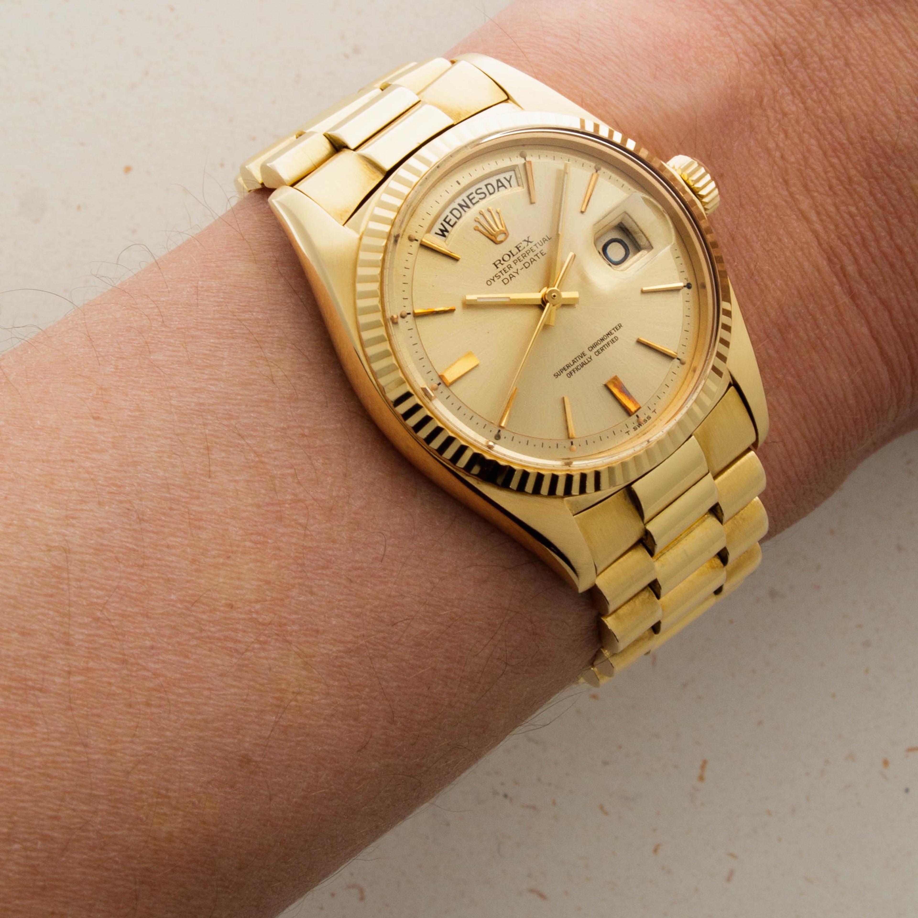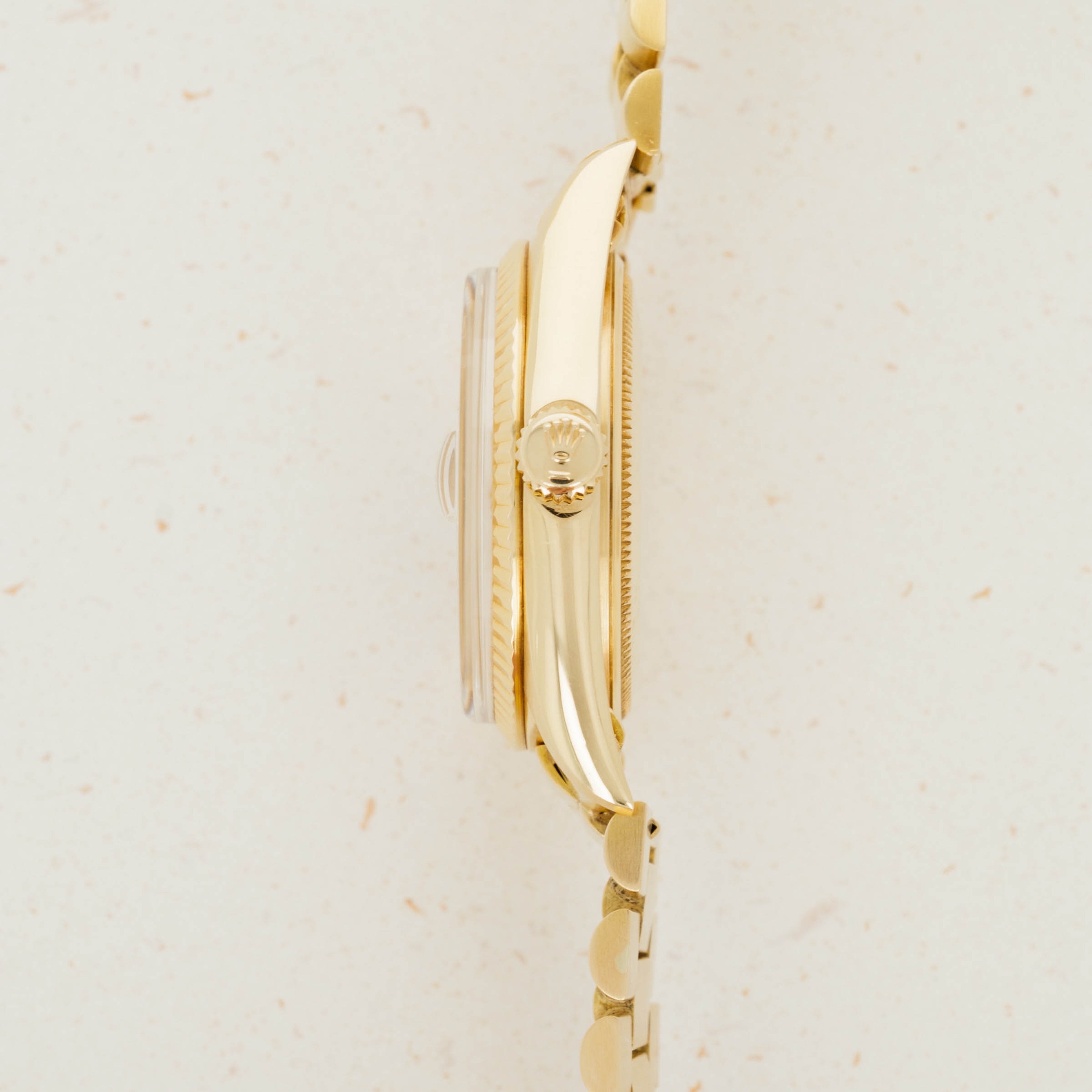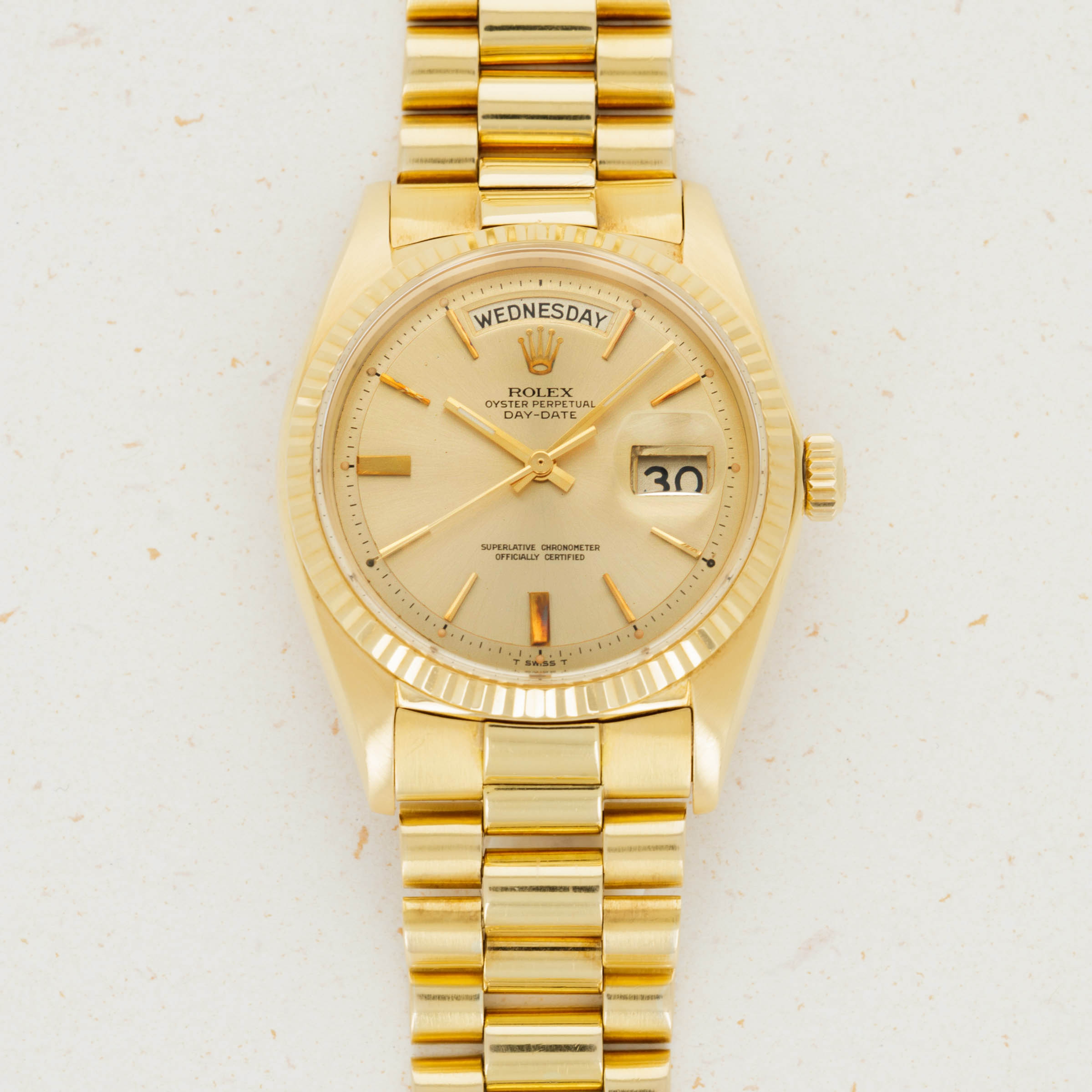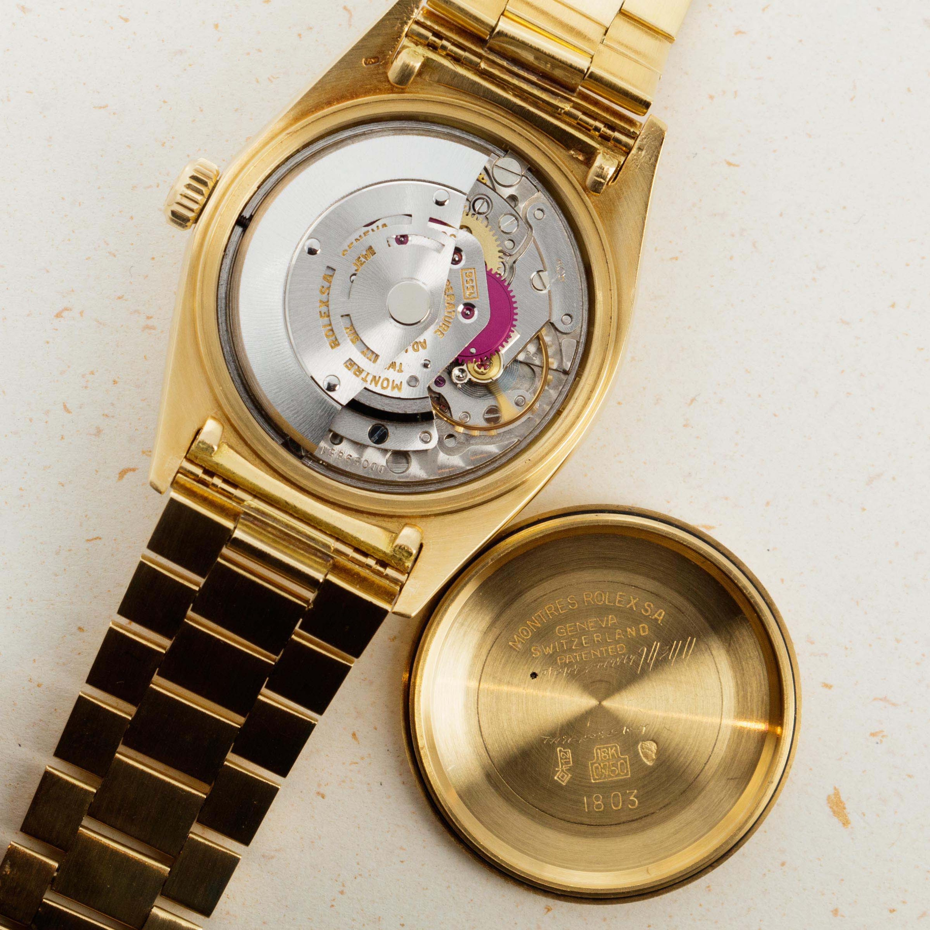 Perhaps one of the most iconic silhouettes within watchmaking, this Day-Date ref. 1803 features a fluted 18k gold bezel and President bracelet that combine to loudly declare its exclusivity through its distinct wrist presence.
