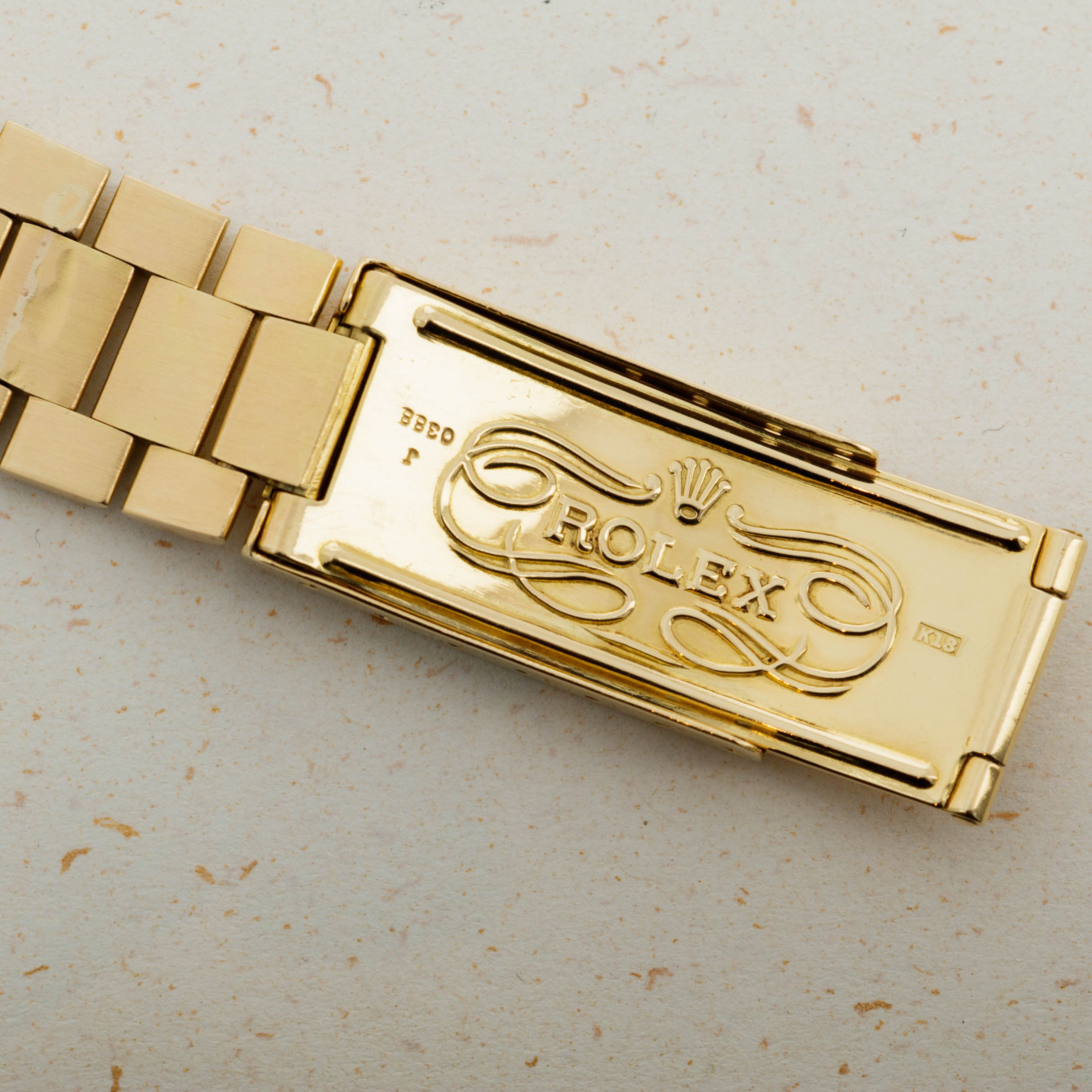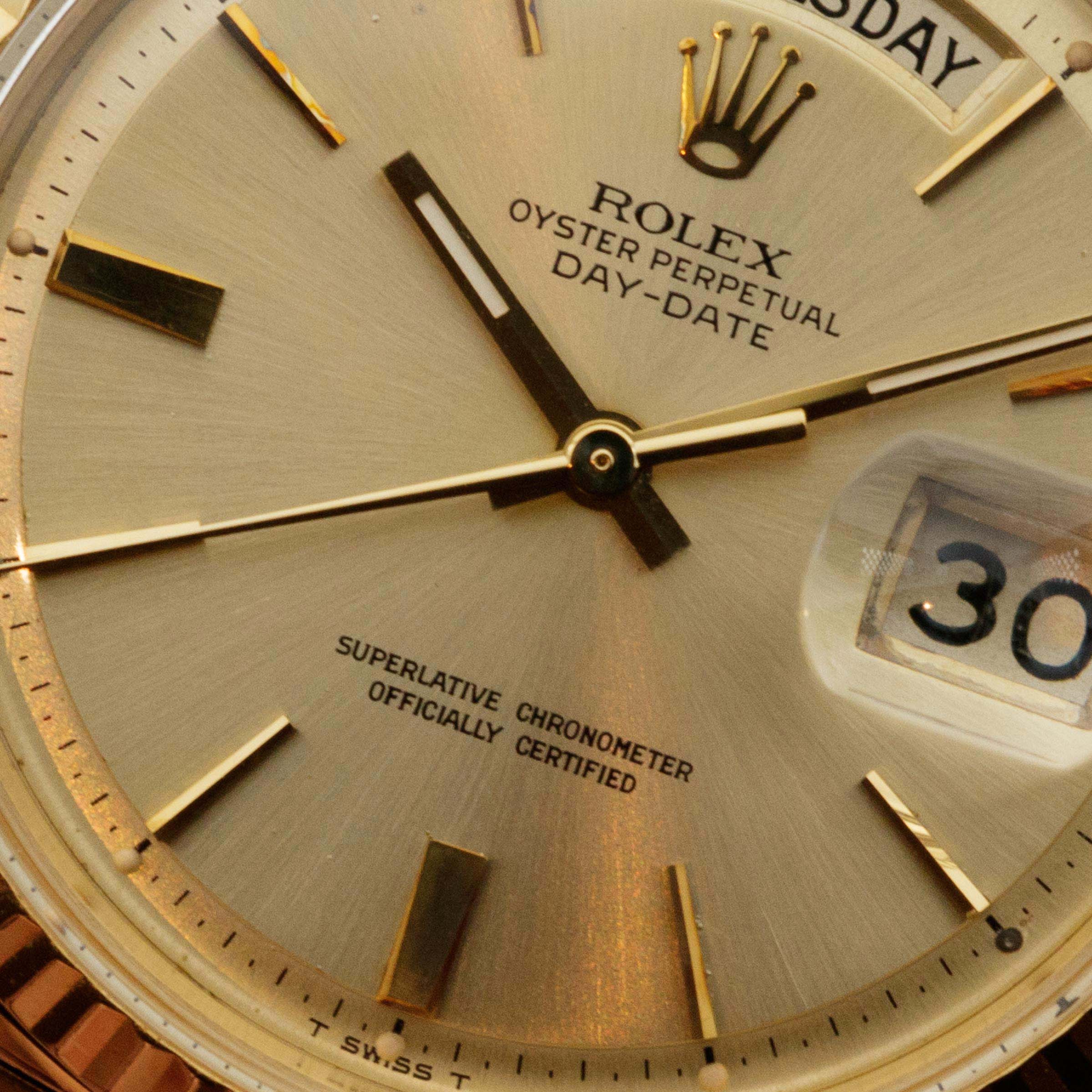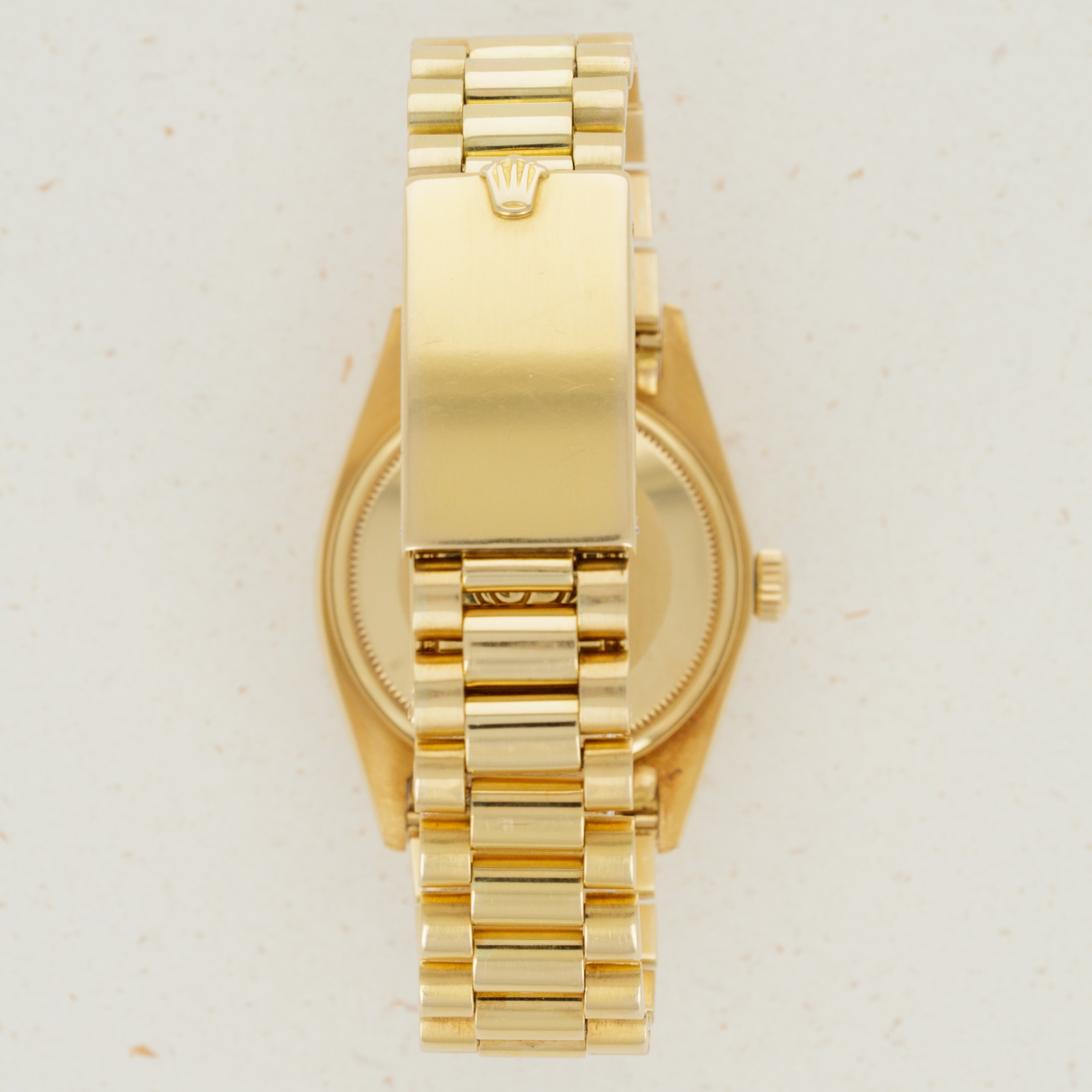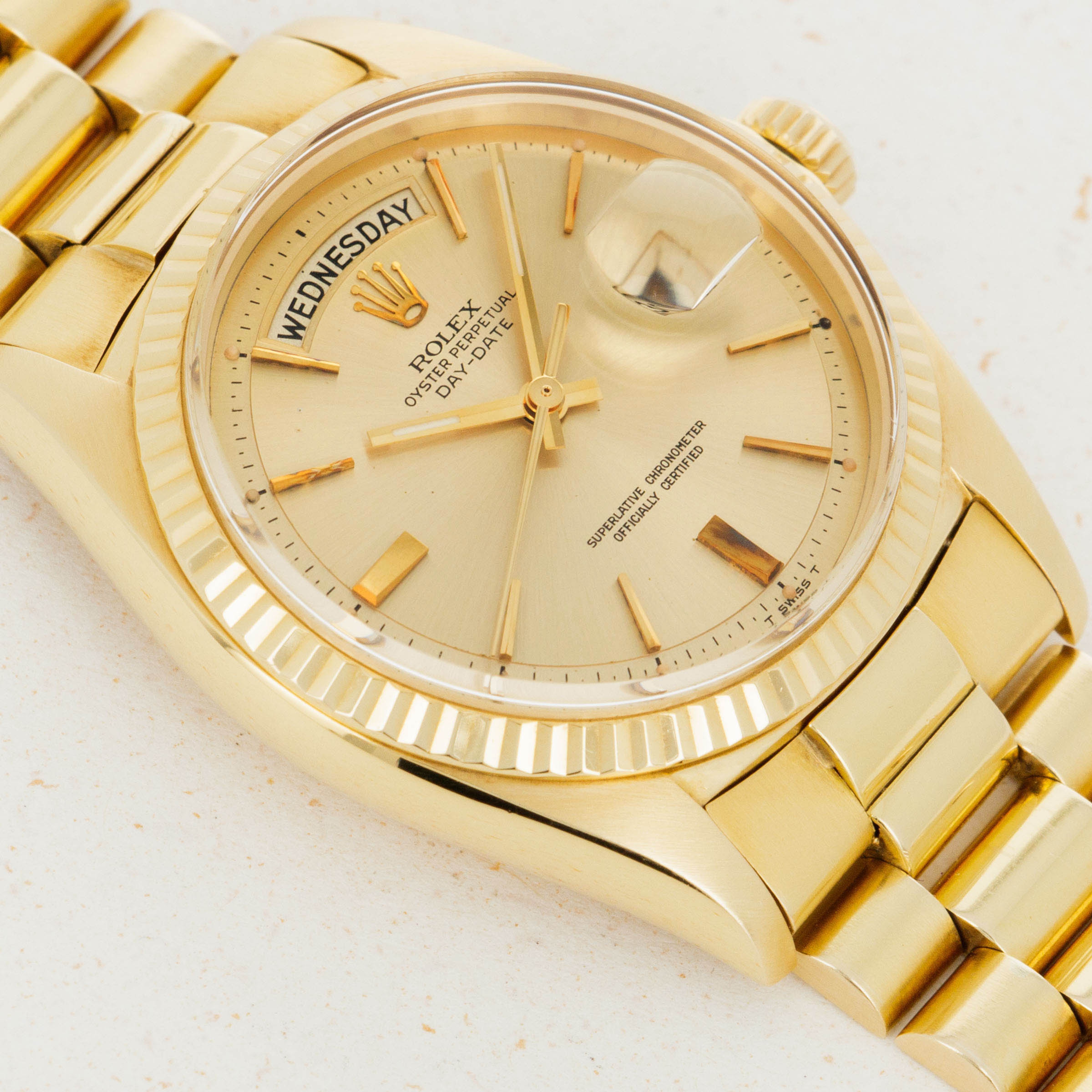 Perhaps one of the most iconic silhouettes within watchmaking, this Day-Date ref. 1803 features a fluted 18k gold bezel and President bracelet that combine to loudly declare its exclusivity through its distinct wrist presence.
