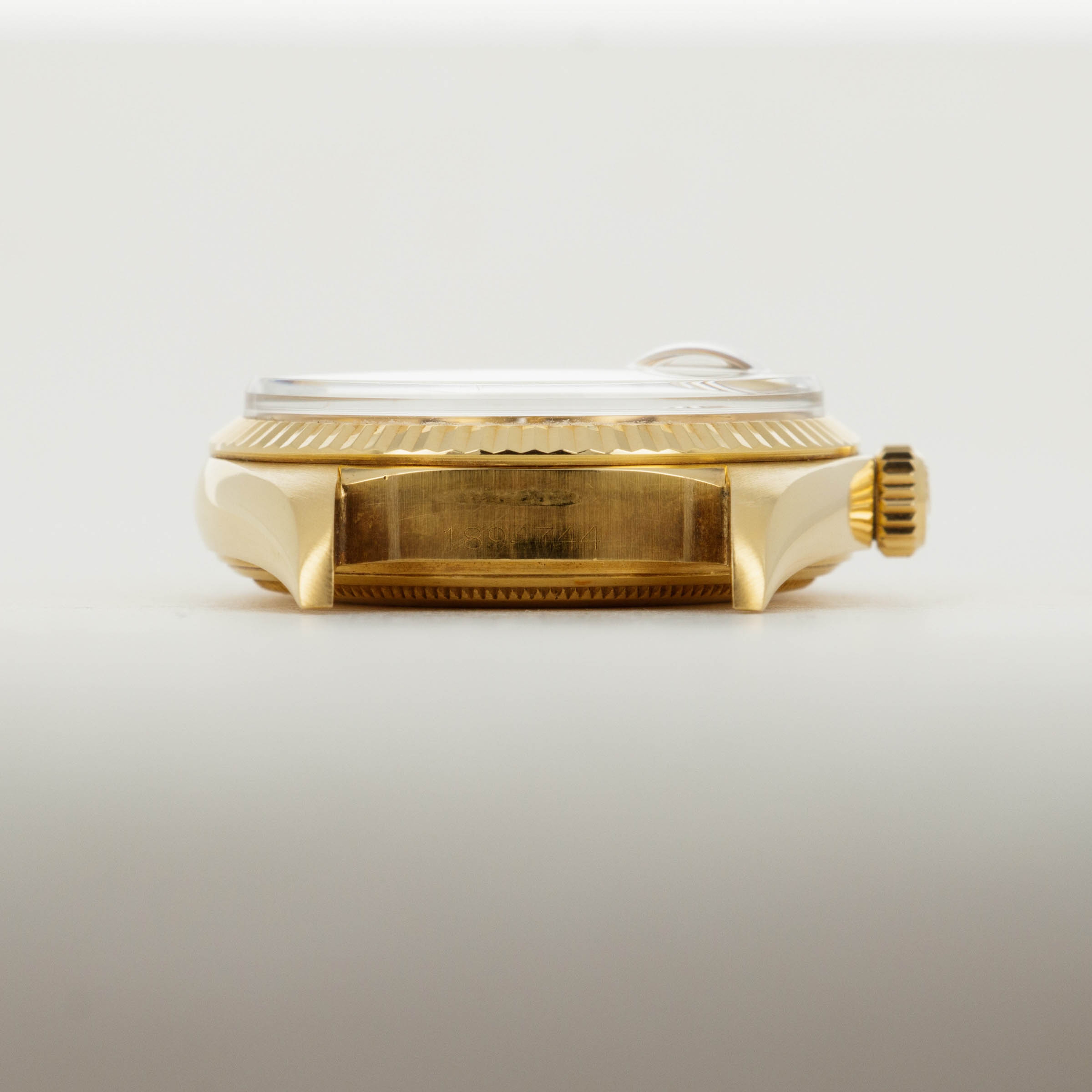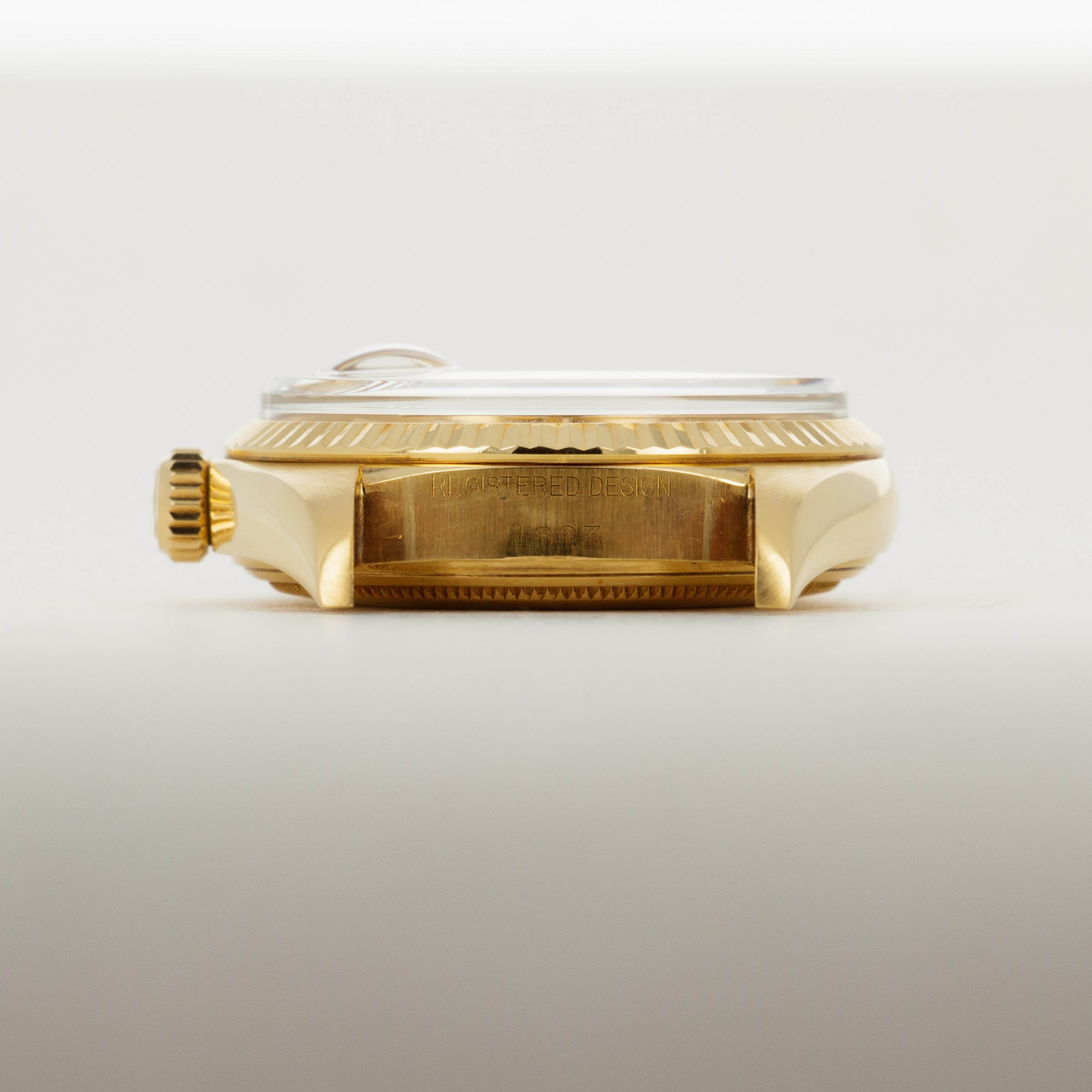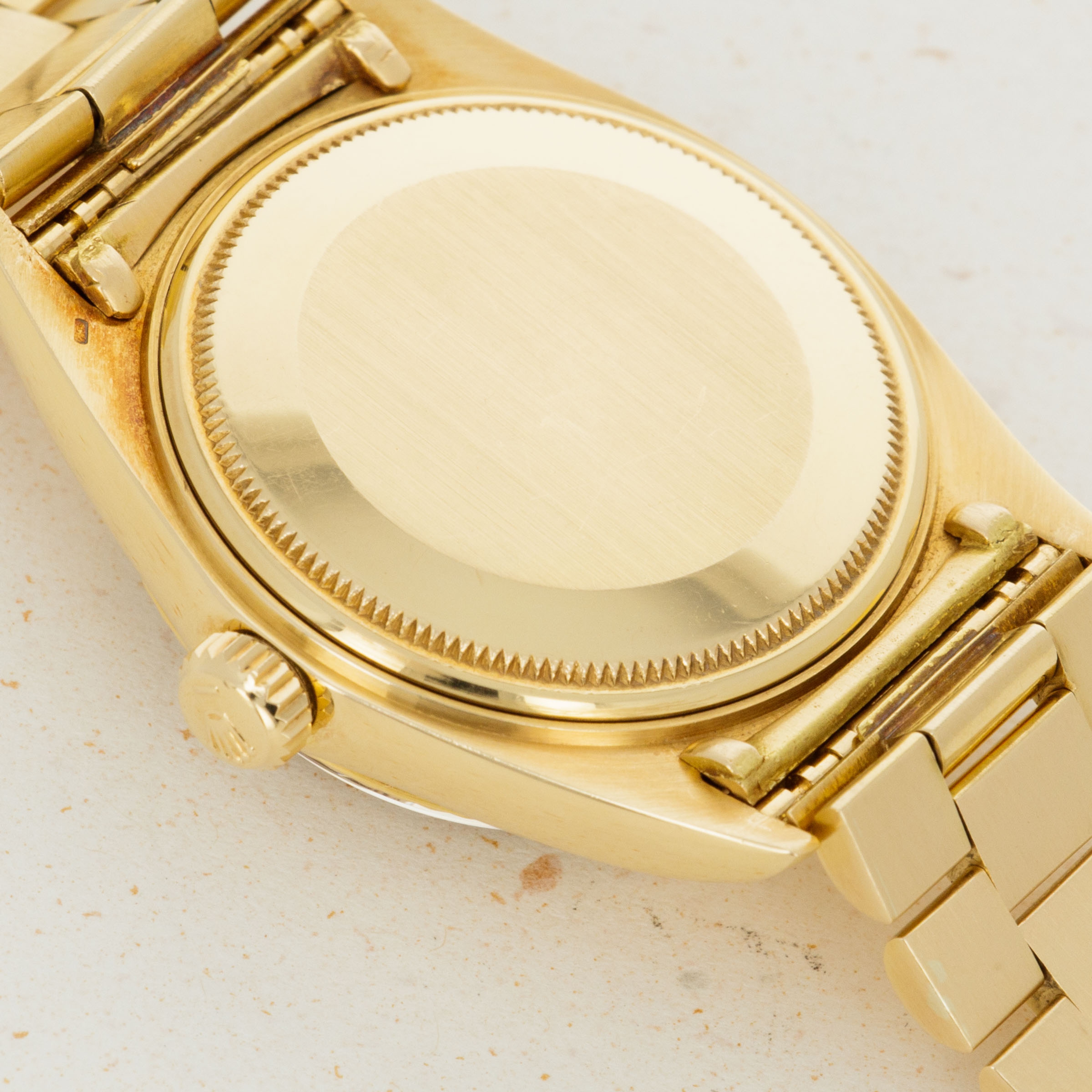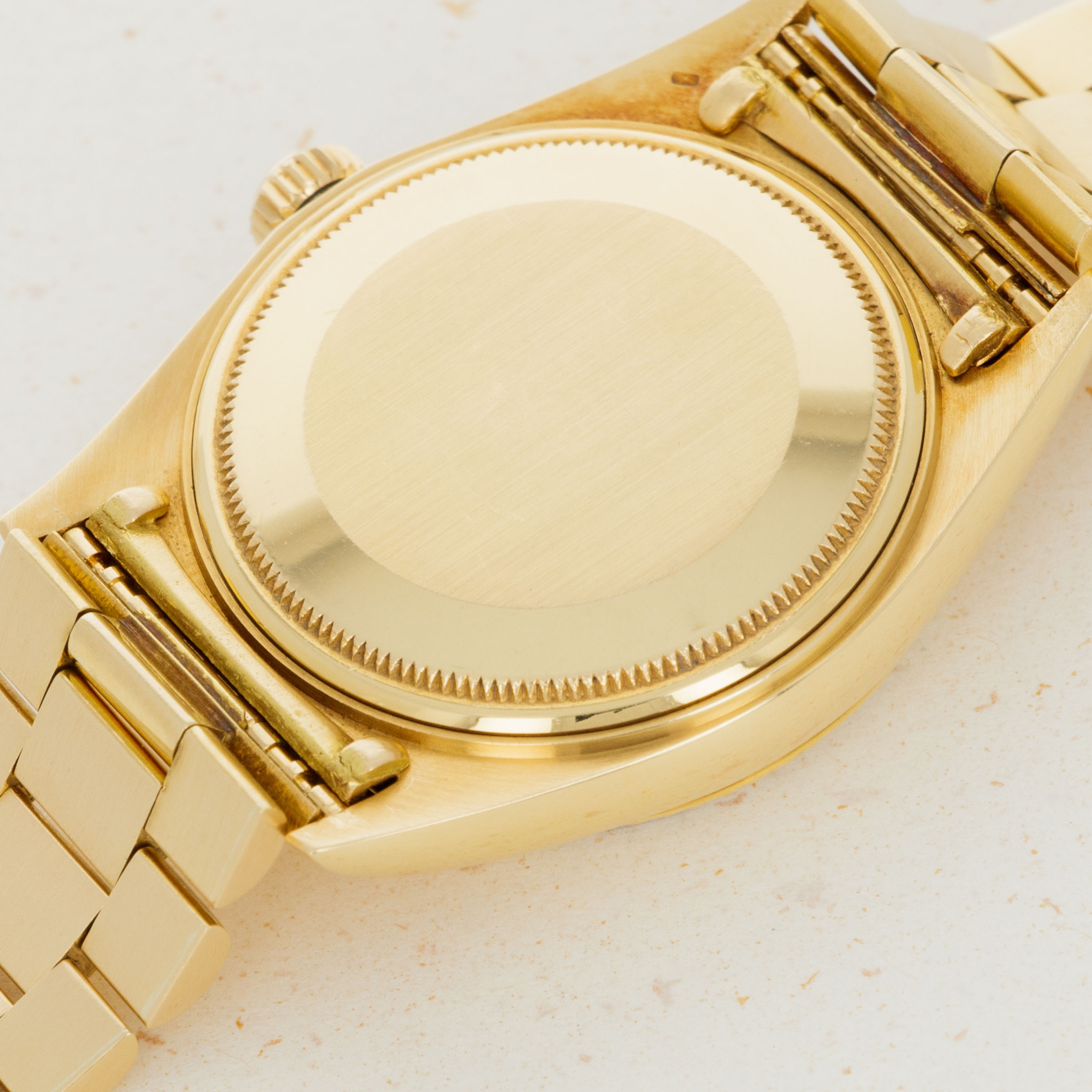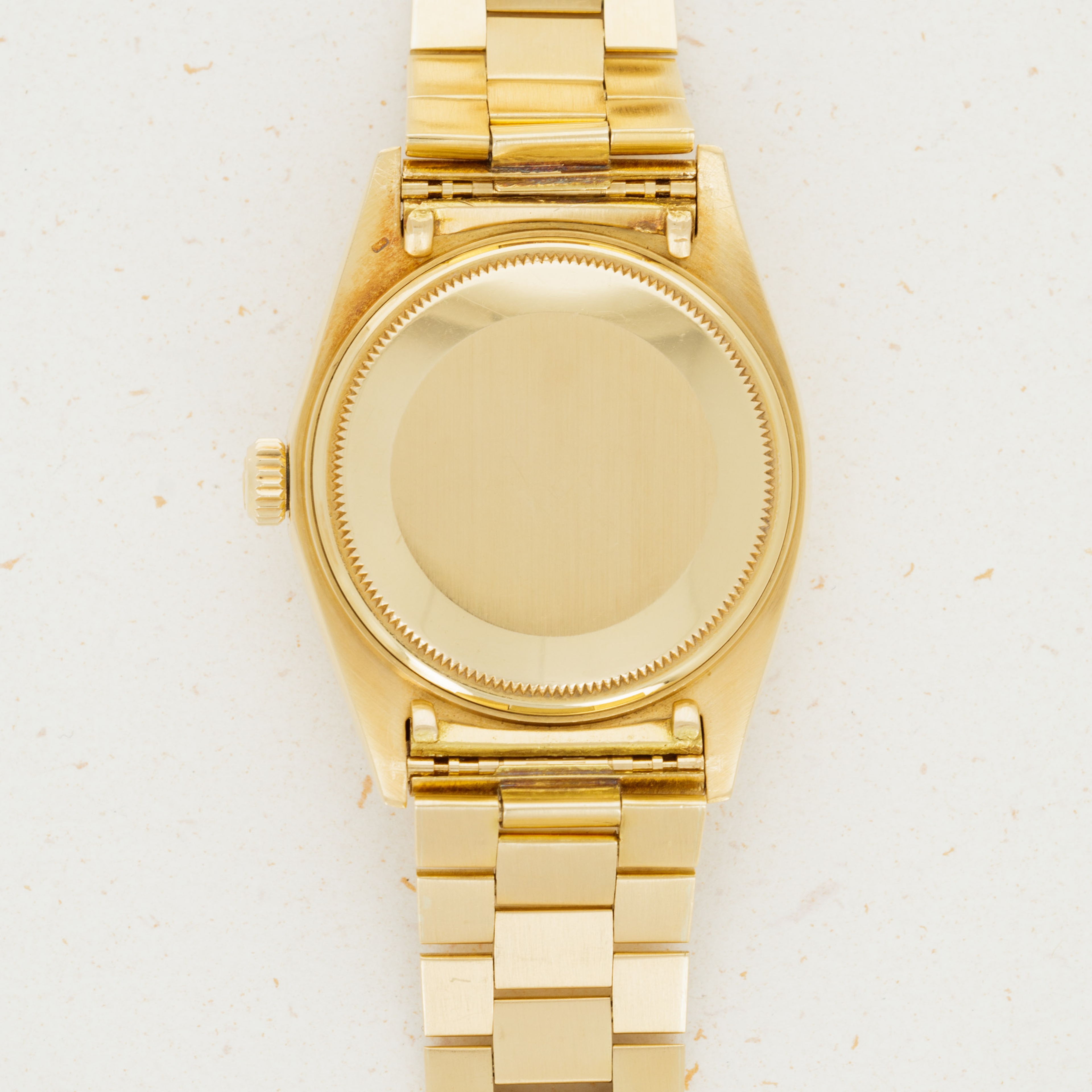 Perhaps one of the most iconic silhouettes within watchmaking, this Day-Date ref. 1803 features a fluted 18k gold bezel and President bracelet that combine to loudly declare its exclusivity through its distinct wrist presence.