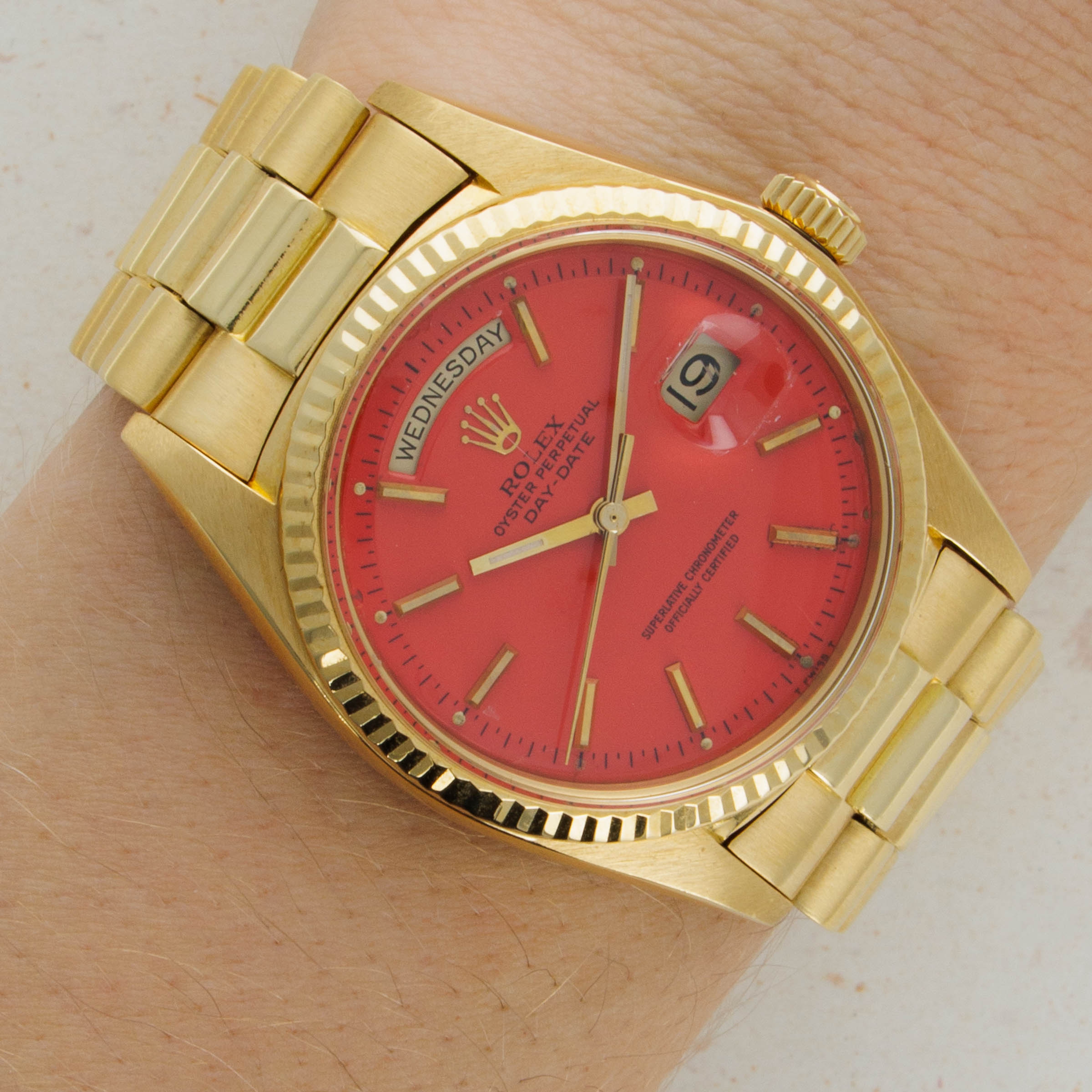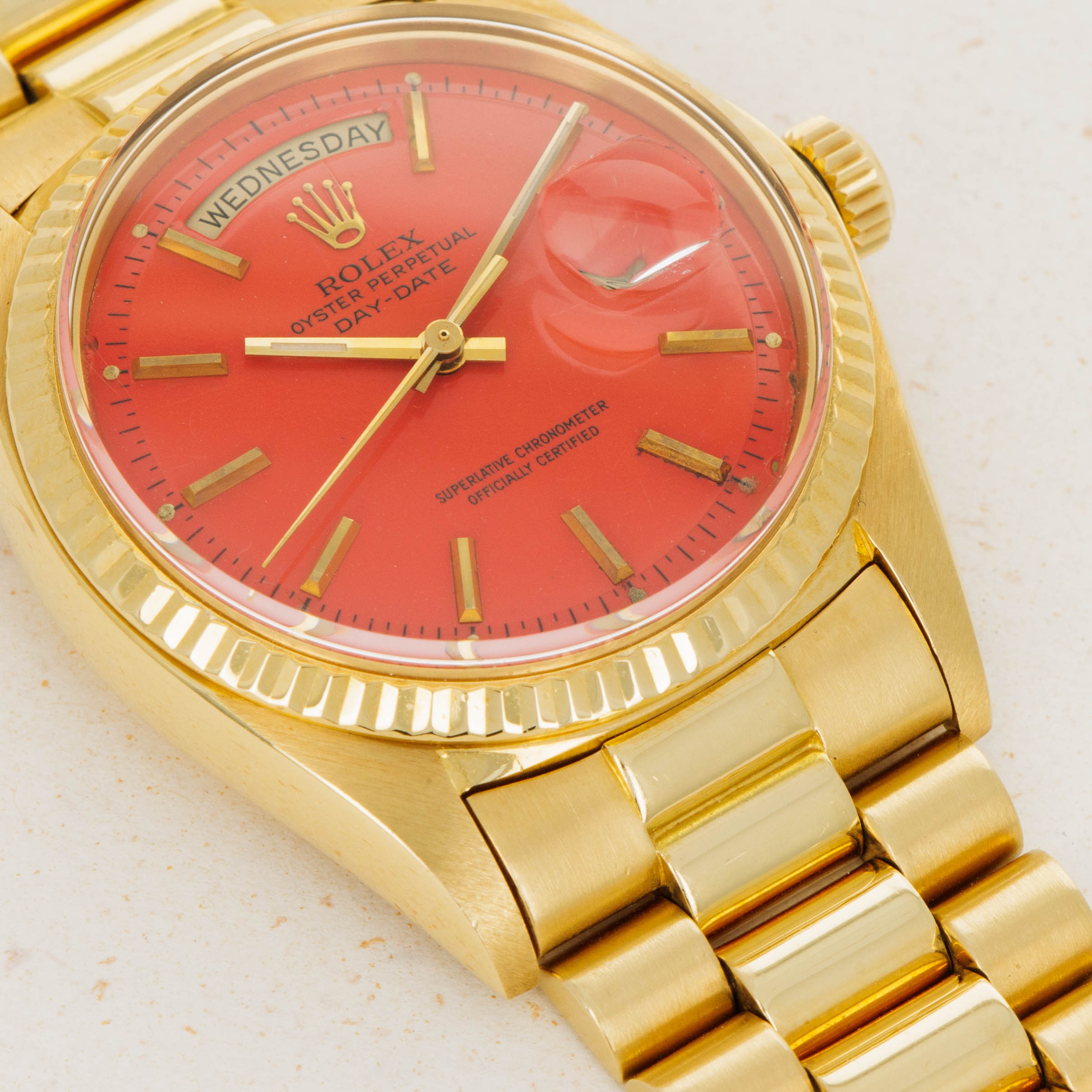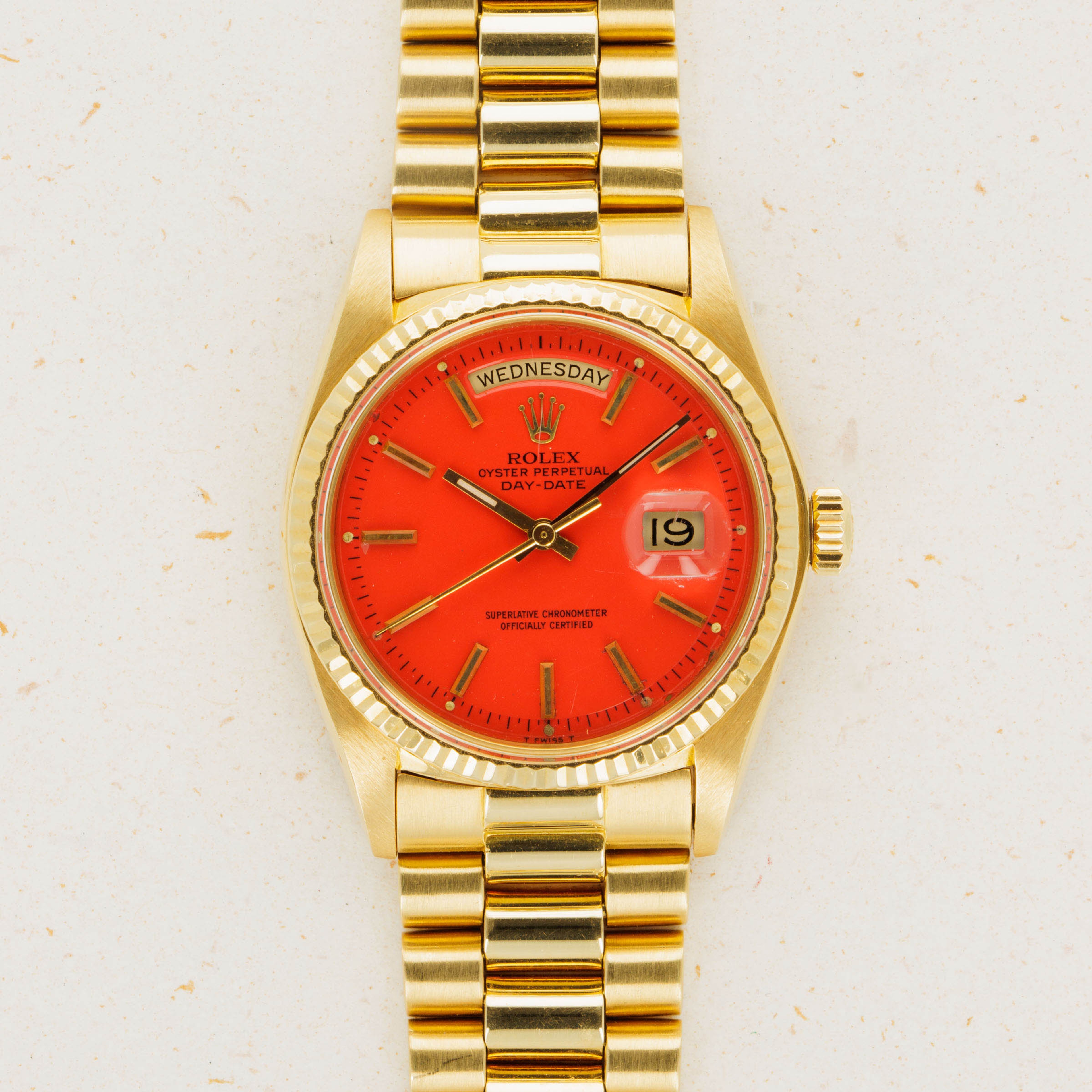 While its pie-pan orange Stella dial is certainly the star of the show, this ref. 1803's well-preserved 18kt yellow gold case, bracelet, and bezel combine to top off its exceptional dial very nicely.