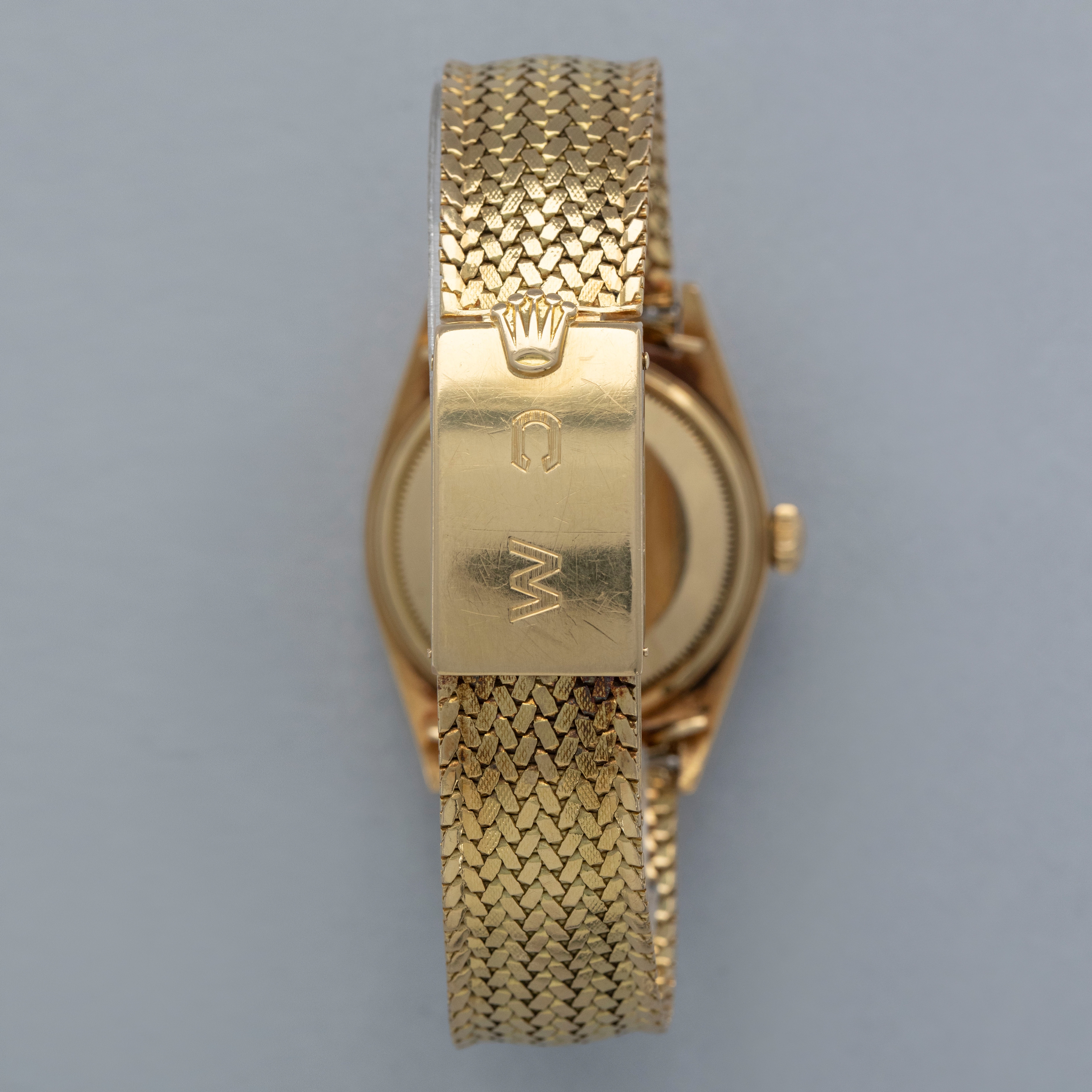 Watch is in overall excellent condition. The yellow gold case shows light surface scratches and marks consistent with age, with a still-legible hallmark visible on the back of the lug. The case back displays a number of deeper scratches, most likely from a case back tool. The fluted bezel remains well defined with some debris trapped between the teeth and light oxidation present. The silver pie-pan dial remains excellent with intact lume plots, while the applied hour markers and hands show light oxidation. It is fitted with an unusual factory yellow gold woven bracelet retaining good definition to the finish, along with a Rolex clasp showing surface marks, light wear to the coronet, and a personal engraving. The bracelet fits approximately a 7¾” wrist.