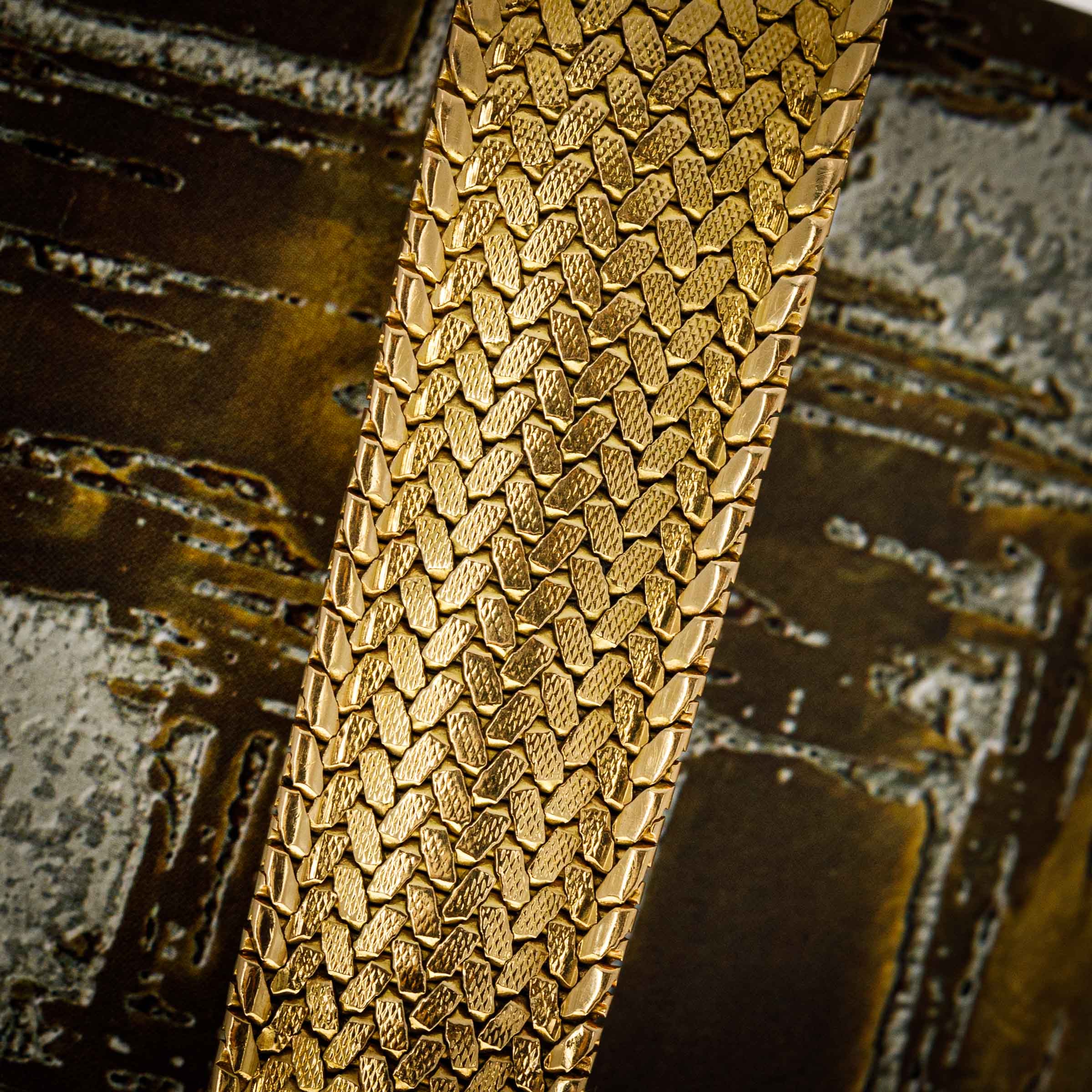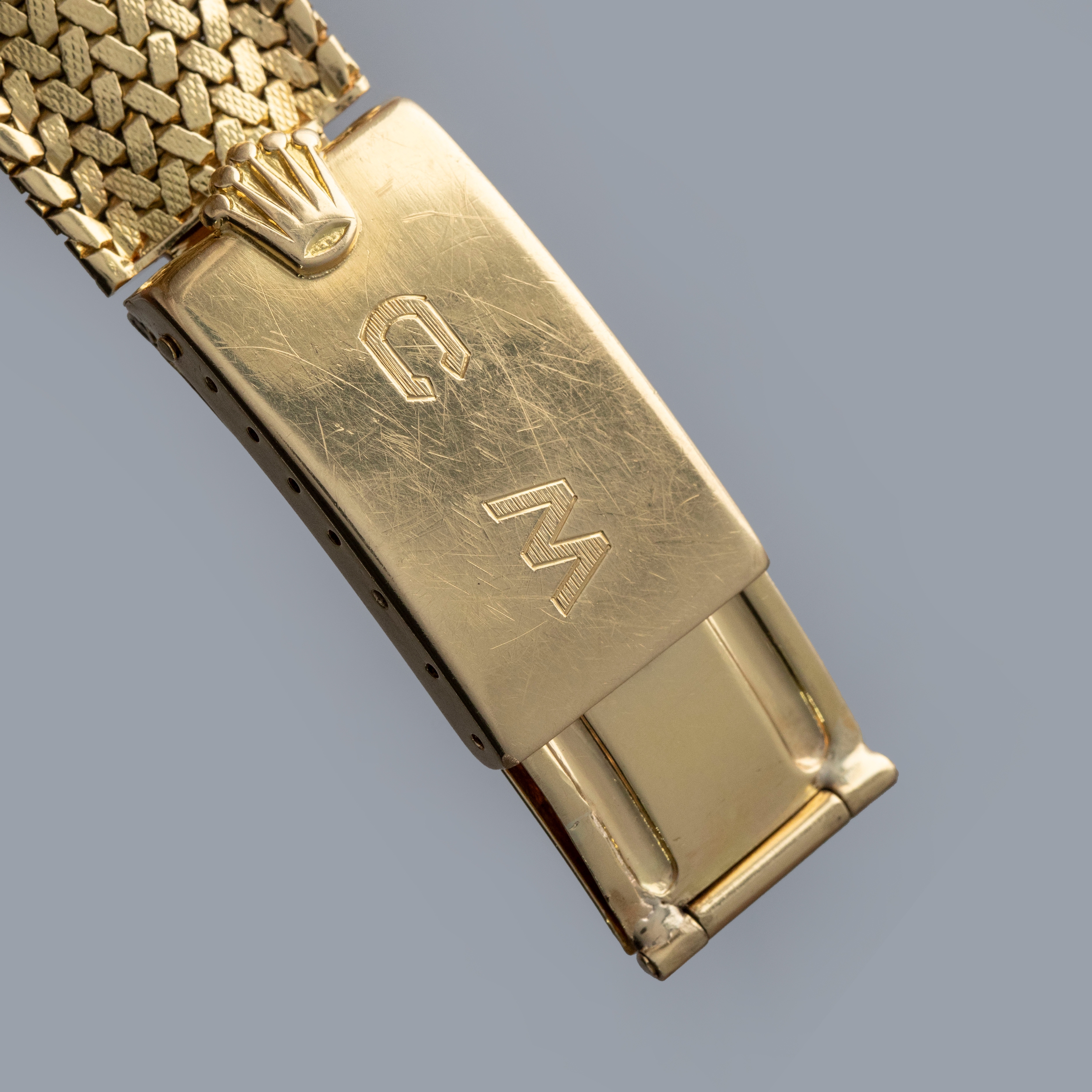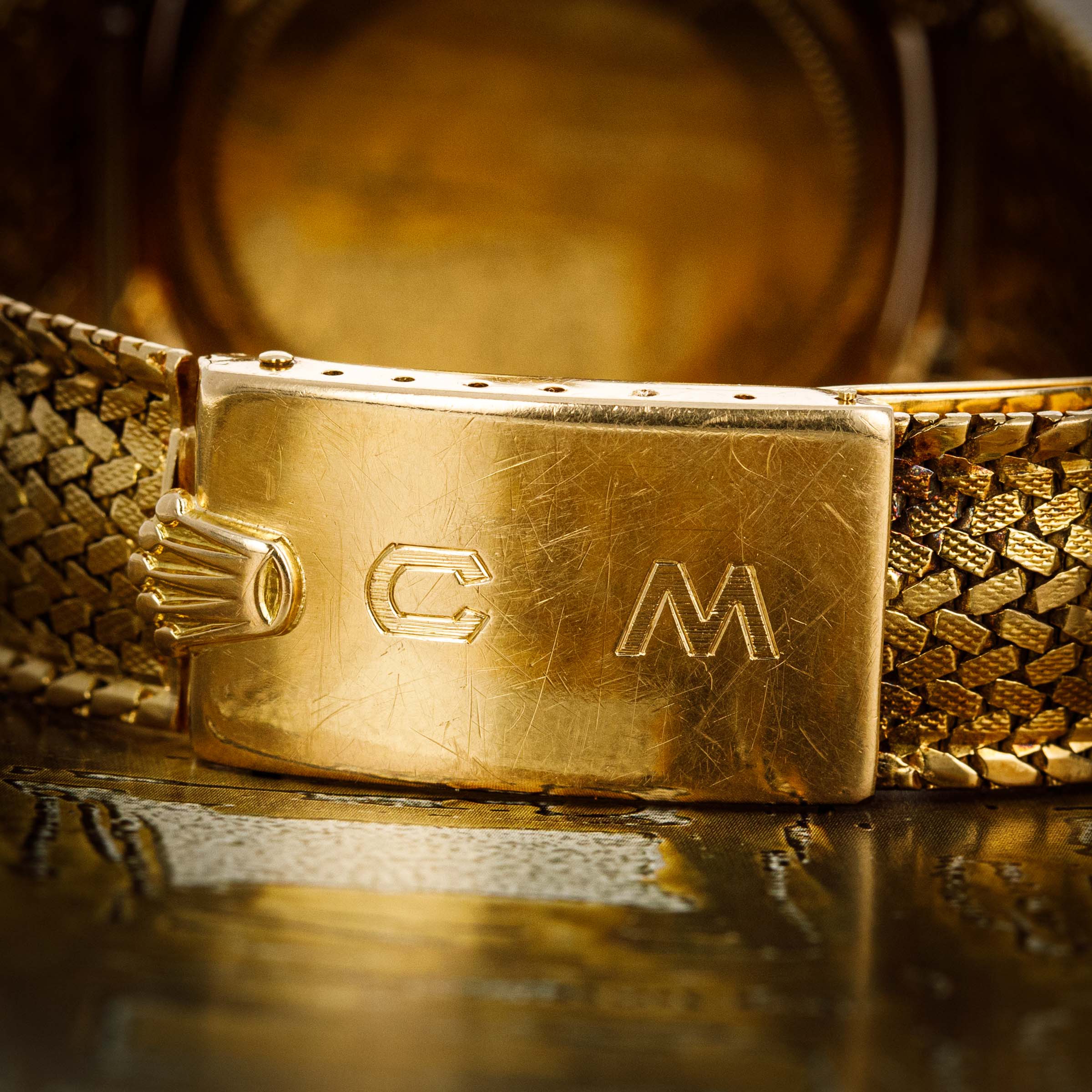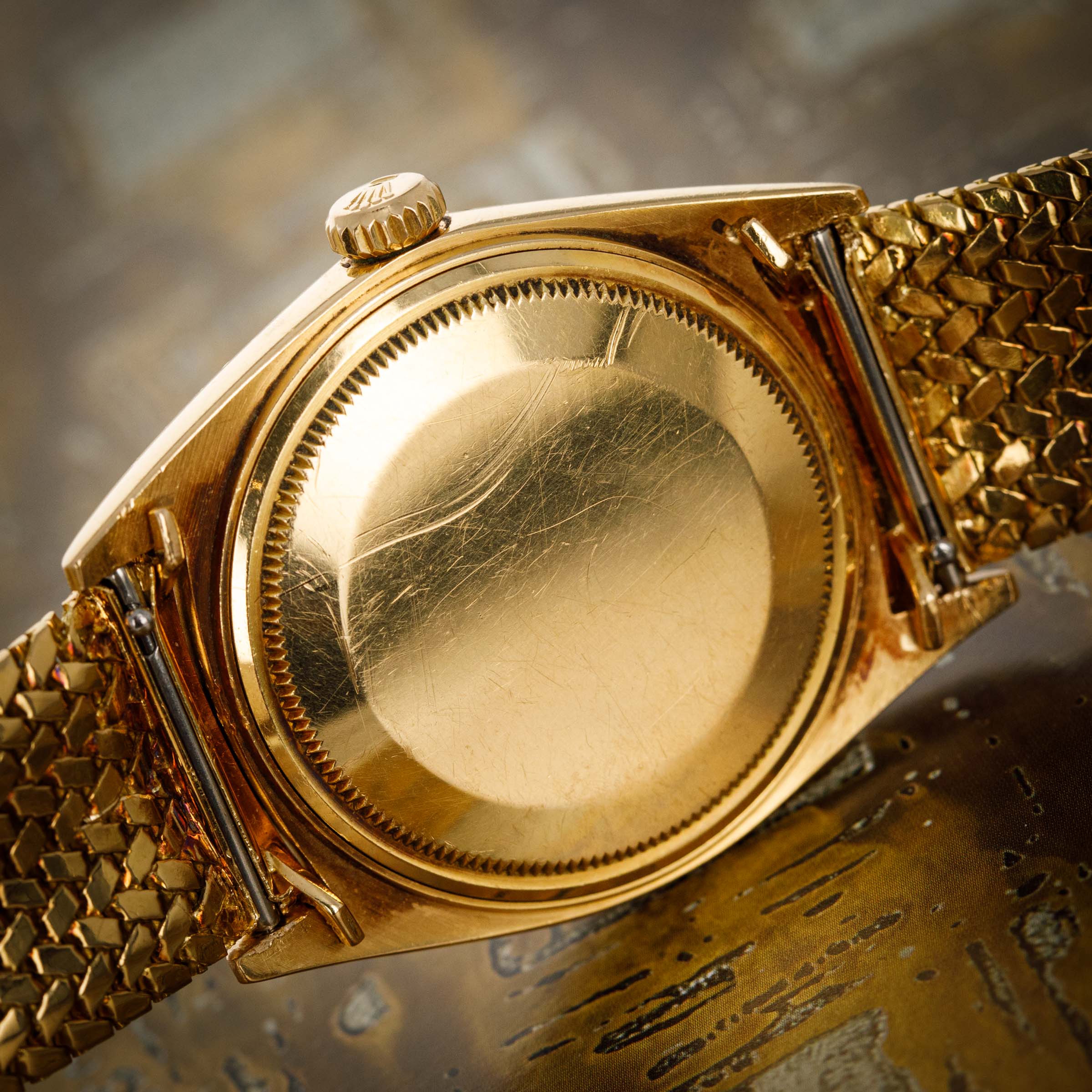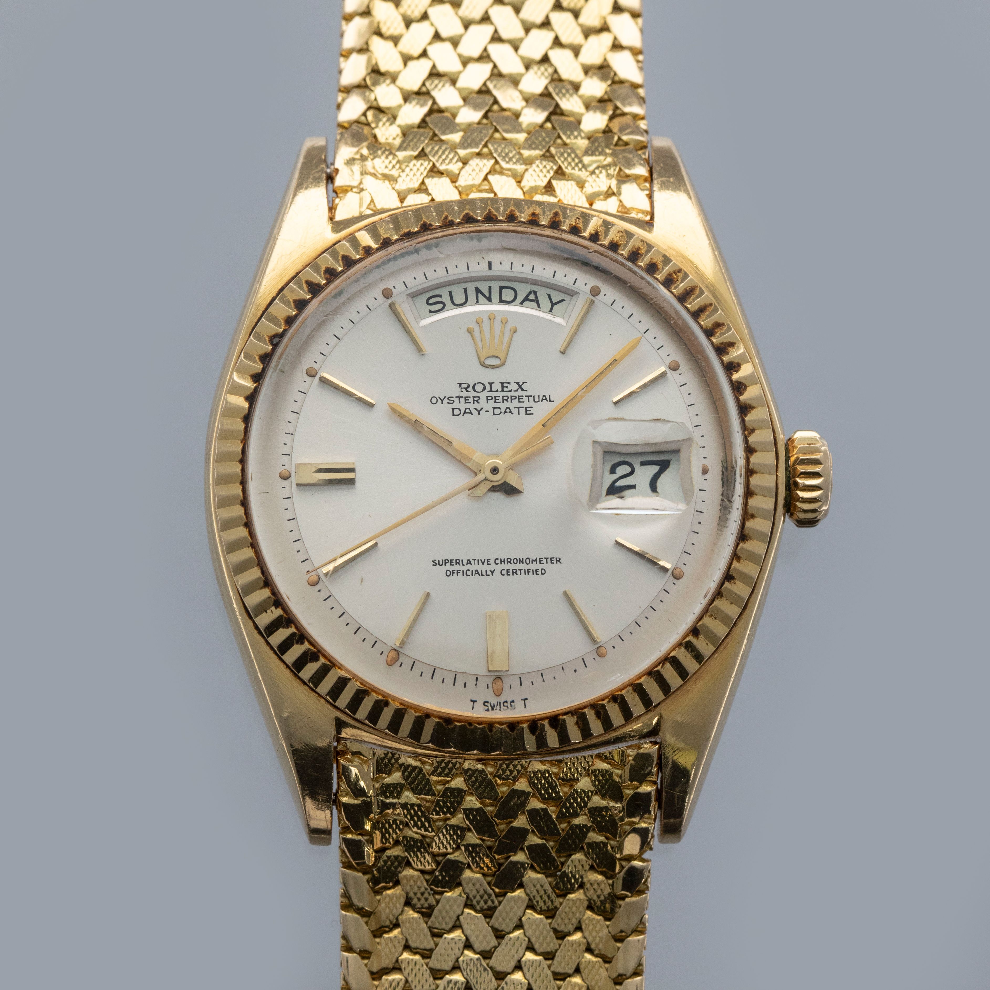 A splendidly exuberant variant of the Day-Date, this example boasts an intricate 18kt yellow gold woven mesh bracelet that has totally transformed the ref. 1803's aesthetic, making it a fabulous expression of Rolex's ability to create some truly outstanding timepieces.