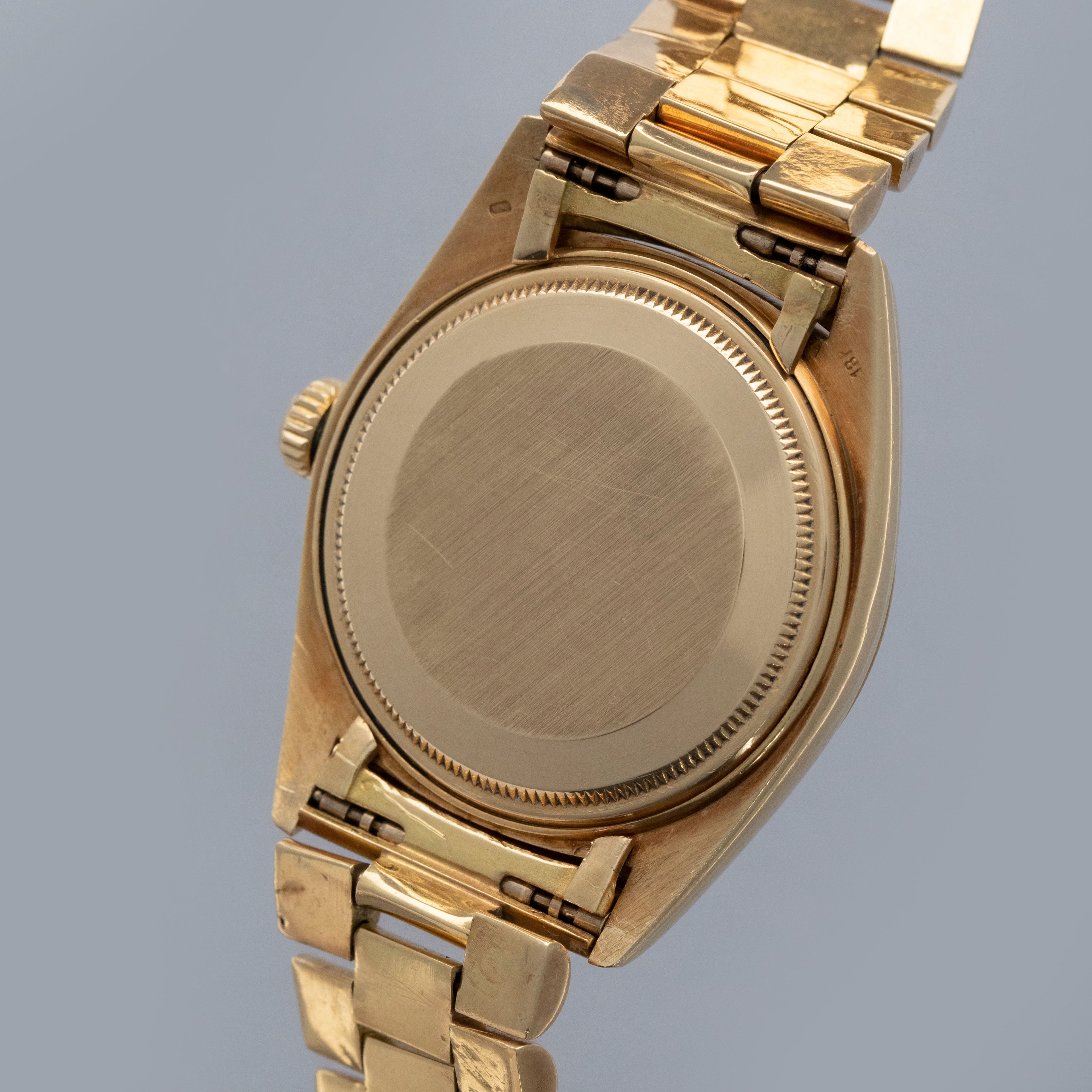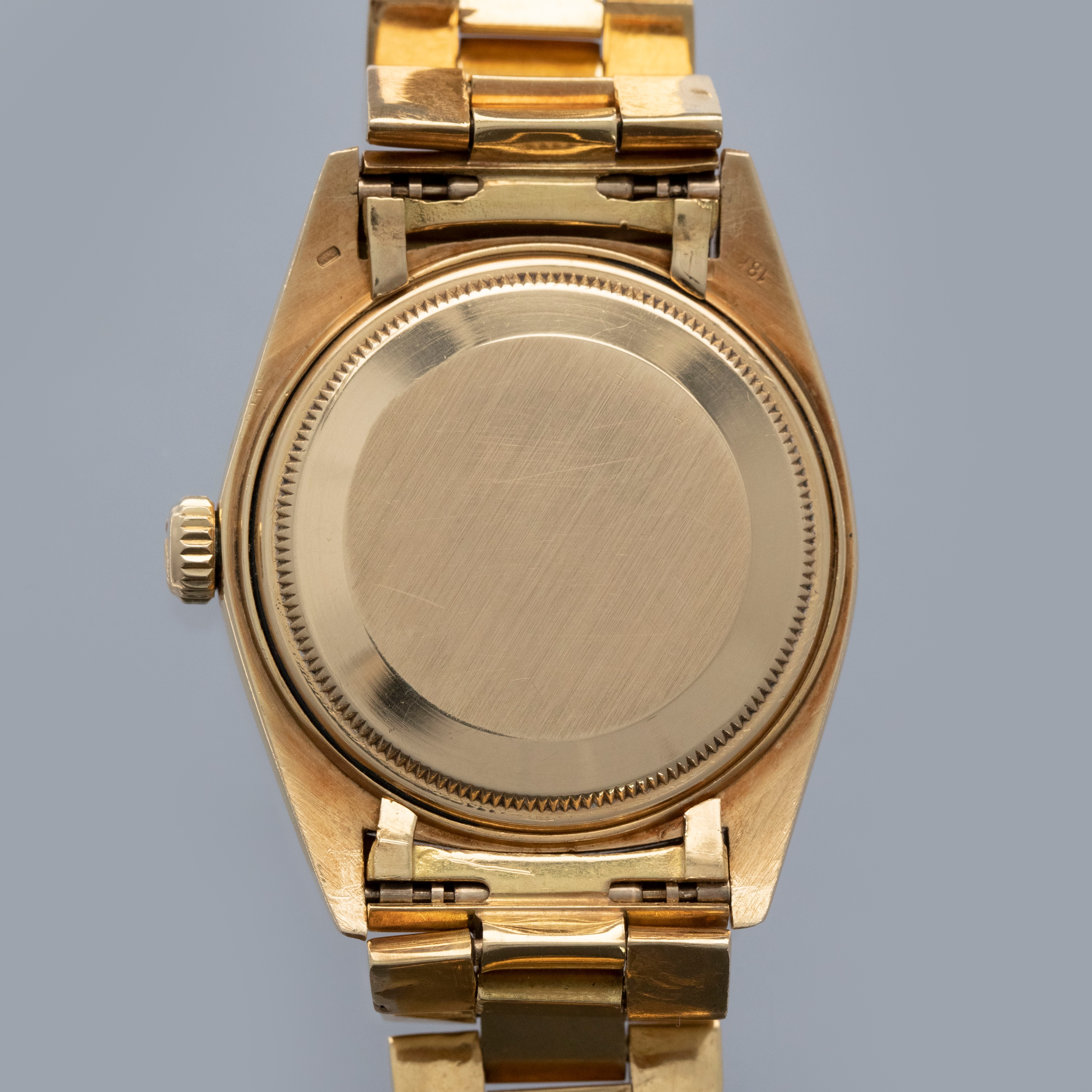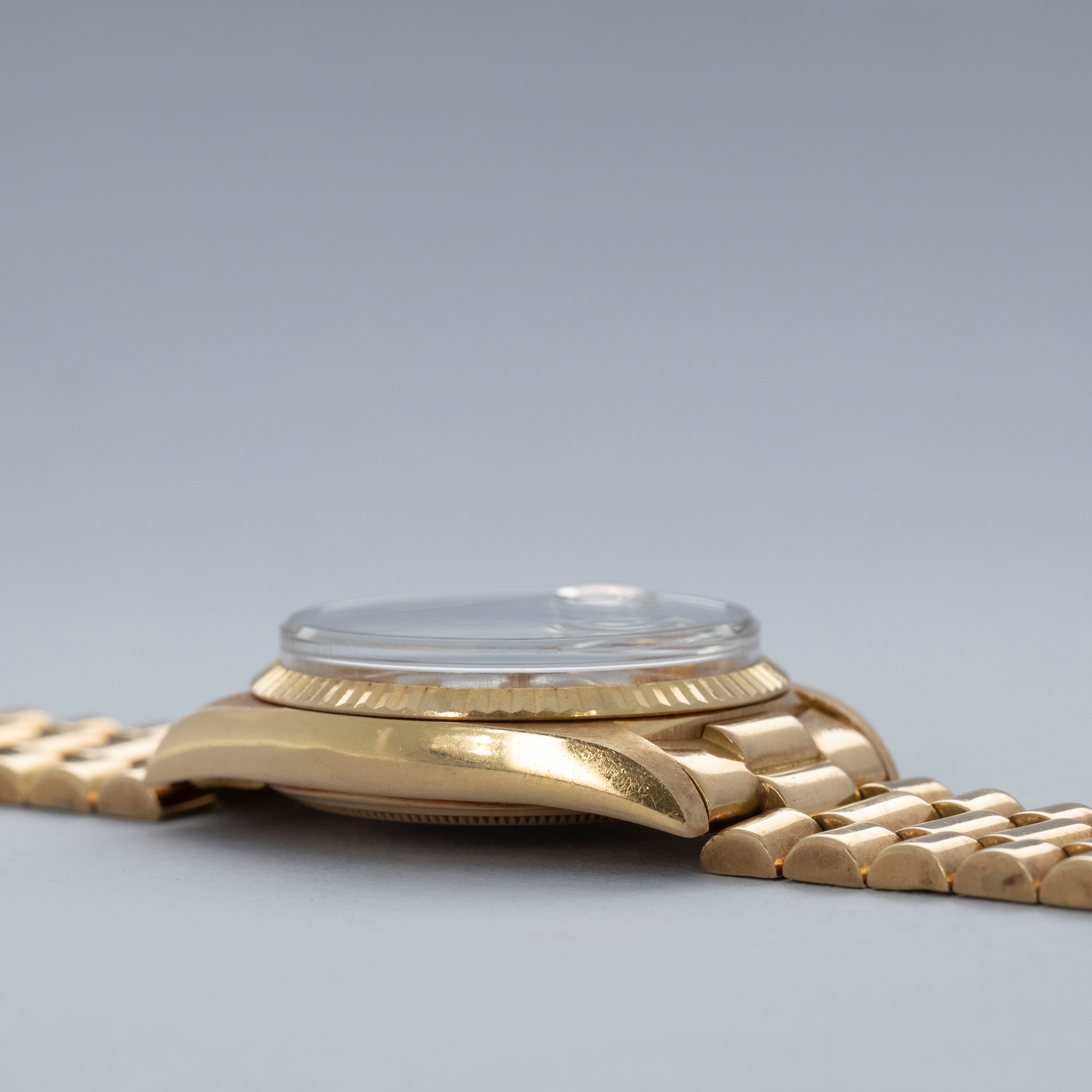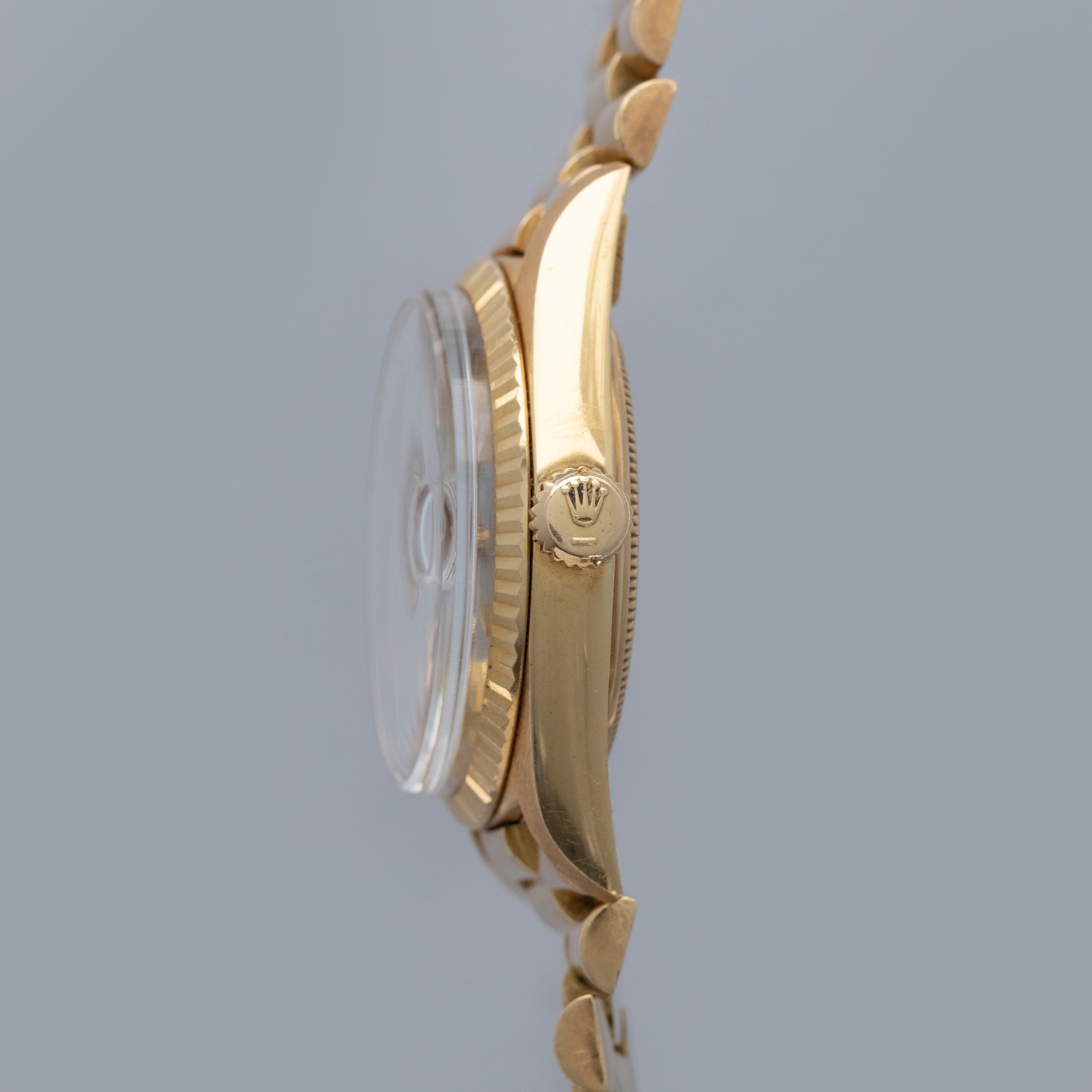 Watch is in overall excellent condition. The yellow gold case shows surface marks and light scratches as expected of a watch of this vintage. The case back displays light marks, while the hallmark and stamp on the backs of the lugs remain well defined. The yellow gold winding crown shows signs of wear. The grey pie-pan dial remains excellent, with mostly good lume plots and clean hands. A few minor marks are visible on the surface. It is fitted with a yellow gold President bracelet with non-concealed clasp showing surface scratches and moderate play between the links. The bracelet is fitted with 19 links and fits approximately a 7¾” wrist. Please note that the watch ticks at time of cataloging, but timekeeping is poor and a service is recommended.