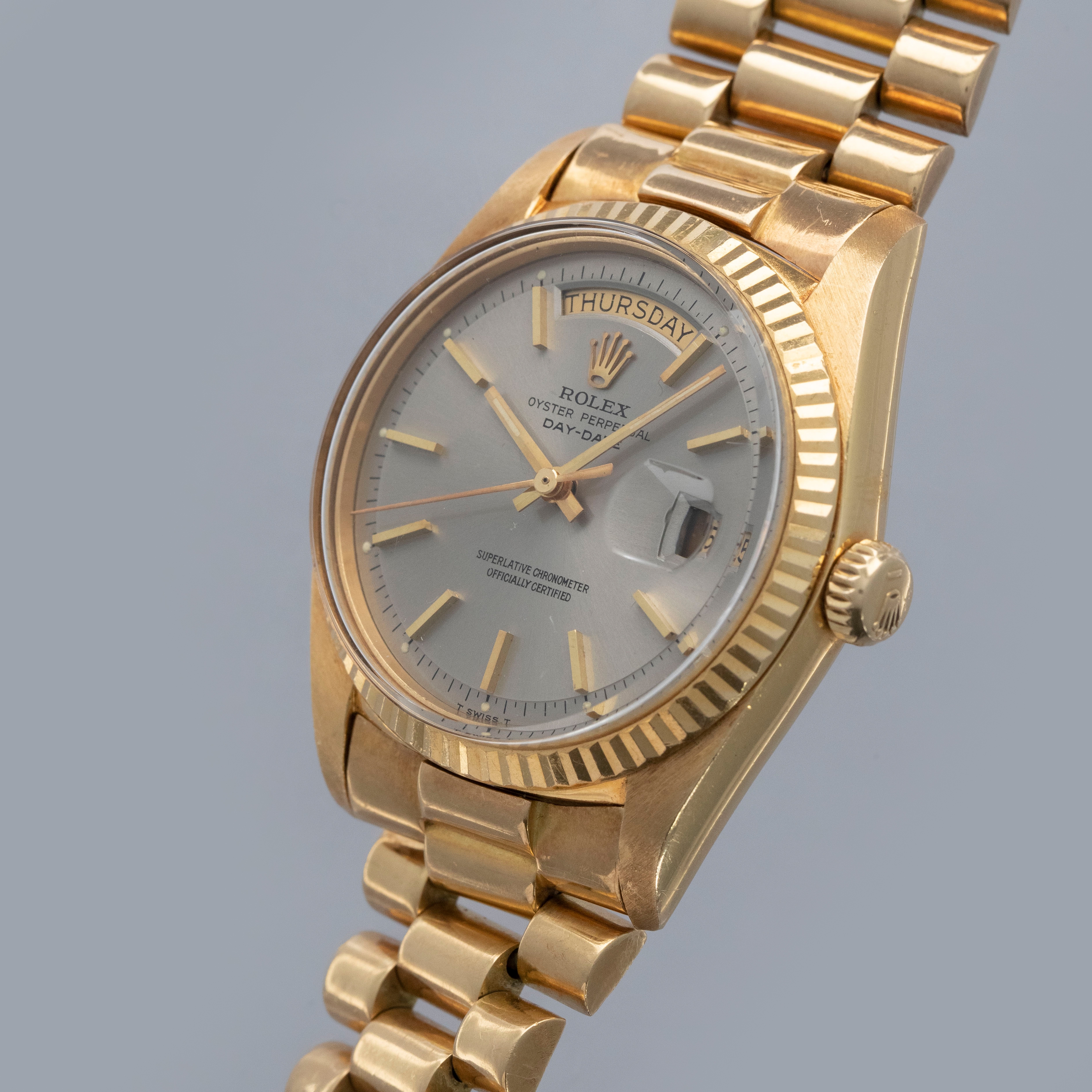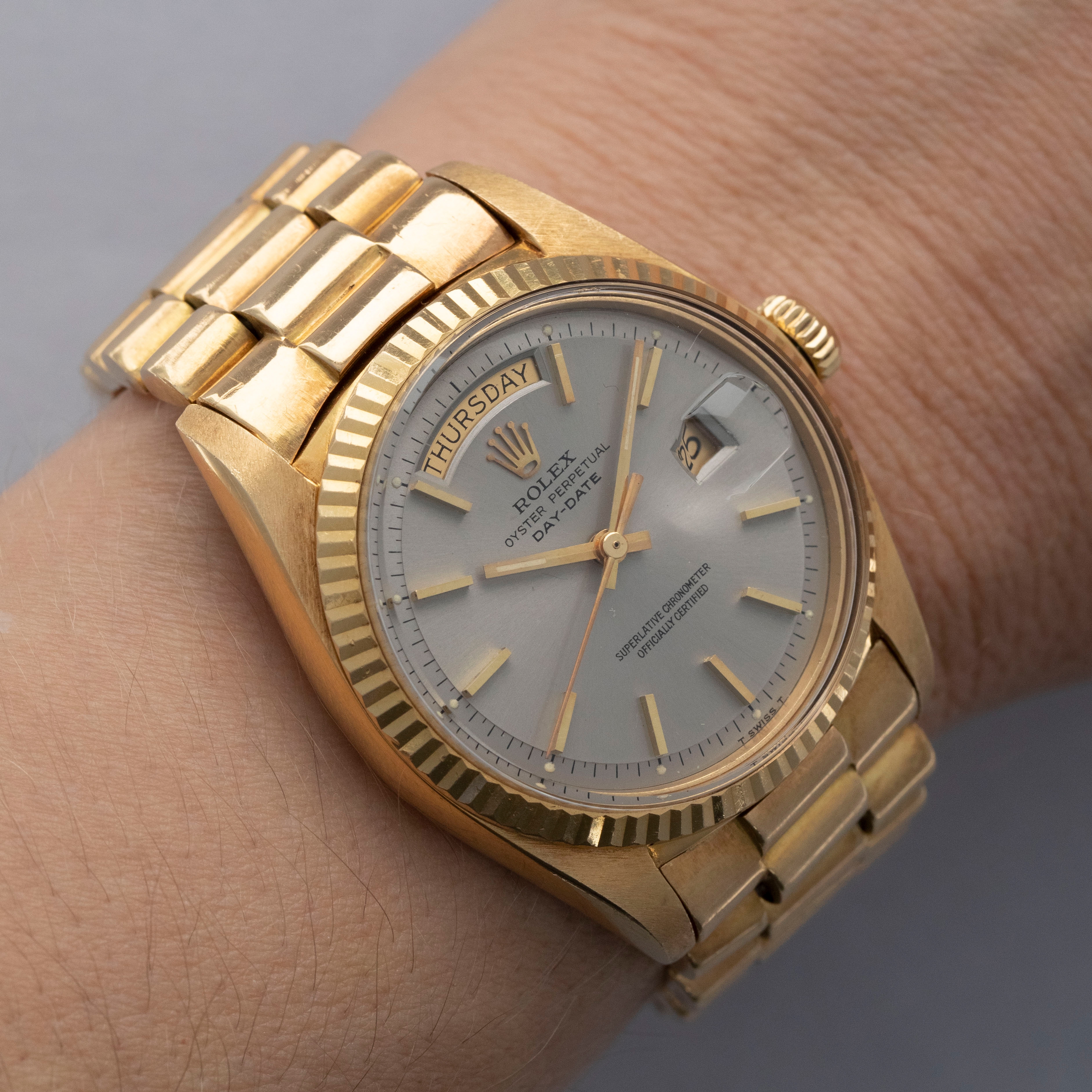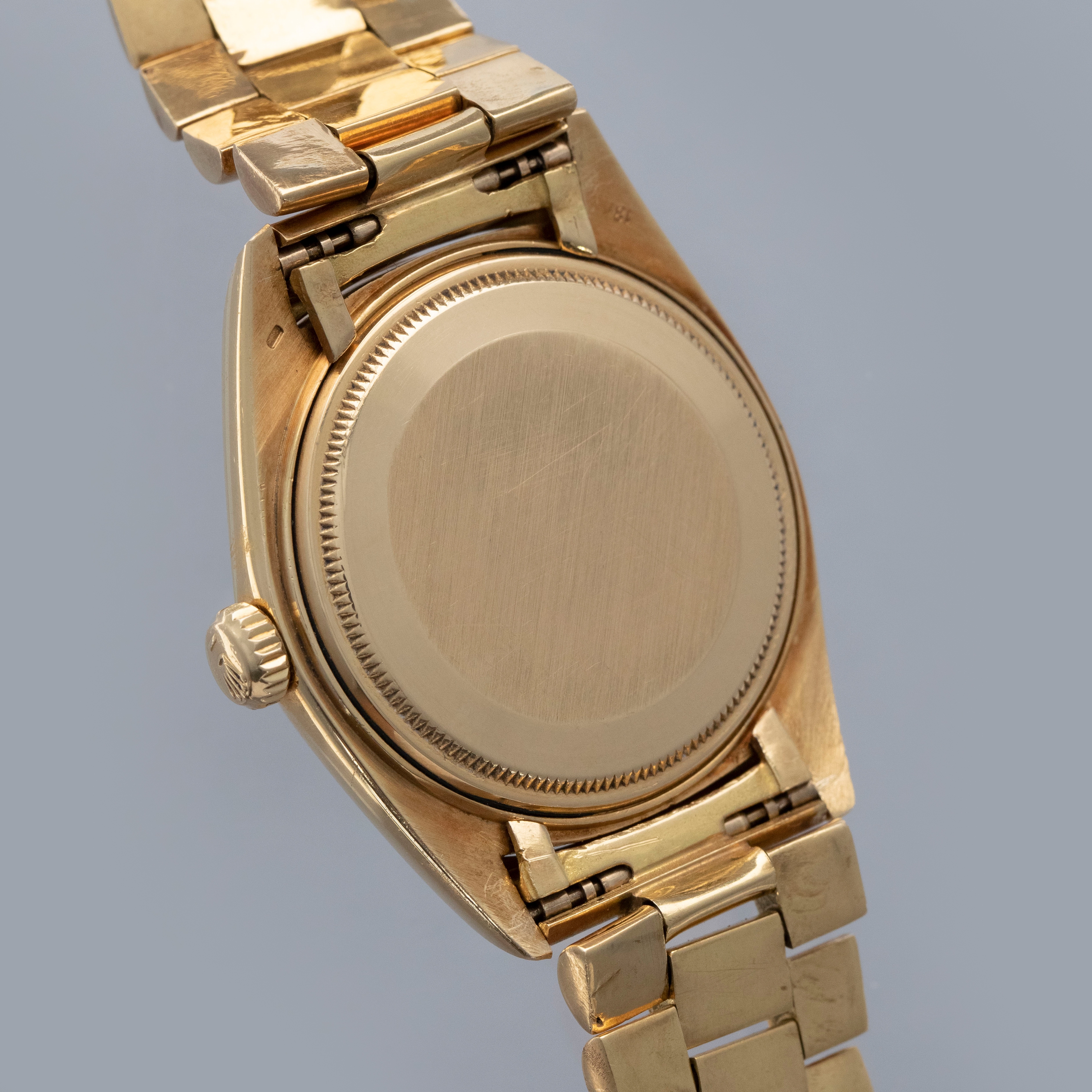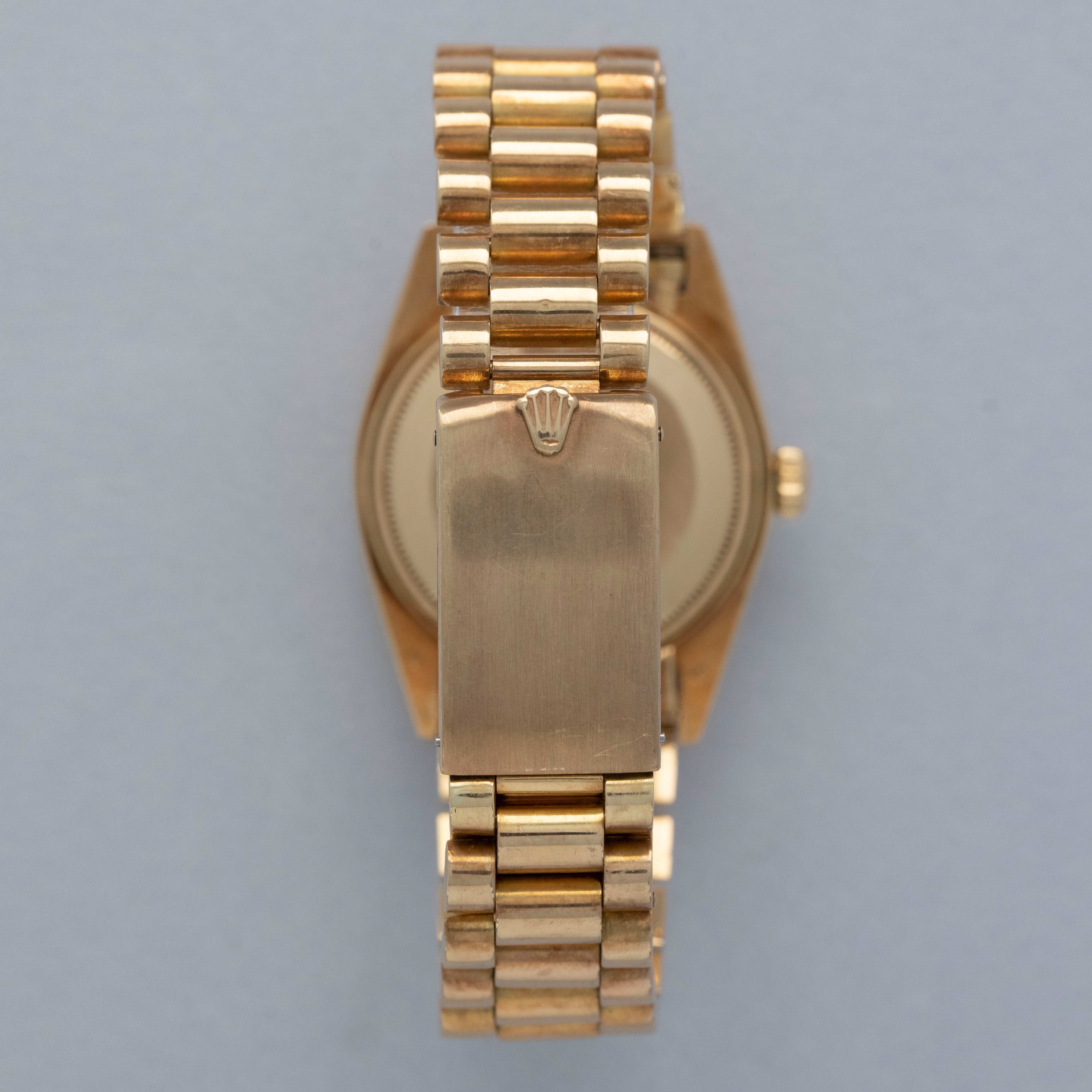 Watch is in overall excellent condition. The yellow gold case shows surface marks and light scratches as expected of a watch of this vintage. The case back displays light marks, while the hallmark and stamp on the backs of the lugs remain well defined. The yellow gold winding crown shows signs of wear. The grey pie-pan dial remains excellent, with mostly good lume plots and clean hands. A few minor marks are visible on the surface. It is fitted with a yellow gold President bracelet with non-concealed clasp showing surface scratches and moderate play between the links. The bracelet is fitted with 19 links and fits approximately a 7¾” wrist. Please note that the watch ticks at time of cataloging, but timekeeping is poor and a service is recommended.
