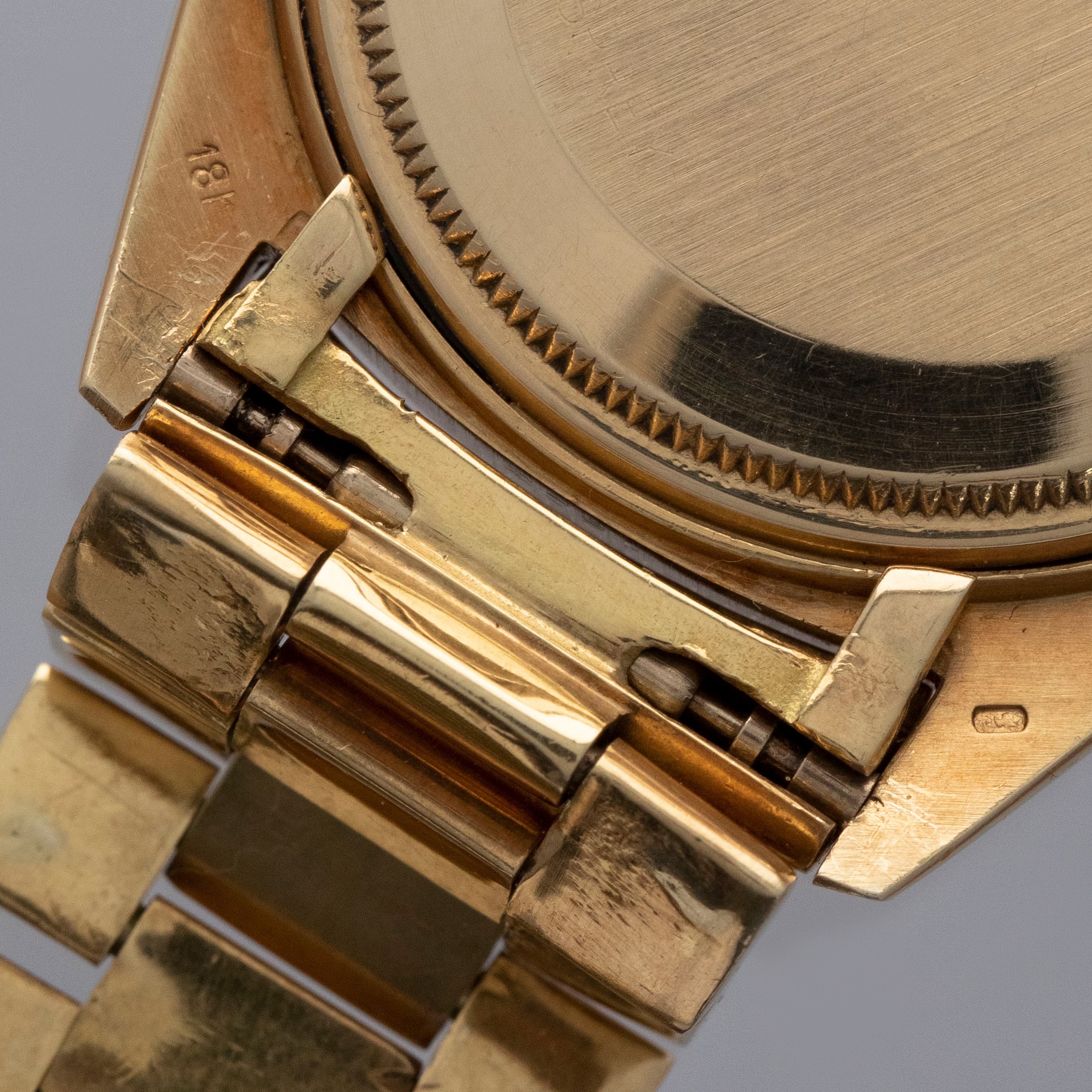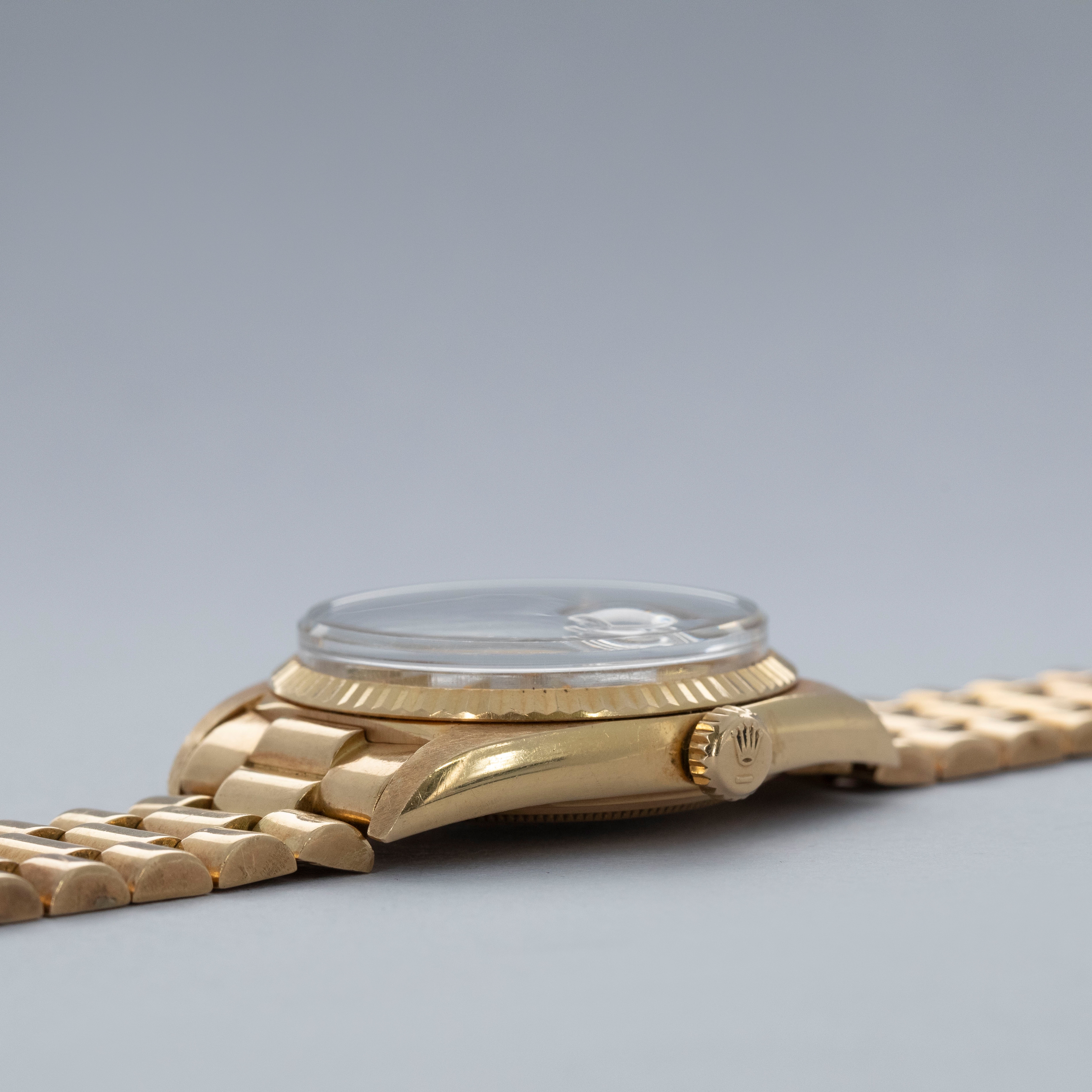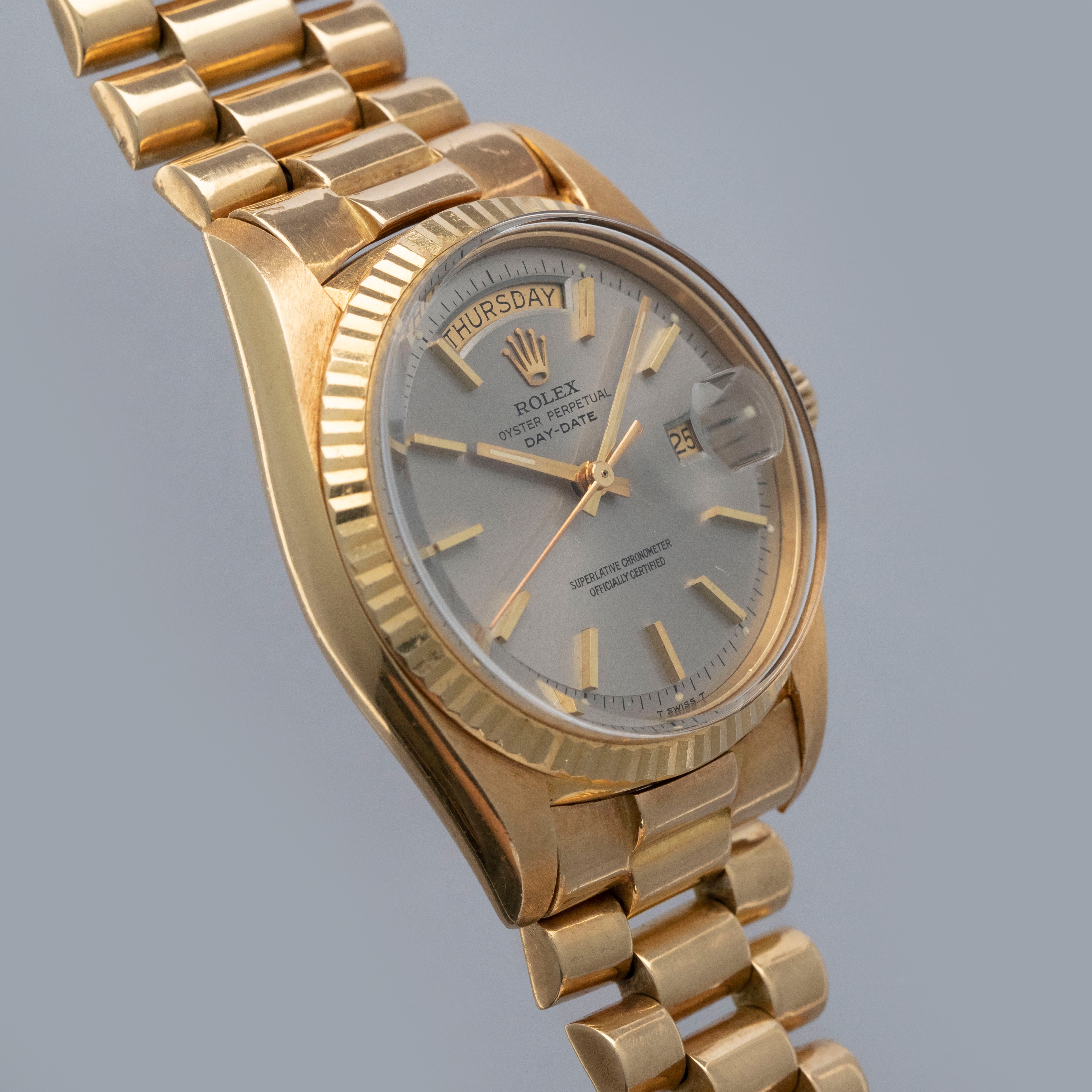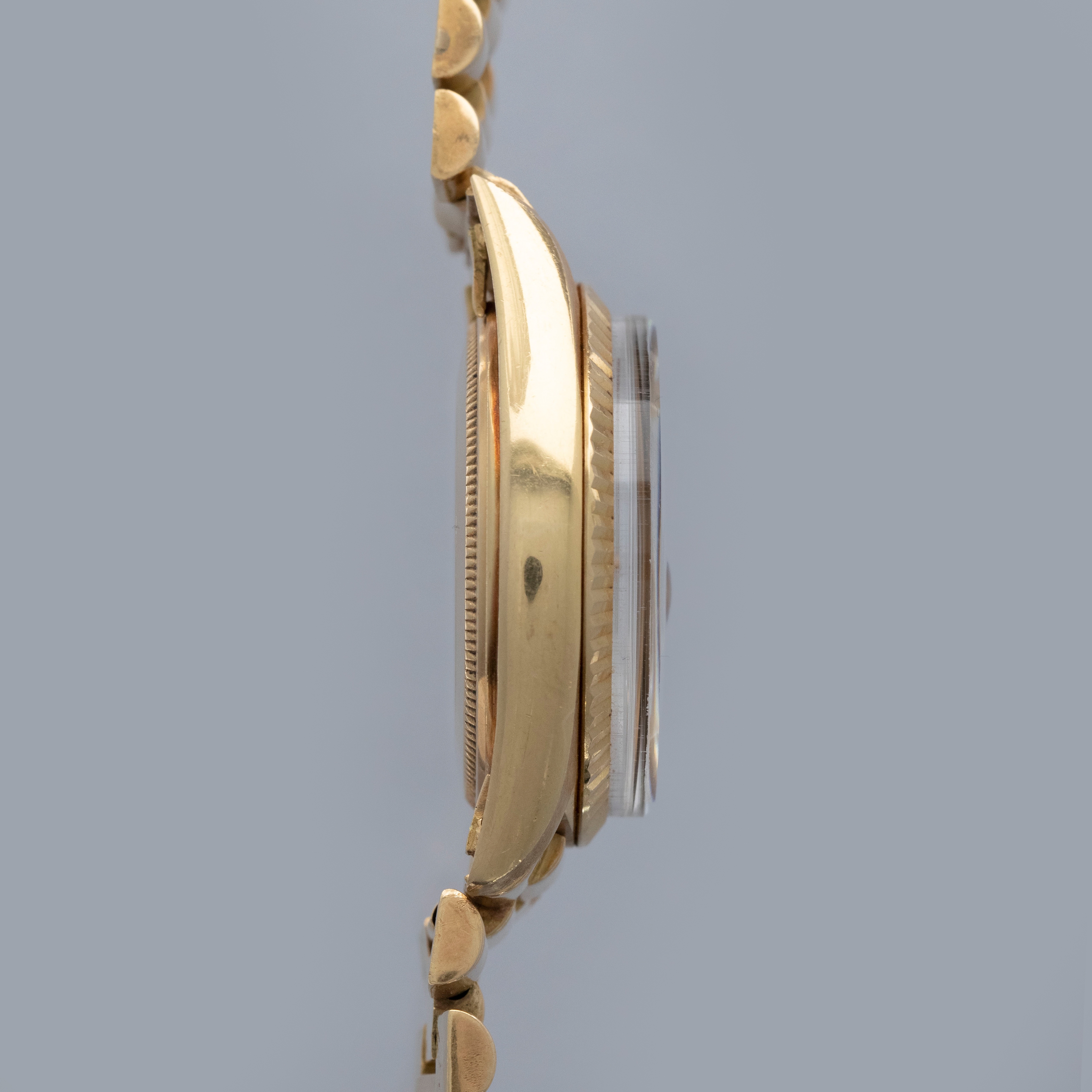 Watch is in overall excellent condition. The yellow gold case shows surface marks and light scratches as expected of a watch of this vintage. The case back displays light marks, while the hallmark and stamp on the backs of the lugs remain well defined. The yellow gold winding crown shows signs of wear. The grey pie-pan dial remains excellent, with mostly good lume plots and clean hands. A few minor marks are visible on the surface. It is fitted with a yellow gold President bracelet with non-concealed clasp showing surface scratches and moderate play between the links. The bracelet is fitted with 19 links and fits approximately a 7¾” wrist. Please note that the watch ticks at time of cataloging, but timekeeping is poor and a service is recommended.