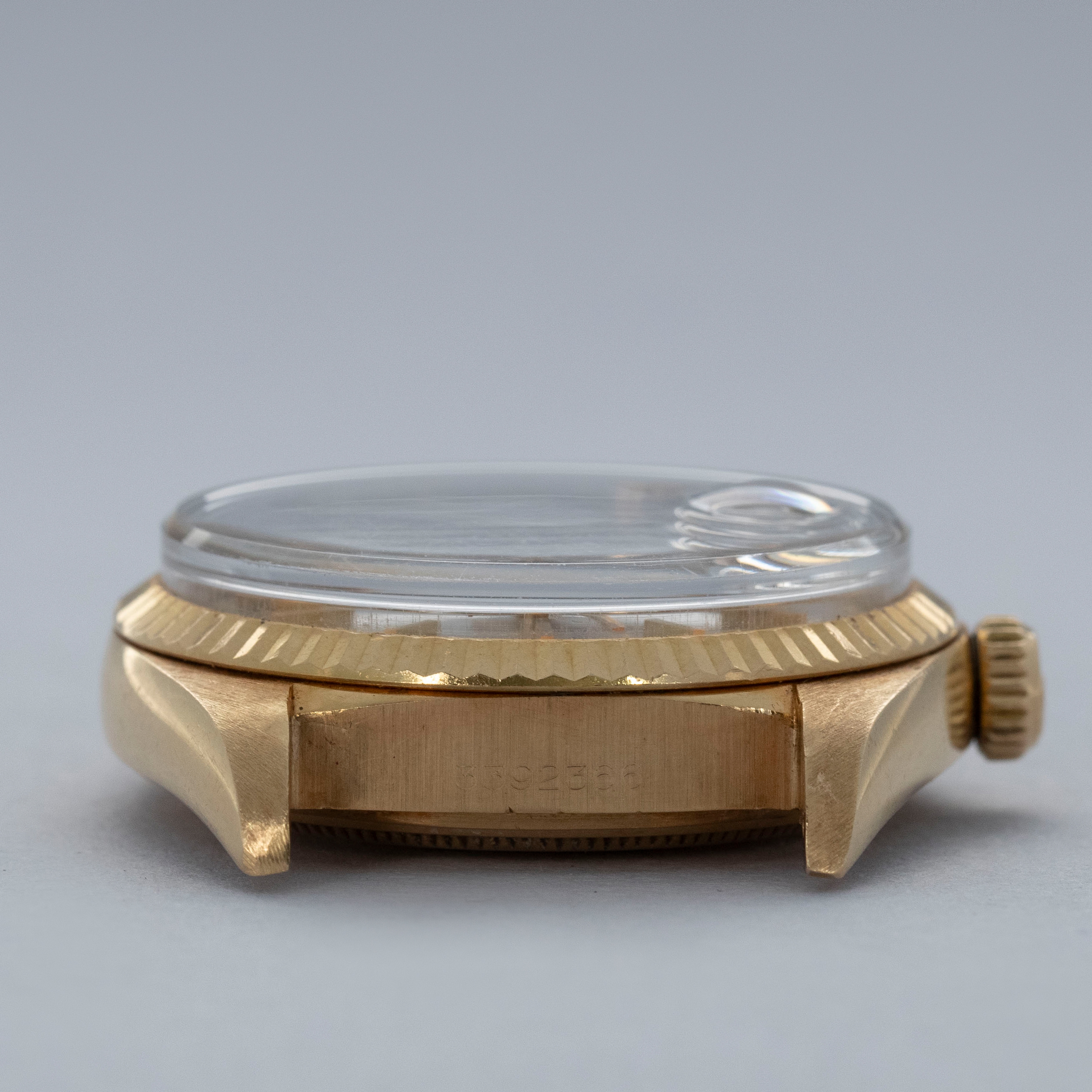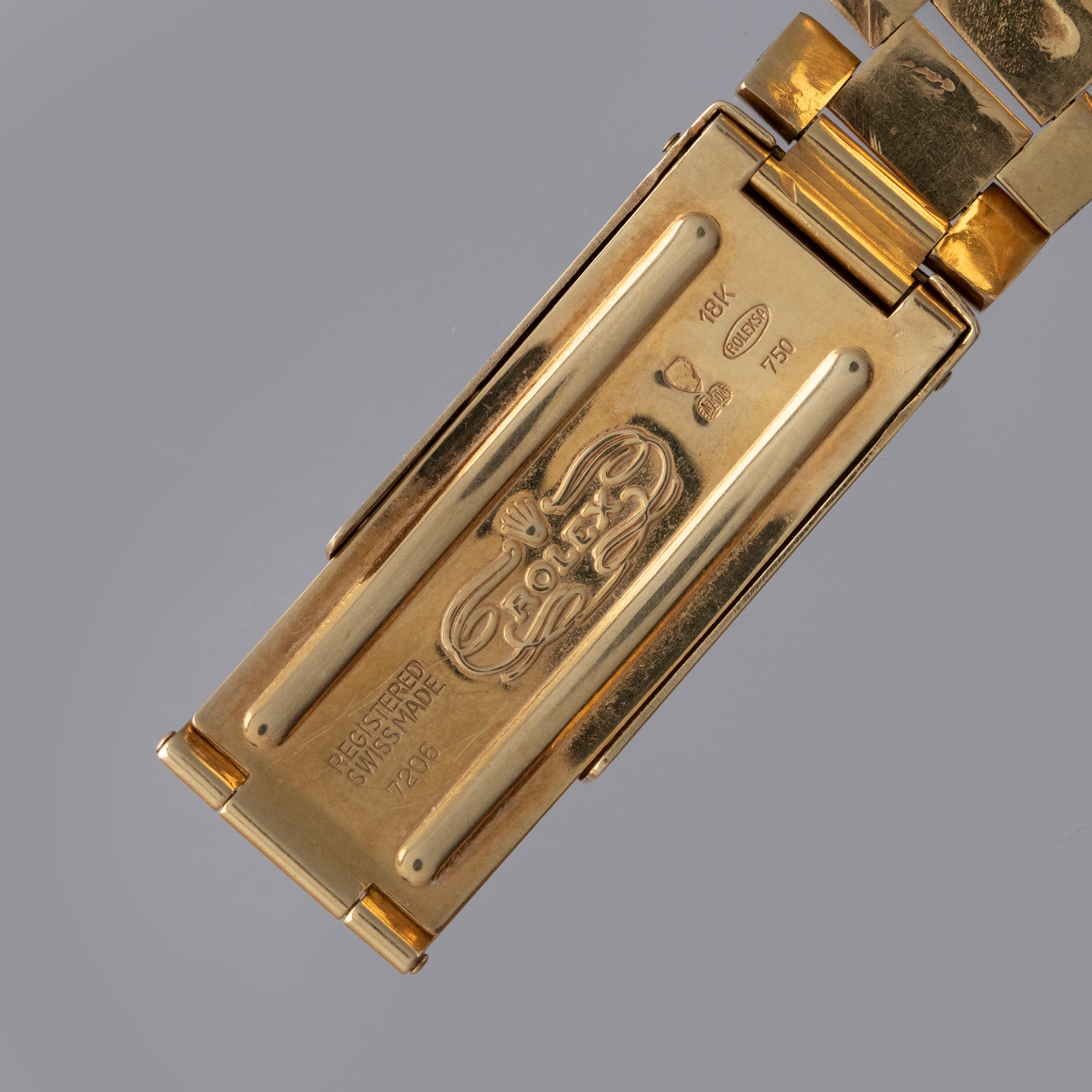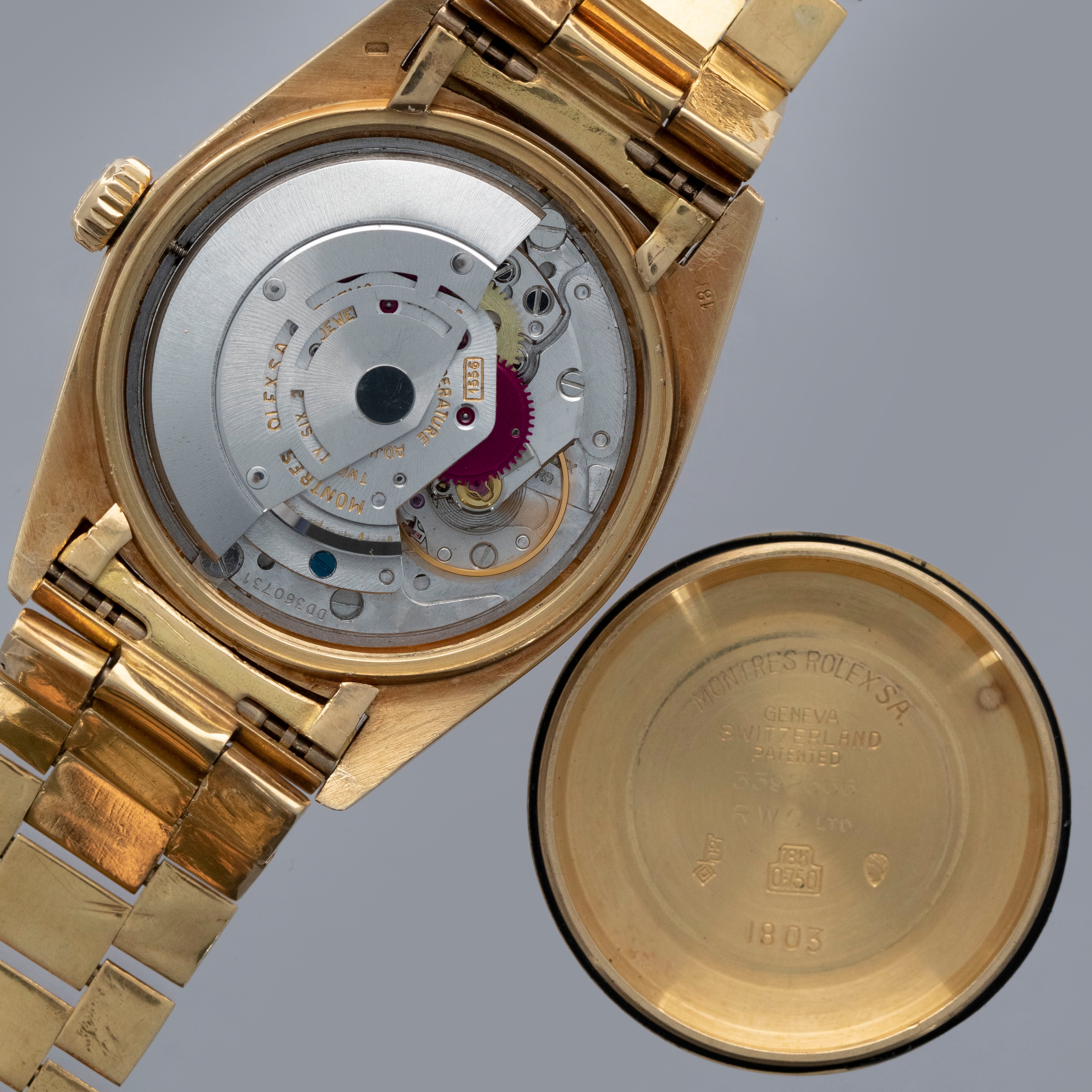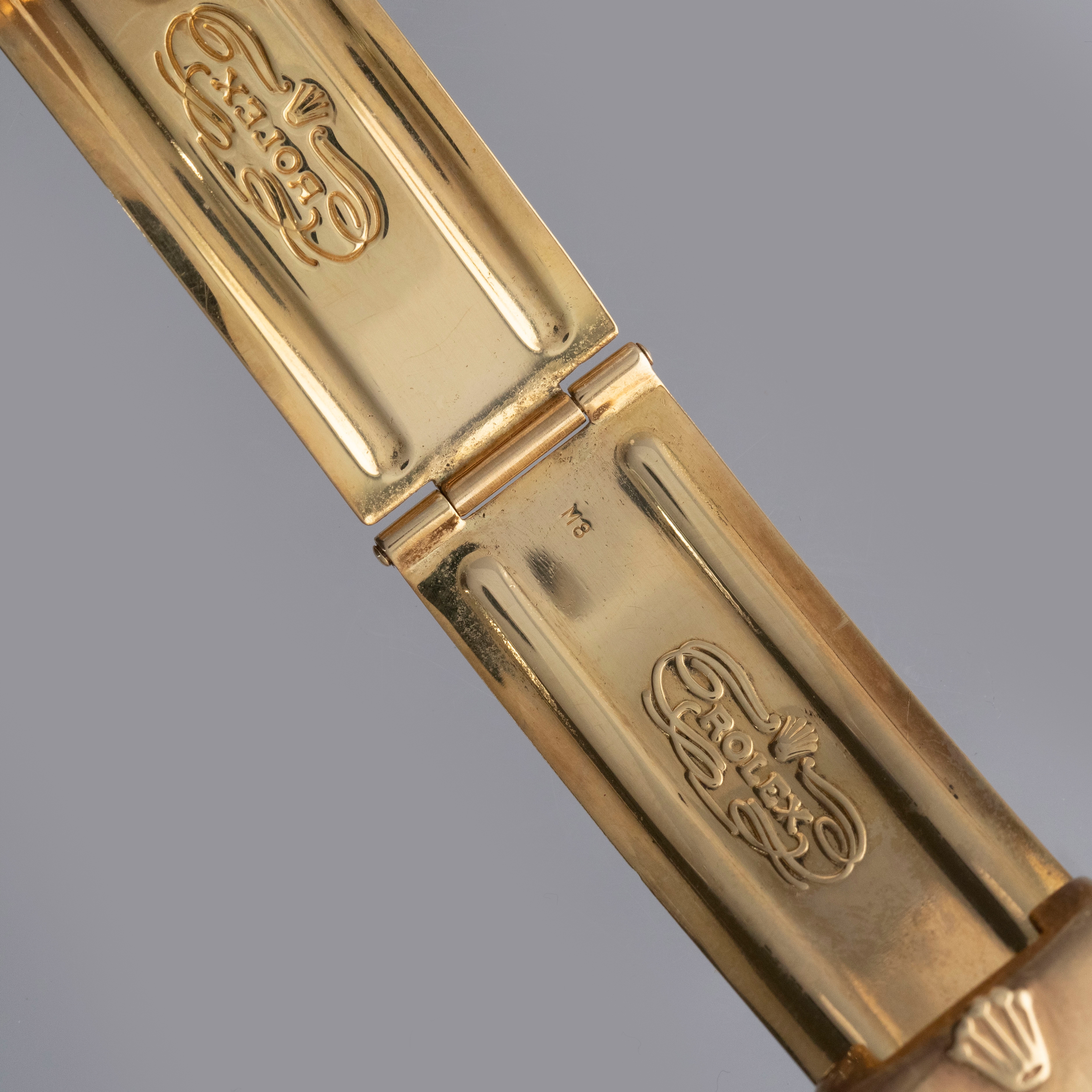 Watch is in overall excellent condition. The yellow gold case shows surface marks and light scratches as expected of a watch of this vintage. The case back displays light marks, while the hallmark and stamp on the backs of the lugs remain well defined. The yellow gold winding crown shows signs of wear. The grey pie-pan dial remains excellent, with mostly good lume plots and clean hands. A few minor marks are visible on the surface. It is fitted with a yellow gold President bracelet with non-concealed clasp showing surface scratches and moderate play between the links. The bracelet is fitted with 19 links and fits approximately a 7¾” wrist. Please note that the watch ticks at time of cataloging, but timekeeping is poor and a service is recommended.