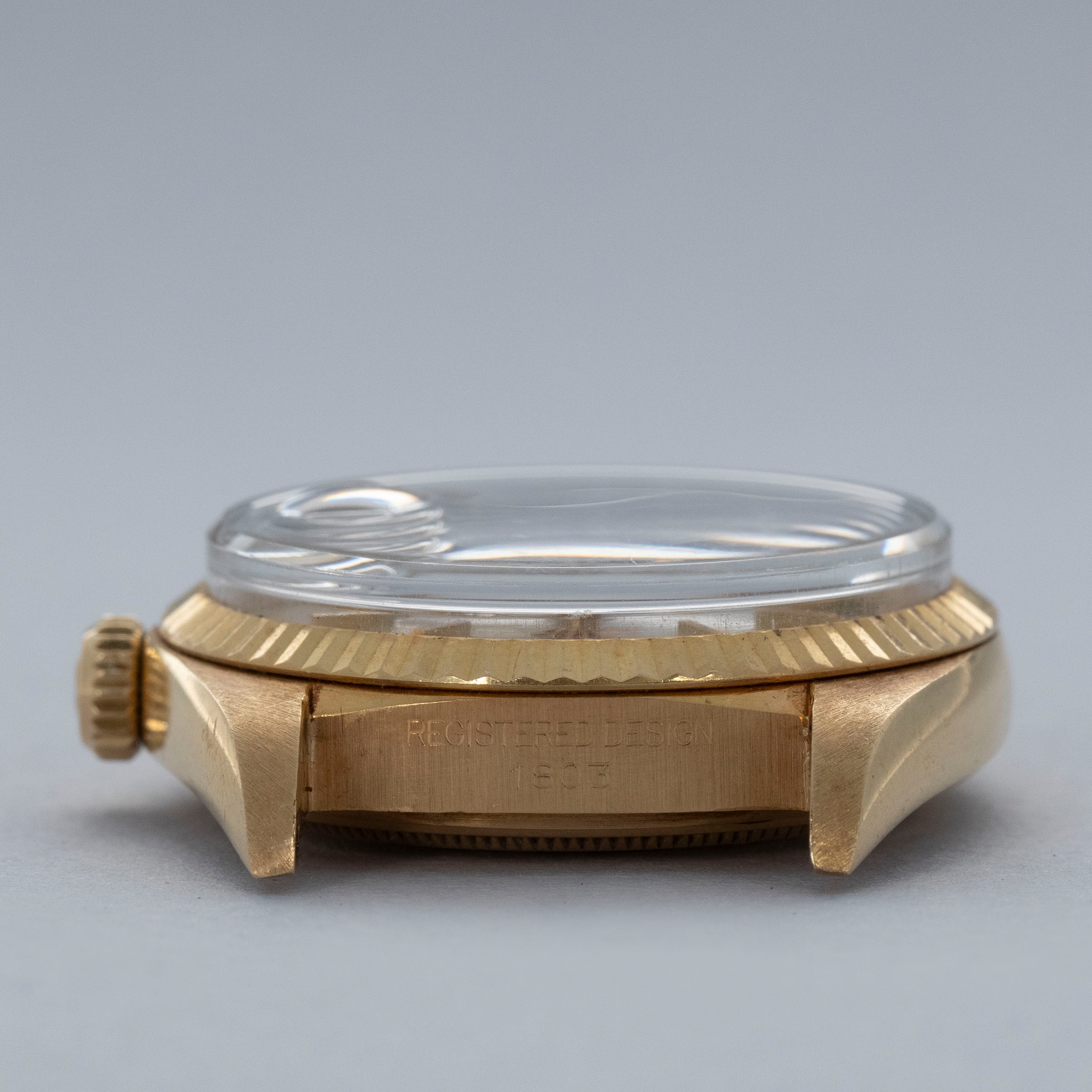 Presented with an extraordinary grey pie-pan dial, this example's day and date wheels show some stunning patina that has given them a warm rosey undertone that matches the timepiece's yellow gold hands and hour markers with remarkable effect.