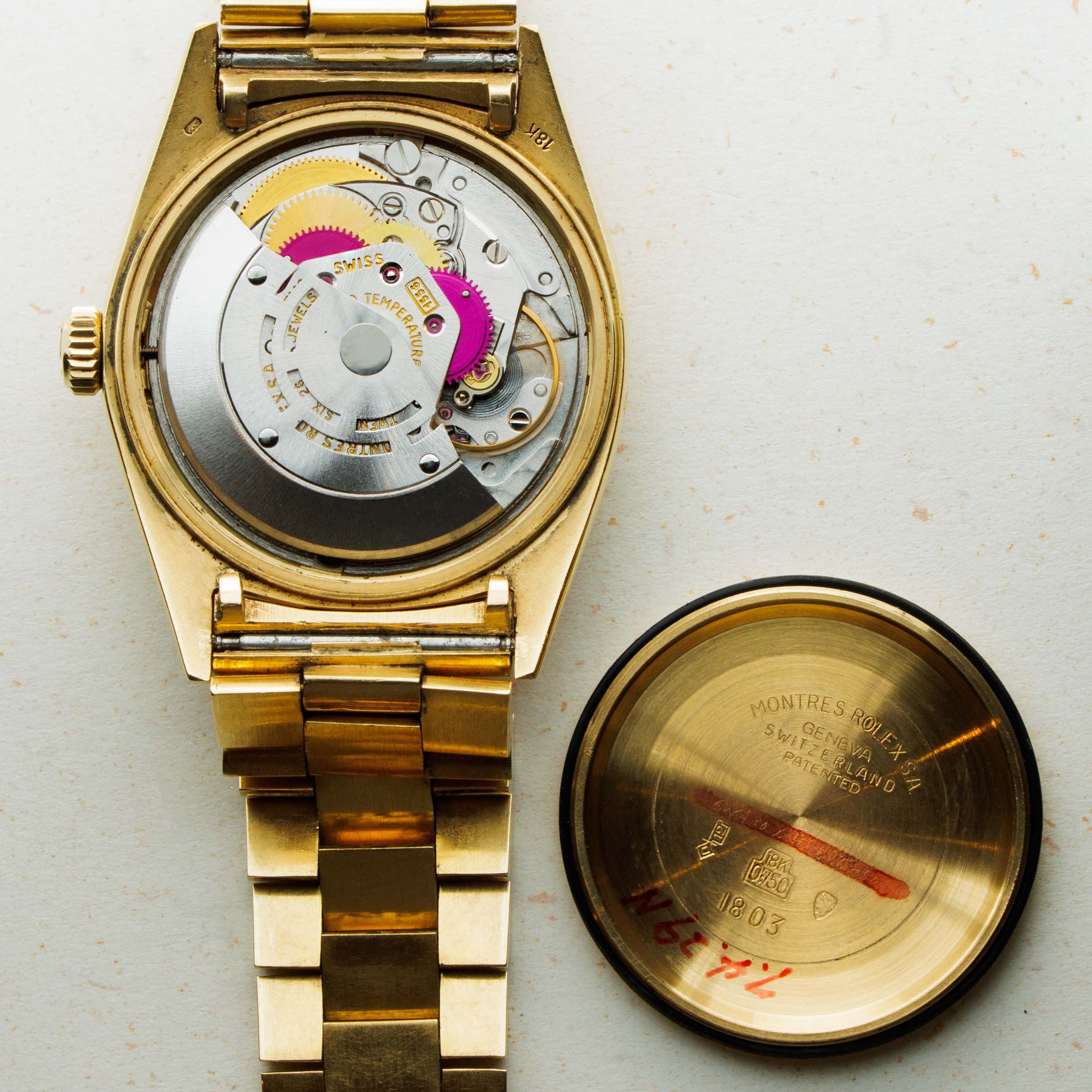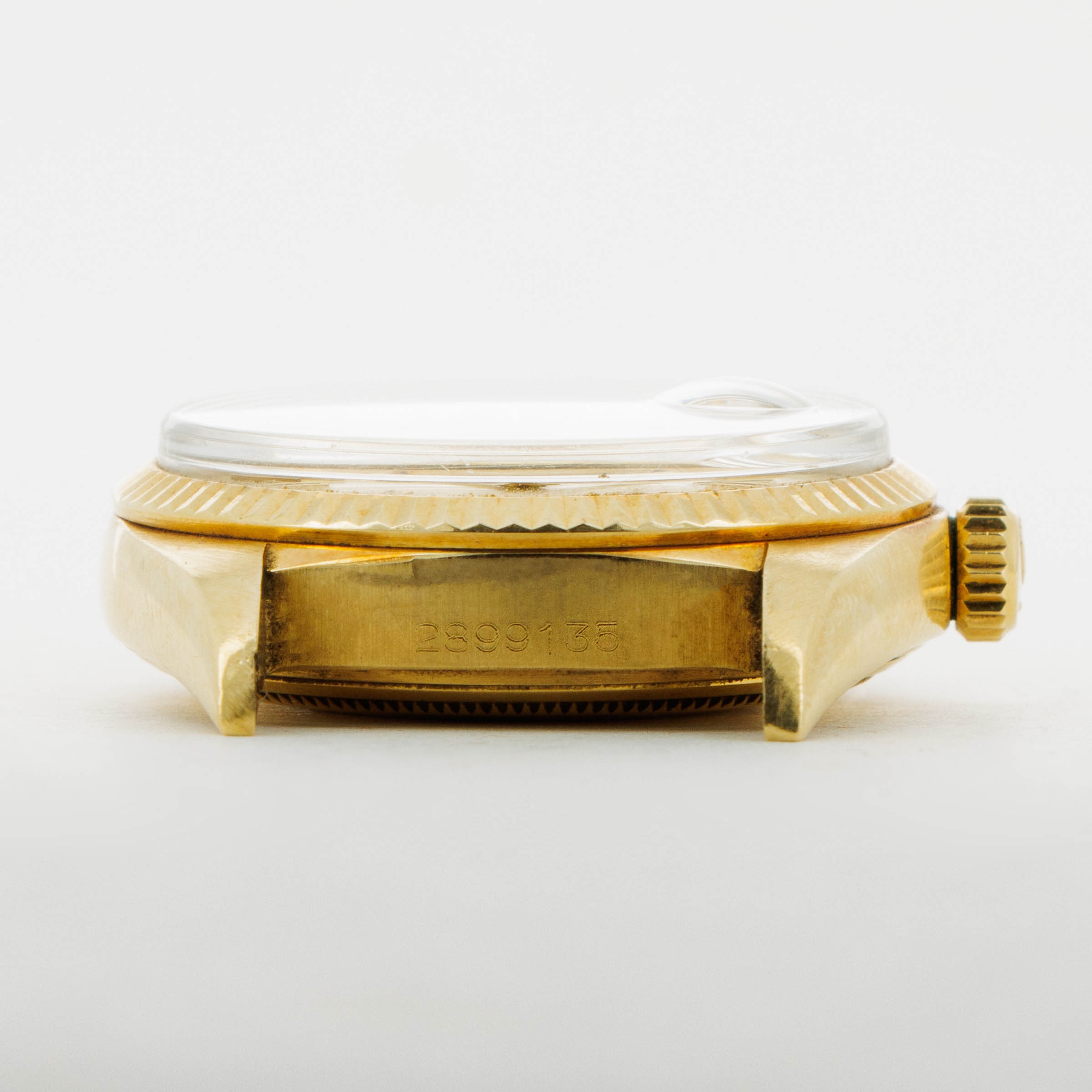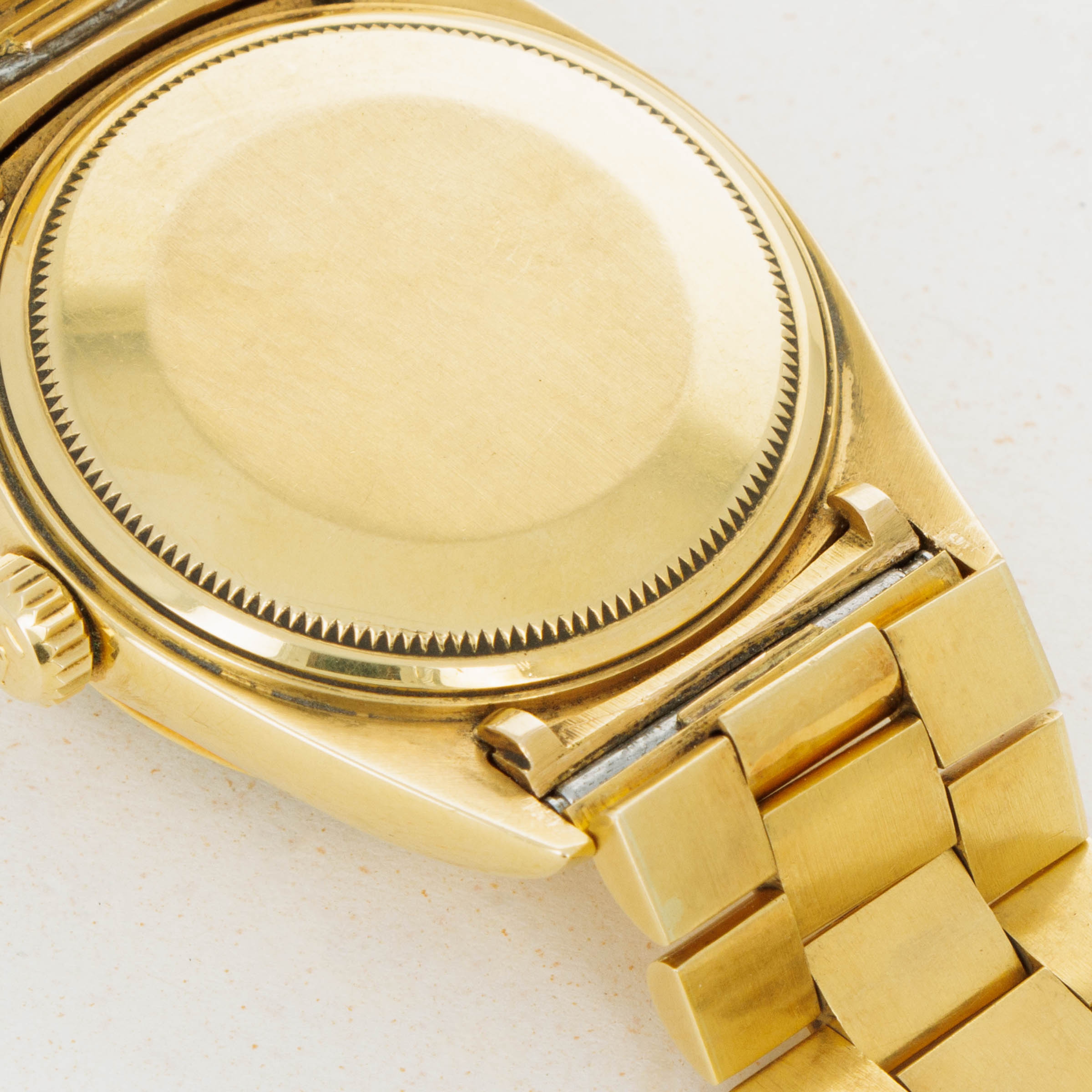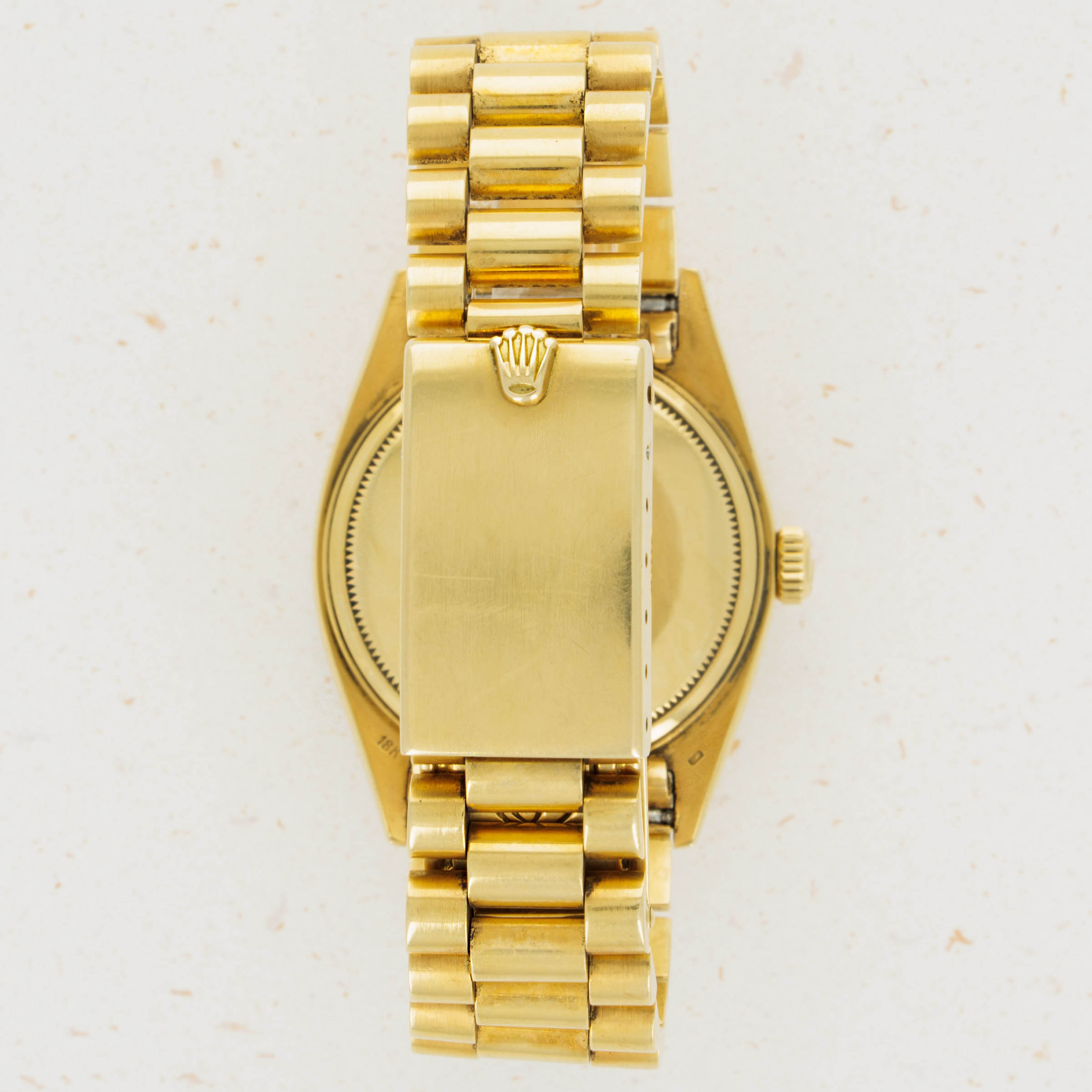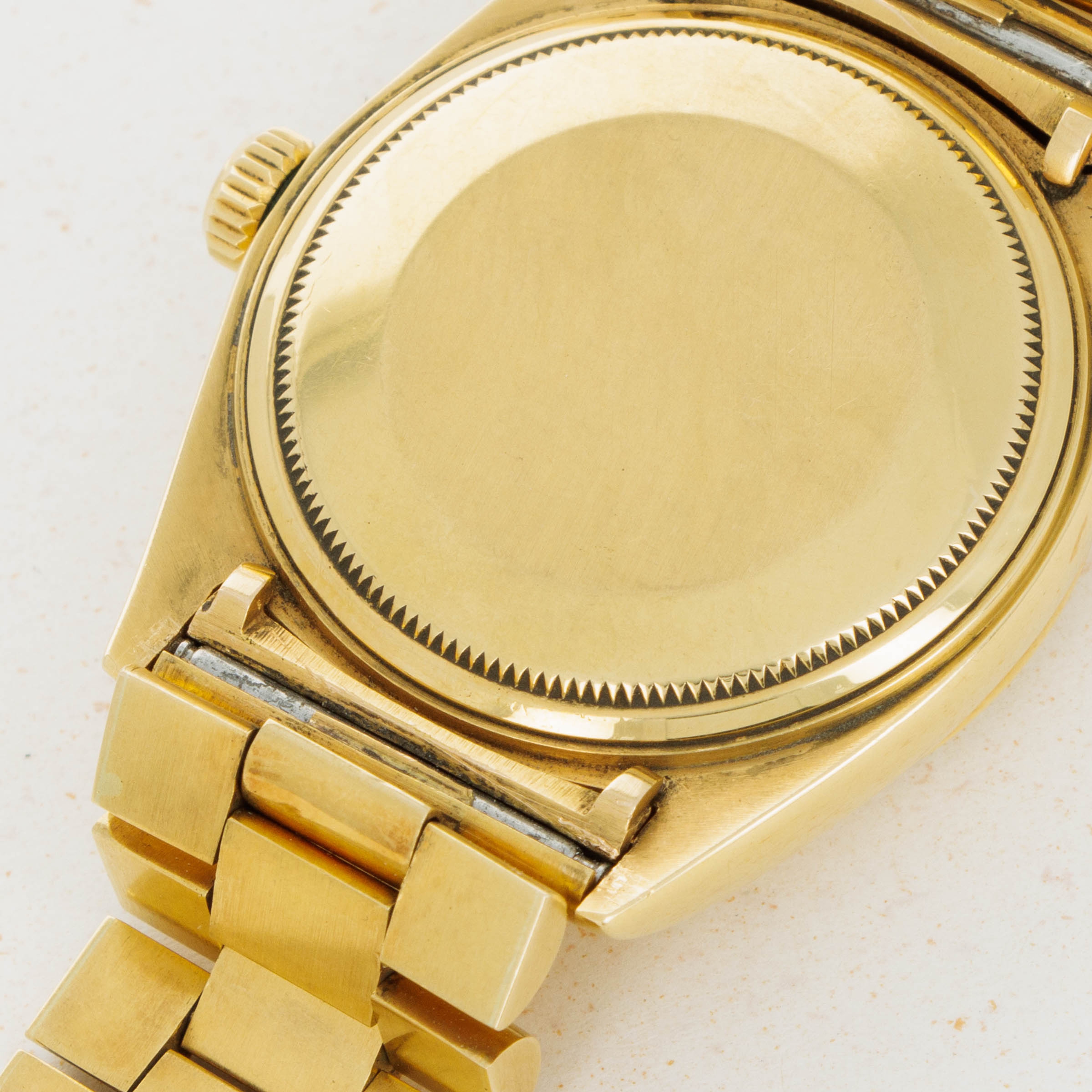 Providing a monochromatic aesthetic to the entire timepiece, this example's champagne-colored pie-pan dial blends into its 18k yellow gold construction and handset. Furthermore, this example's hands and hour markers are extra-wide. Now this timepiece's defining feature, this rare setup is known as the "Wide Boy."