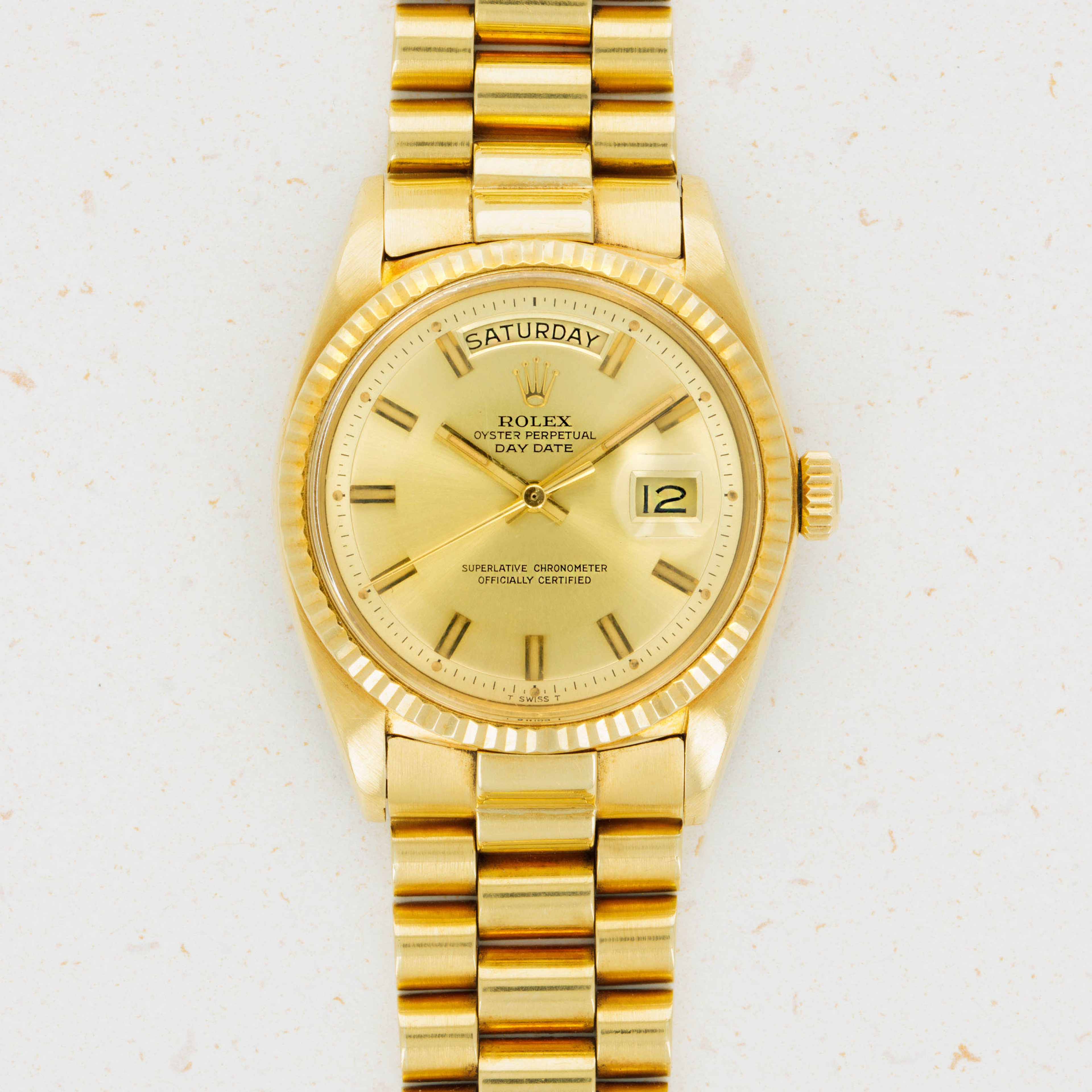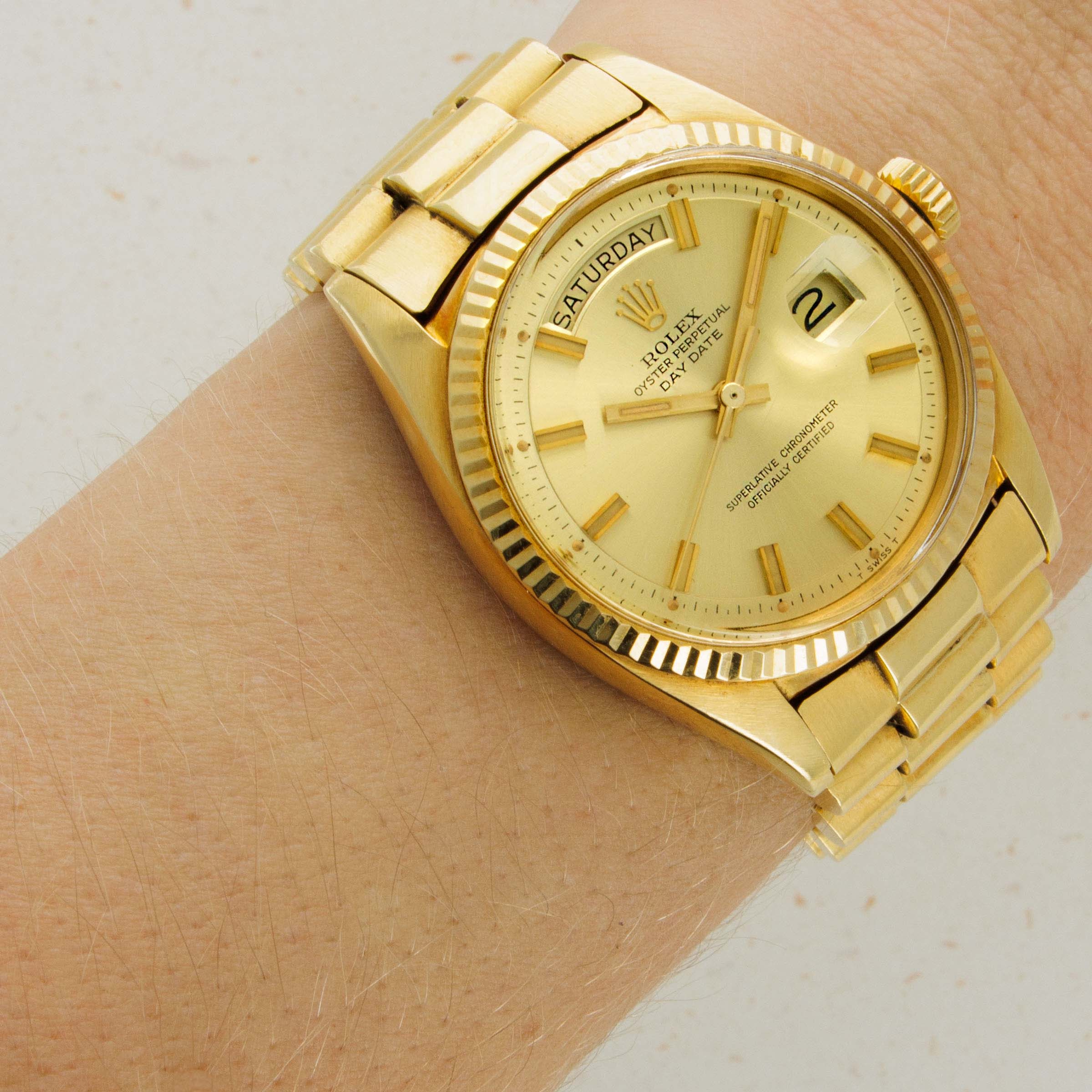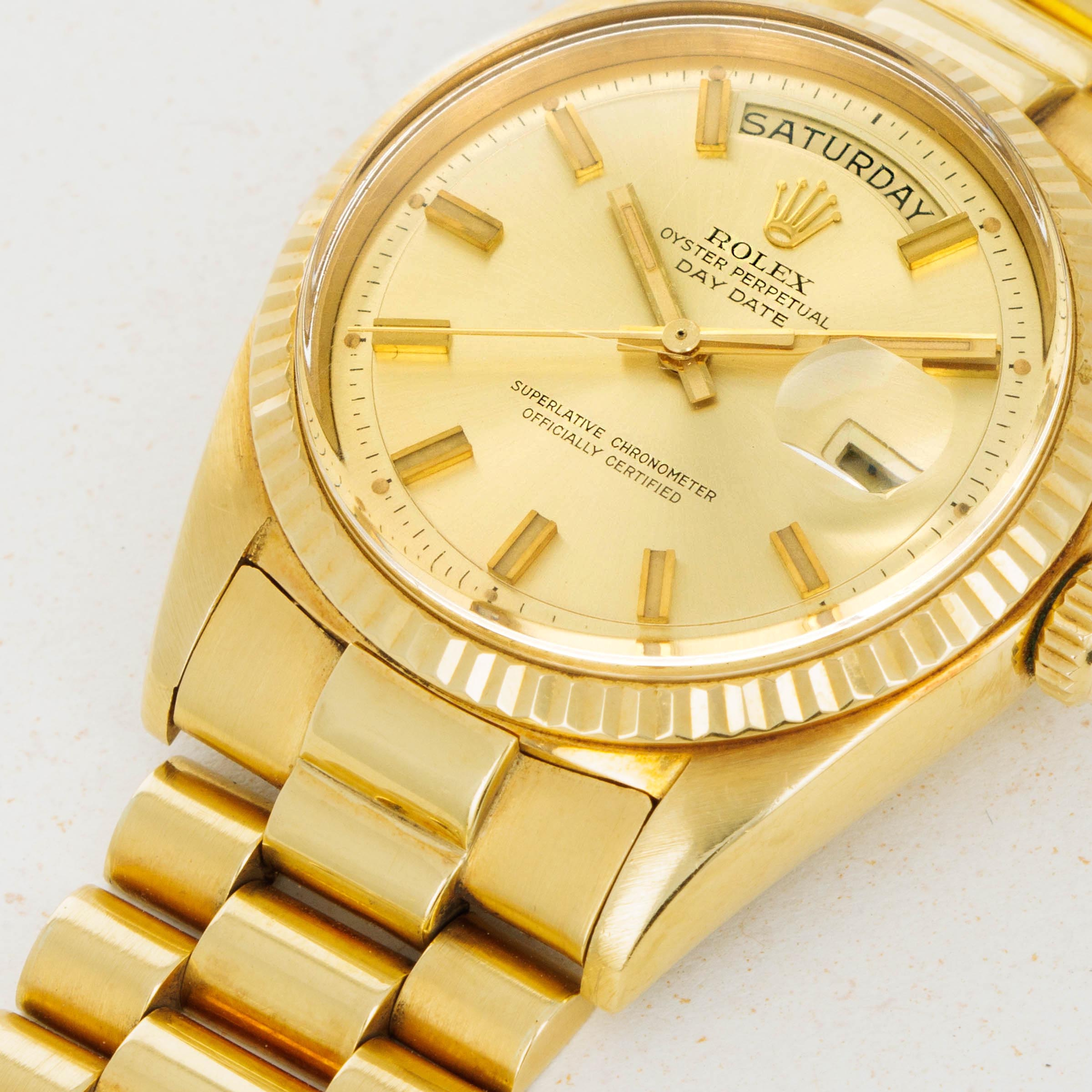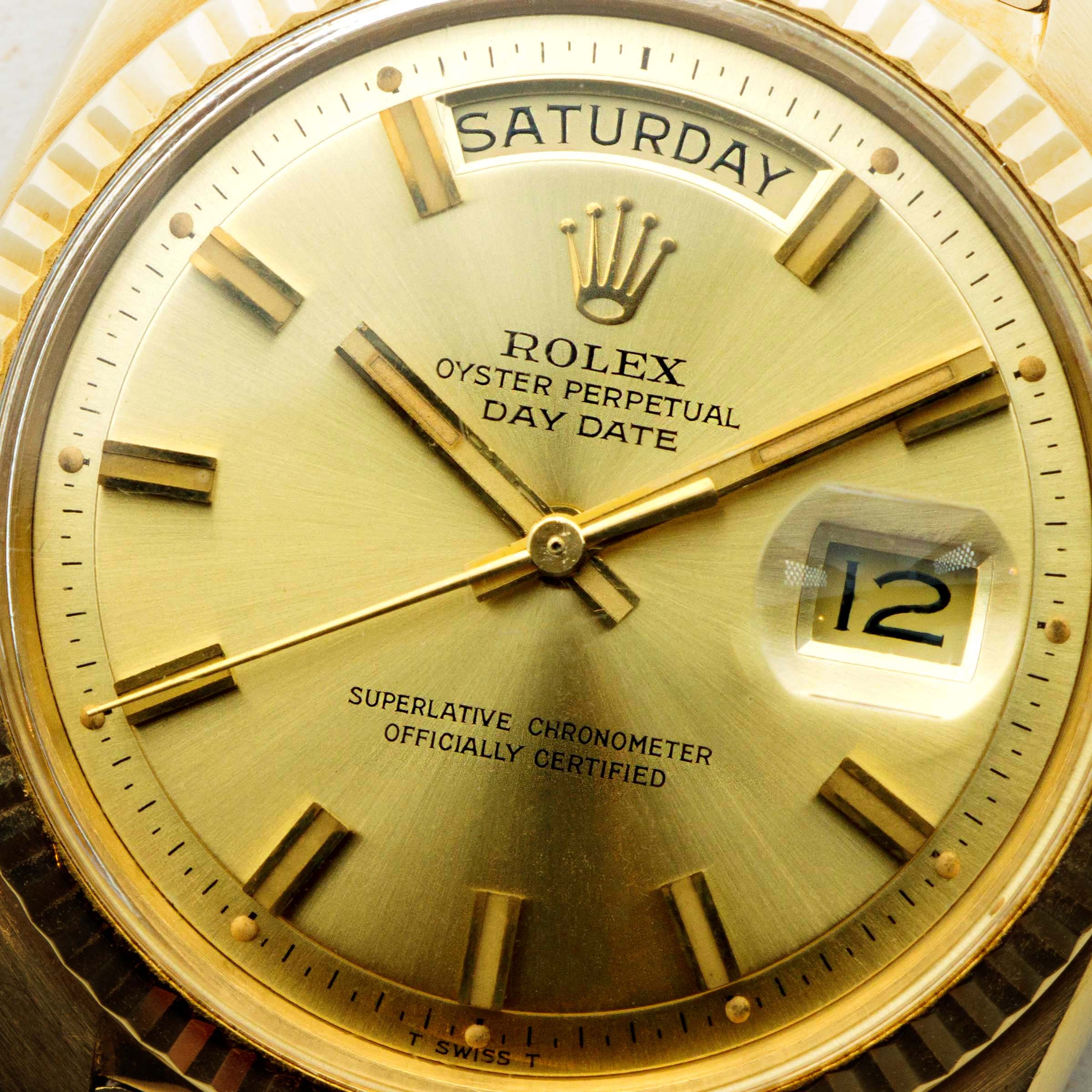 With its well-preserved case and bracelet, vivid "Wide Boy" dial furniture, and champagne dial, this example is an all-gold delight.