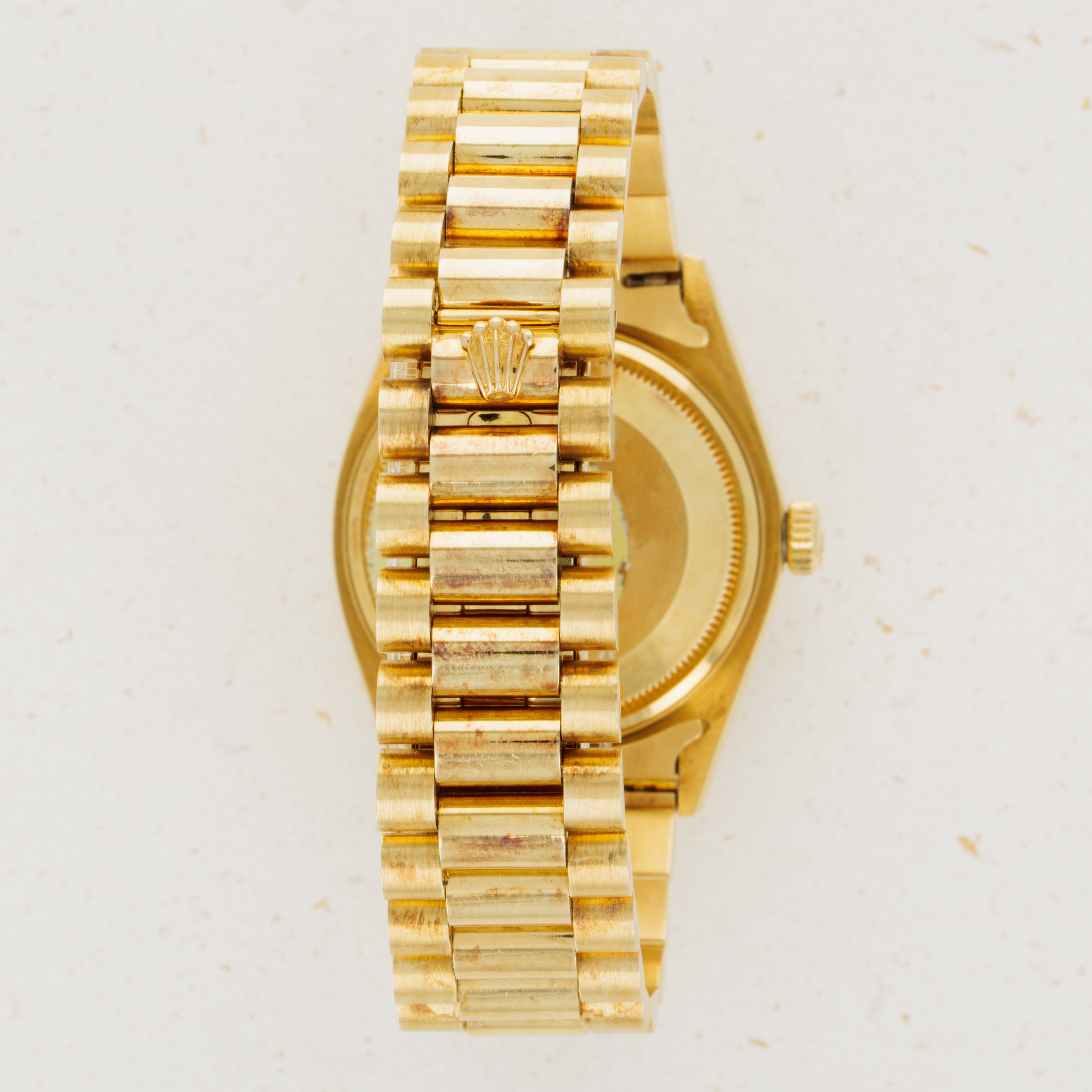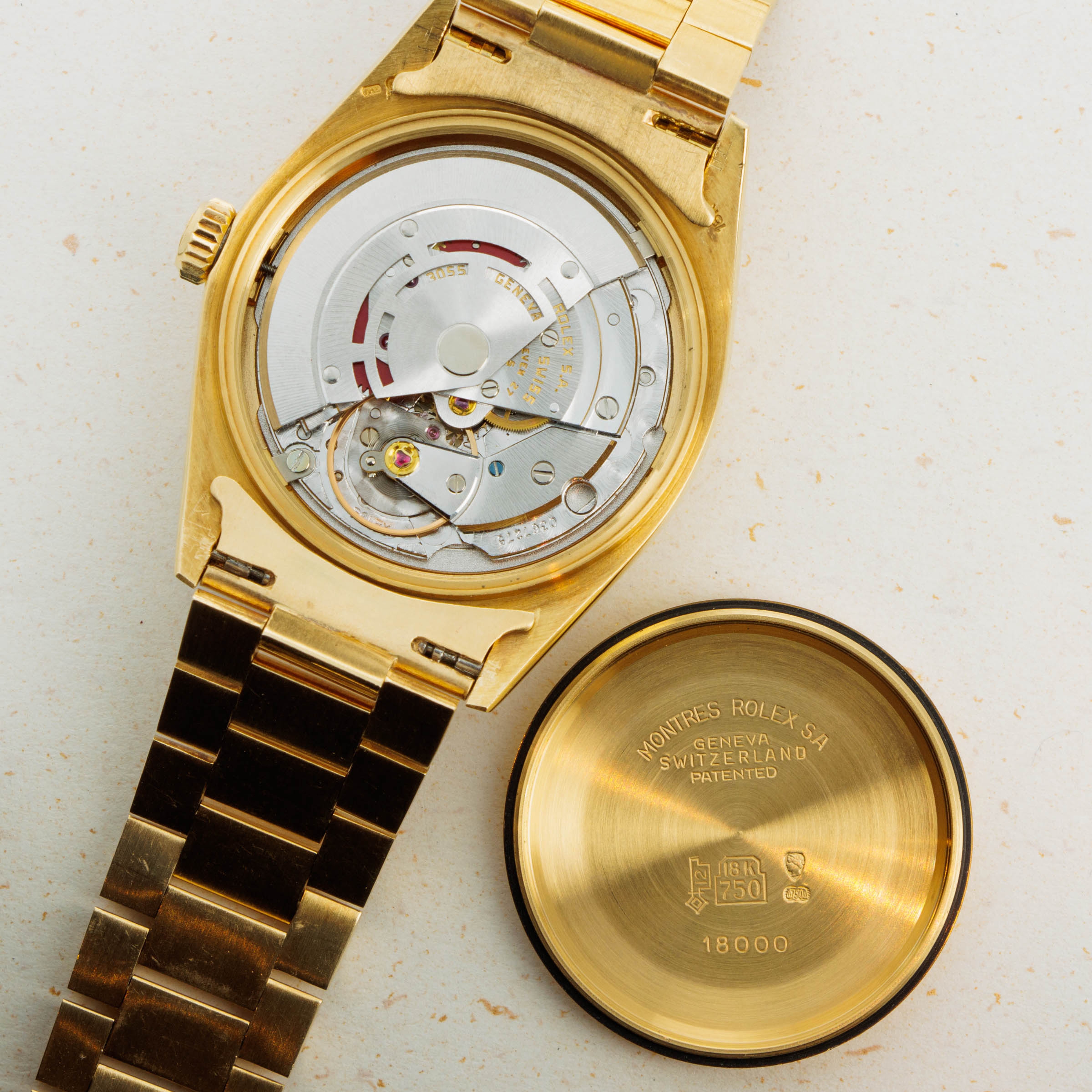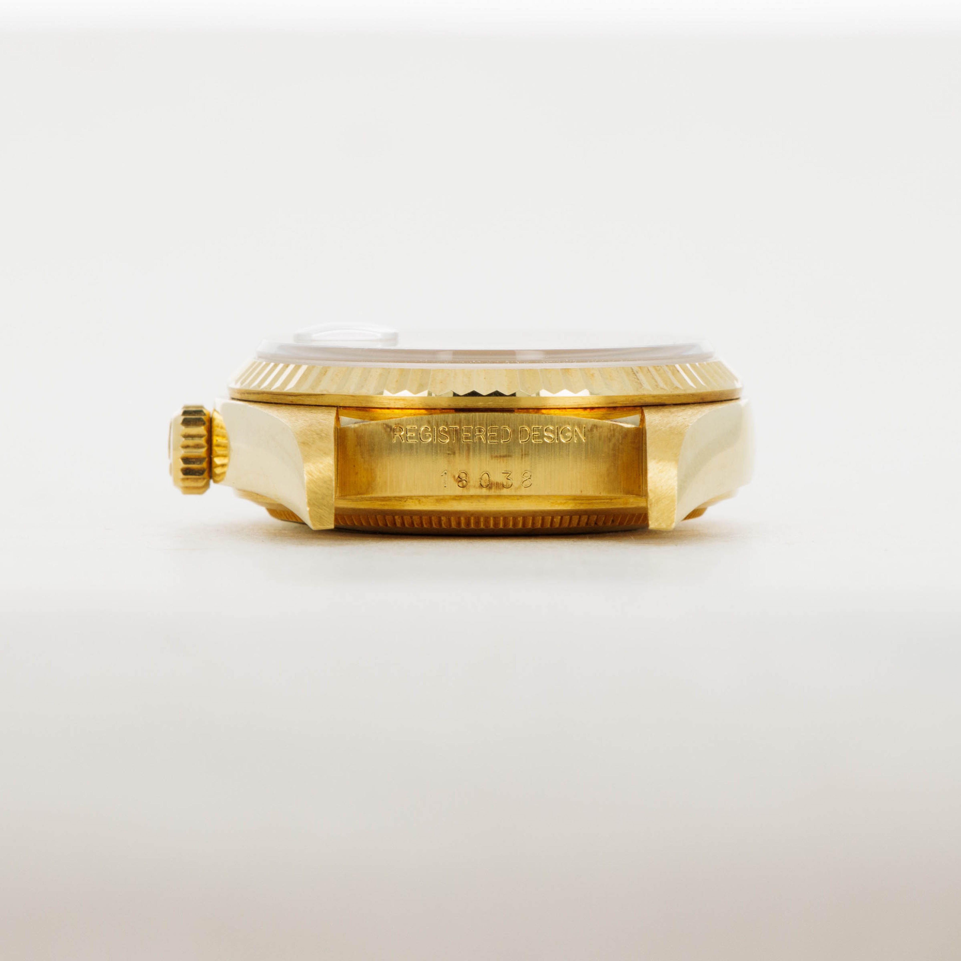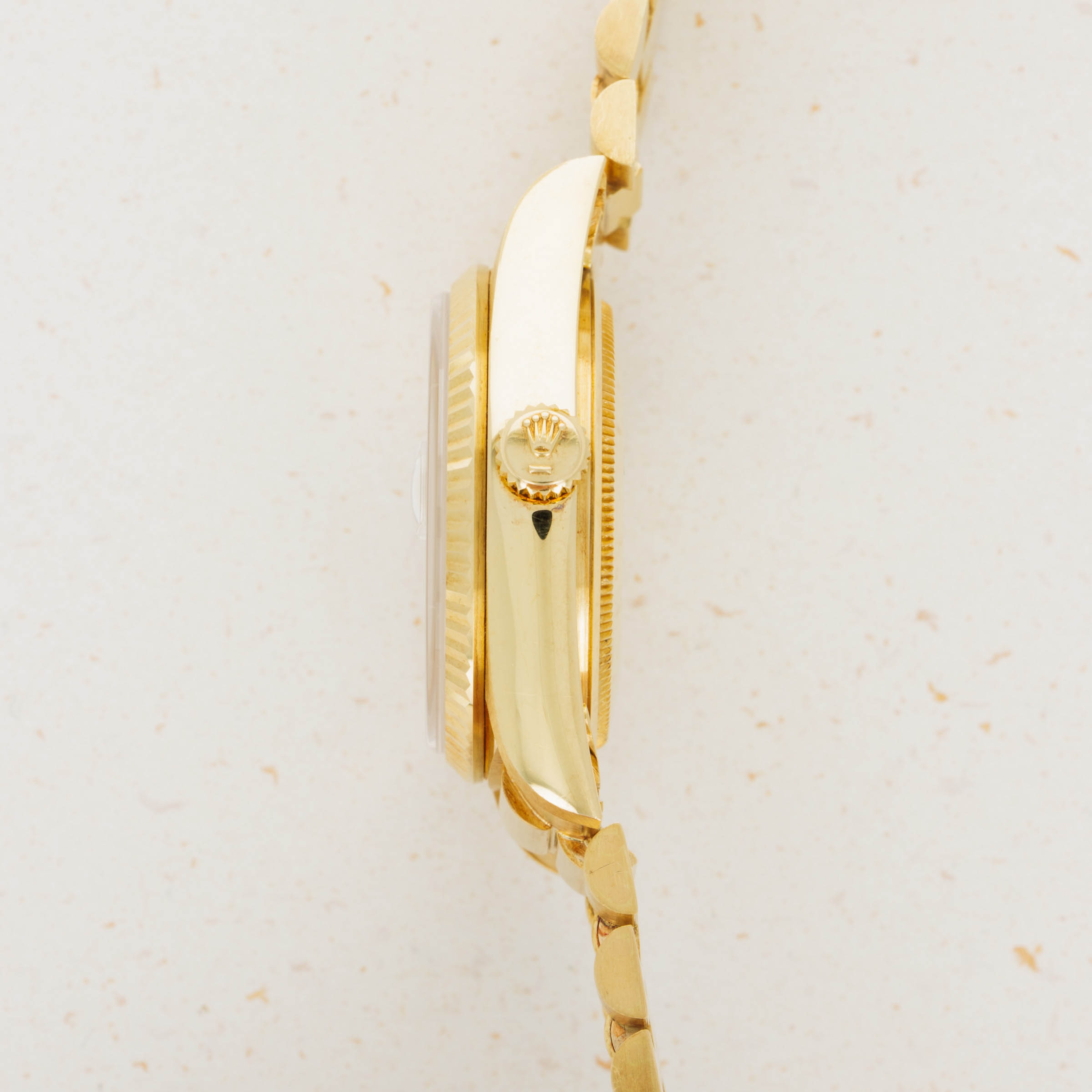This ref. 18038's 18kt yellow gold construction is entirely classical in its design with the Day-Date's traditional 36mm case, iconic Presidential bracelet and wonderful fluted bezel.