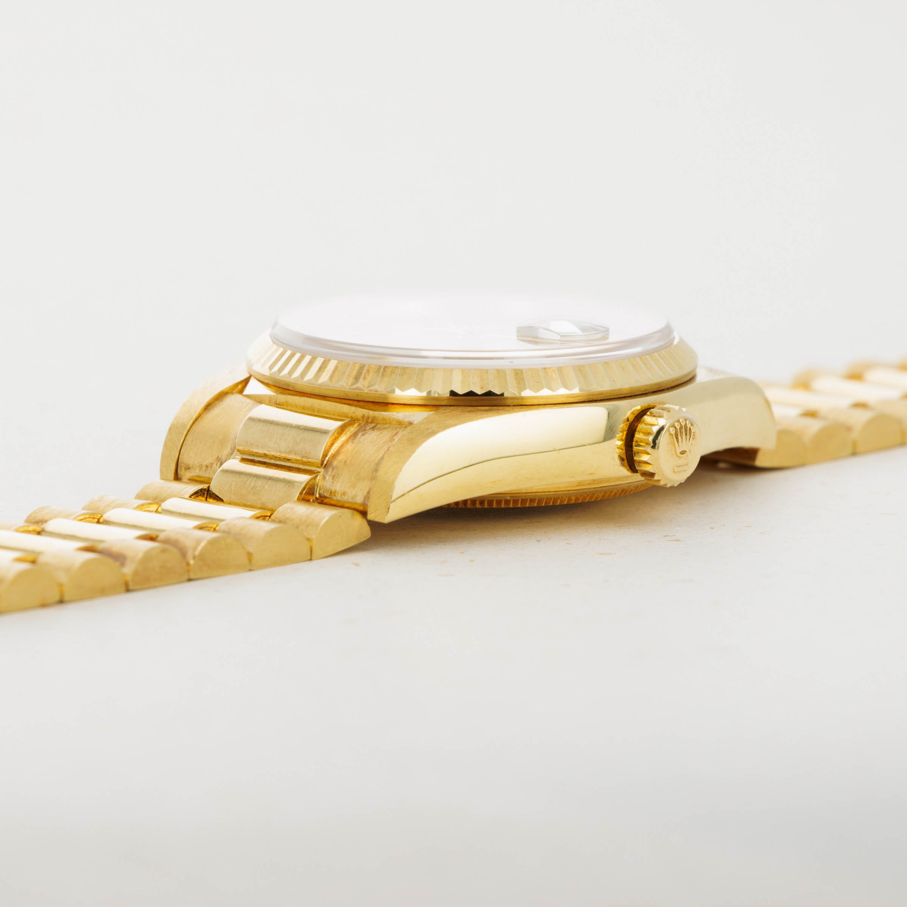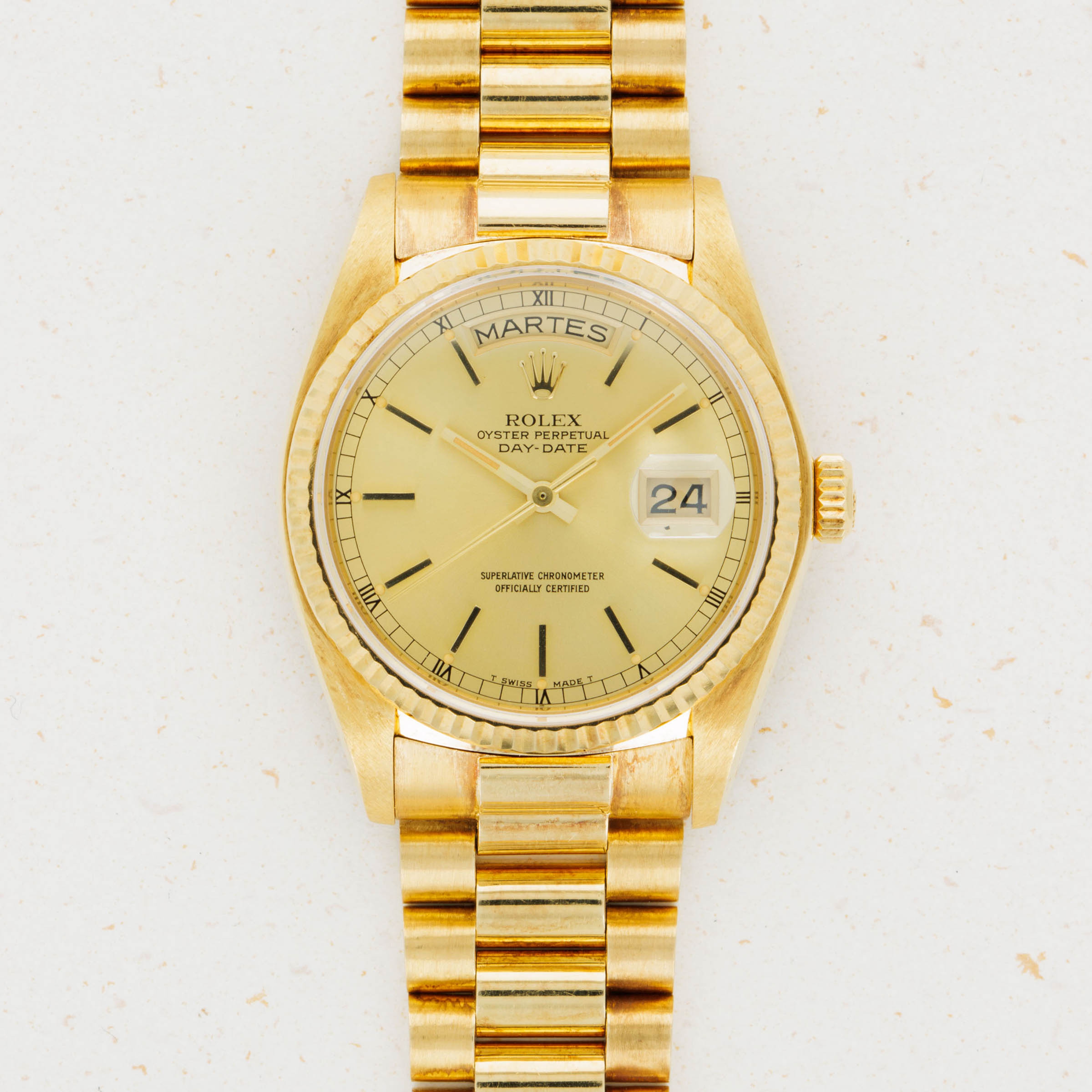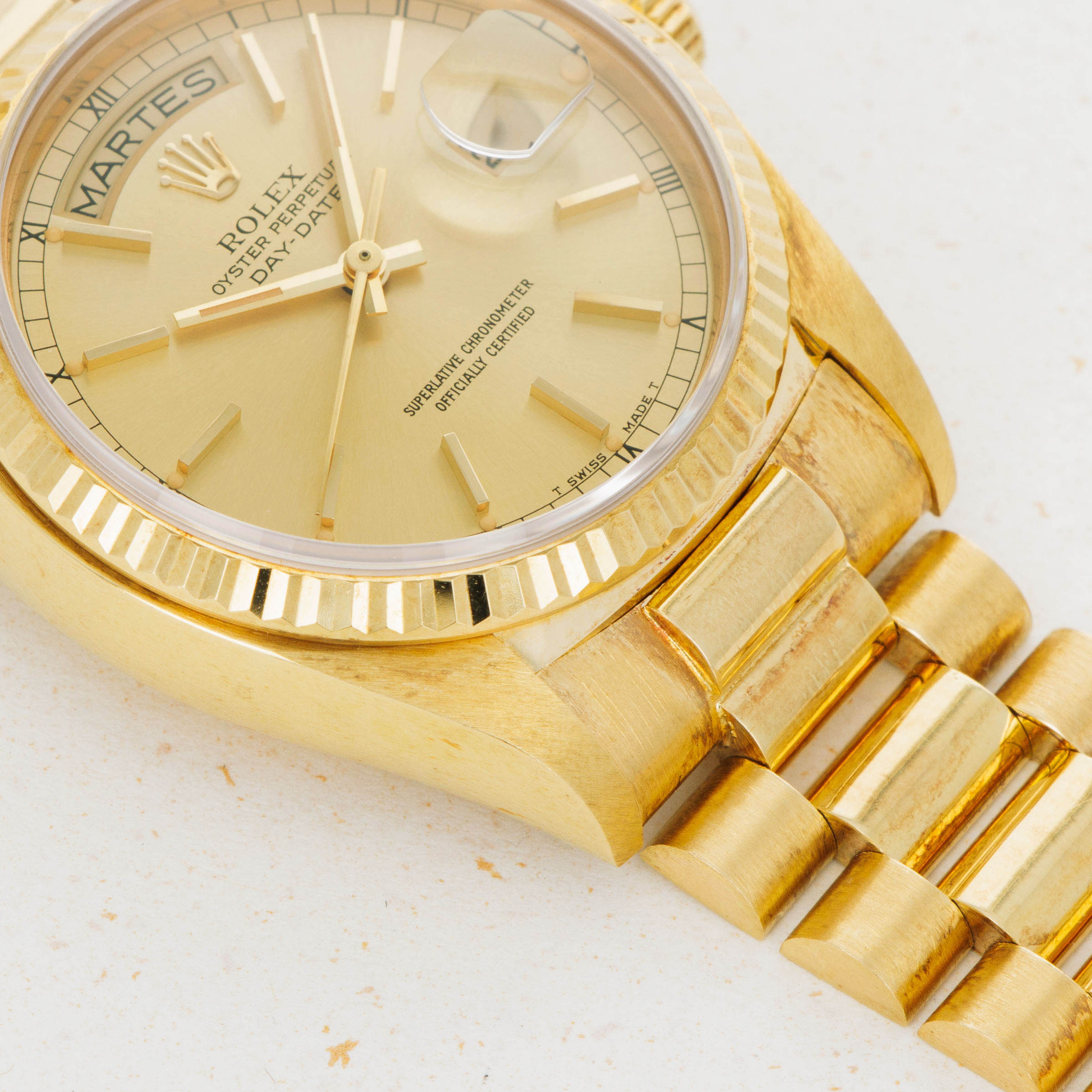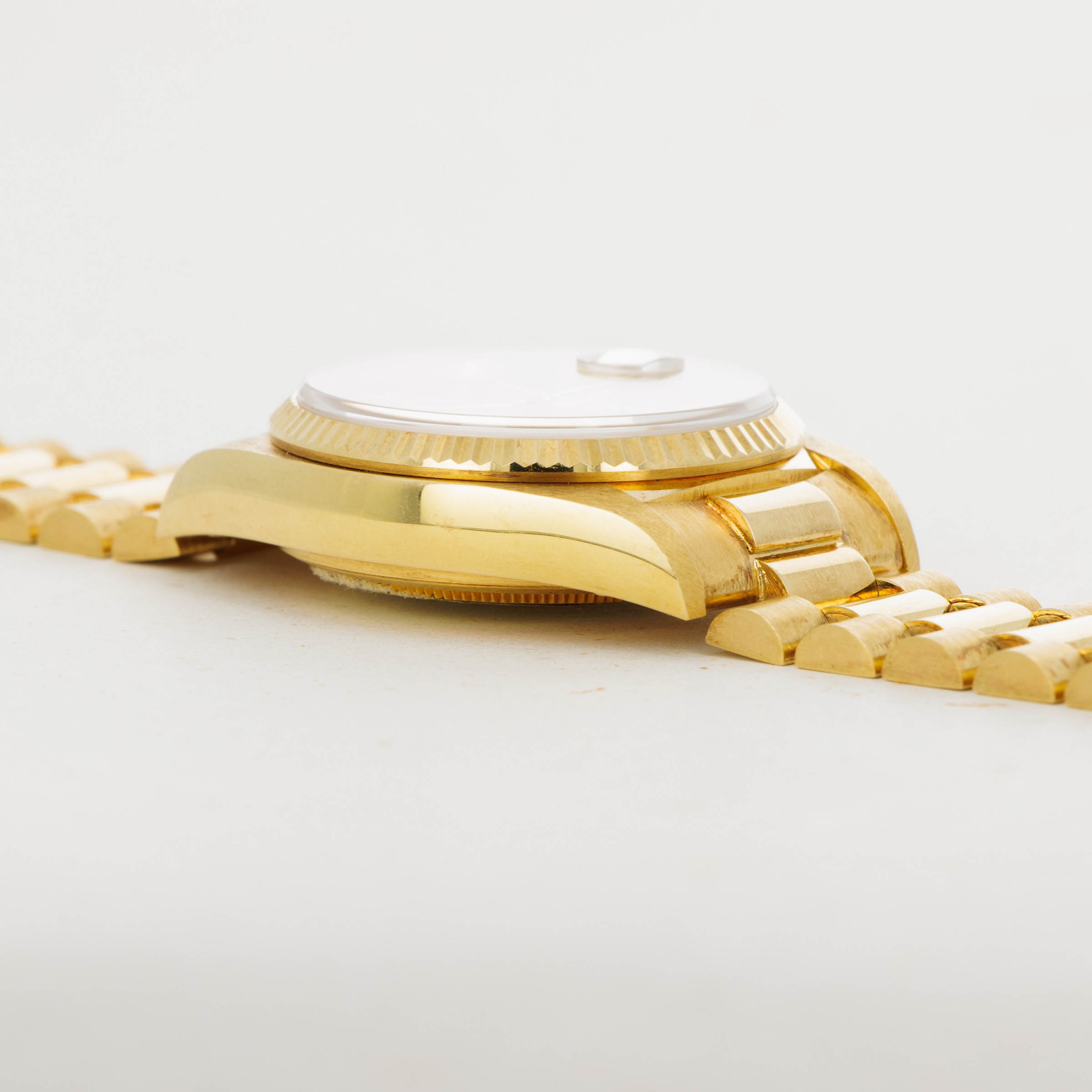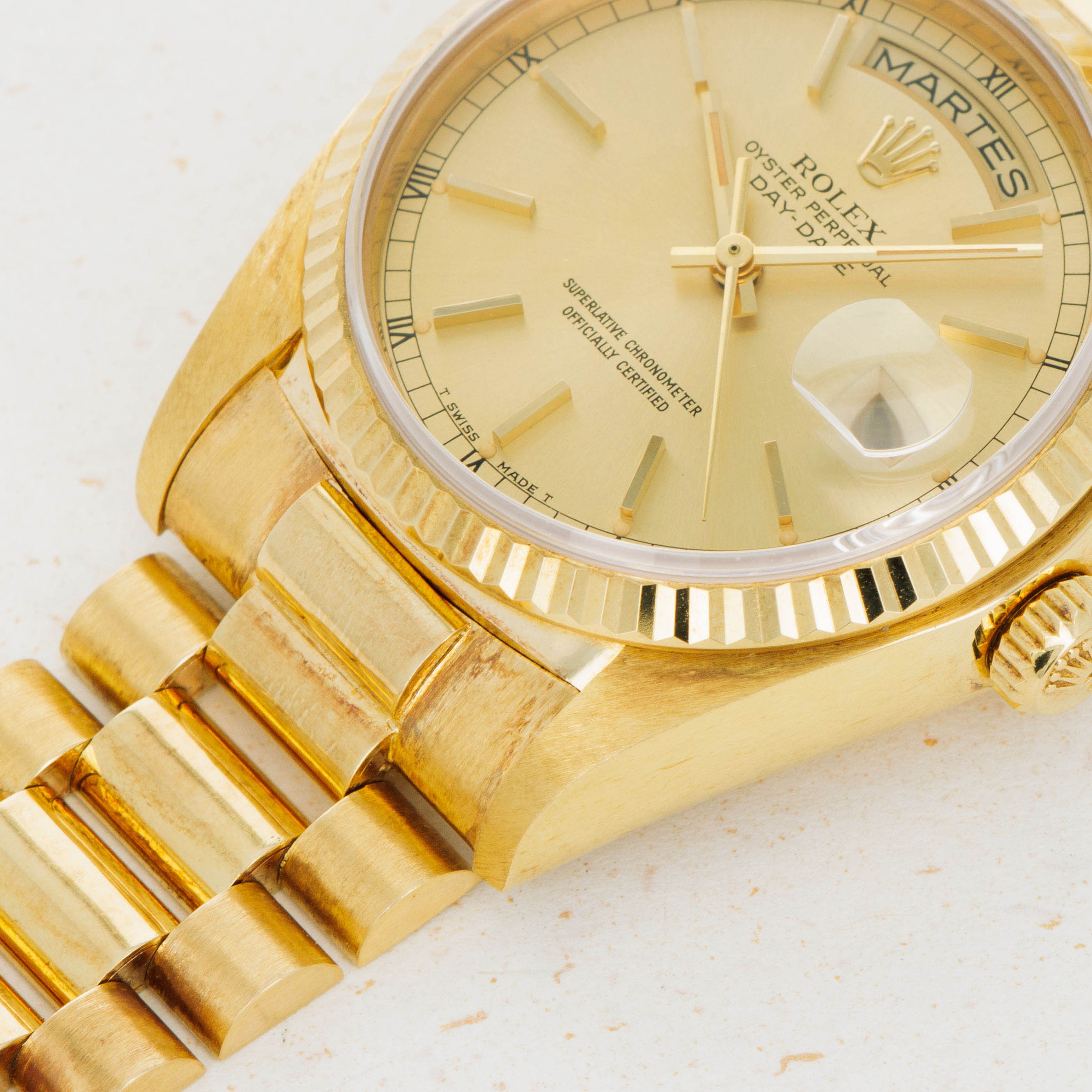 This ref. 18038's 18kt yellow gold construction is entirely classical in its design with the Day-Date's traditional 36mm case, iconic Presidential bracelet and wonderful fluted bezel.
