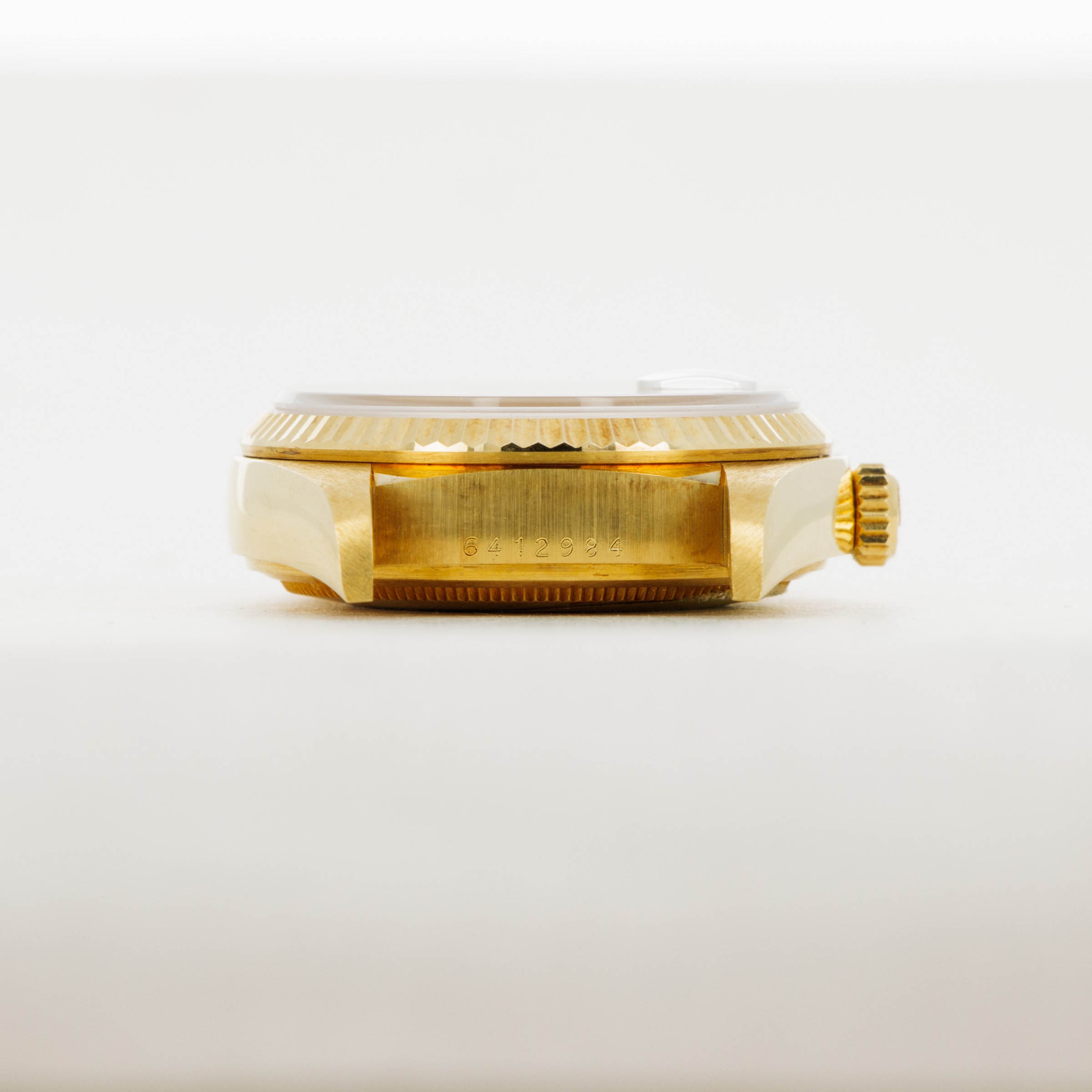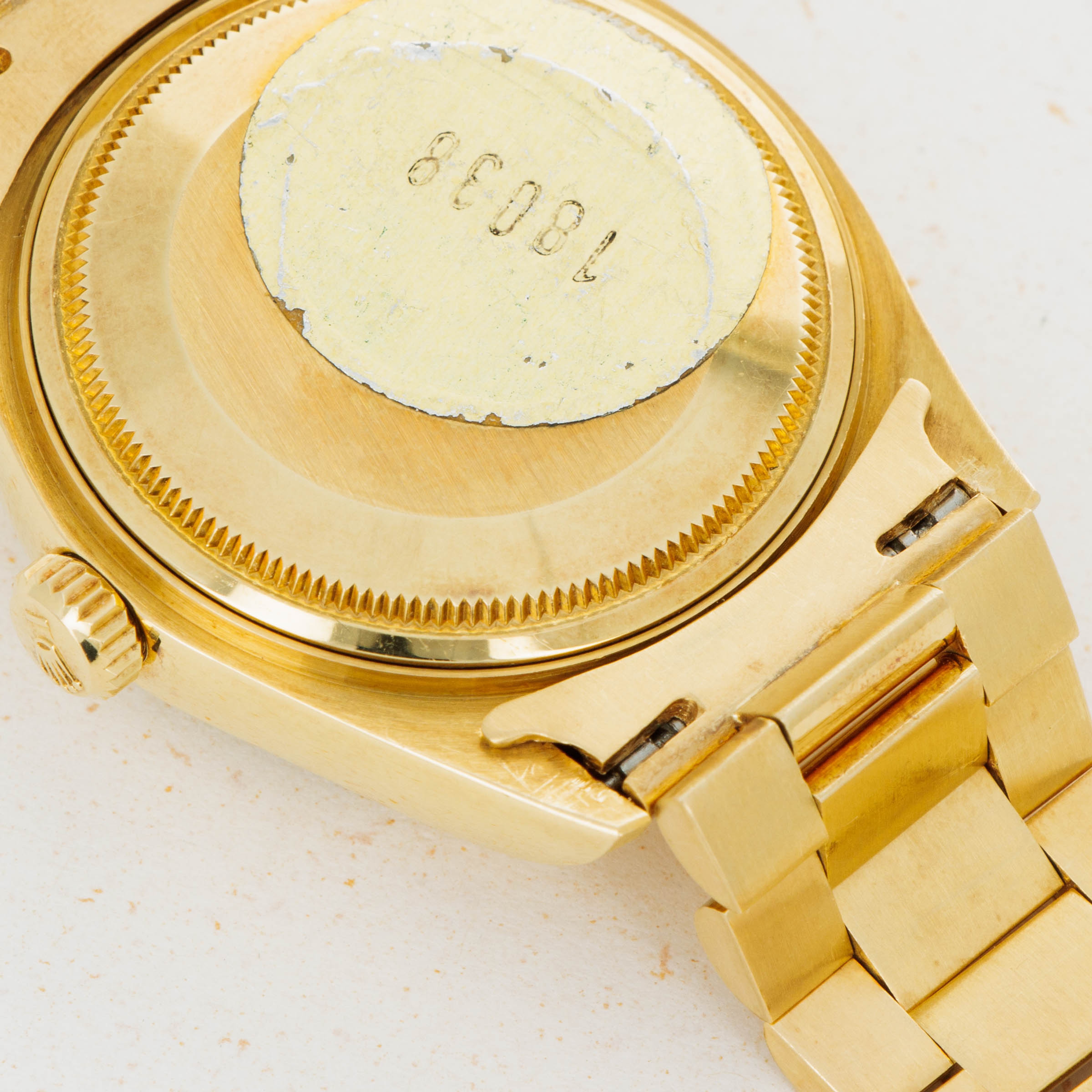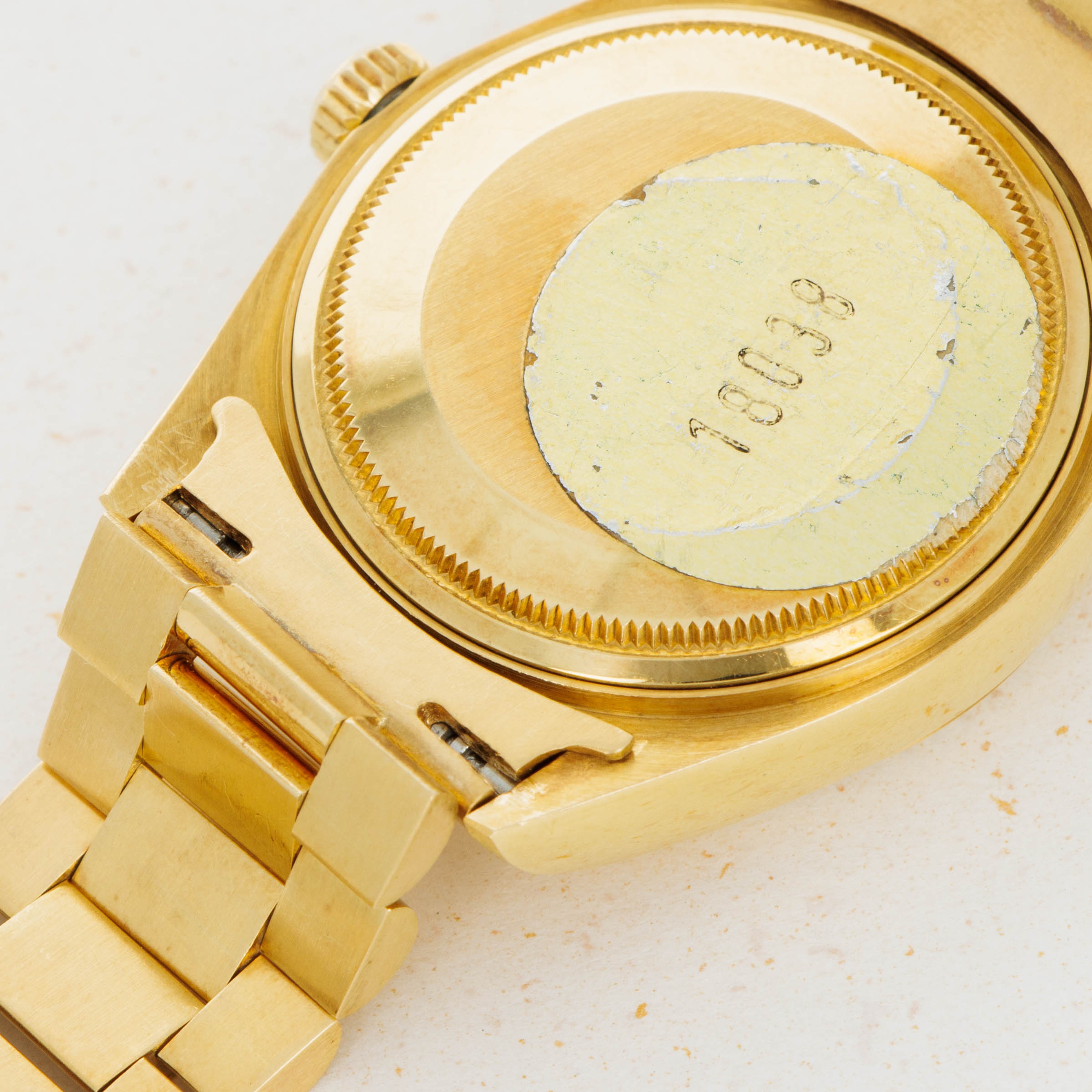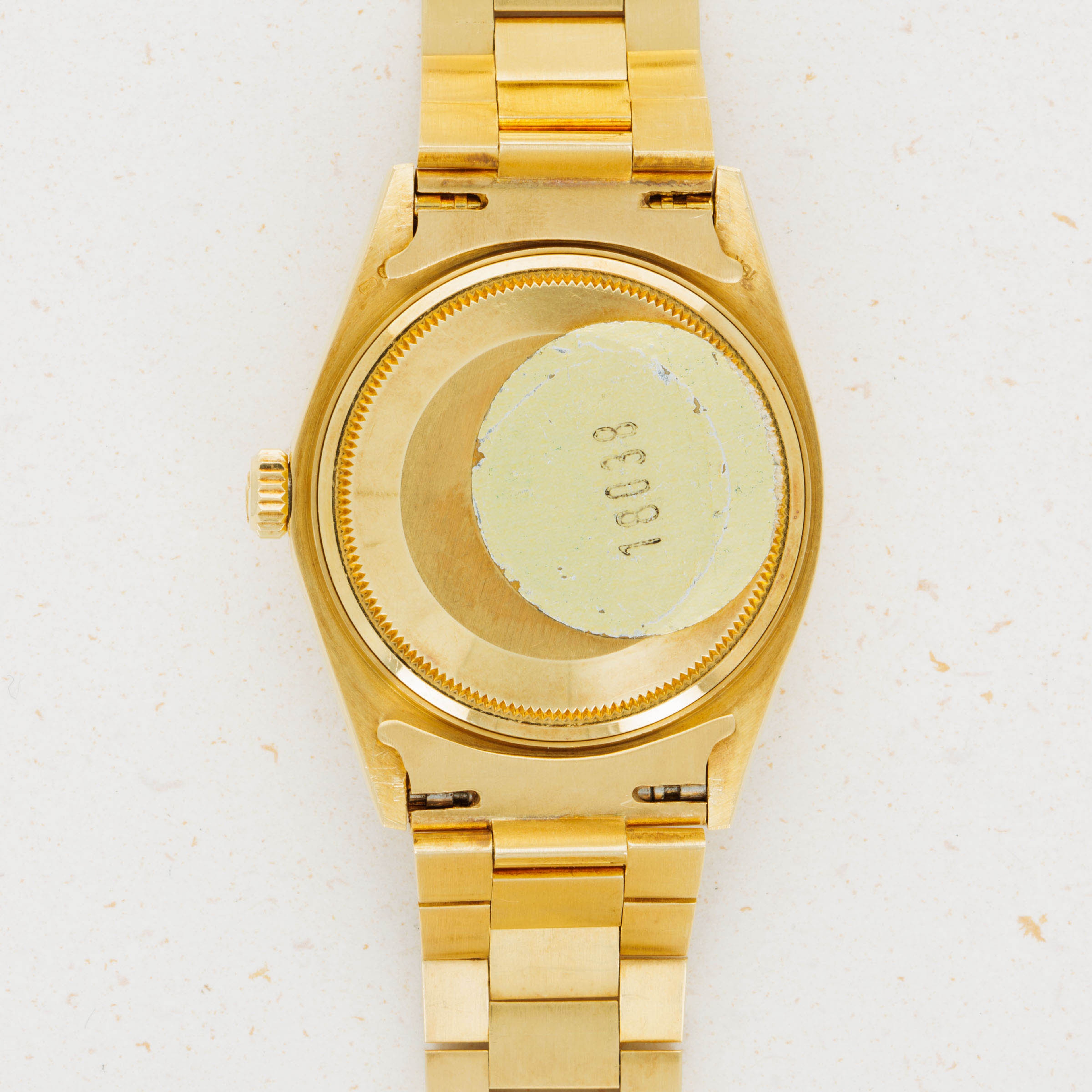 This ref. 18038's 18kt yellow gold construction is entirely classical in its design with the Day-Date's traditional 36mm case, iconic Presidential bracelet and wonderful fluted bezel.