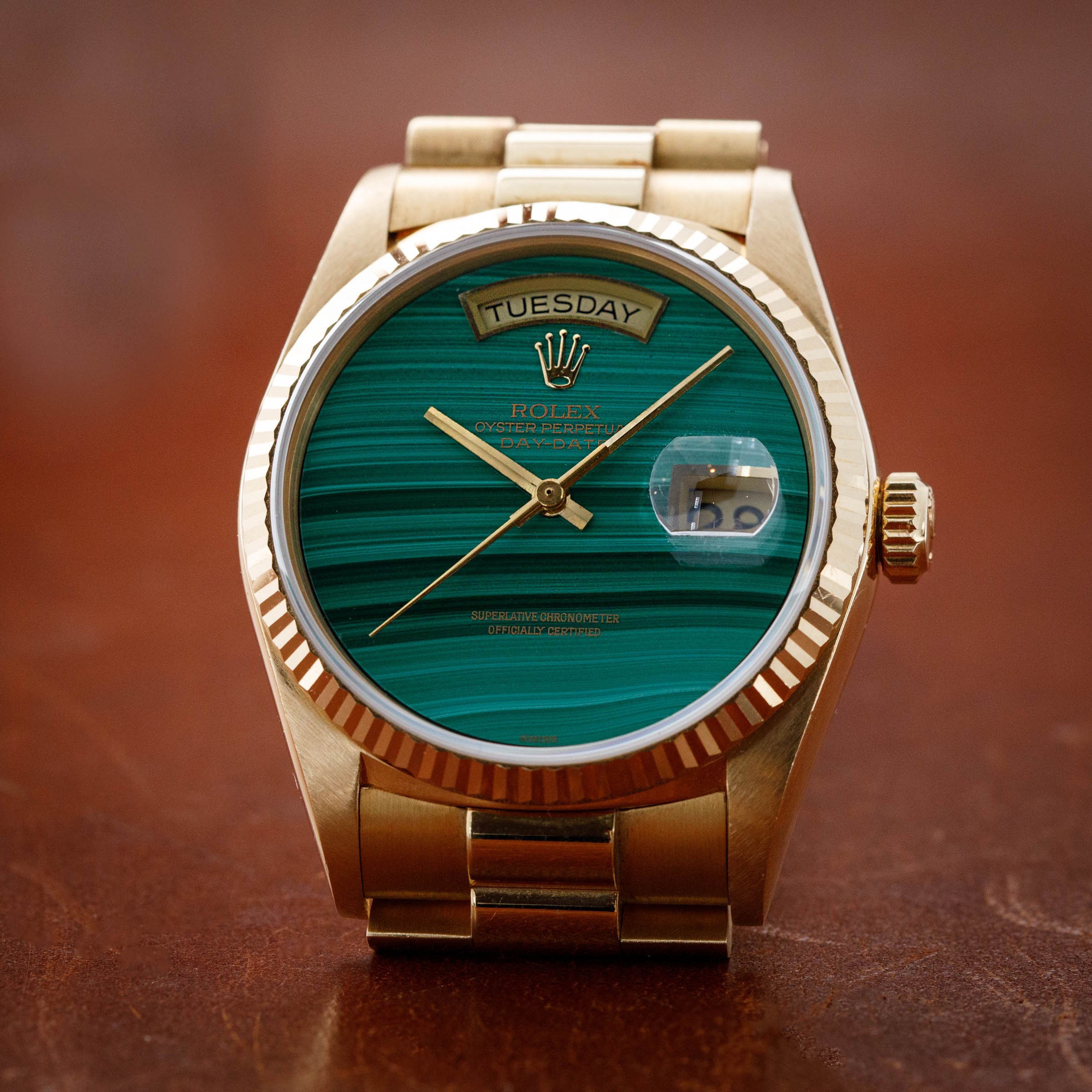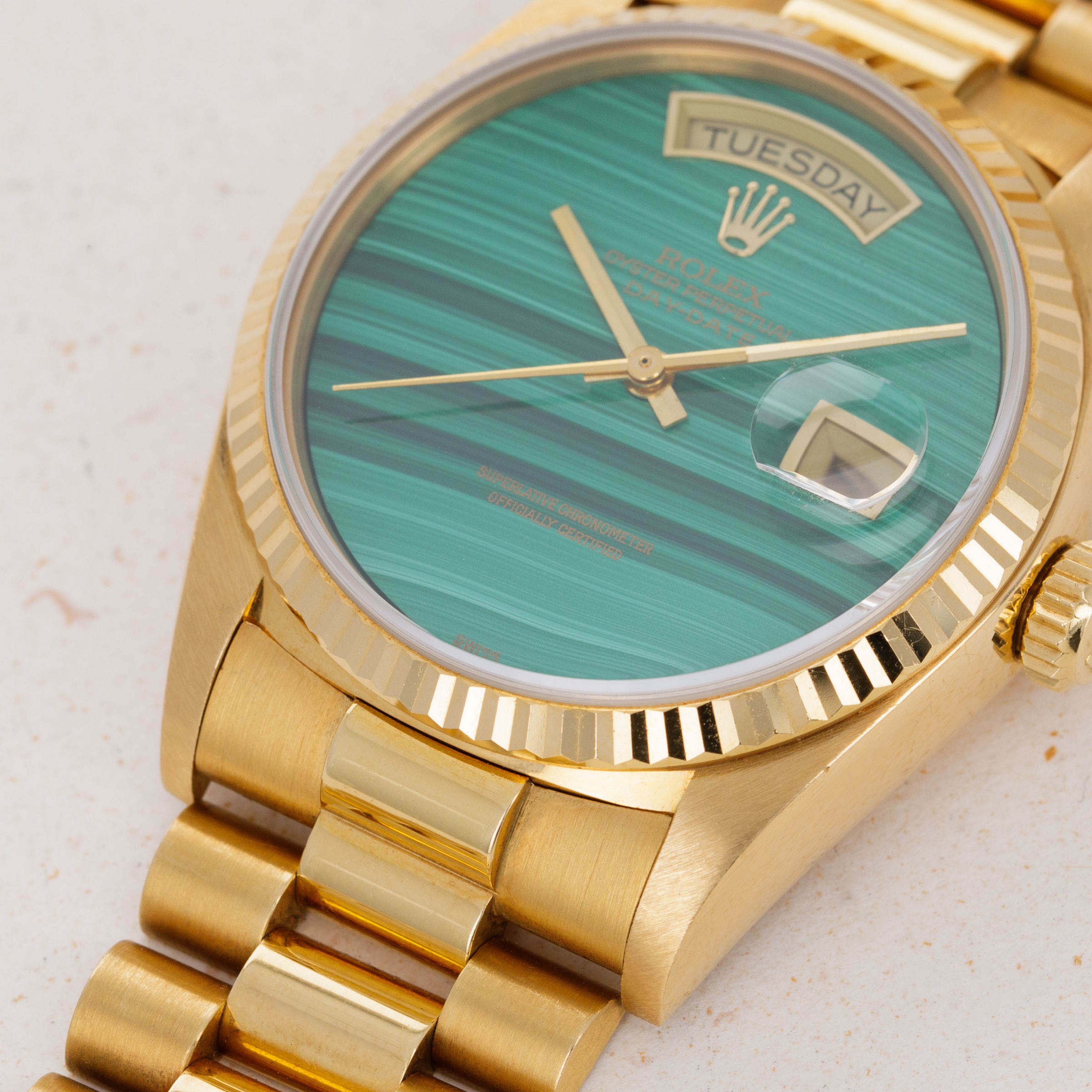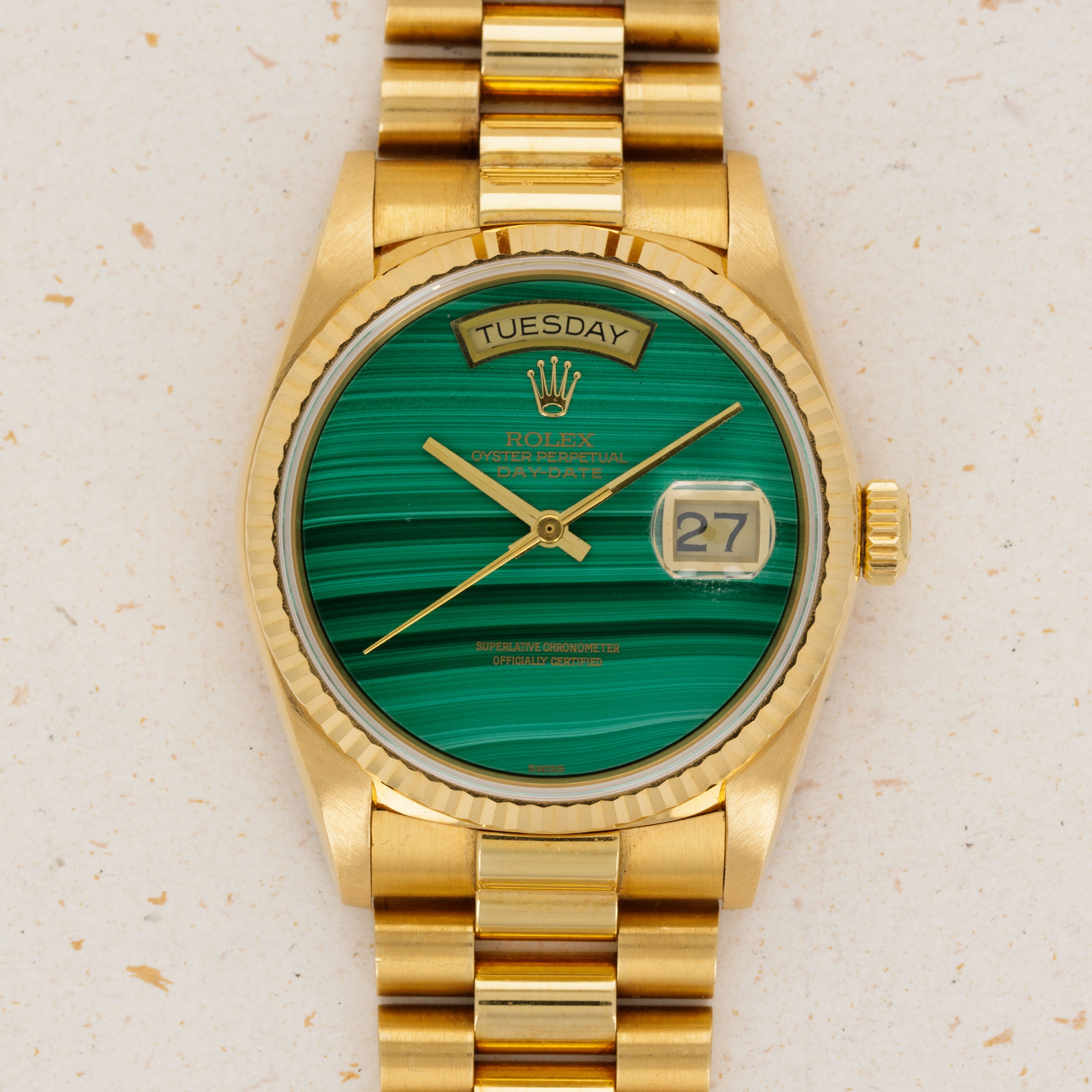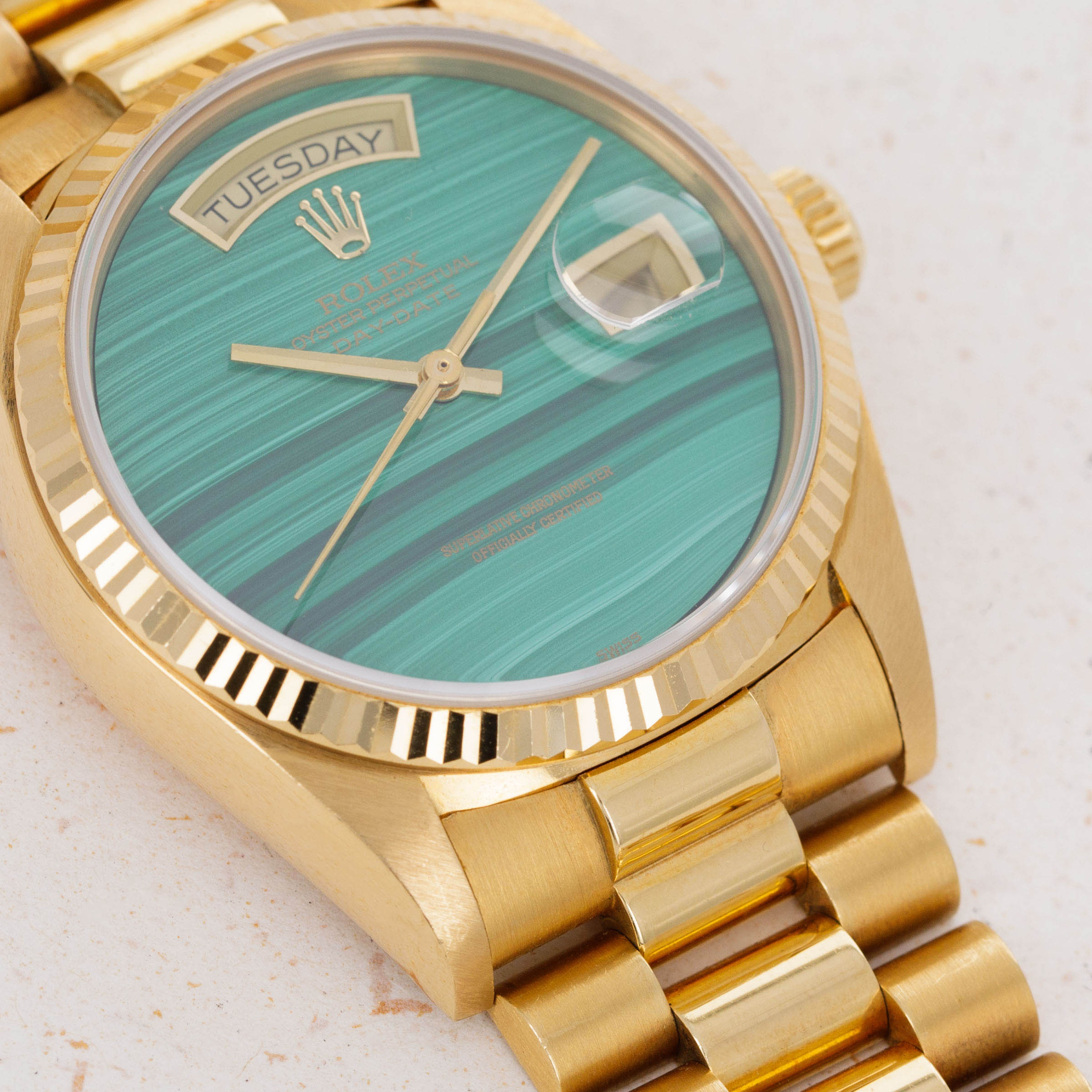 Featuring one of the Day-Date's most sought-after dials, this ref. 18038 is offered as one of the rarest Day-Dates on the market, with its stunning green malachite dial sitting at the pinnacle of every Day-Date collector's wishlist.