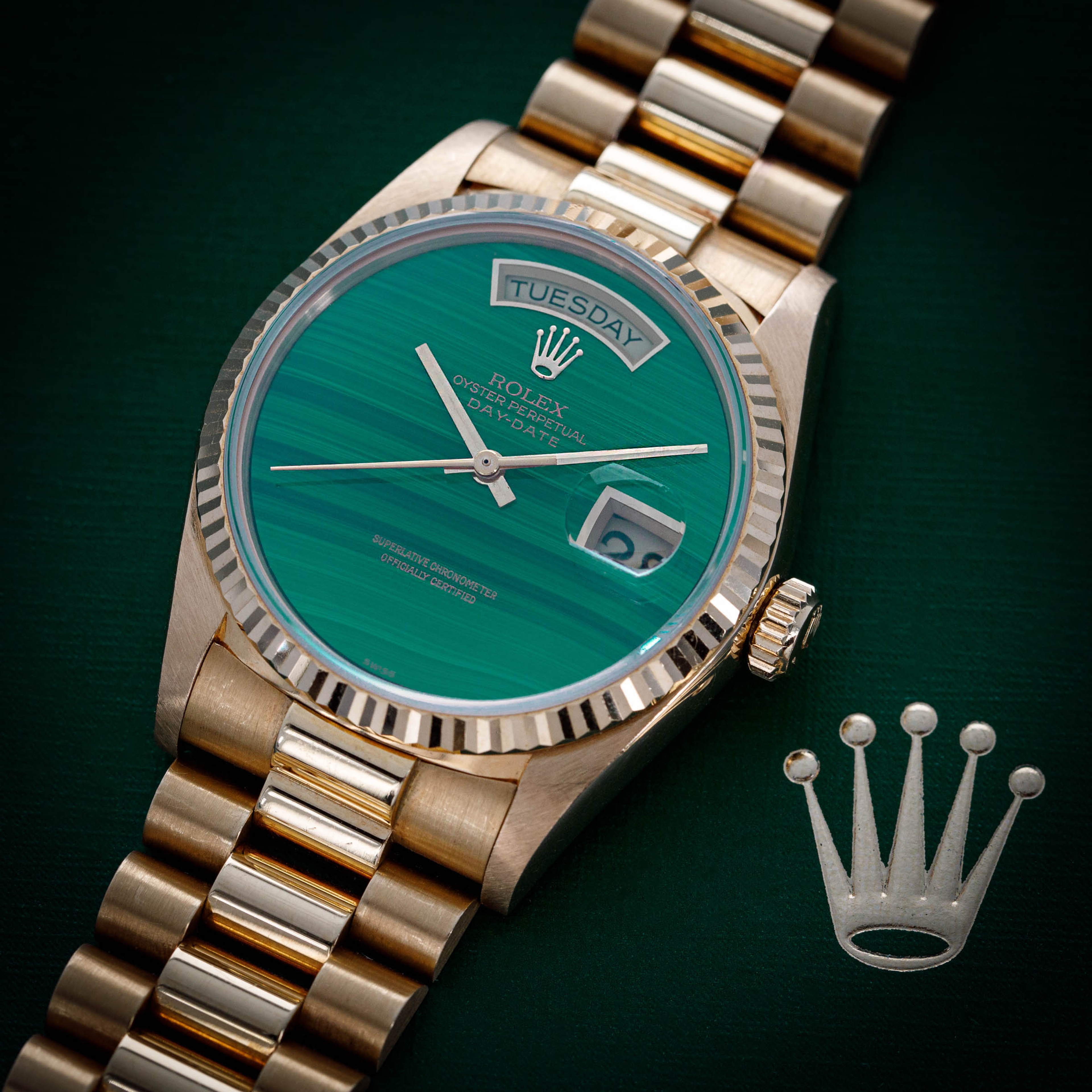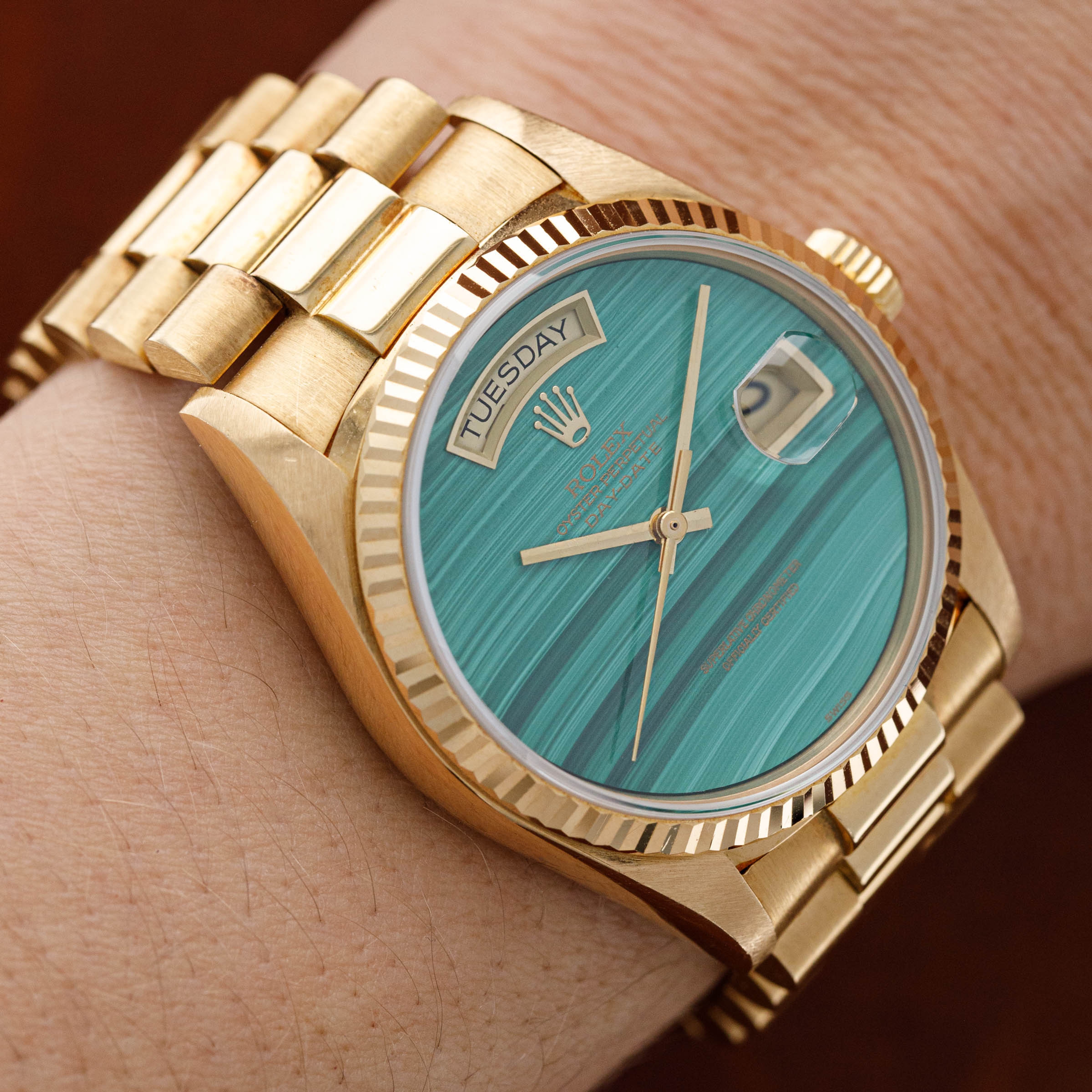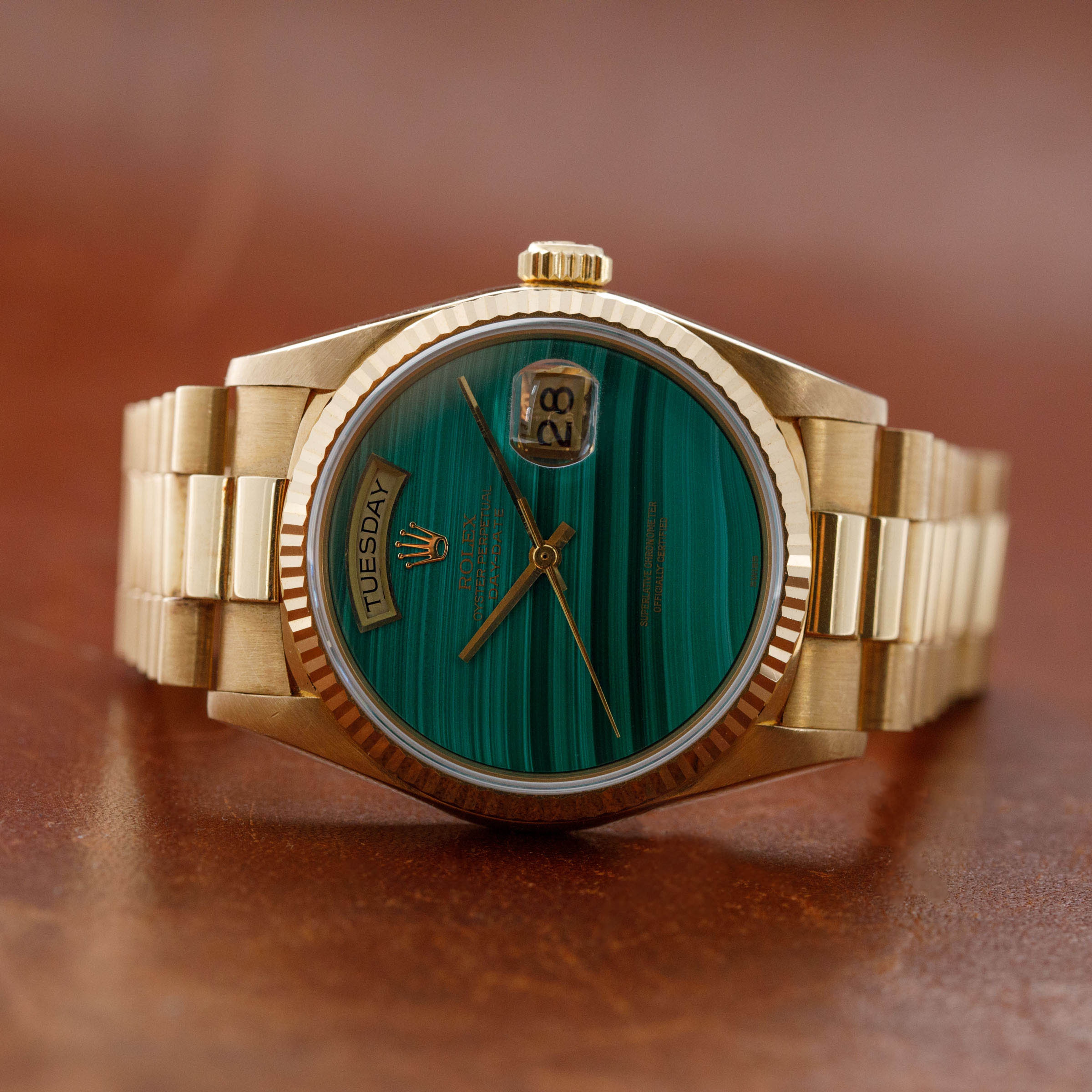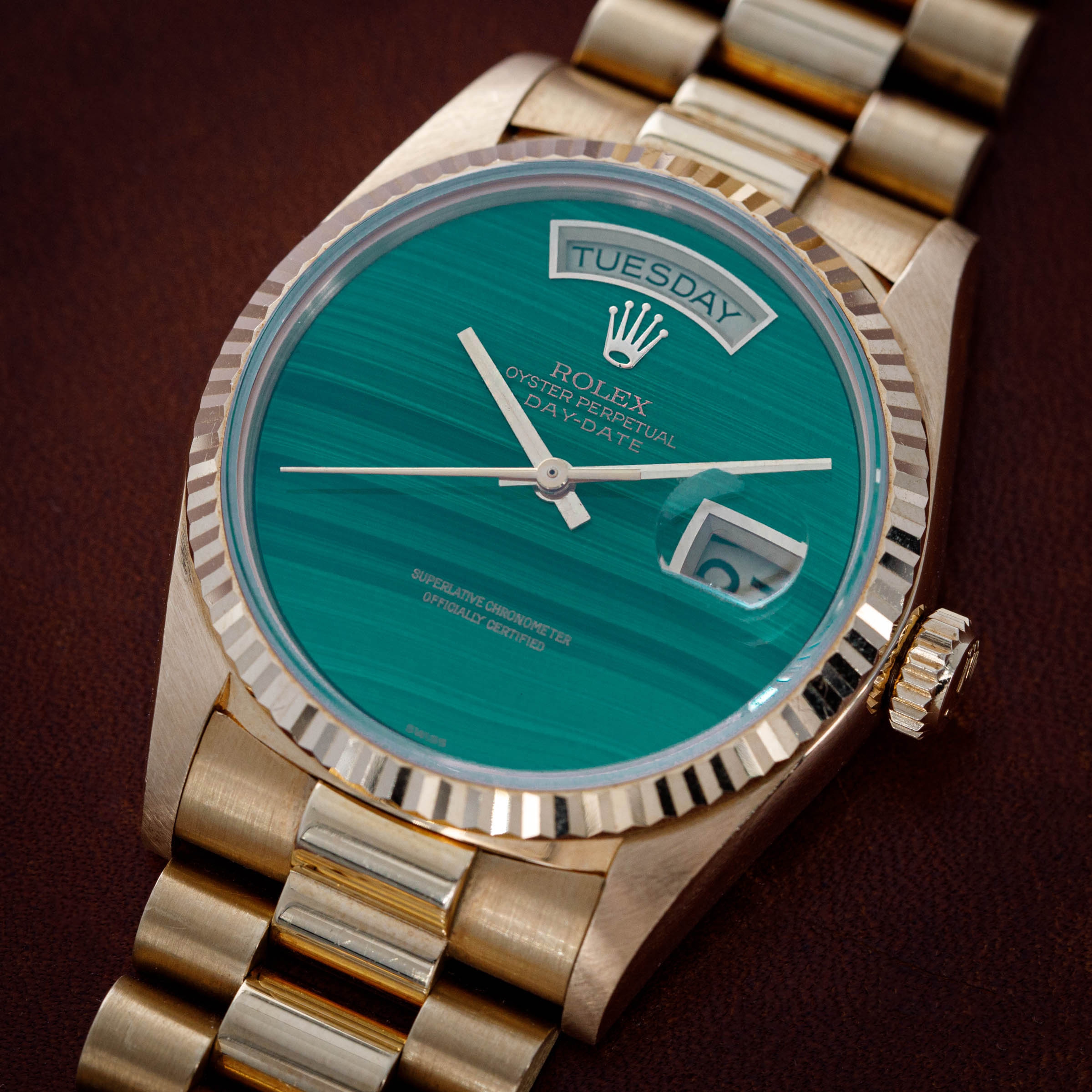 Featuring one of the Day-Date's most sought-after dials, this ref. 18038 is offered as one of the rarest Day-Dates on the market, with its stunning green malachite dial sitting at the pinnacle of every Day-Date collector's wishlist.