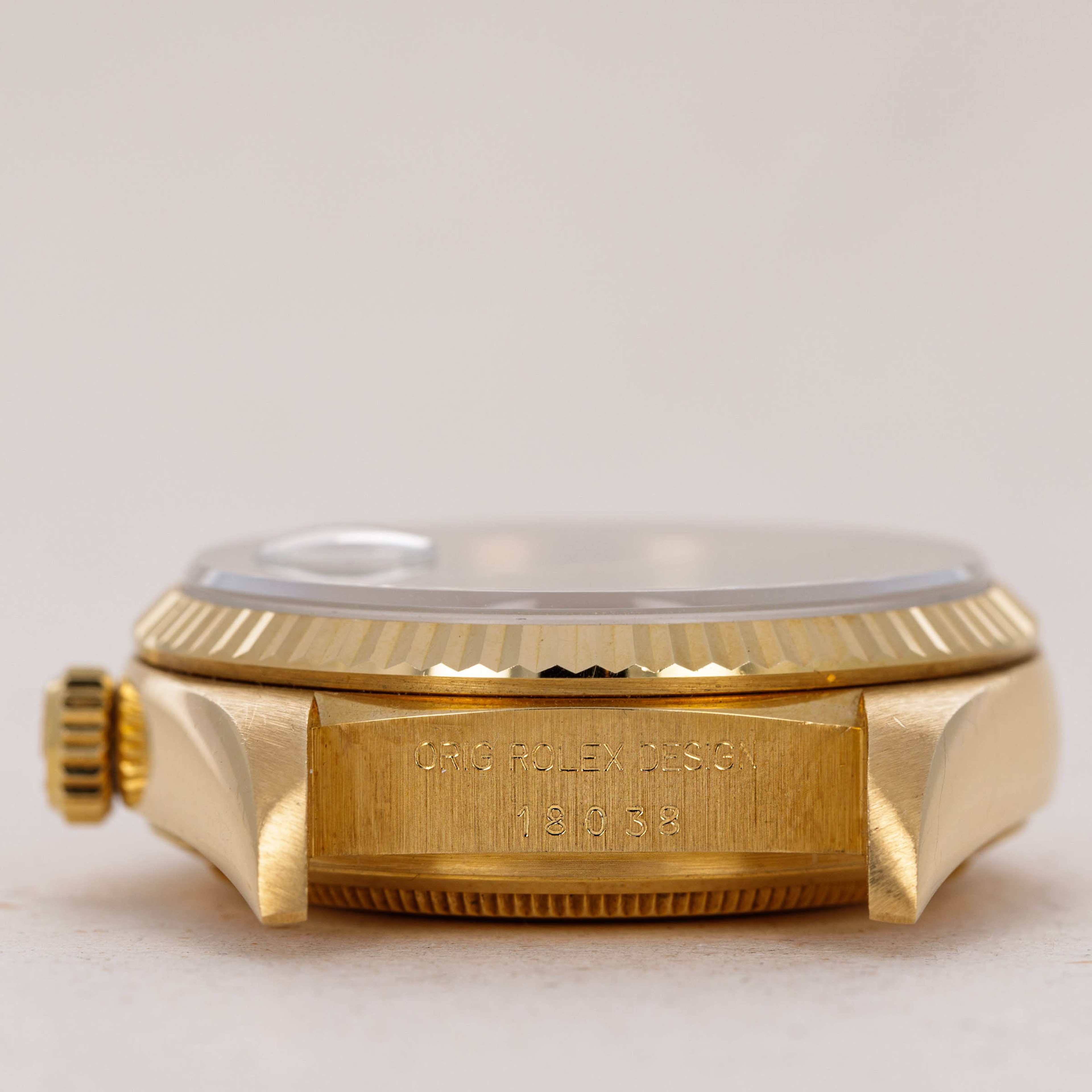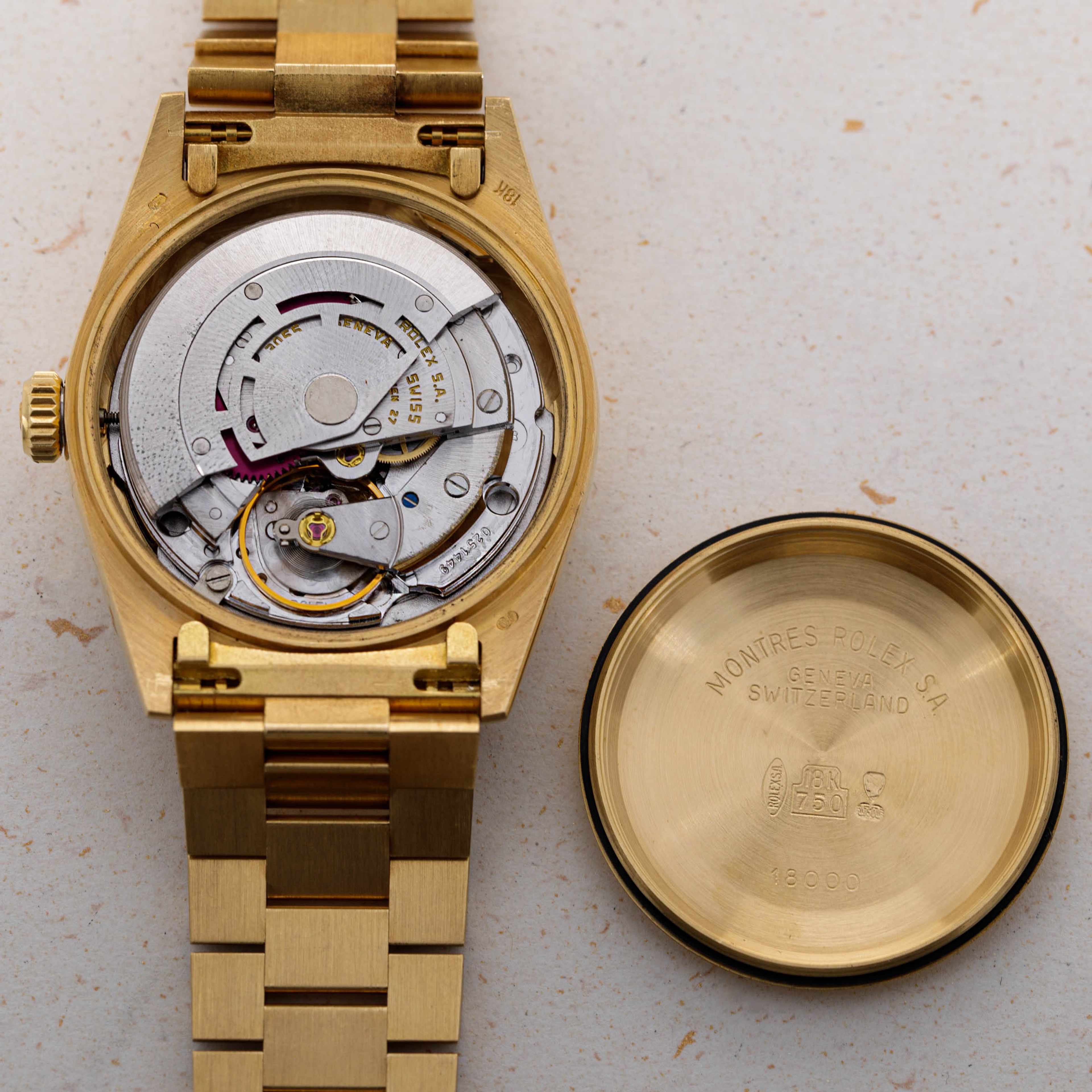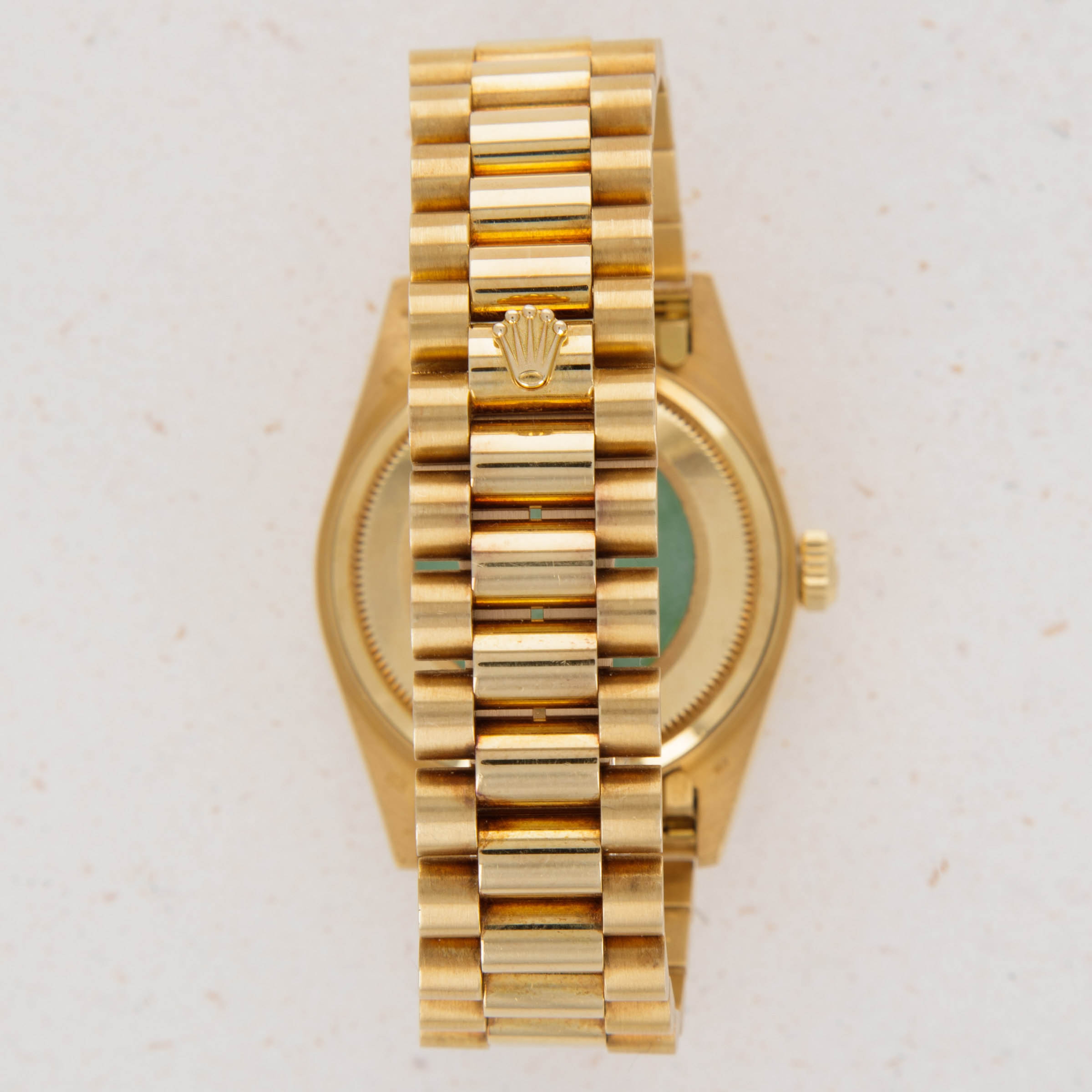 Boasting the Day-Date's iconic 36mm 18kt yellow gold construction, this ref. 18038 combines a Presidential bracelet alongside its fluted bezel to go with its exceptionally colorful green malachite dial.