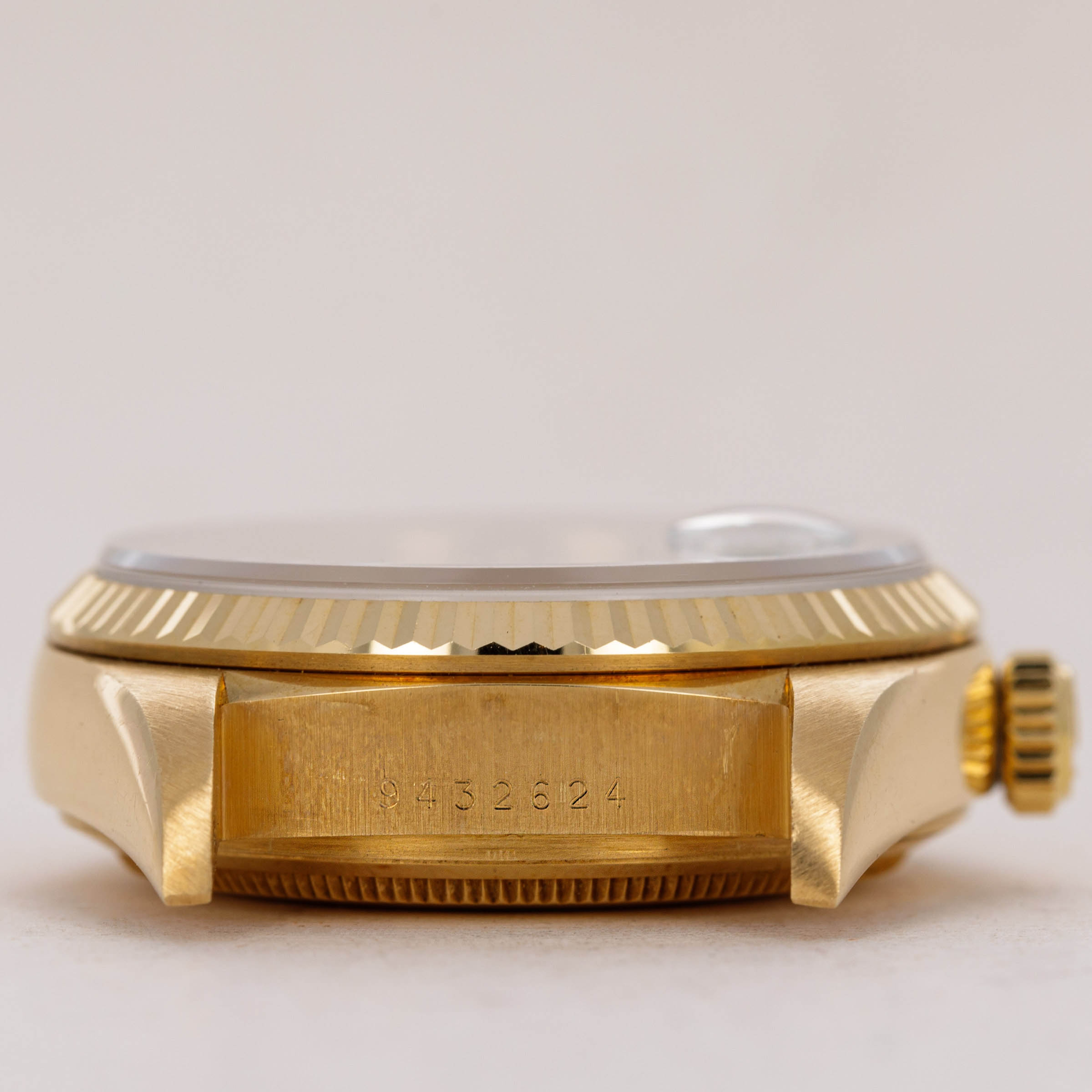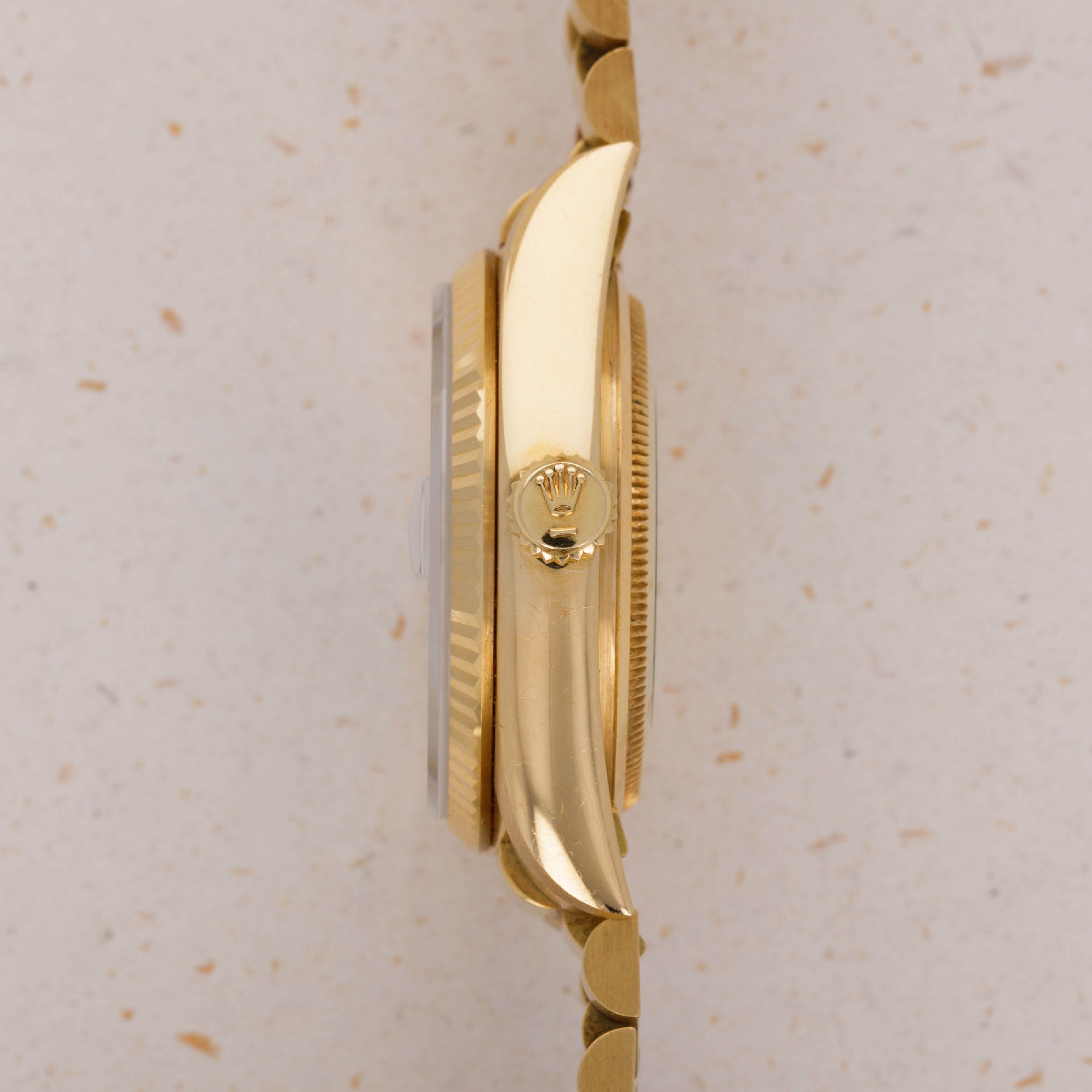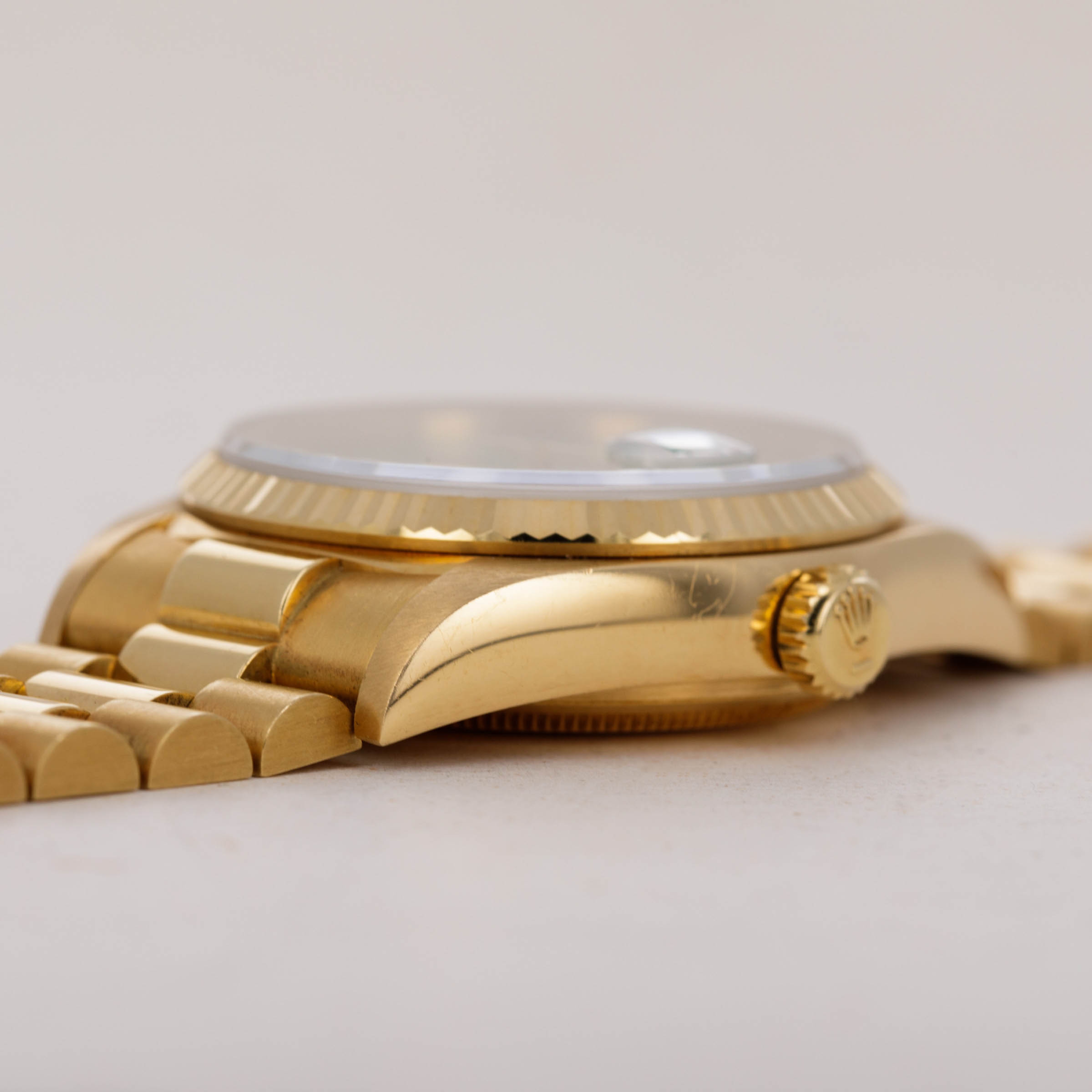 Boasting the Day-Date's iconic 36mm 18kt yellow gold construction, this ref. 18038 combines a Presidential bracelet alongside its fluted bezel to go with its exceptionally colorful green malachite dial.