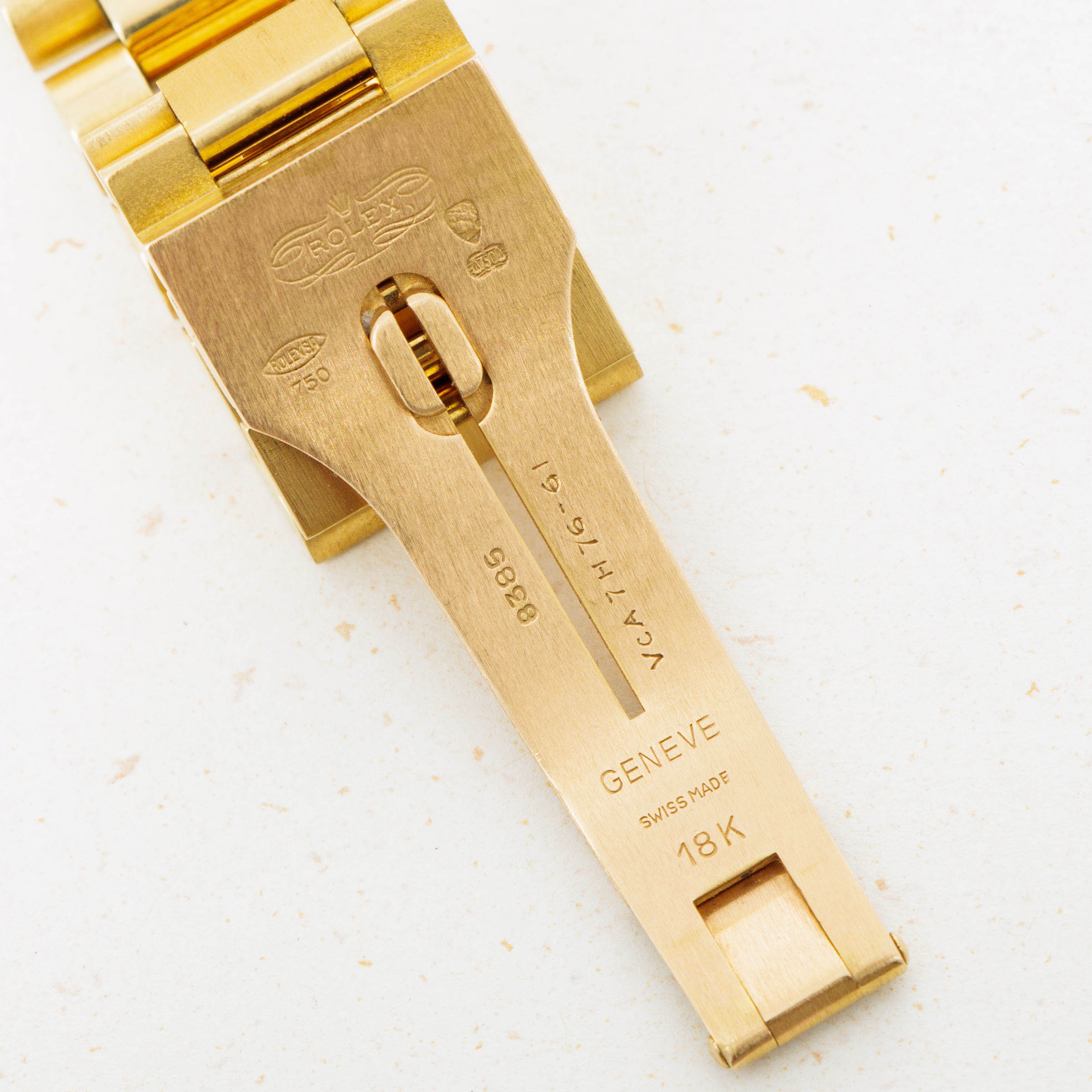 Case and bracelet exhibits minor signs of wear including some scratches and marks. They are minor, and the watch presents overall in near-mint condition, with sharp edges and thick symmetrical lugs. VCA hand engraved stock number visible on the clasp of the watch. It matches the number written on the papers that are typed "VAN CLEEF AND ARPELS". Dial and hands are near-mint, with slight discoloration visible on the coronet of the dial, but otherwise free from anything noteworthy. Bracelet has 24 links total, 5 of which are removable. It exhibits minimal stretch.