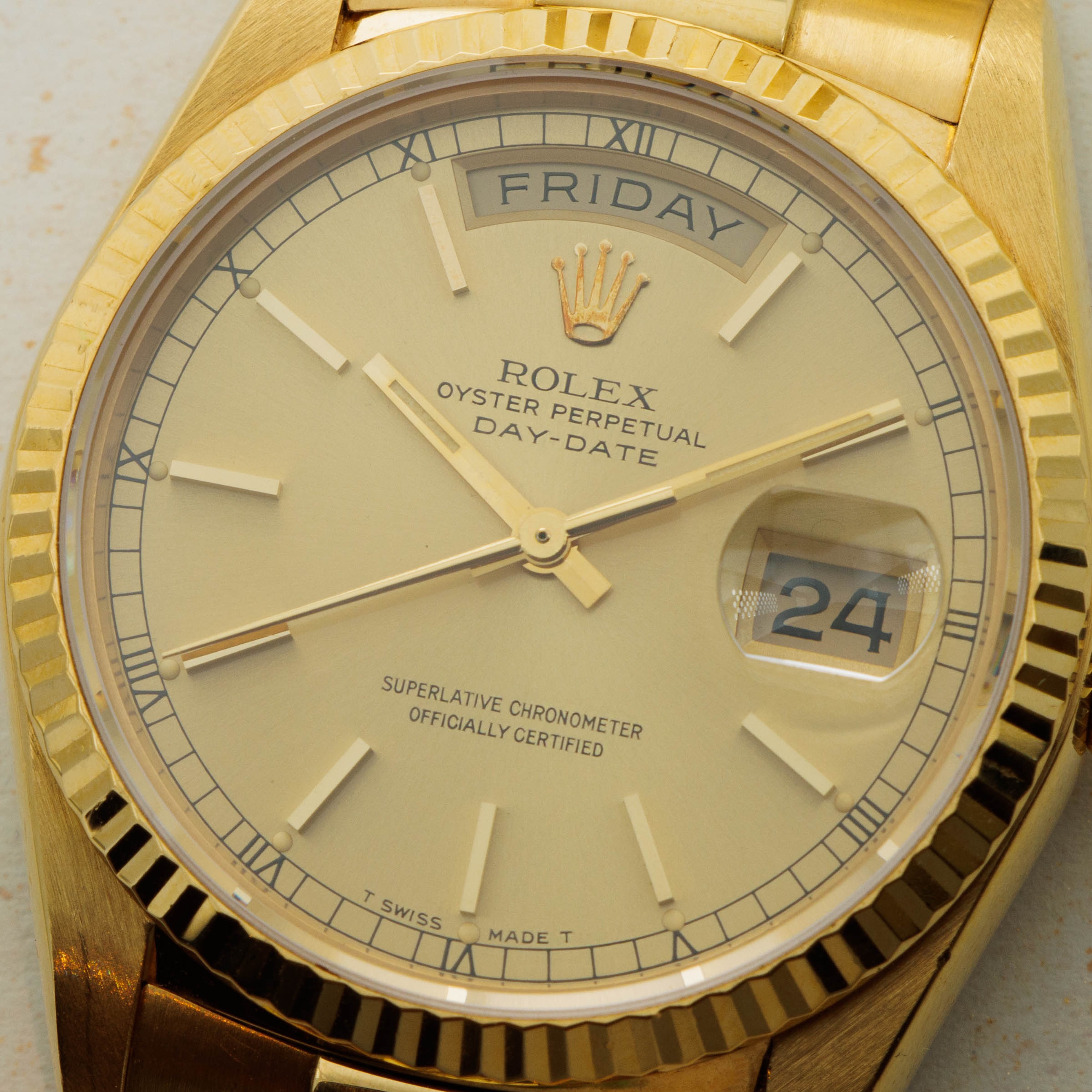 A legendary timepiece with an unrivaled history, the Rolex Day-Date has earned its place as "The Ultimate Watch of Prestige" from its decades on the wrists of the world's most influential people. Released in 1956, the Day-Date quickly became synonymous with luxury, prestige, and exclusivity thanks to being the watch of choice for the world's athletes, visionaries, and world leaders alike. Only ever constructed of precious metals, the Day-Date's aesthetic is that of sheer elegance and grace. Aside from the beautiful array of dial options that have been available over the decades, the Day-Date's most iconic piece of design is its three-piece "Presidential" or "President" bracelet. Forming the bedrock of its design, the Presidential bracelet has become synonymous with Rolex's flagship collection and their desire to create the very best and most iconic watches that the world has ever seen. With its timeless design and inescapable impact on horology, the Day-Date stands as a vivid reminder of just how successful they have been in realizing that very mission.