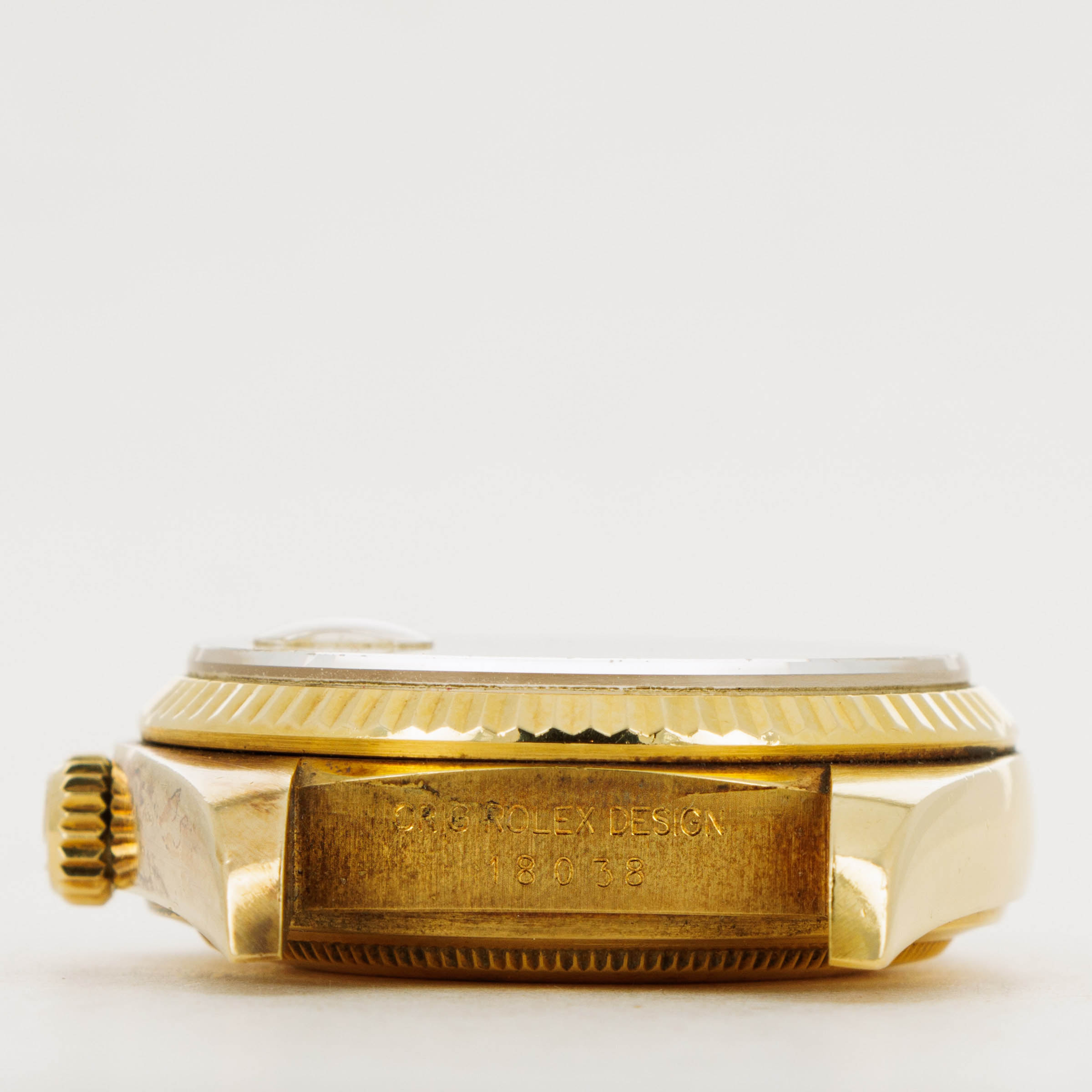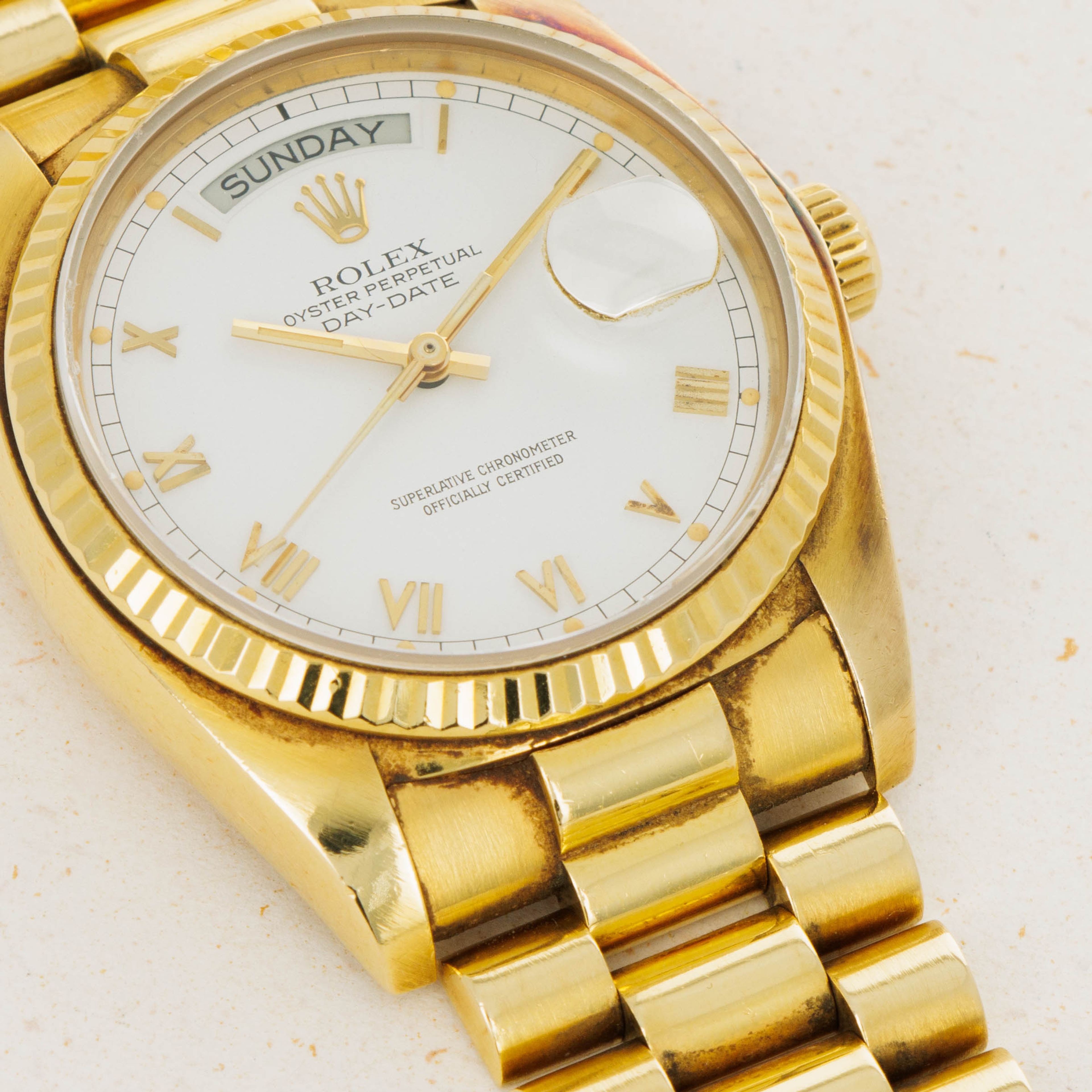 Featuring a stunning white dial with applied Roman numerals, this Day-Date's aesthetic is wonderfully regal with its 18kt yellow gold hands and numerals all adding to the elegance of its full gold construction.