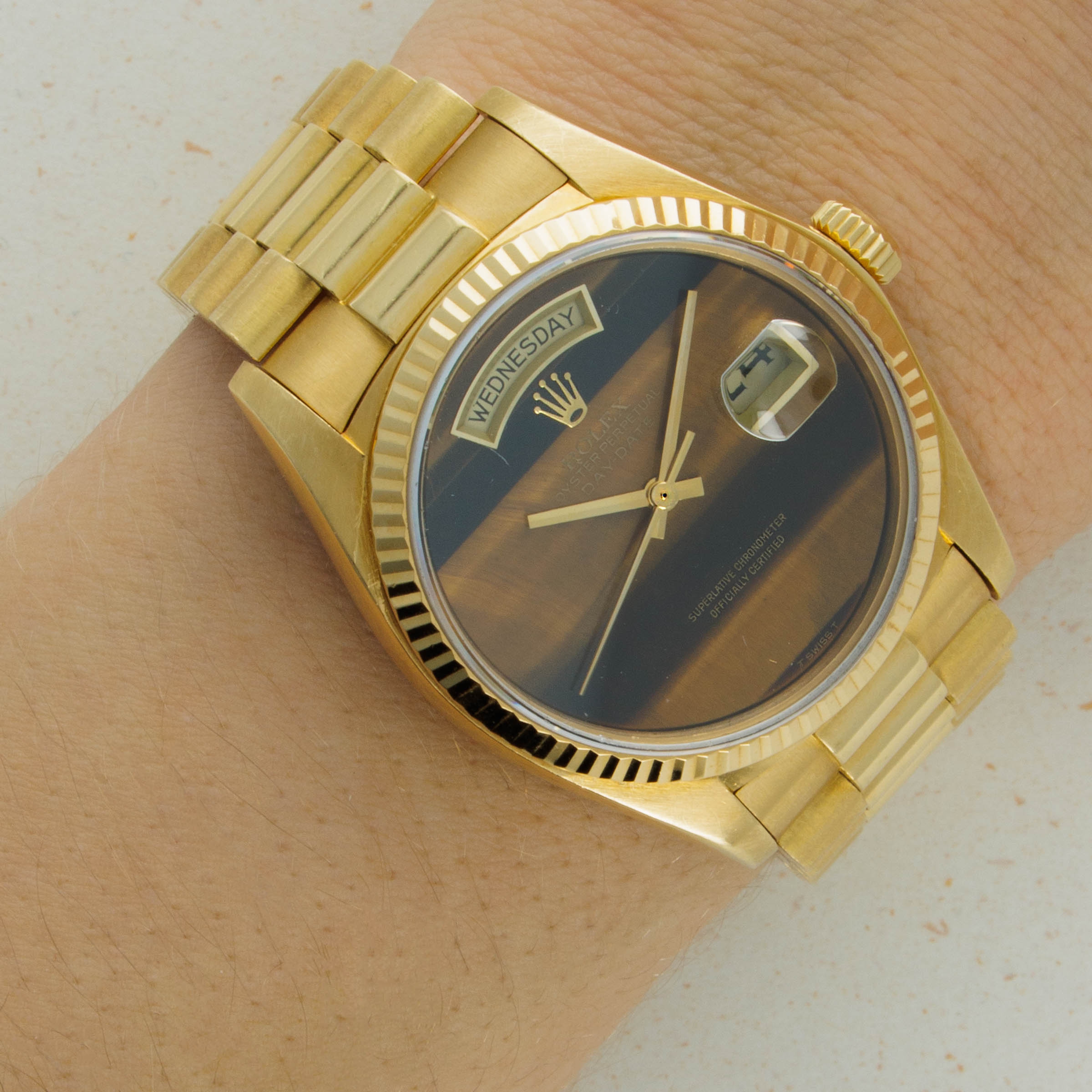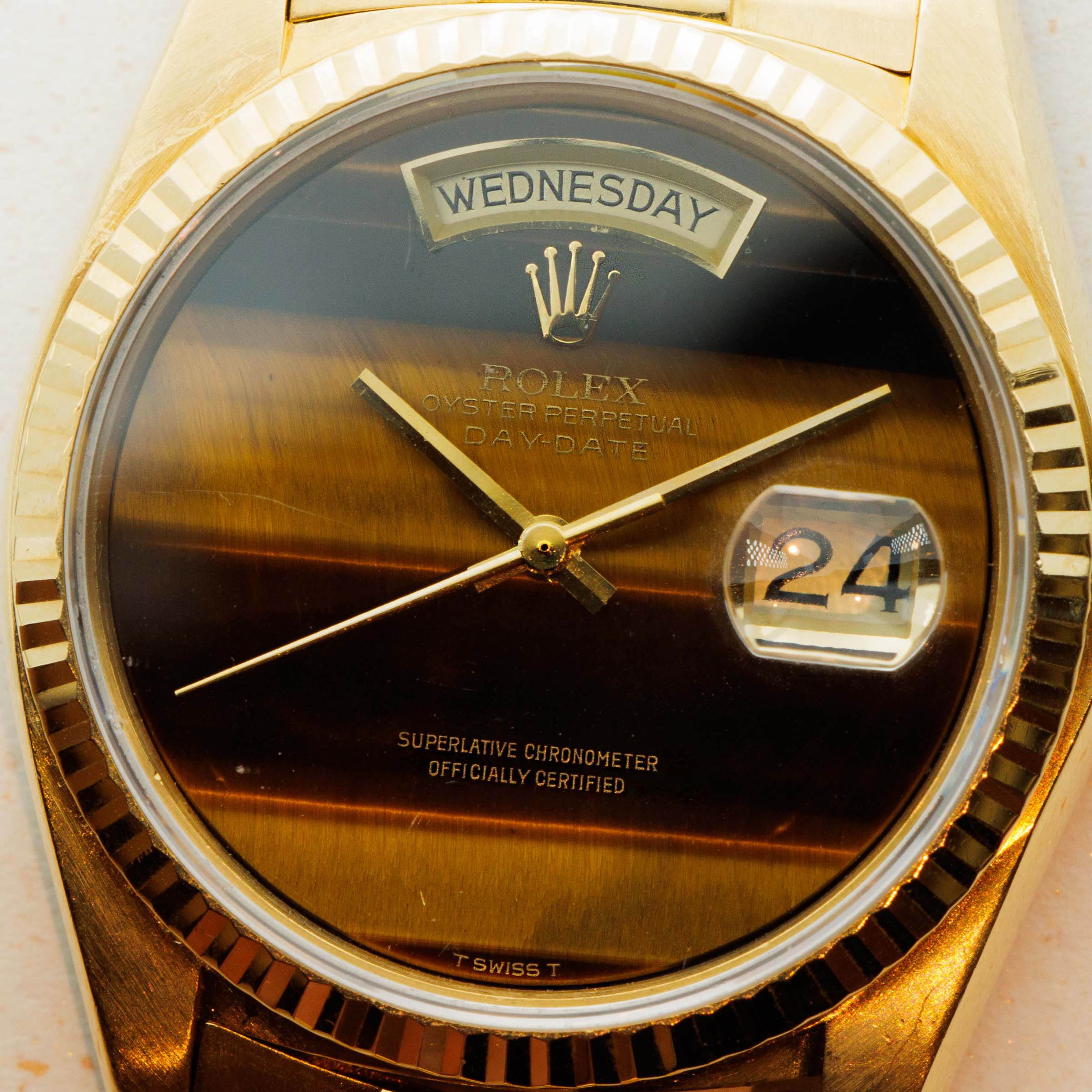 Famed for its chatoyance or "cat’s eye effect" in French, the Tiger's Eye dial adds a touch of understated luxury to the Day-Date's already luxurious construction in a wonderfully balanced manner thanks to its beautiful shimmering effect - not something you see every day.