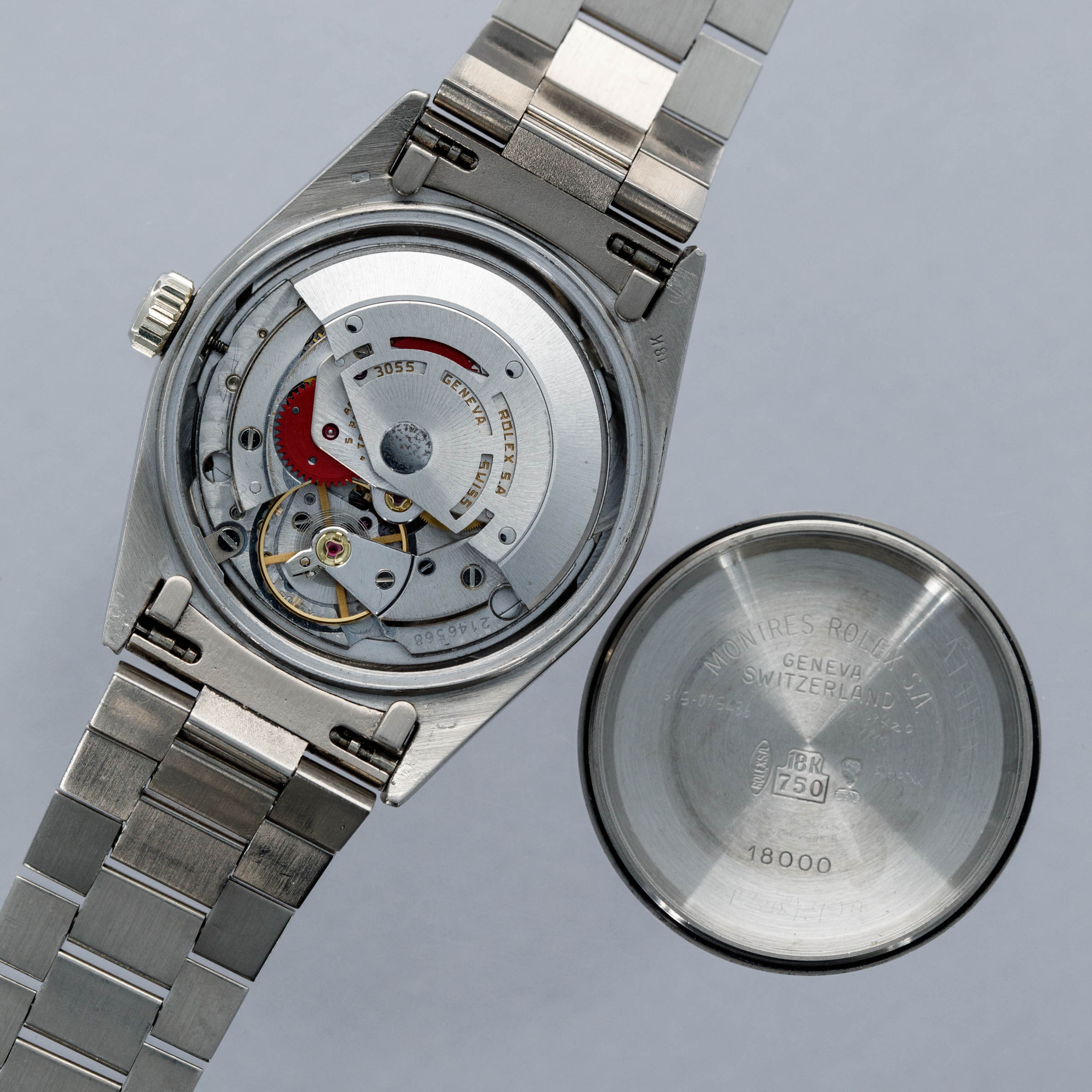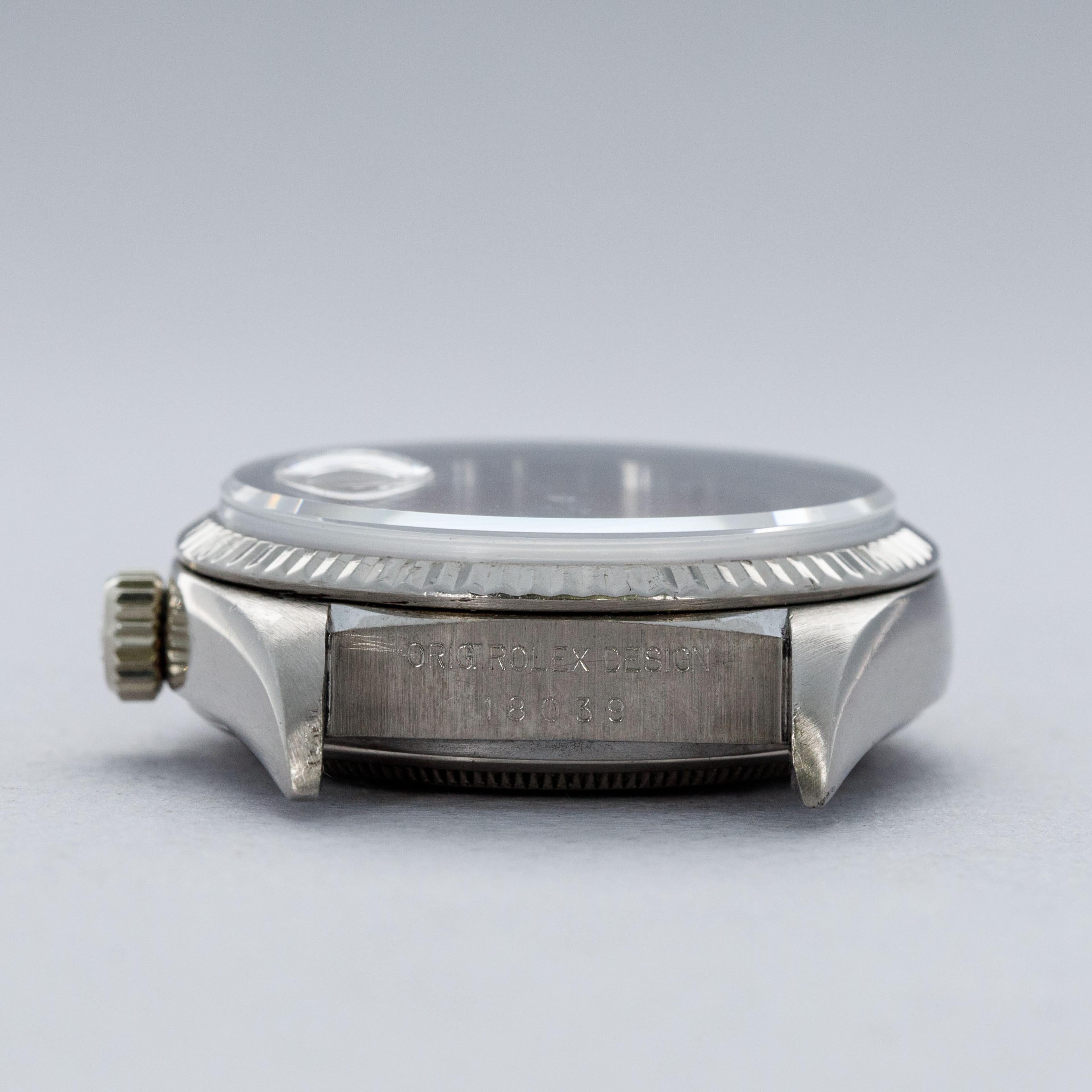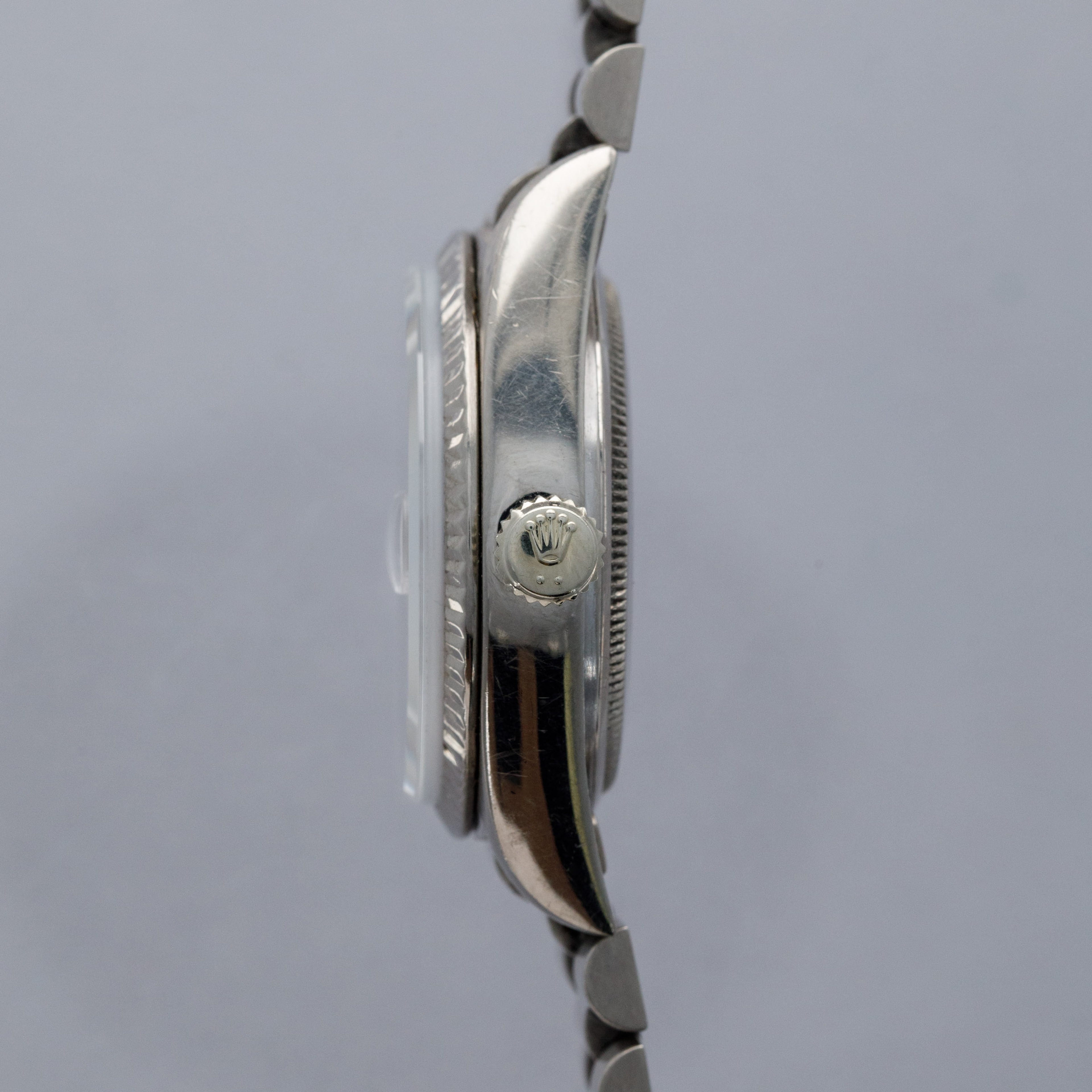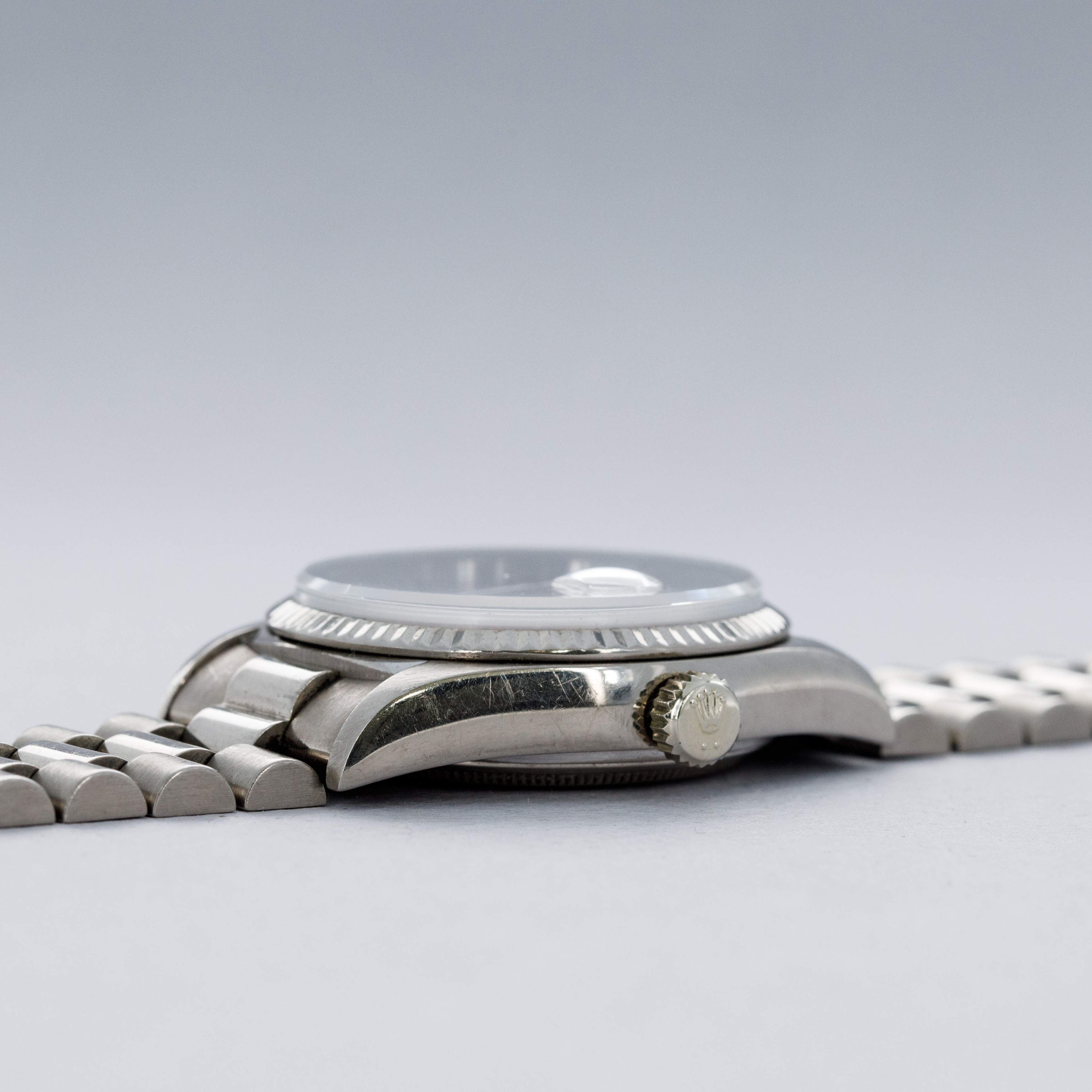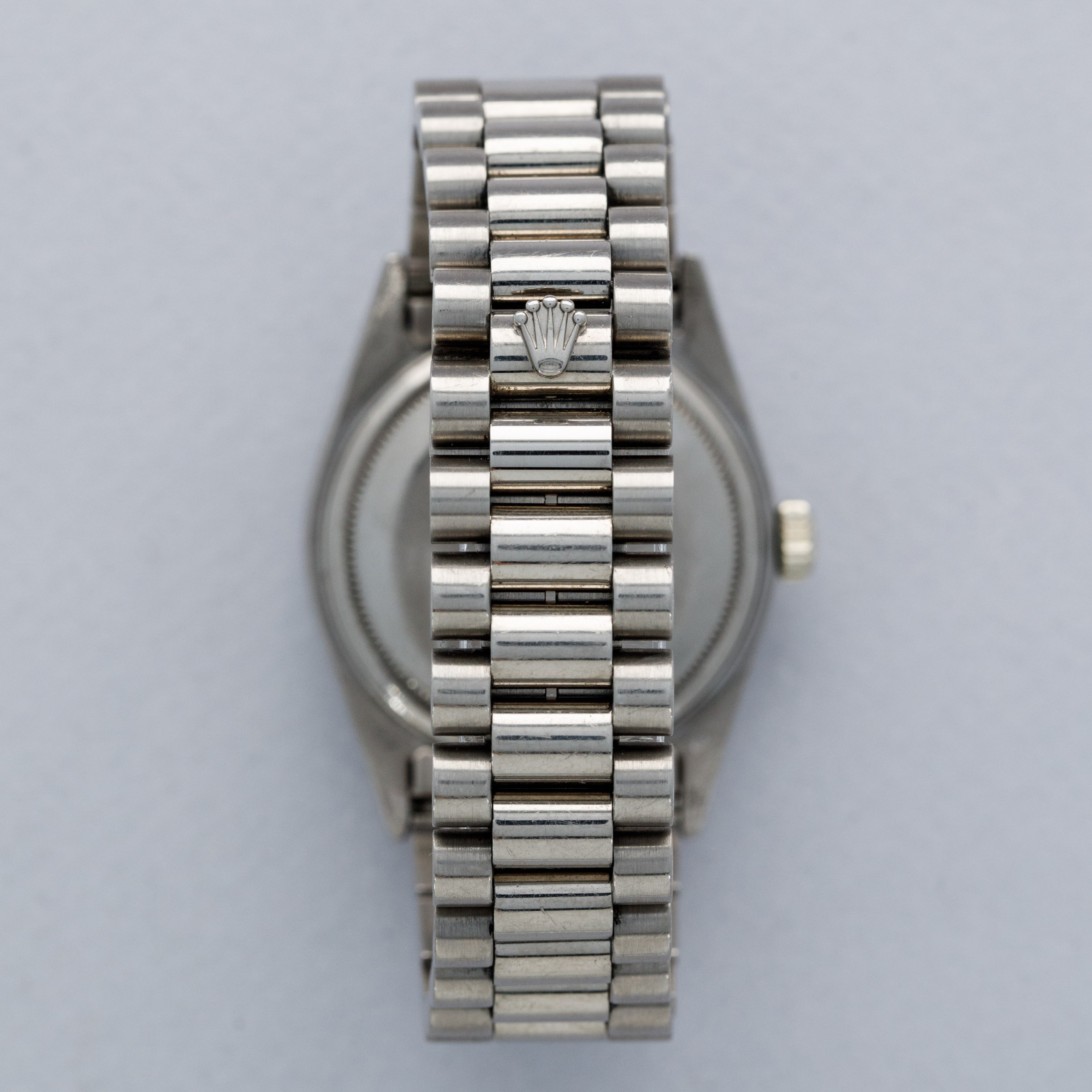 This ref. 18039's 18kt white gold construction features all of the Day-Date's signature elements with its 36mm case, iconic Presidential bracelet and wonderful fluted bezel.