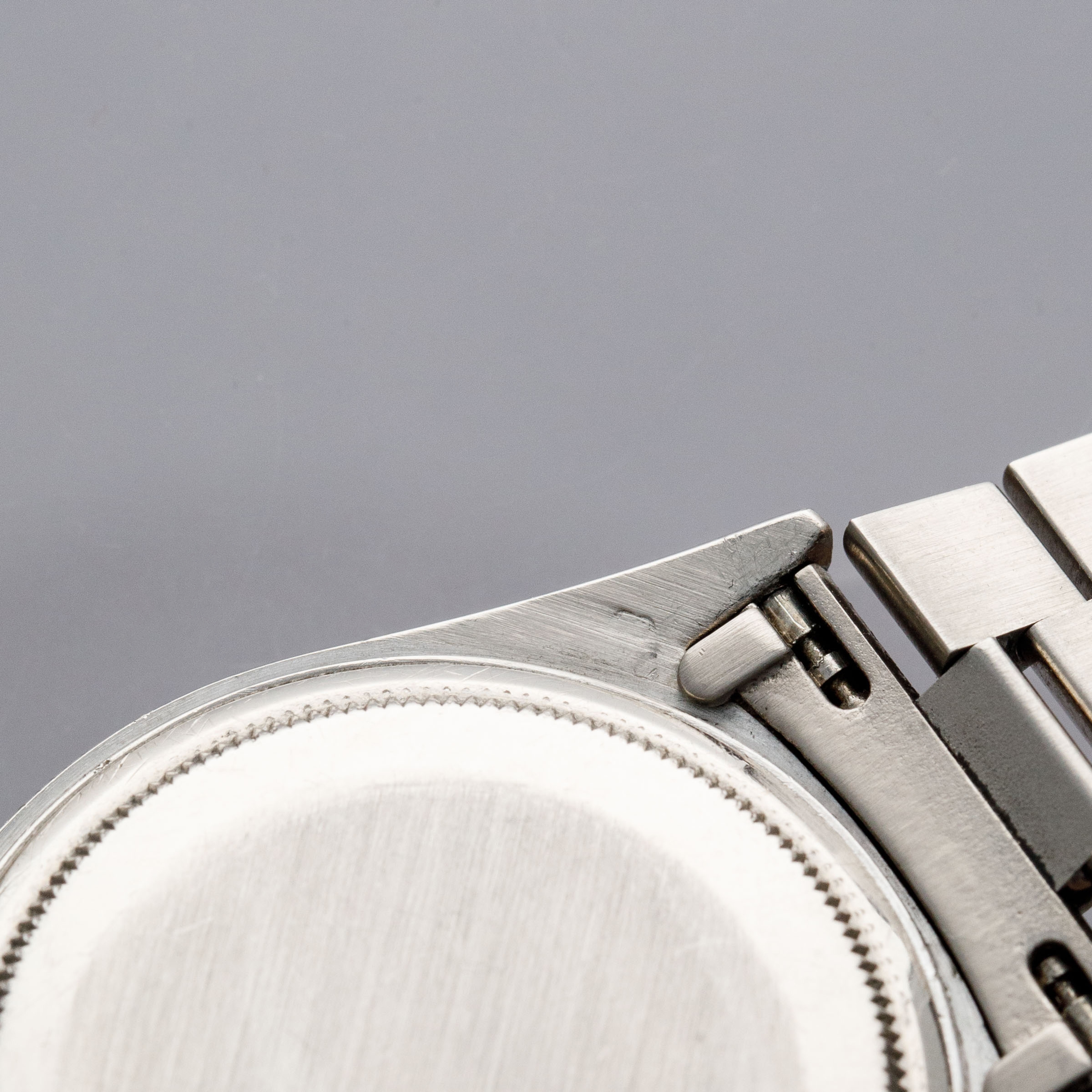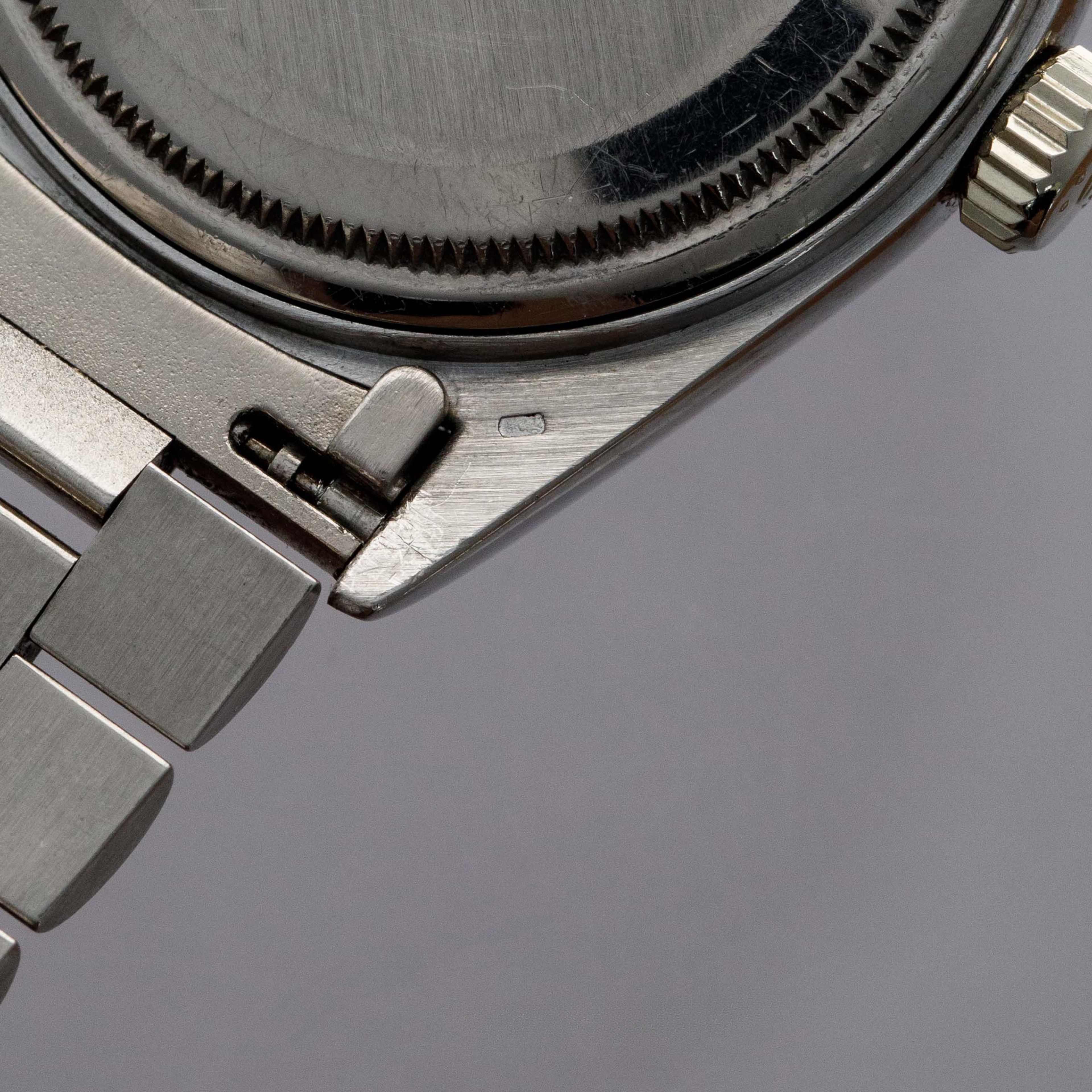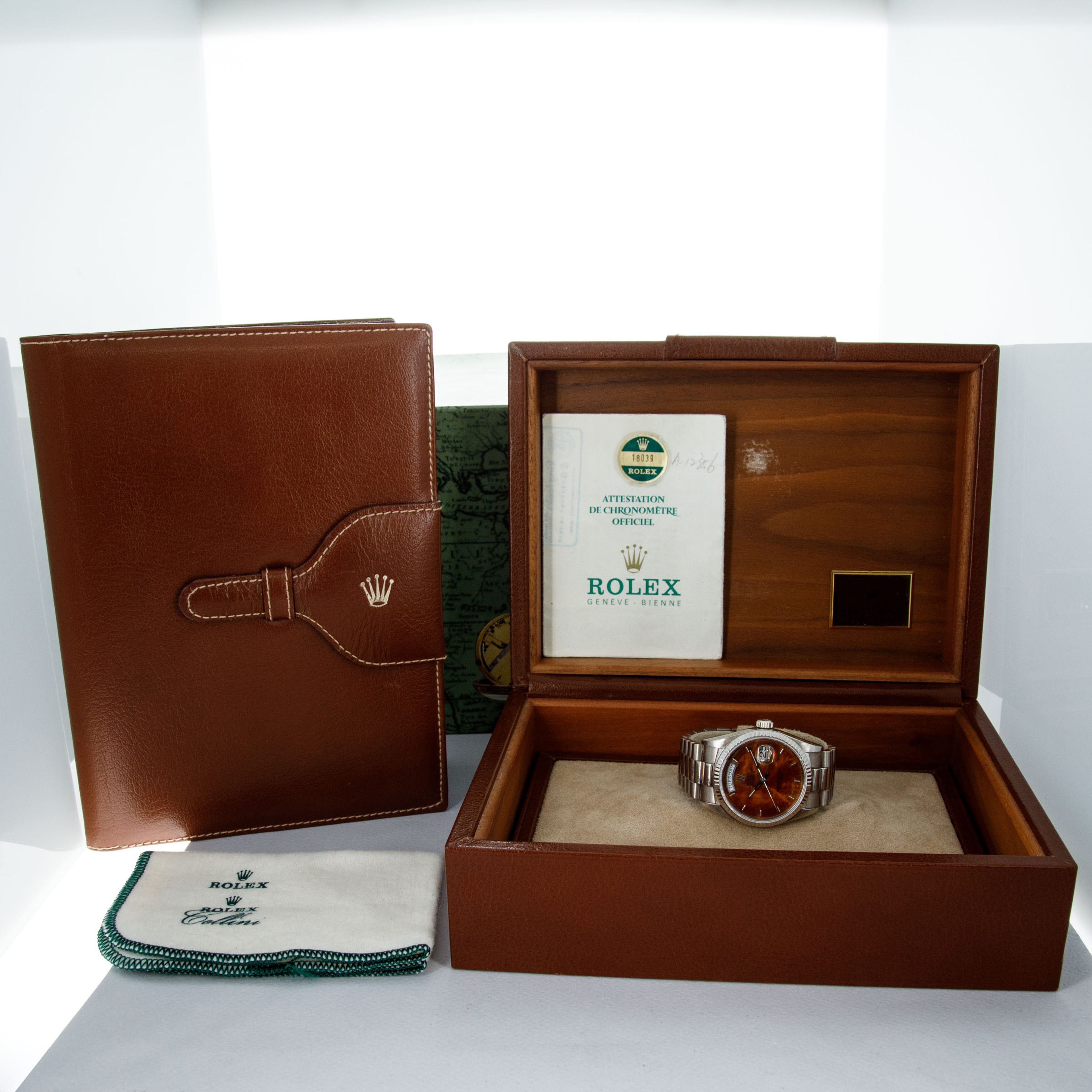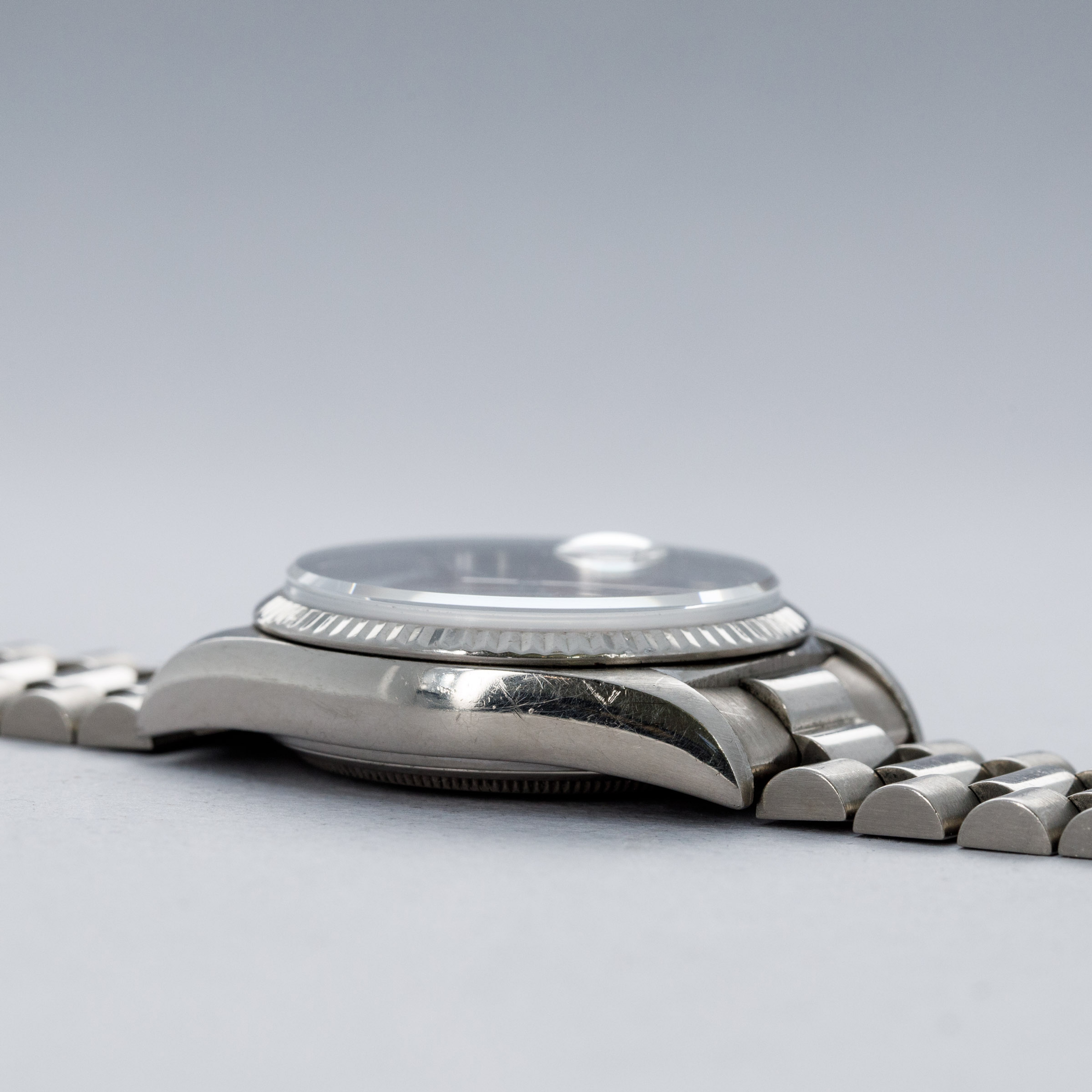 The watch is overall in very good condition. The white gold case has some scratches and light nicks, as expected of a watch of this vintage. The hallmarks on the backs of the upper lugs are well defined, while the lower one is slightly worn. The case back has some light scratches. The white gold fluted bezel shows wear in places and has light scratches. The dial is in good overall condition. The edges have started to peel in areas, and there are areas near the indexes and pinions where delamination and light cracking can be seen between the wood veneer and lacquer. The white gold hands are reasonably clean. The concealed-clasp President bracelet has moderate play between the links. The bracelet currently fits a 7" wrist and has 19 links, 2 of which are removable. Comes with inner and outer boxes, punched papers, document holder, and cleaning cloth.