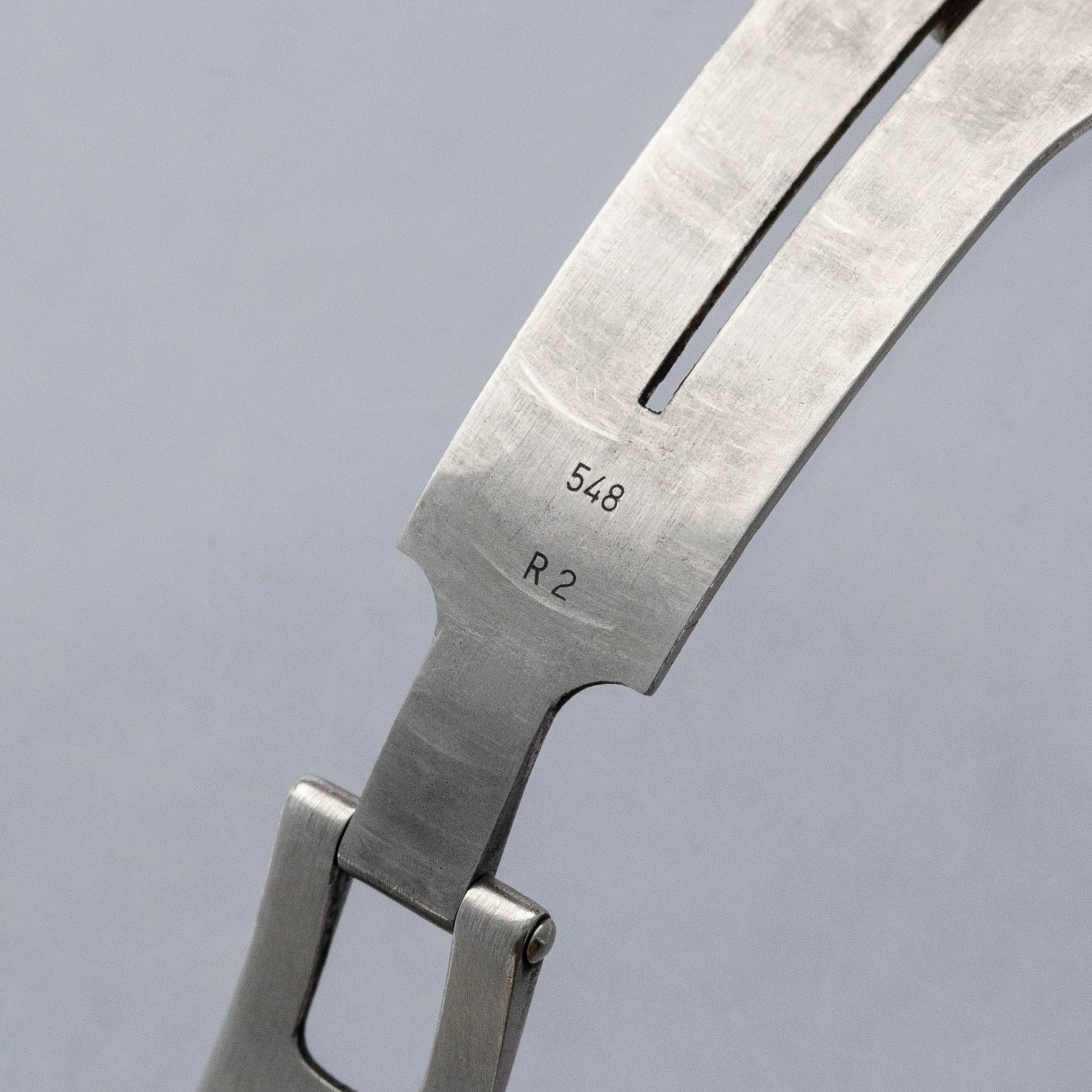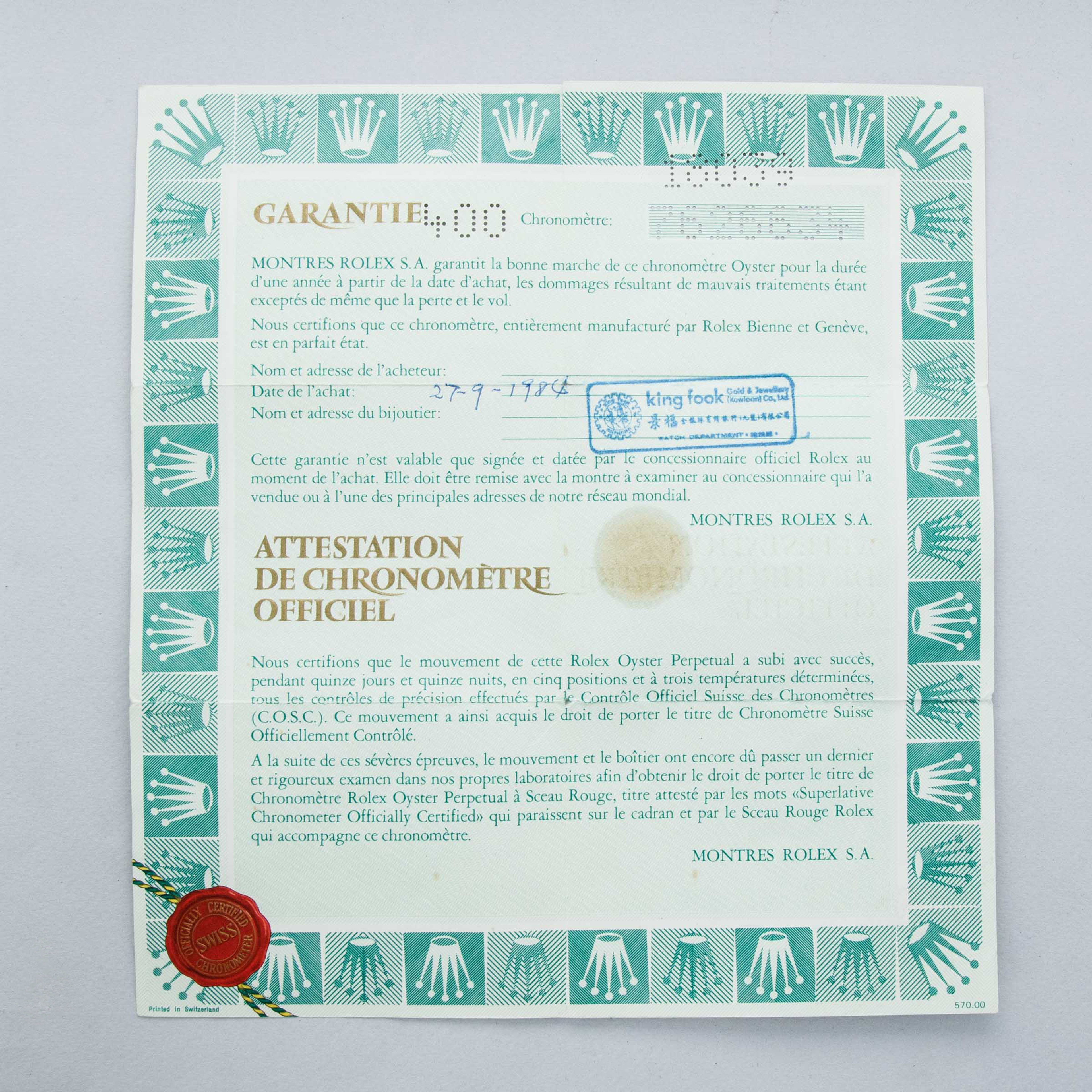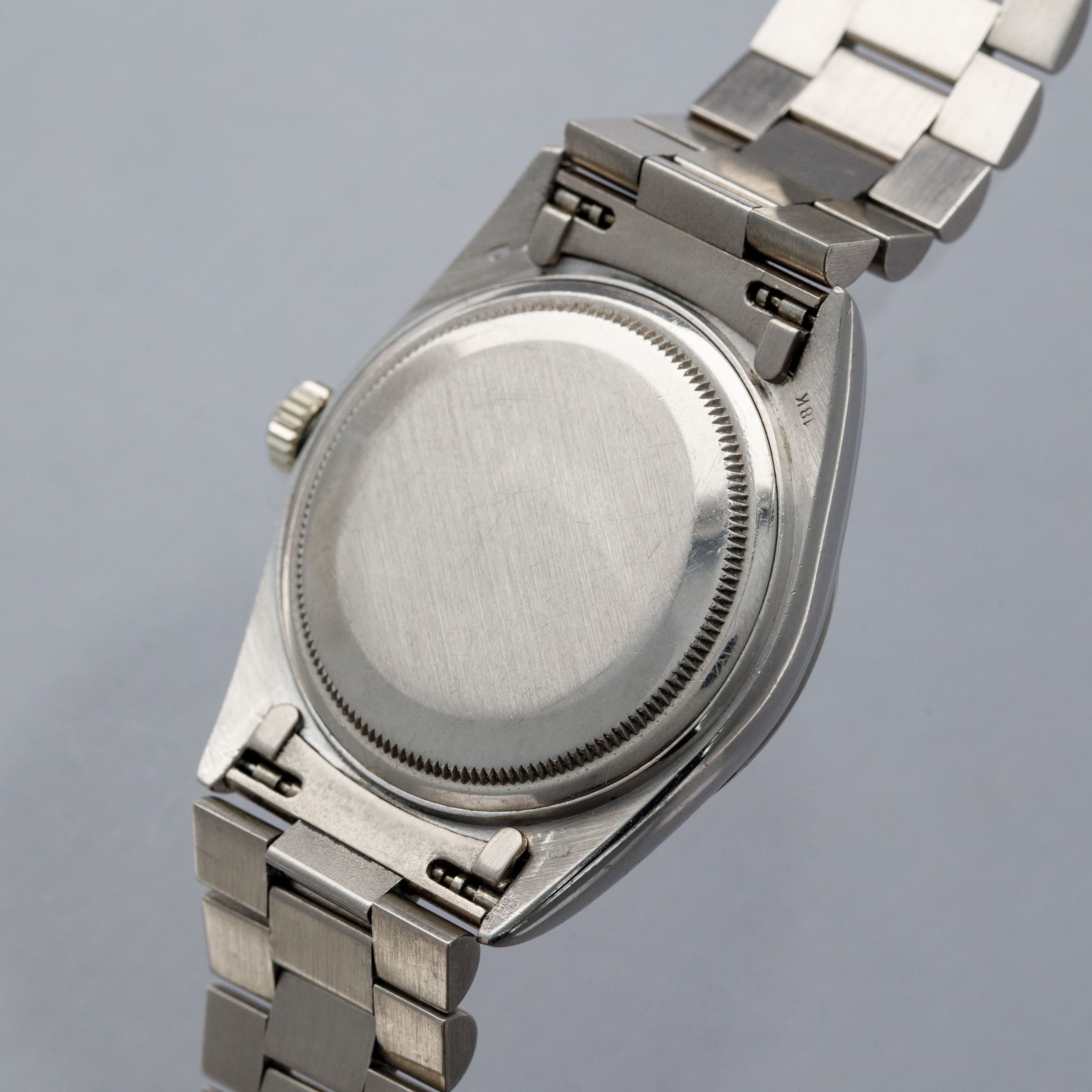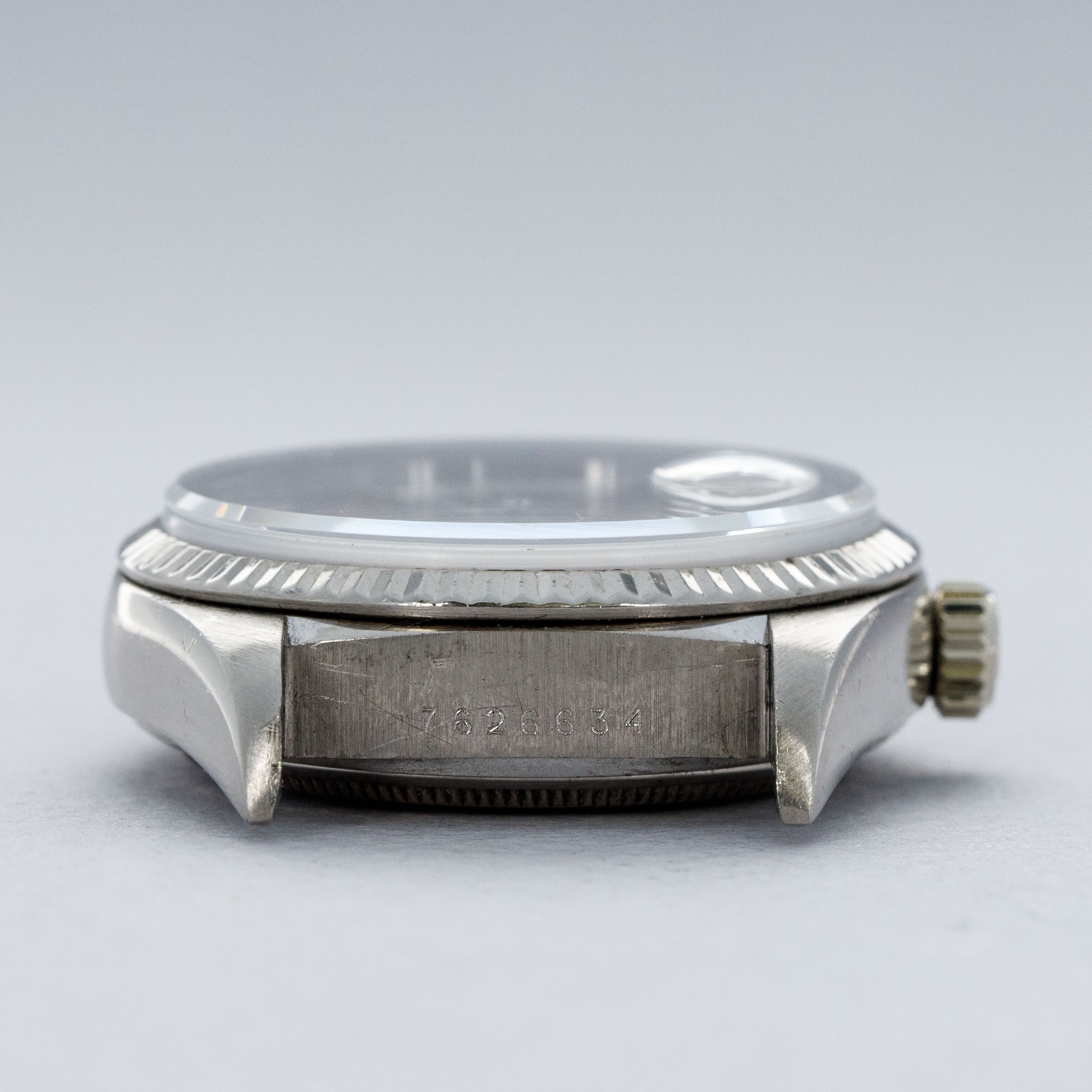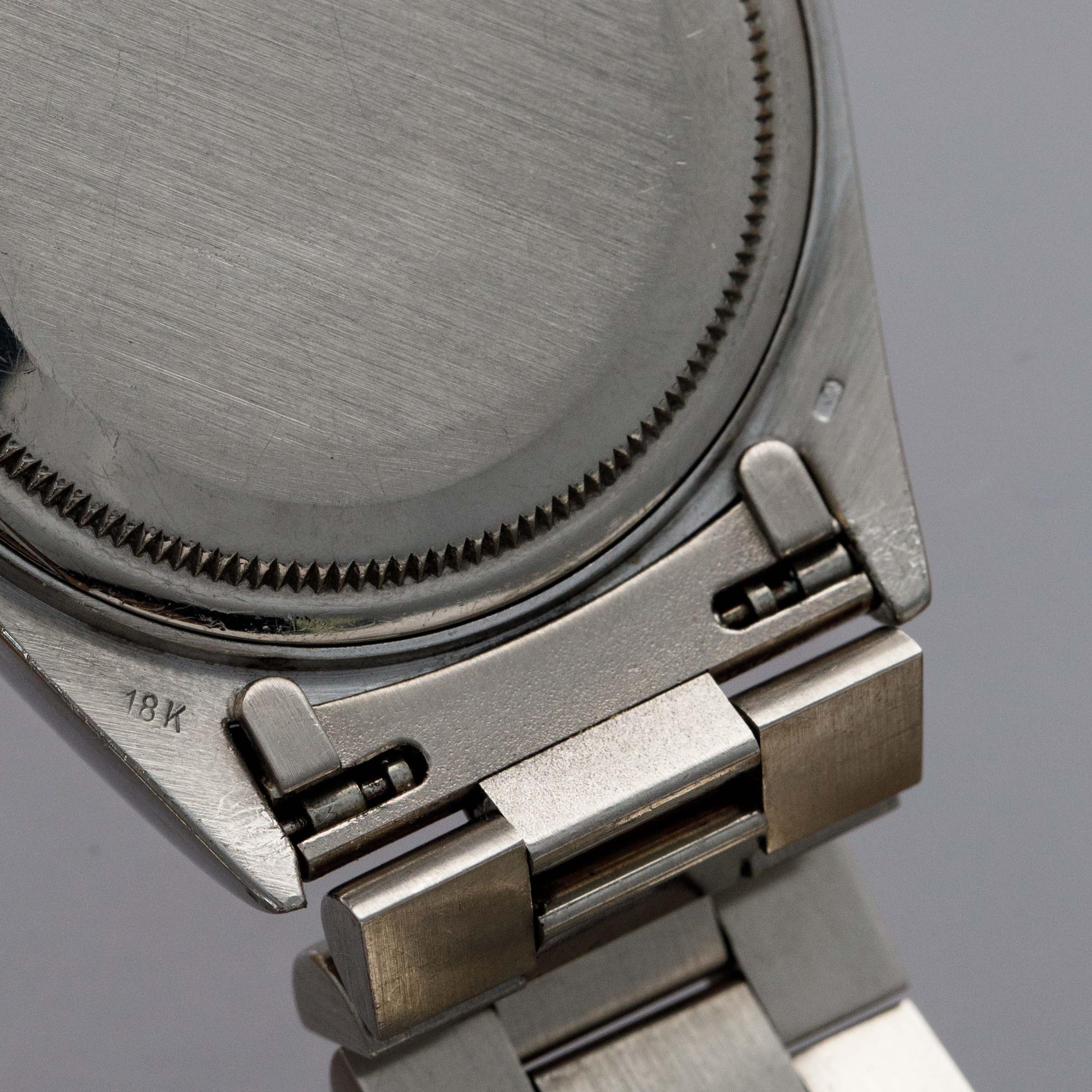 The watch is overall in very good condition. The white gold case has some scratches and light nicks, as expected of a watch of this vintage. The hallmarks on the backs of the upper lugs are well defined, while the lower one is slightly worn. The case back has some light scratches. The white gold fluted bezel shows wear in places and has light scratches. The dial is in good overall condition. The edges have started to peel in areas, and there are areas near the indexes and pinions where delamination and light cracking can be seen between the wood veneer and lacquer. The white gold hands are reasonably clean. The concealed-clasp President bracelet has moderate play between the links. The bracelet currently fits a 7" wrist and has 19 links, 2 of which are removable. Comes with inner and outer boxes, punched papers, document holder, and cleaning cloth.