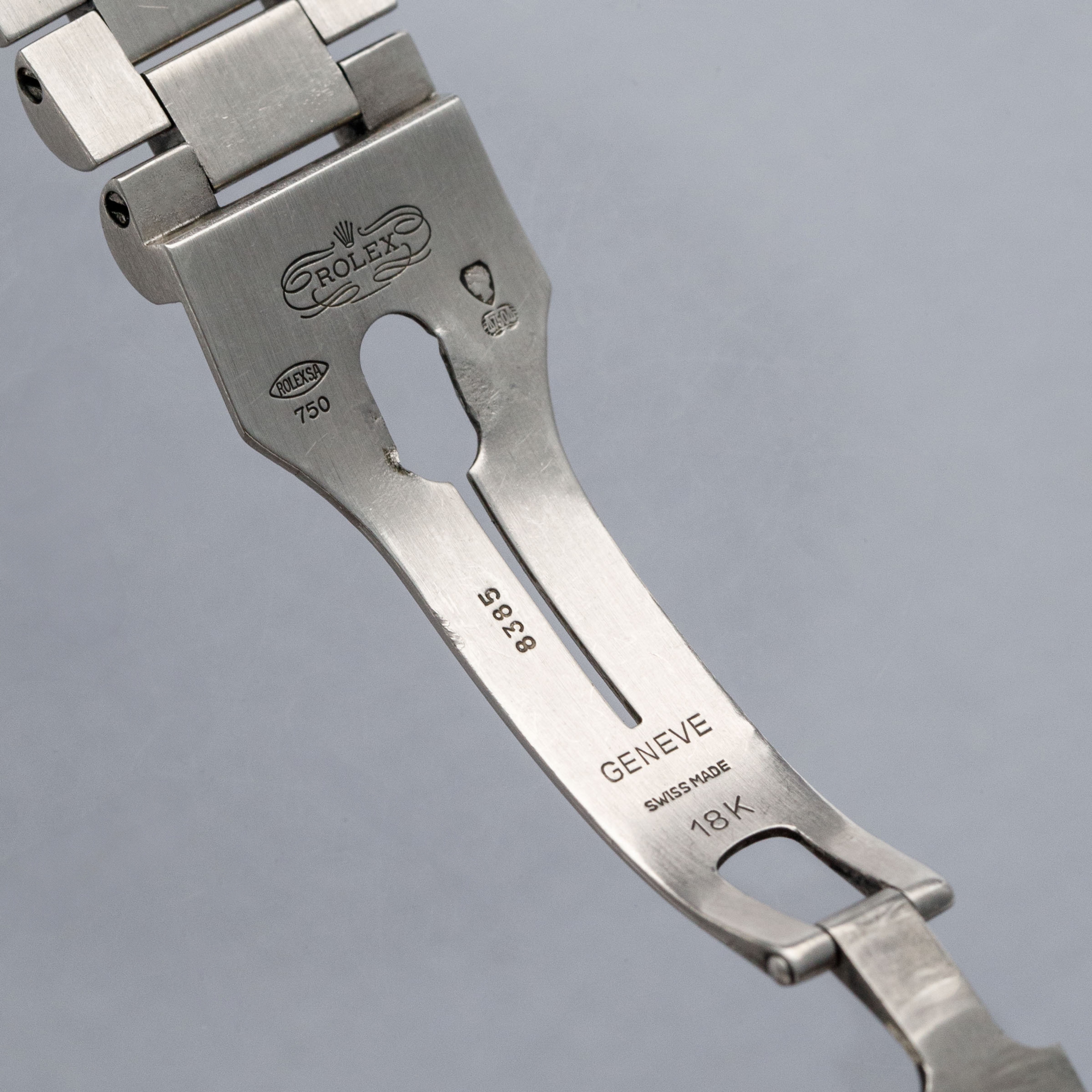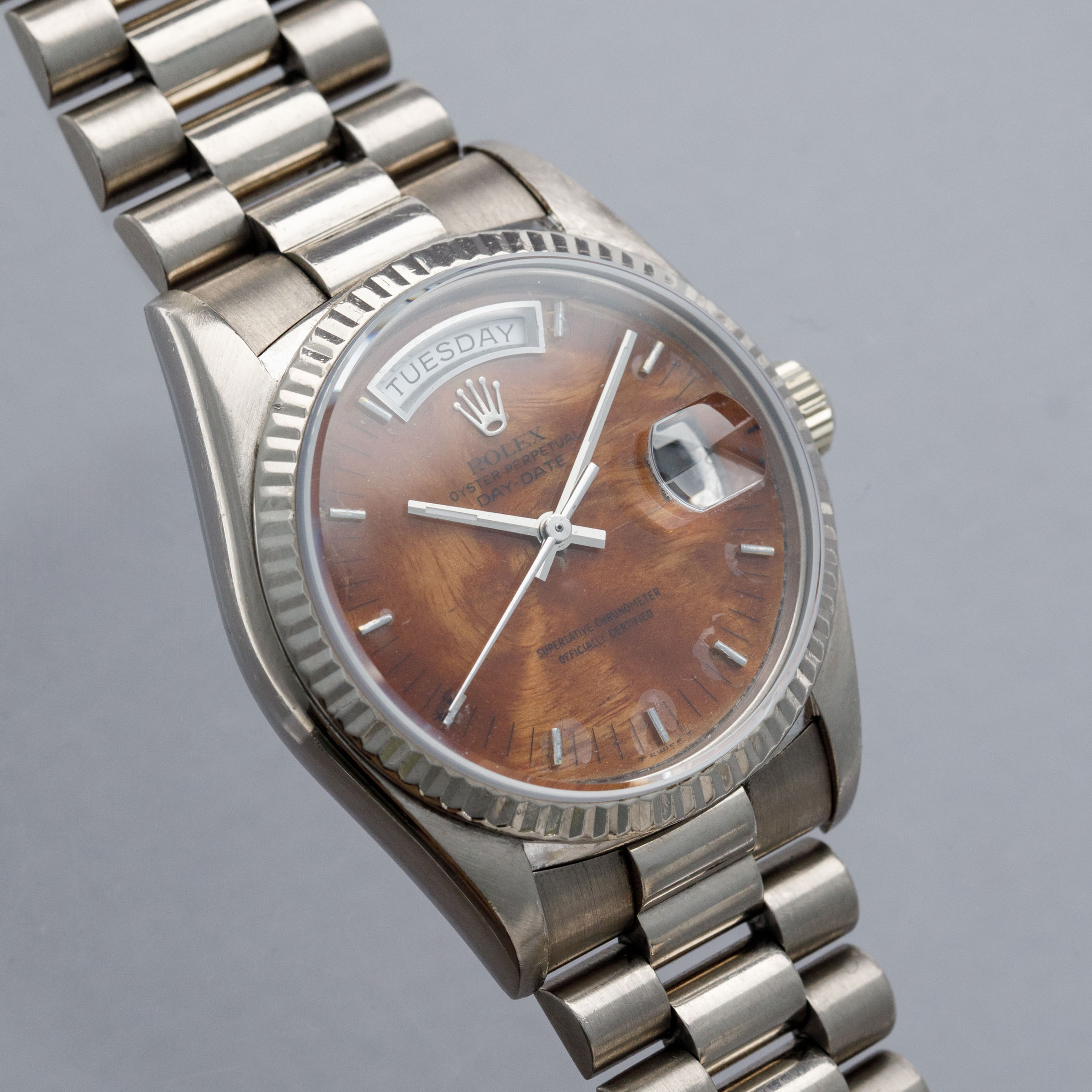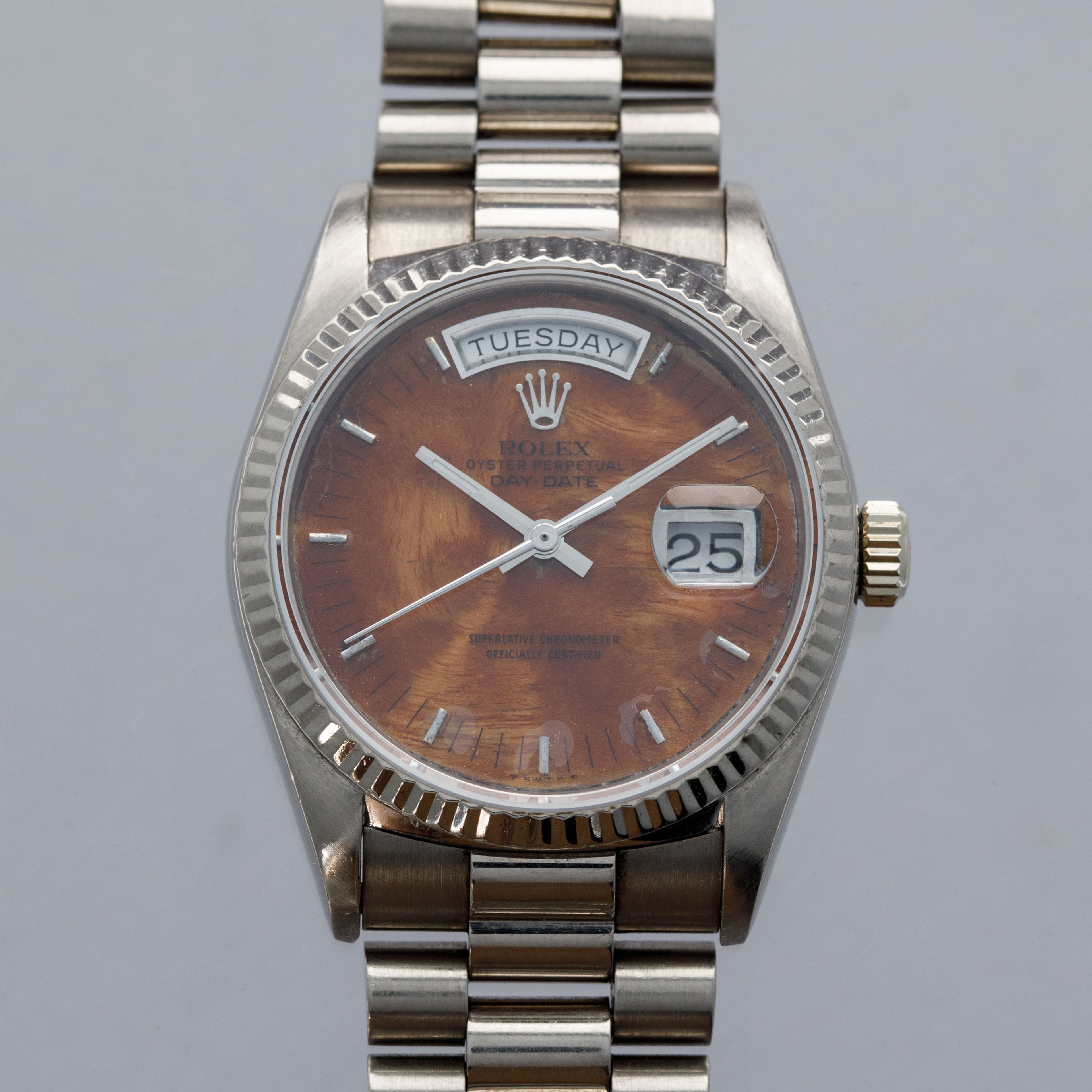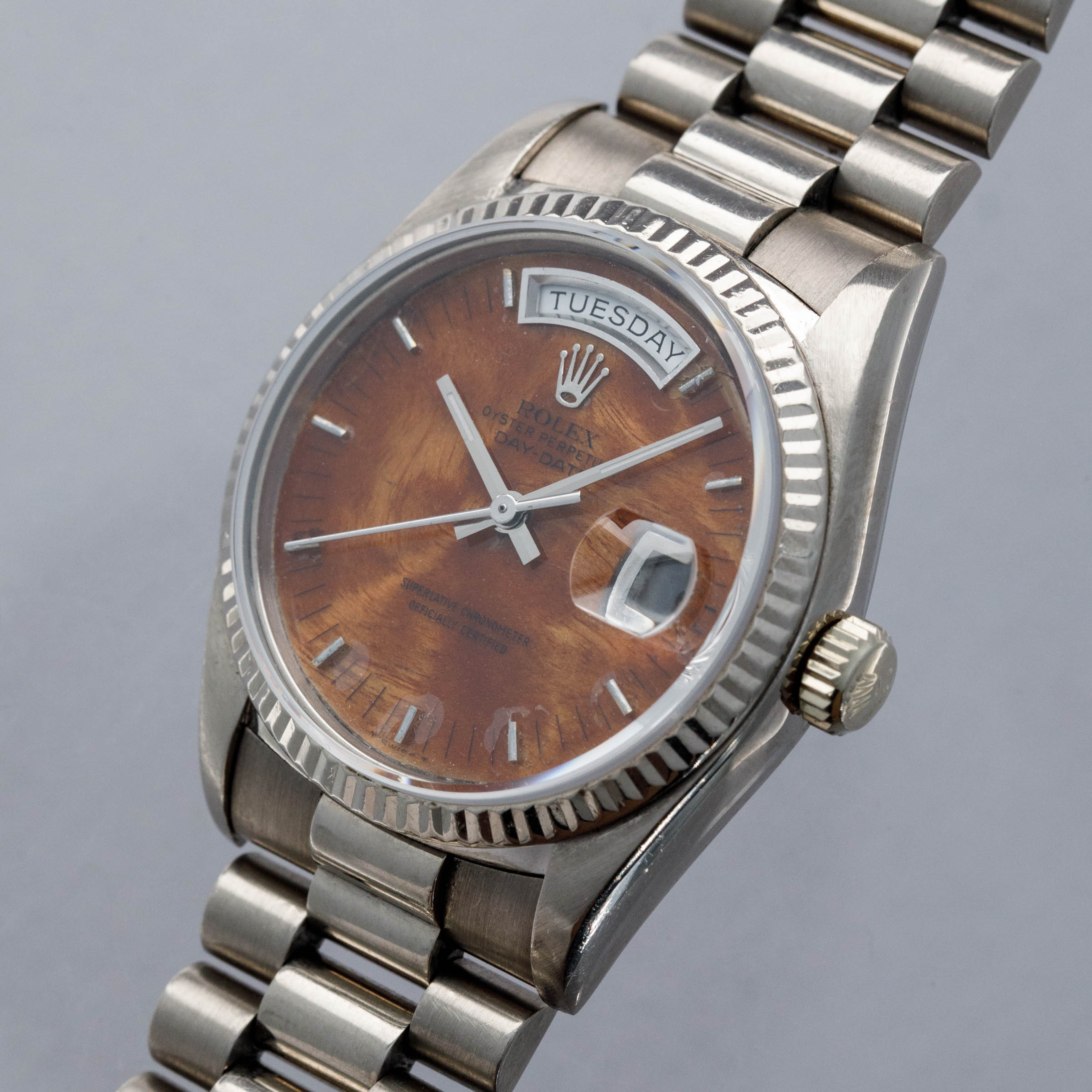 A wonderfully executed piece of Rolex design, this example's birchwood dial and 18kt white gold construction combine to create a luxurious aesthetic that speaks to Rolex's exclusivity and exuberance.