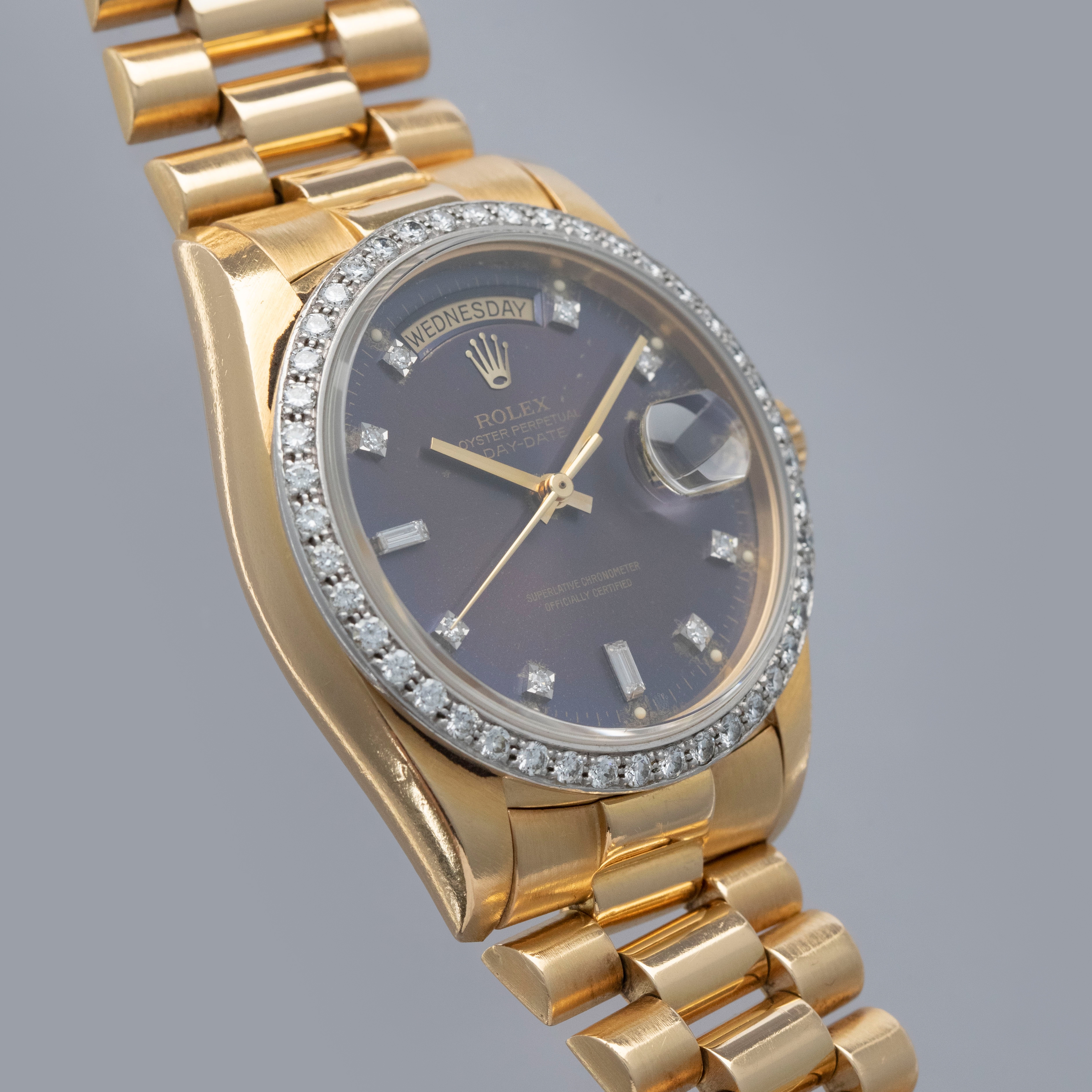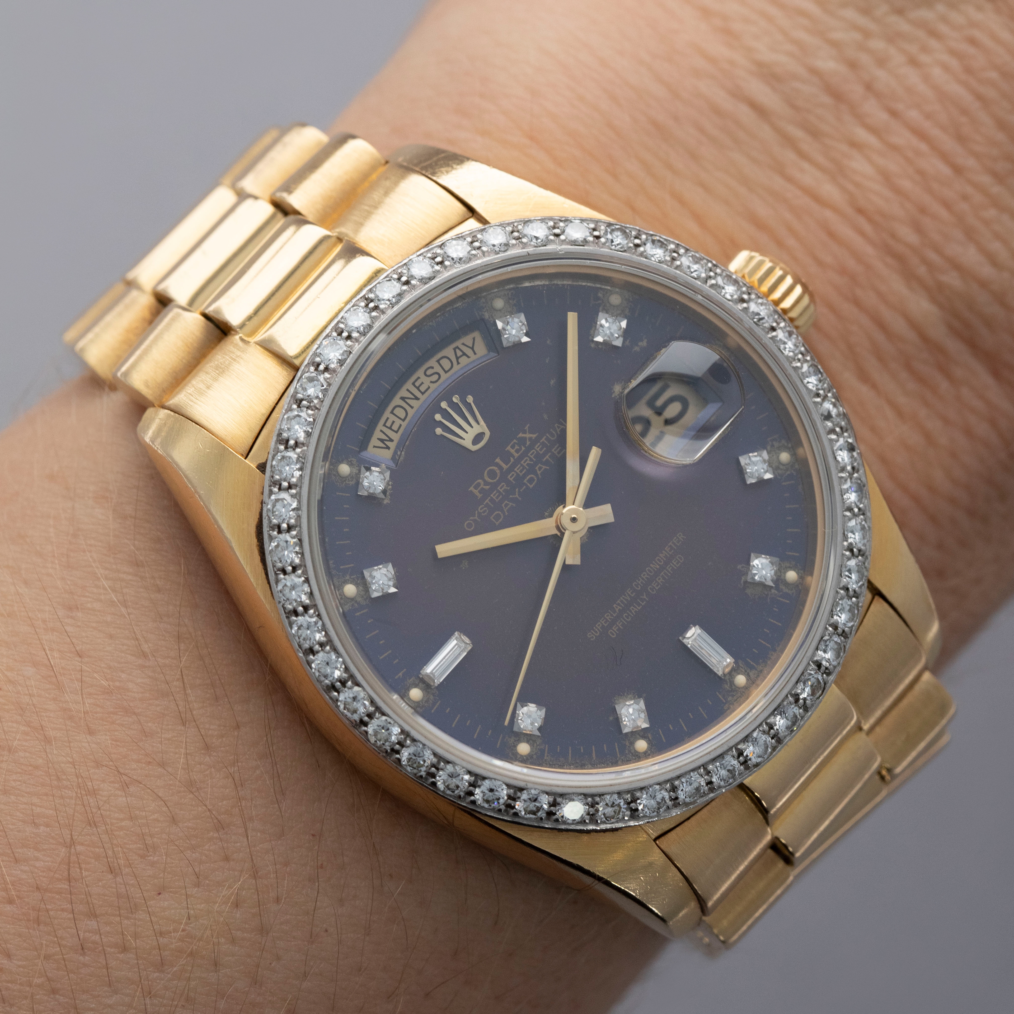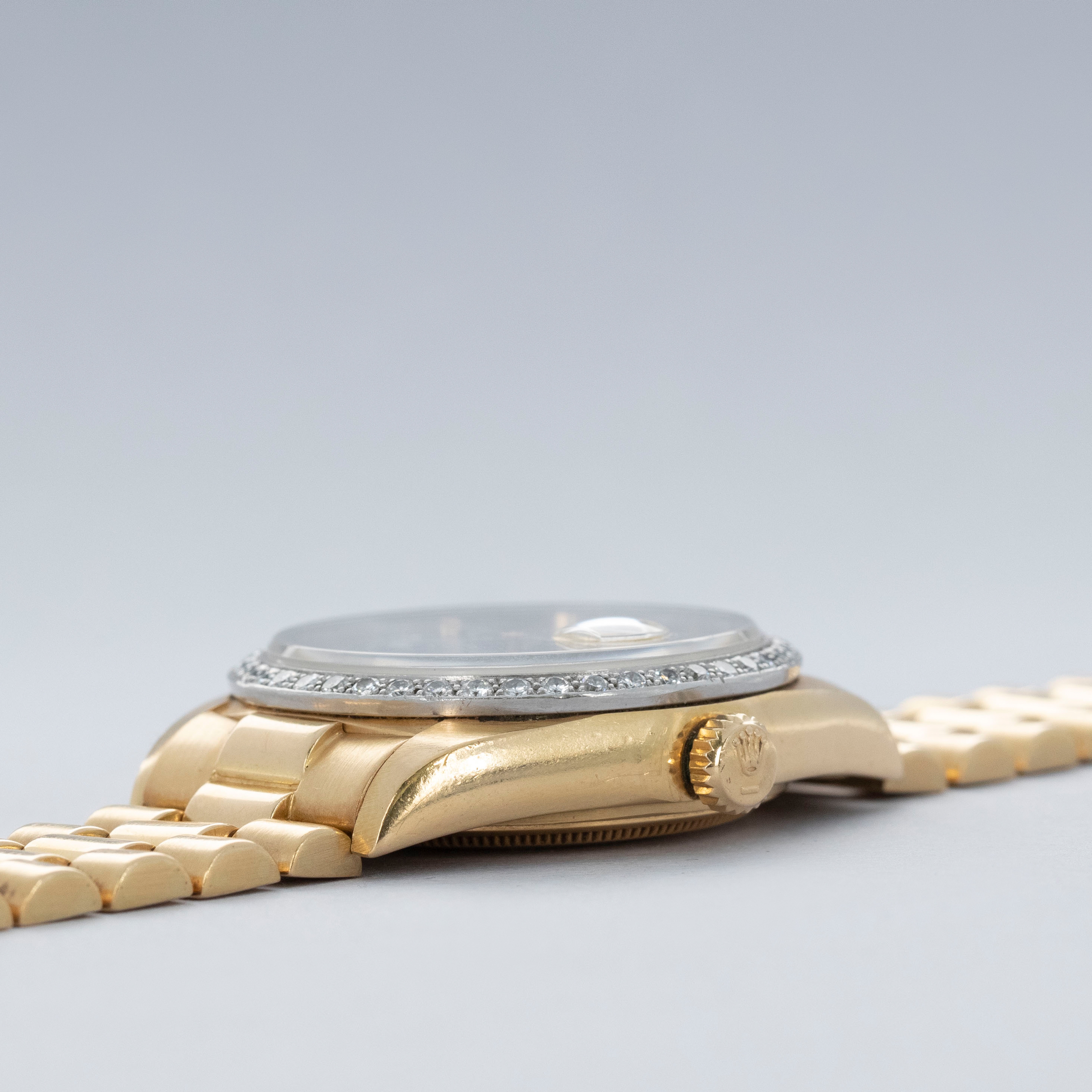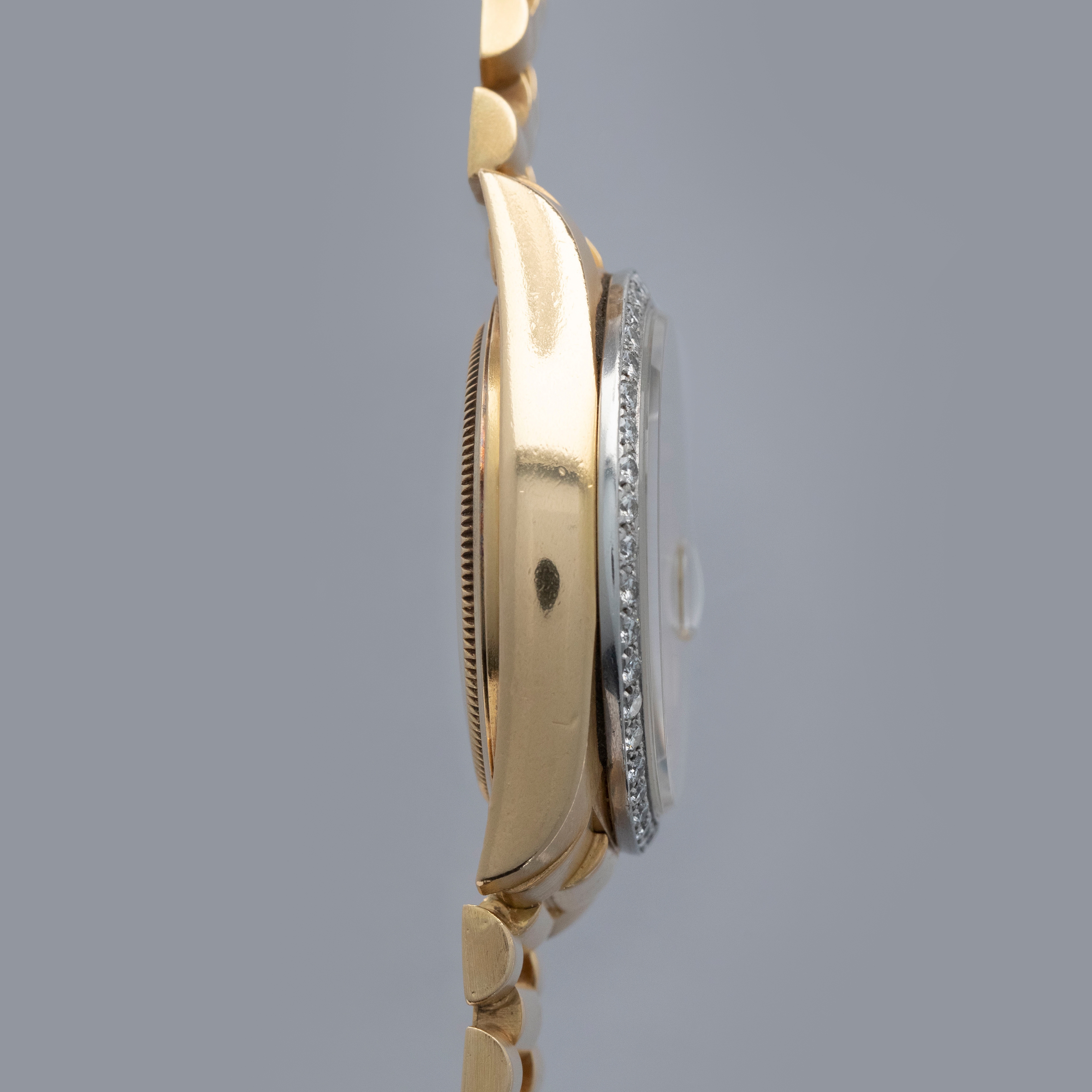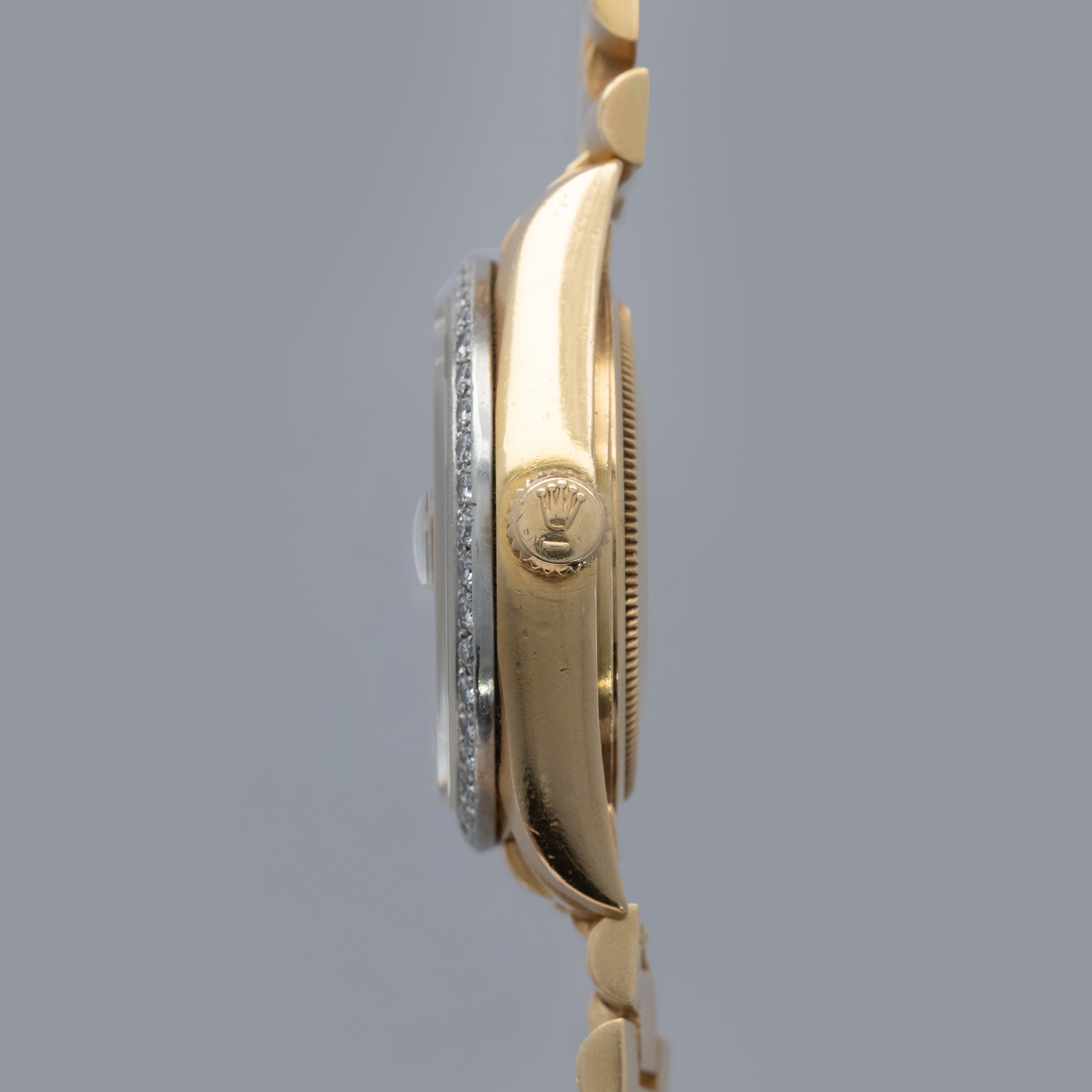 Watch is in overall very good condition. The yellow gold case shows surface scratches and light nicks, while the hallmarks and stamps on the backs of the lugs remain legible. The white gold bezel shows nicks and scratches, though the diamond settings remain secure and the stones are in excellent condition. The dial shows surface marks and some degradation around the diamond-set hour markers and lume plots, while the no-lume hands show some discoloration but remain clean. Crystal has some light scratches or marks on the surface. It is fitted with a yellow gold President bracelet showing surface scratches, with wear visible to the coronet on the concealed clasp and moderate play between the links. The bracelet is fitted with 23 links, 6 of which are removable, and fits approximately a 7¾” wrist. weight: 137.4g