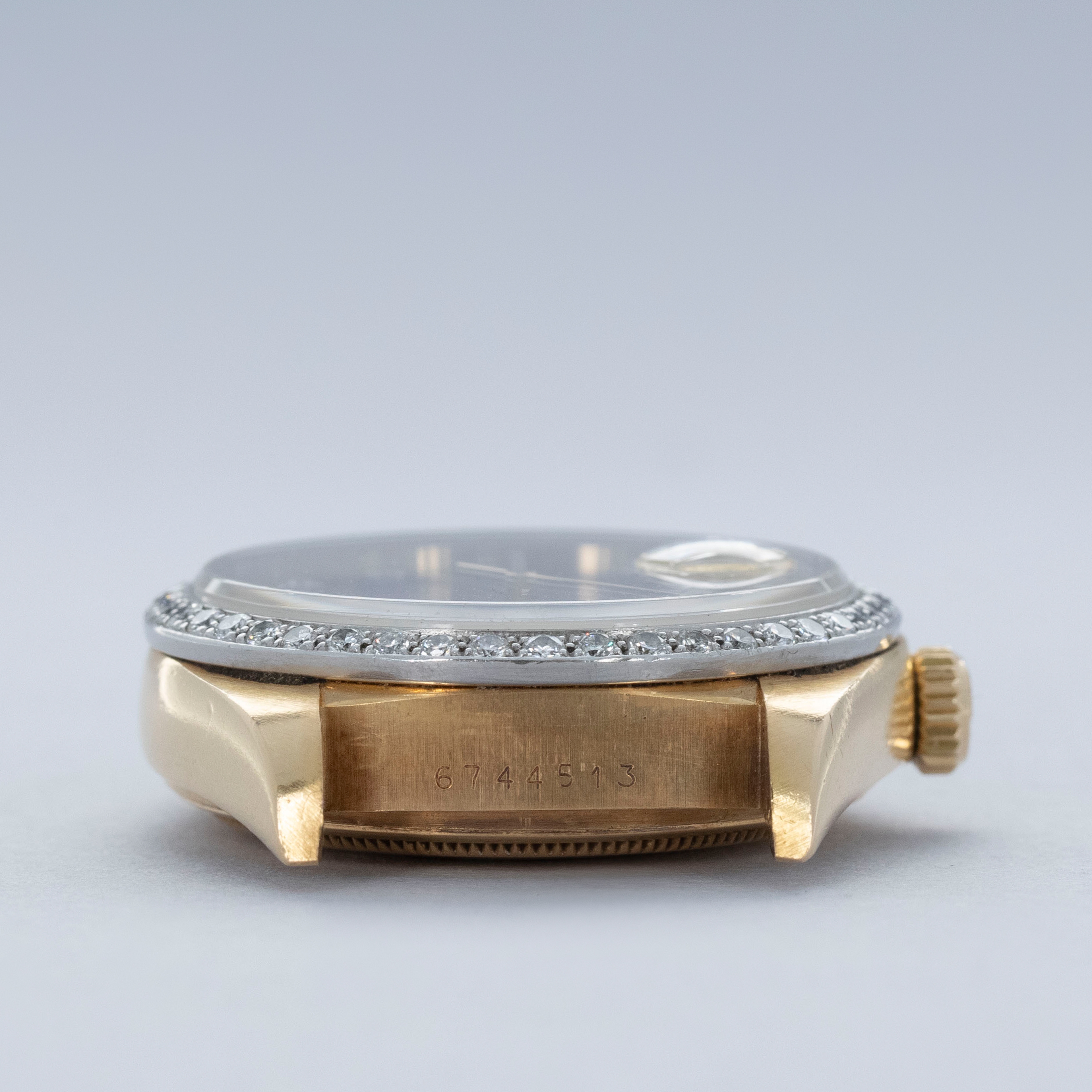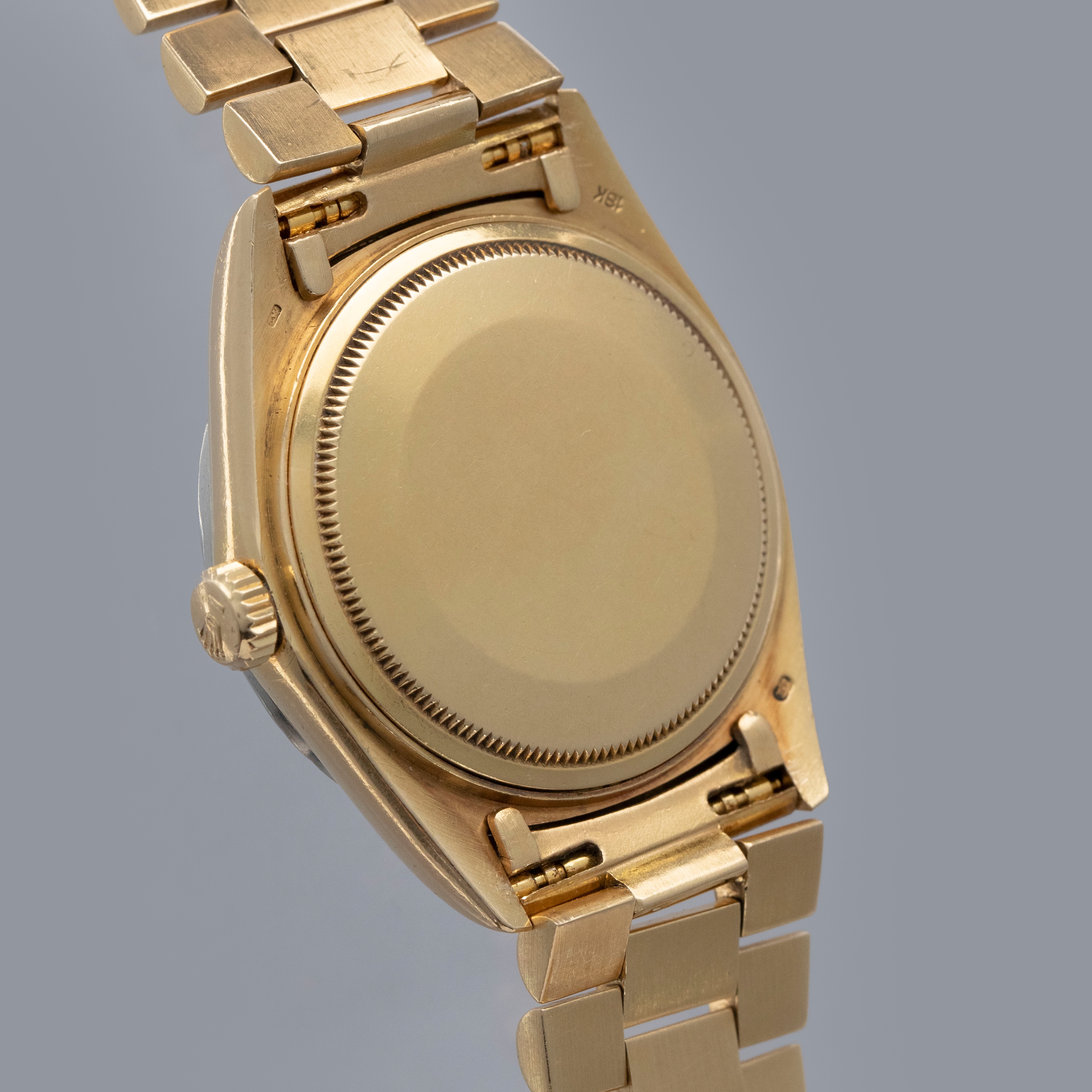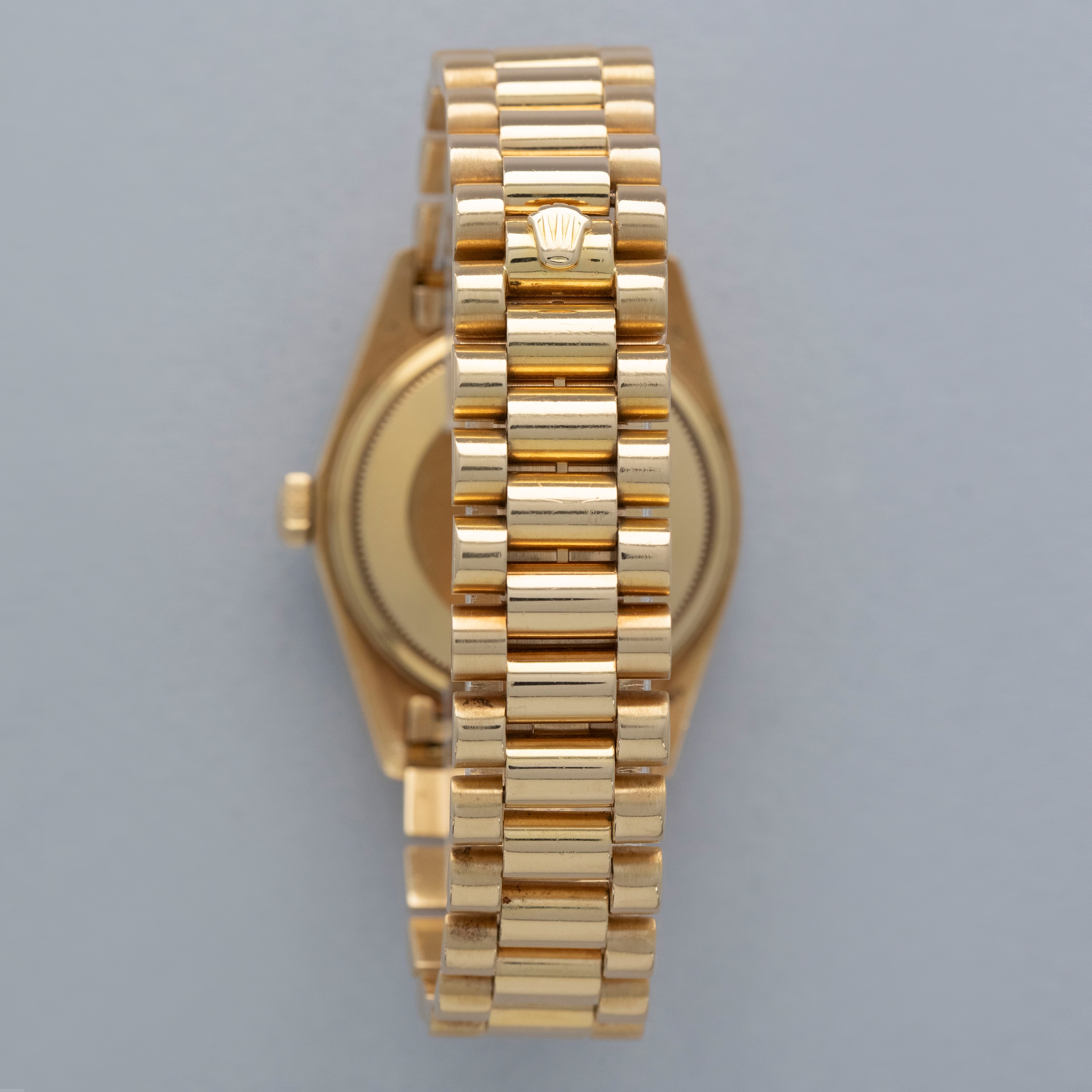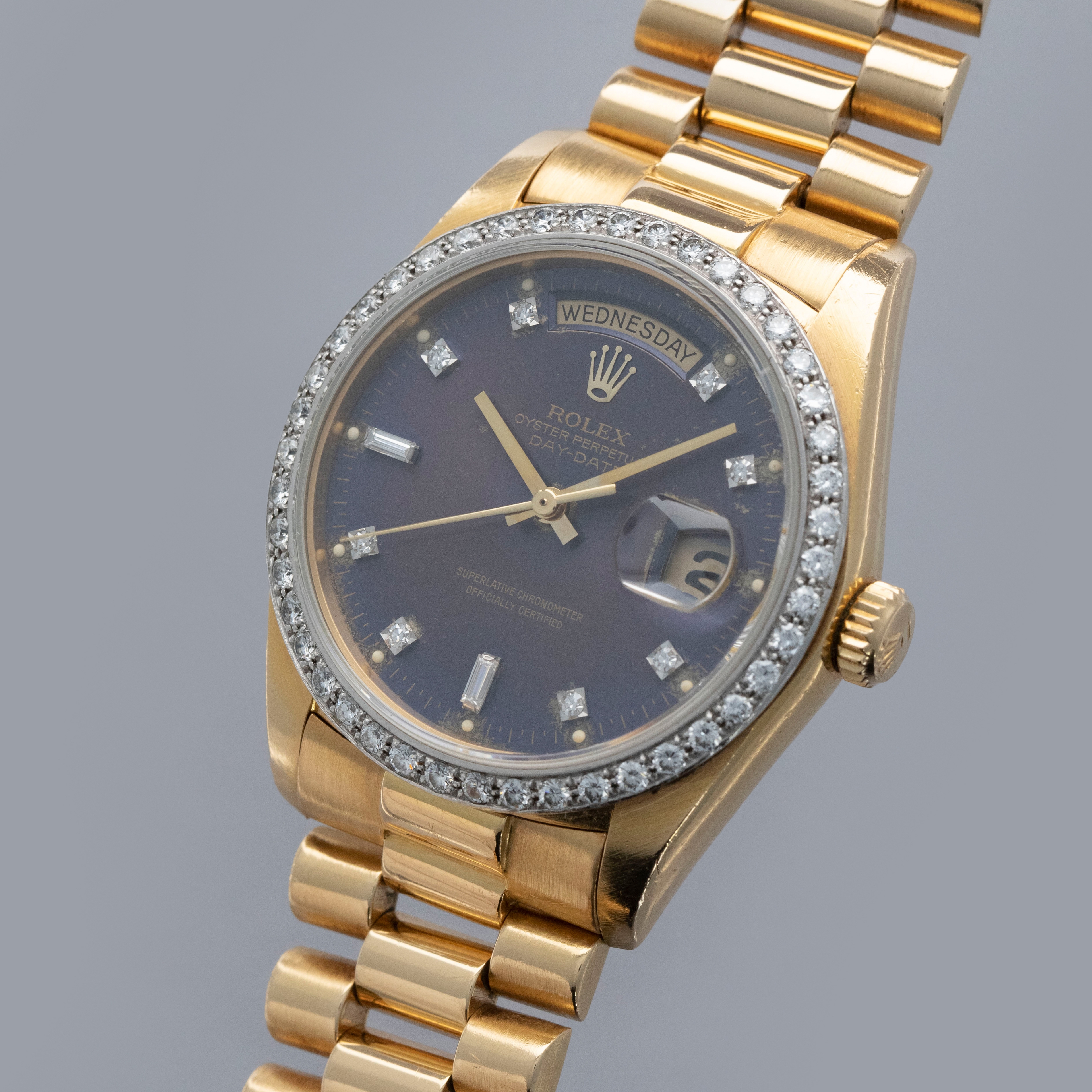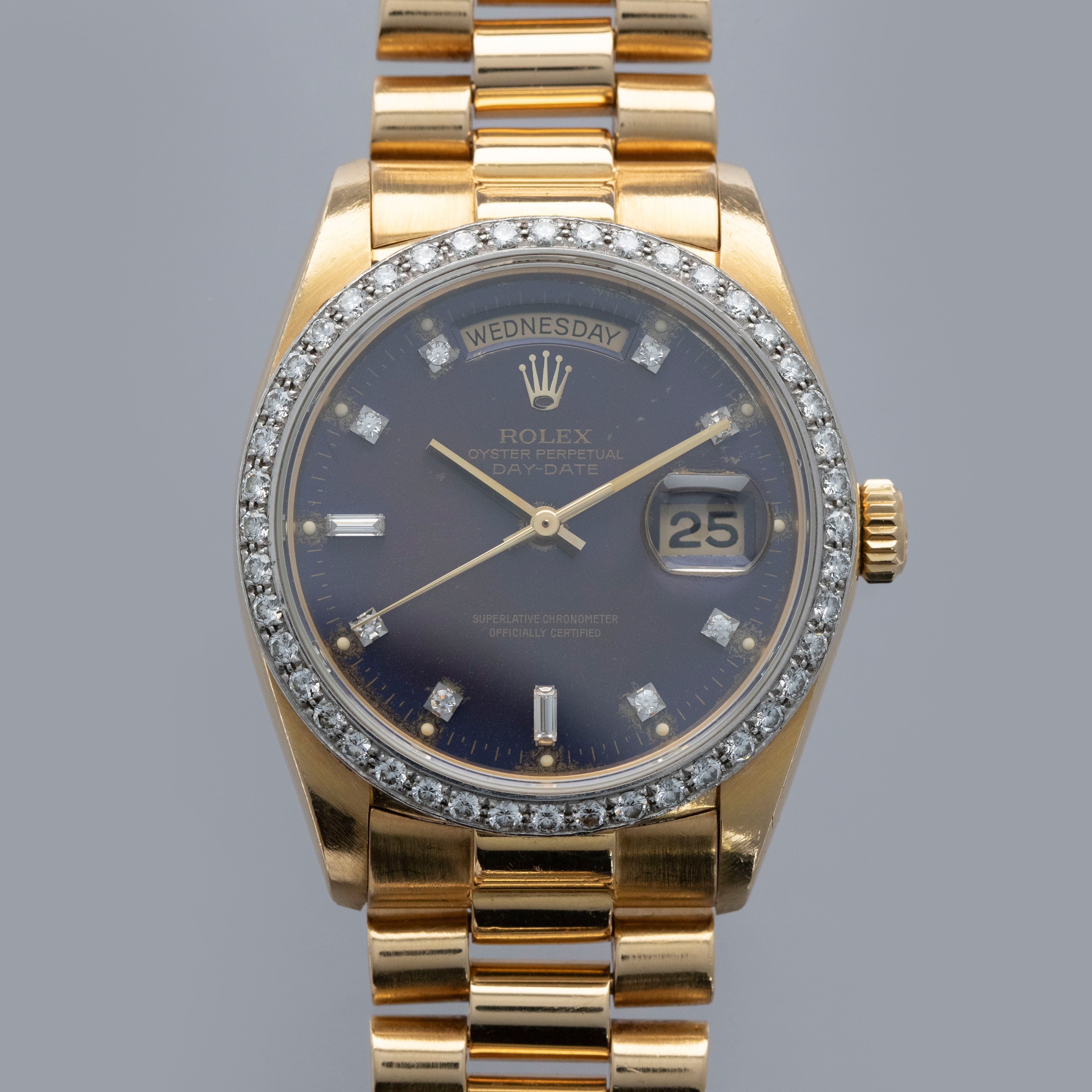 Watch is in overall very good condition. The yellow gold case shows surface scratches and light nicks, while the hallmarks and stamps on the backs of the lugs remain legible. The white gold bezel shows nicks and scratches, though the diamond settings remain secure and the stones are in excellent condition. The dial shows surface marks and some degradation around the diamond-set hour markers and lume plots, while the no-lume hands show some discoloration but remain clean. Crystal has some light scratches or marks on the surface. It is fitted with a yellow gold President bracelet showing surface scratches, with wear visible to the coronet on the concealed clasp and moderate play between the links. The bracelet is fitted with 23 links, 6 of which are removable, and fits approximately a 7¾” wrist. weight: 137.4g