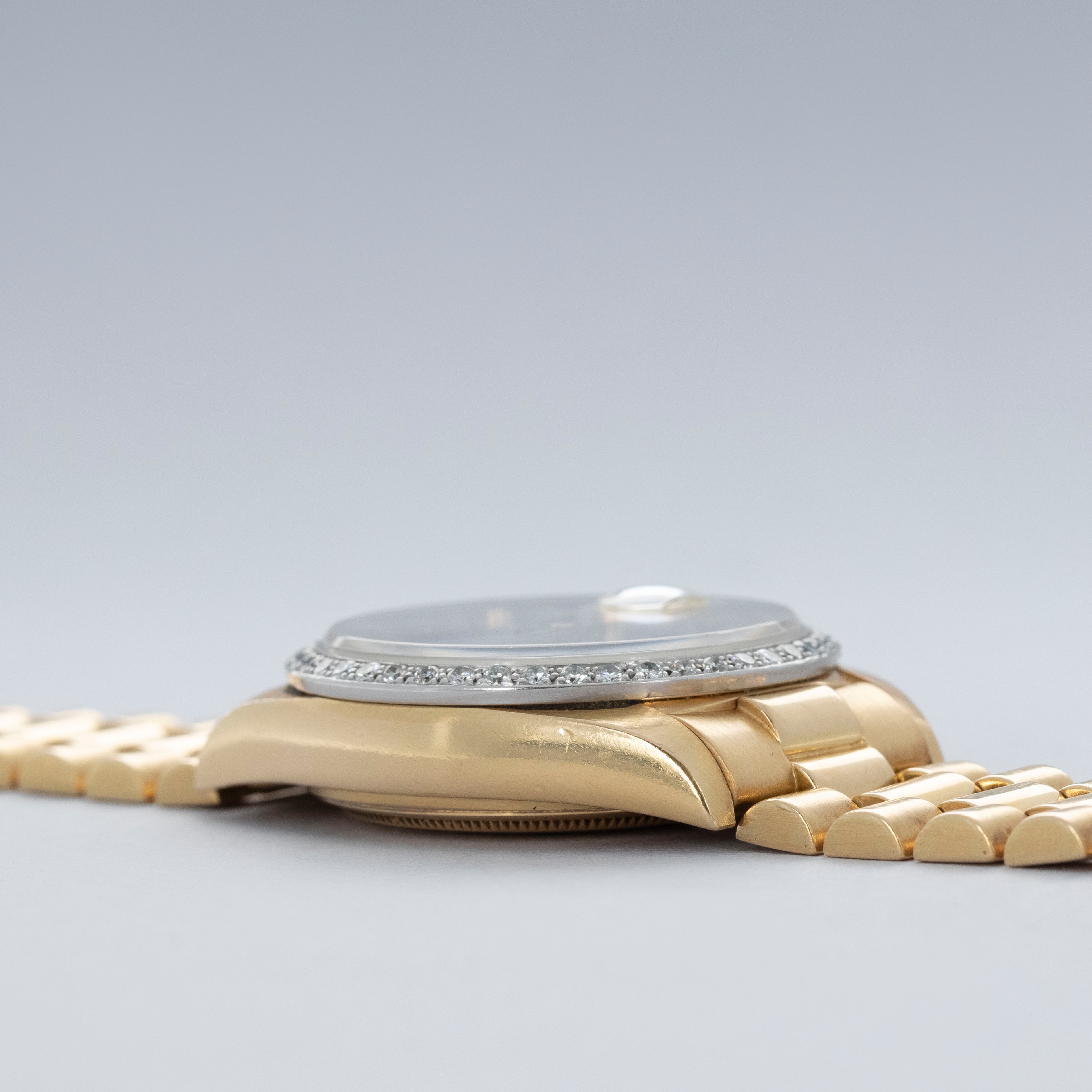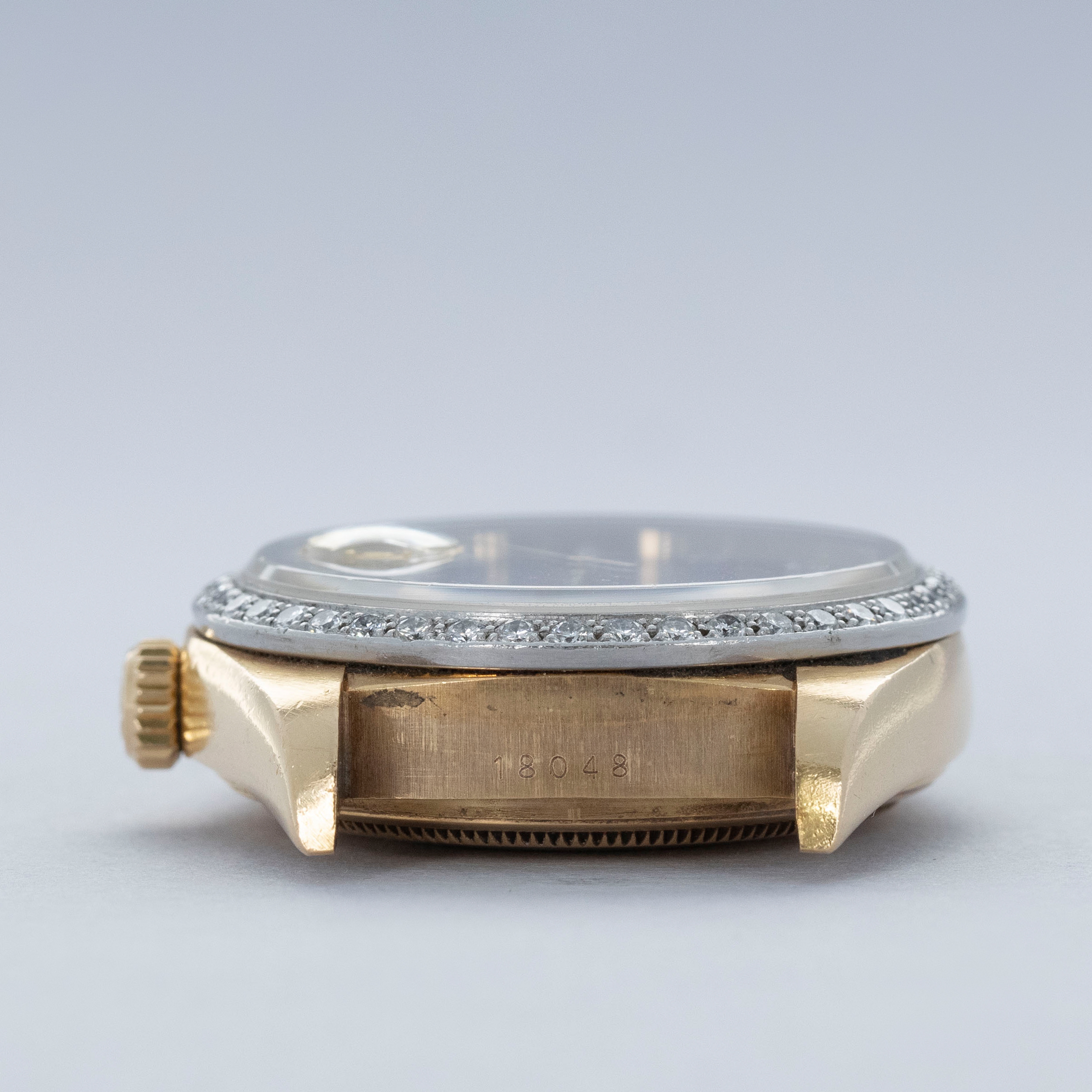 Offered as a specific sub-reference of the 180XX generation of Day-Date, the ref. 18048 boasts a diamond-set bezel straight from the factory, in place of the fluted bezel that the Day-Date usually came with.