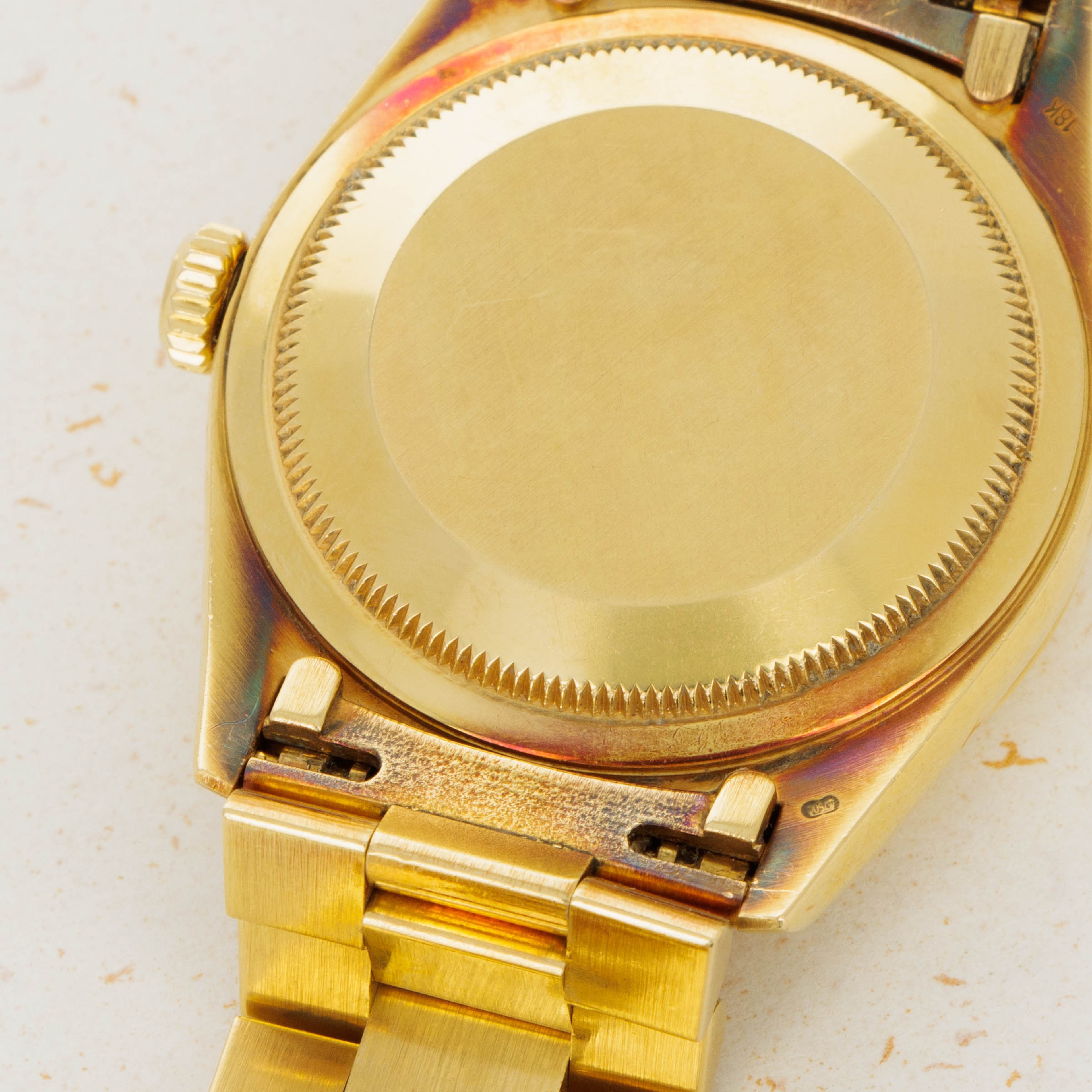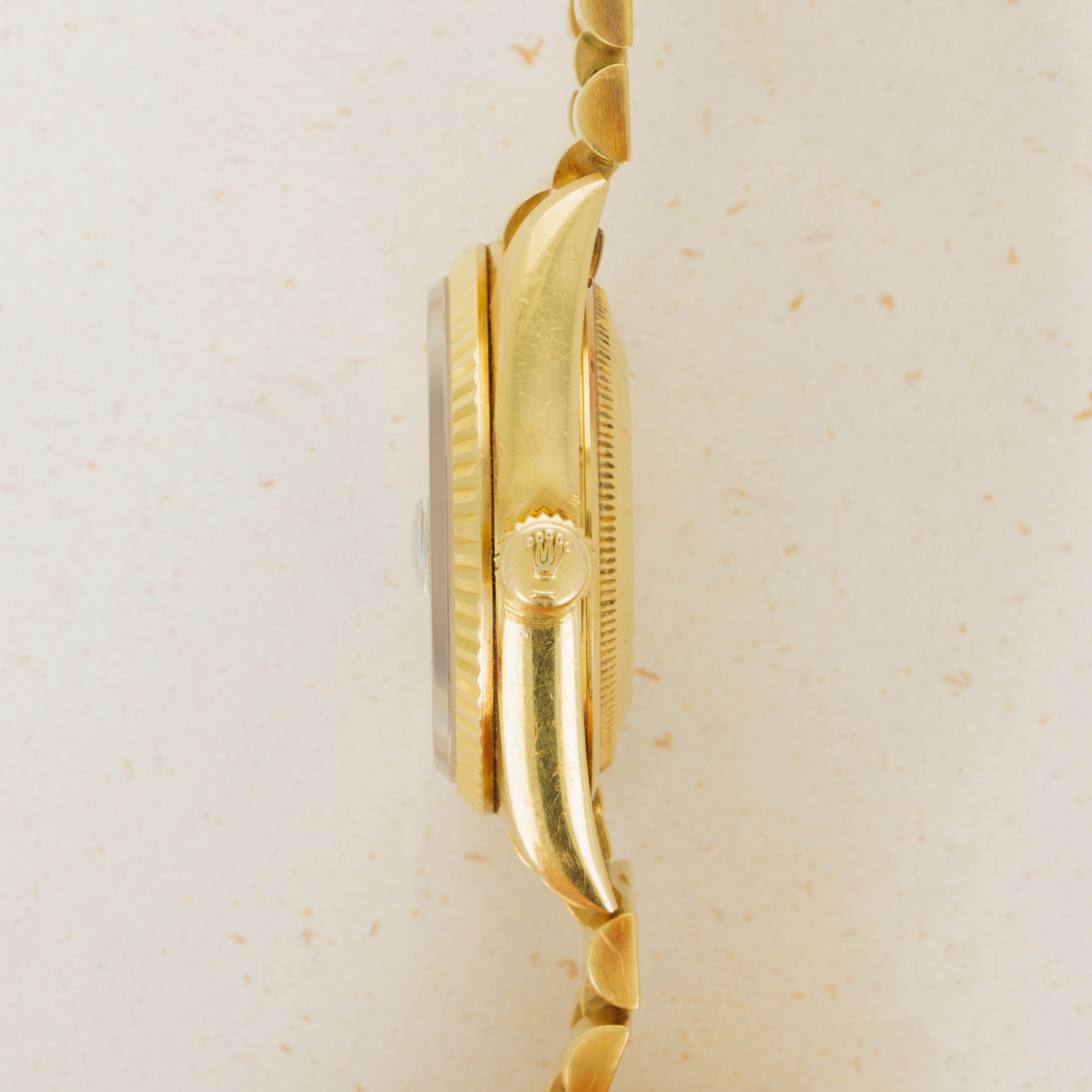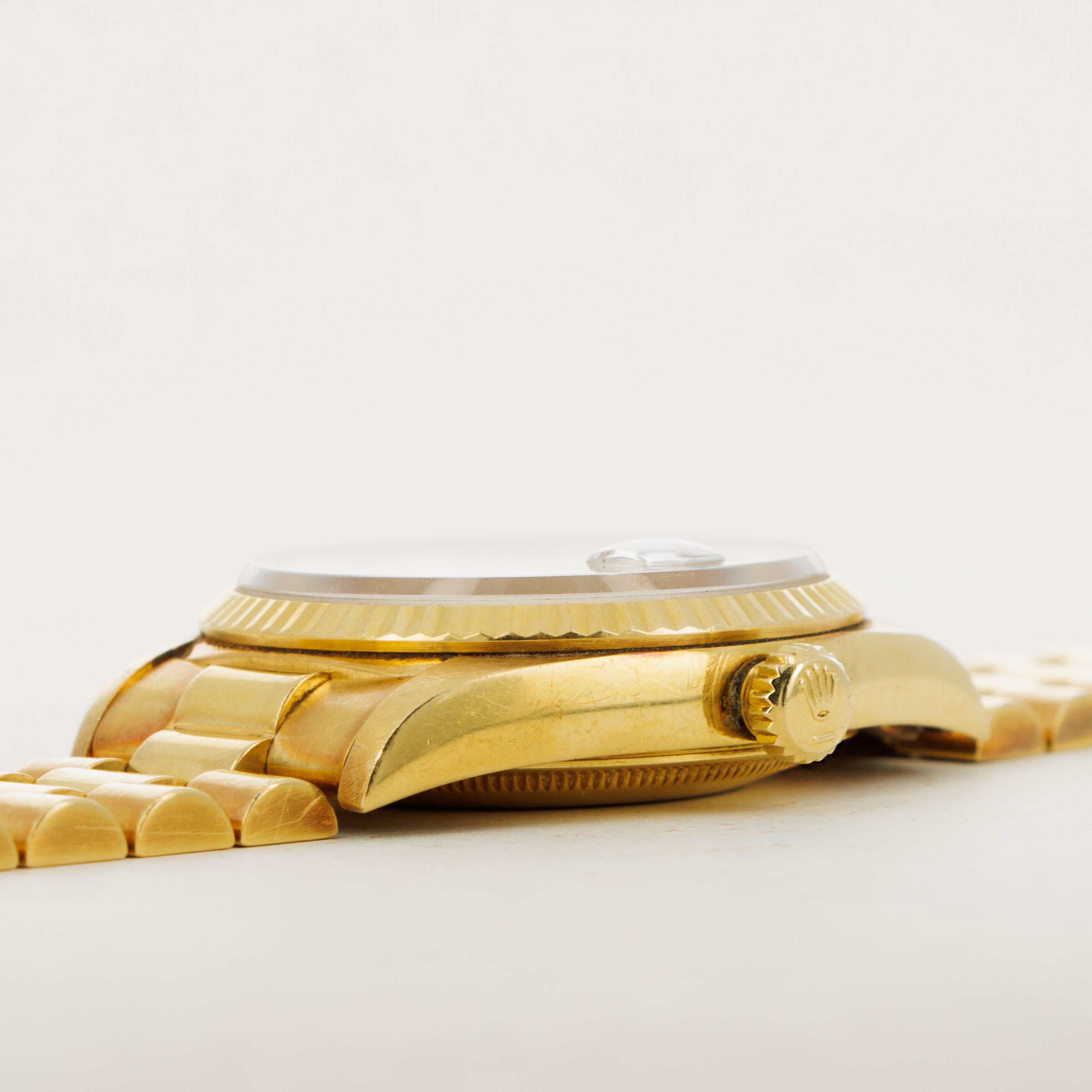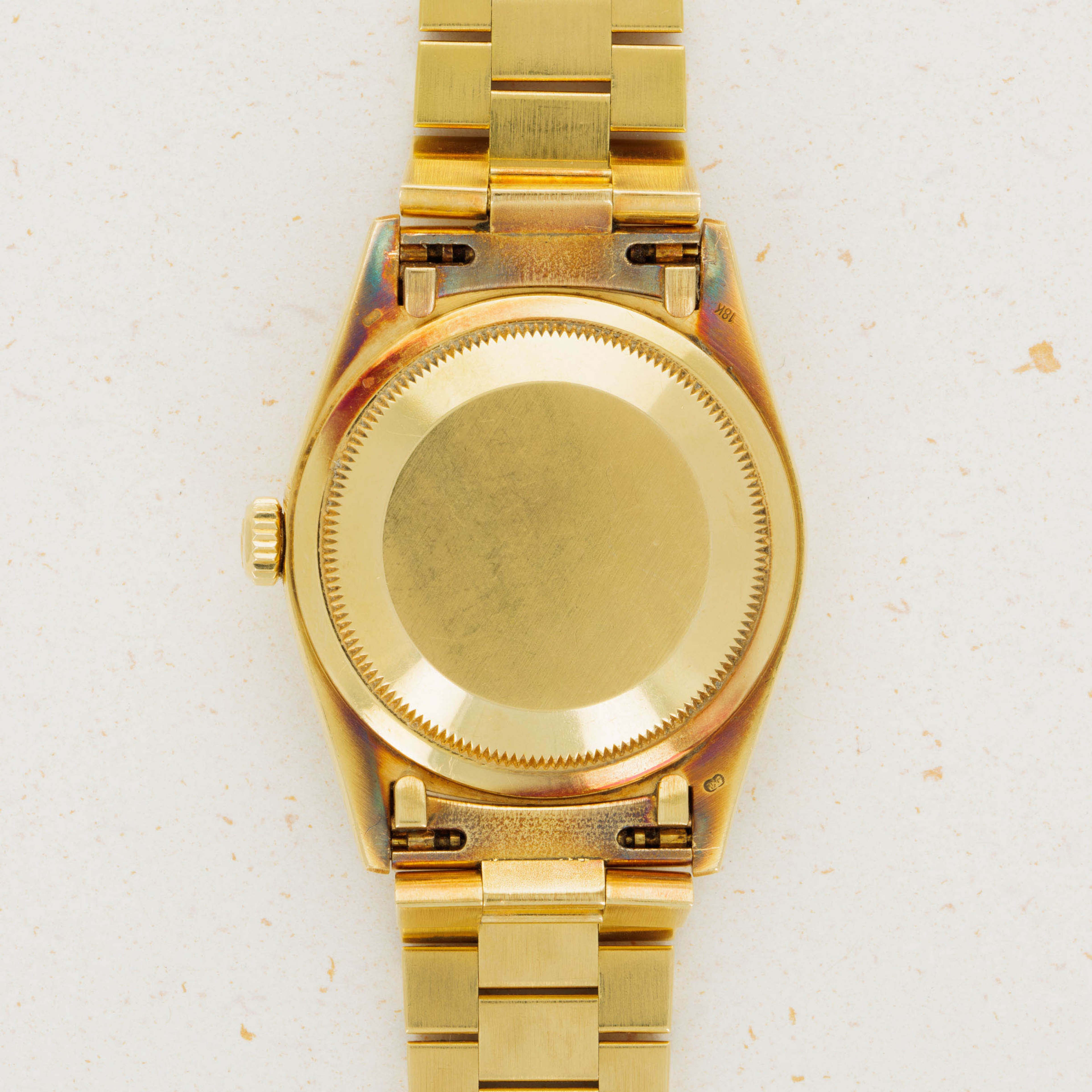 The signature hallmarks of Rolex's luxurious design, this ref. 18238 features a fluted 18k gold bezel and presidential bracelet, which combine to ensure the Day-Date sits on the wrist with a much-deserved sense of luxury. In addition, this wonderfully preserved example's 18kt gold construction has aged to include a rich orange patina that is just beautiful.