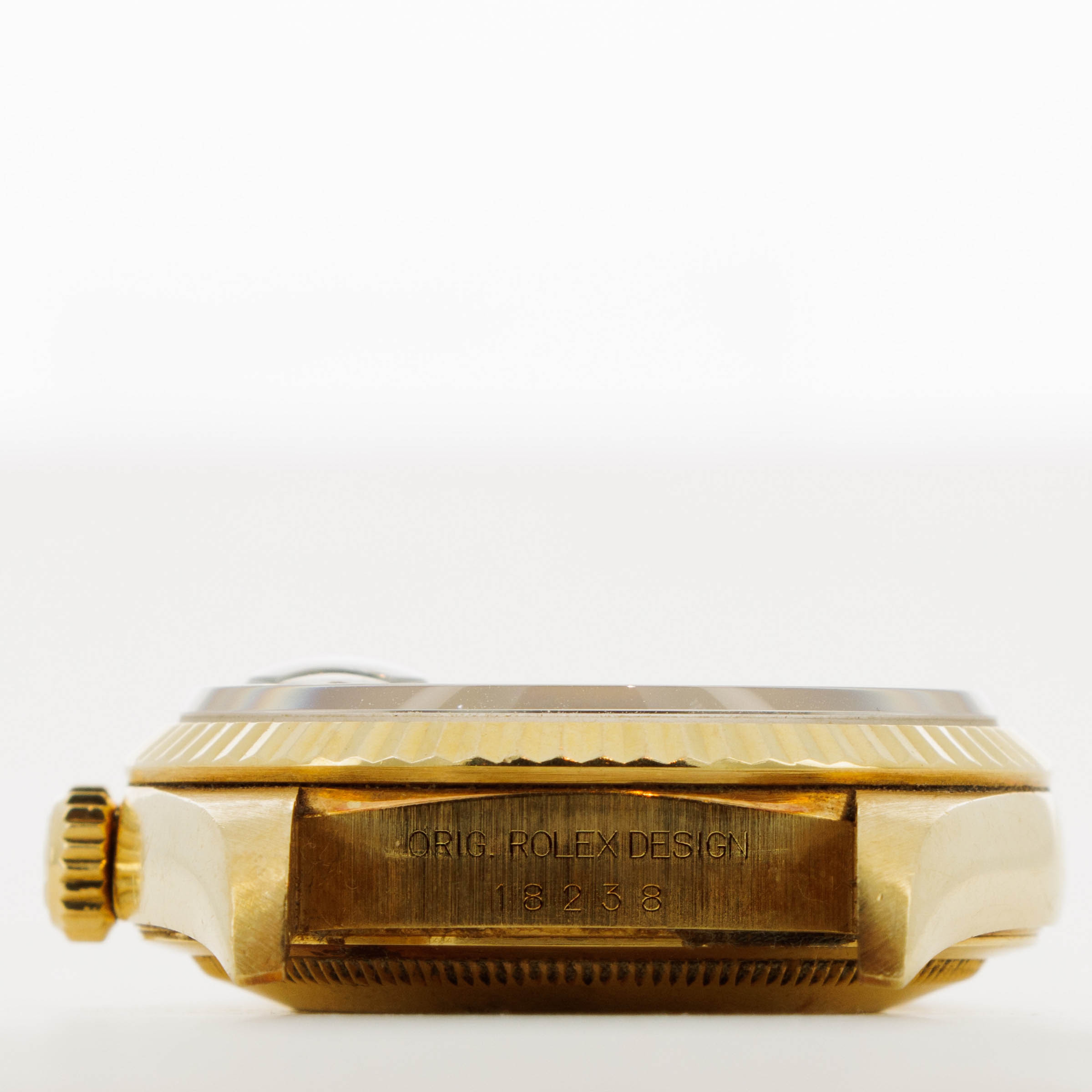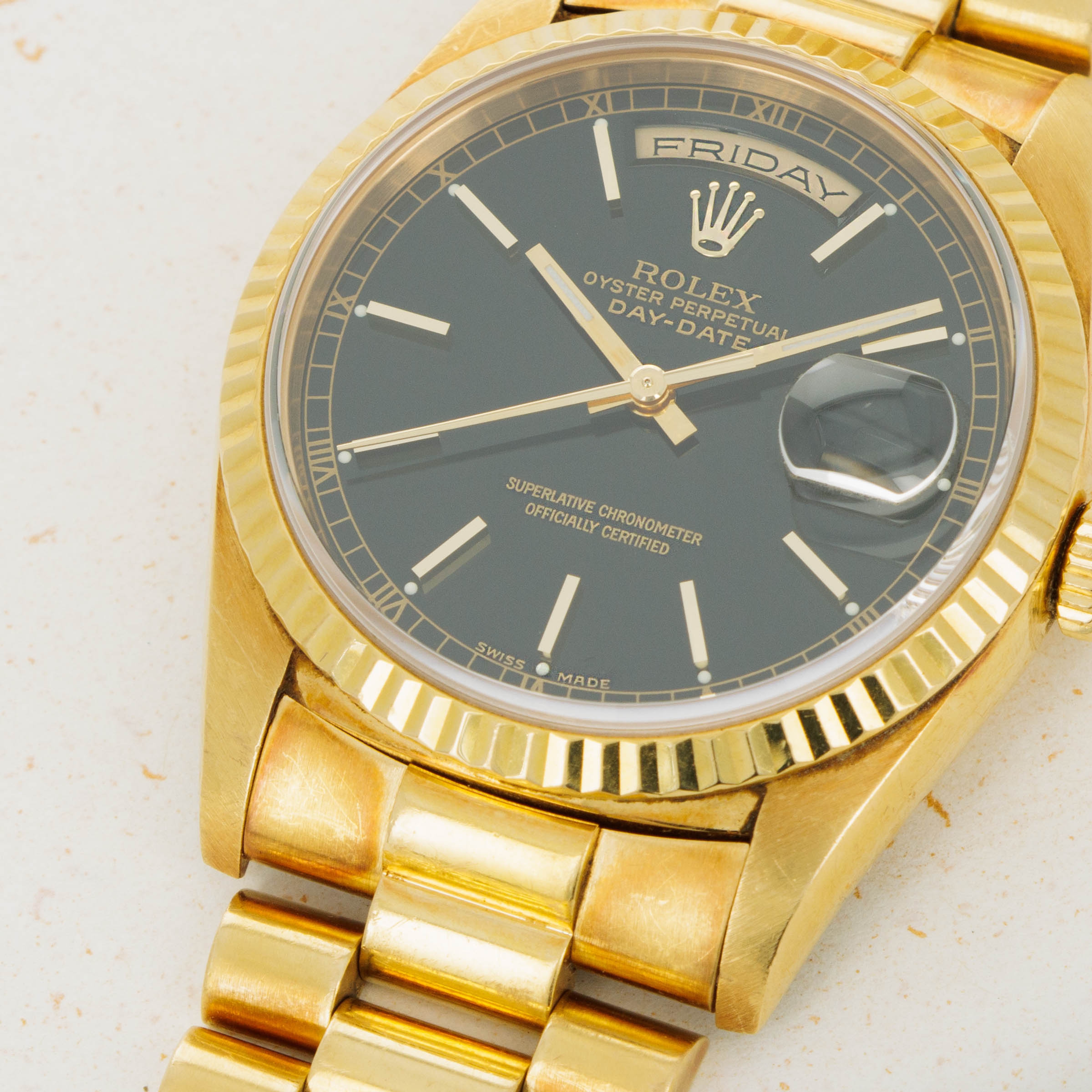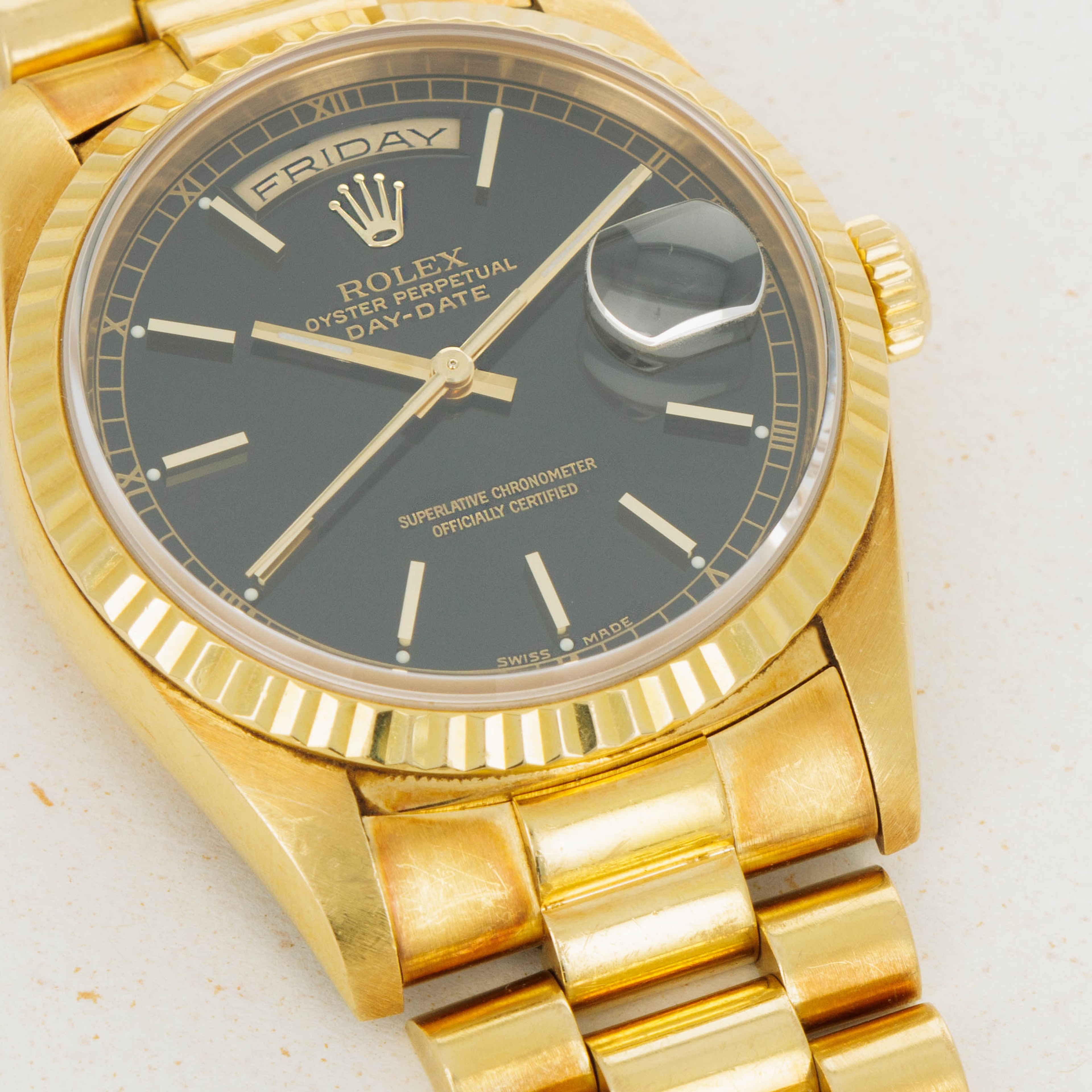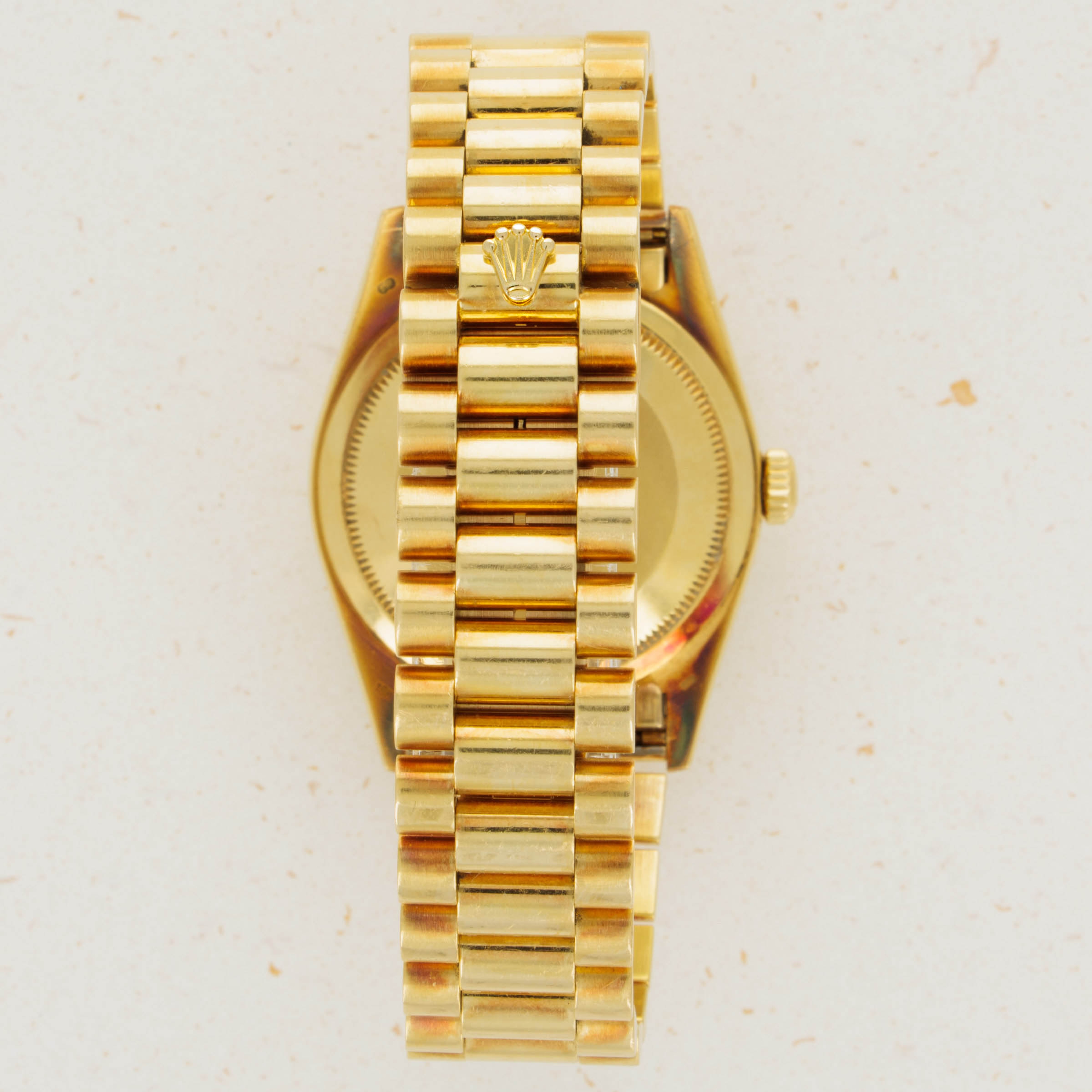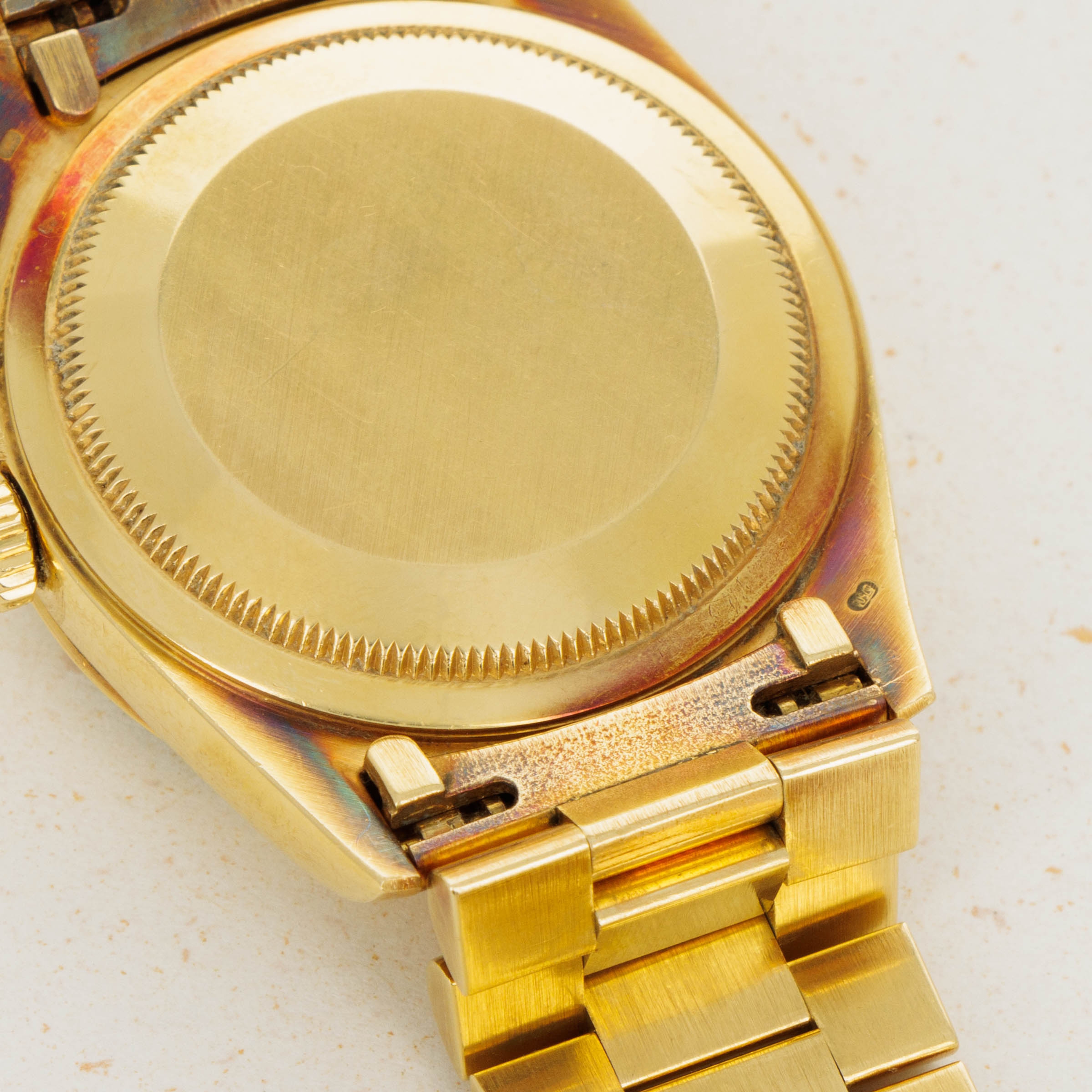 The signature hallmarks of Rolex's luxurious design, this ref. 18238 features a fluted 18k gold bezel and presidential bracelet, which combine to ensure the Day-Date sits on the wrist with a much-deserved sense of luxury. In addition, this wonderfully preserved example's 18kt gold construction has aged to include a rich orange patina that is just beautiful.