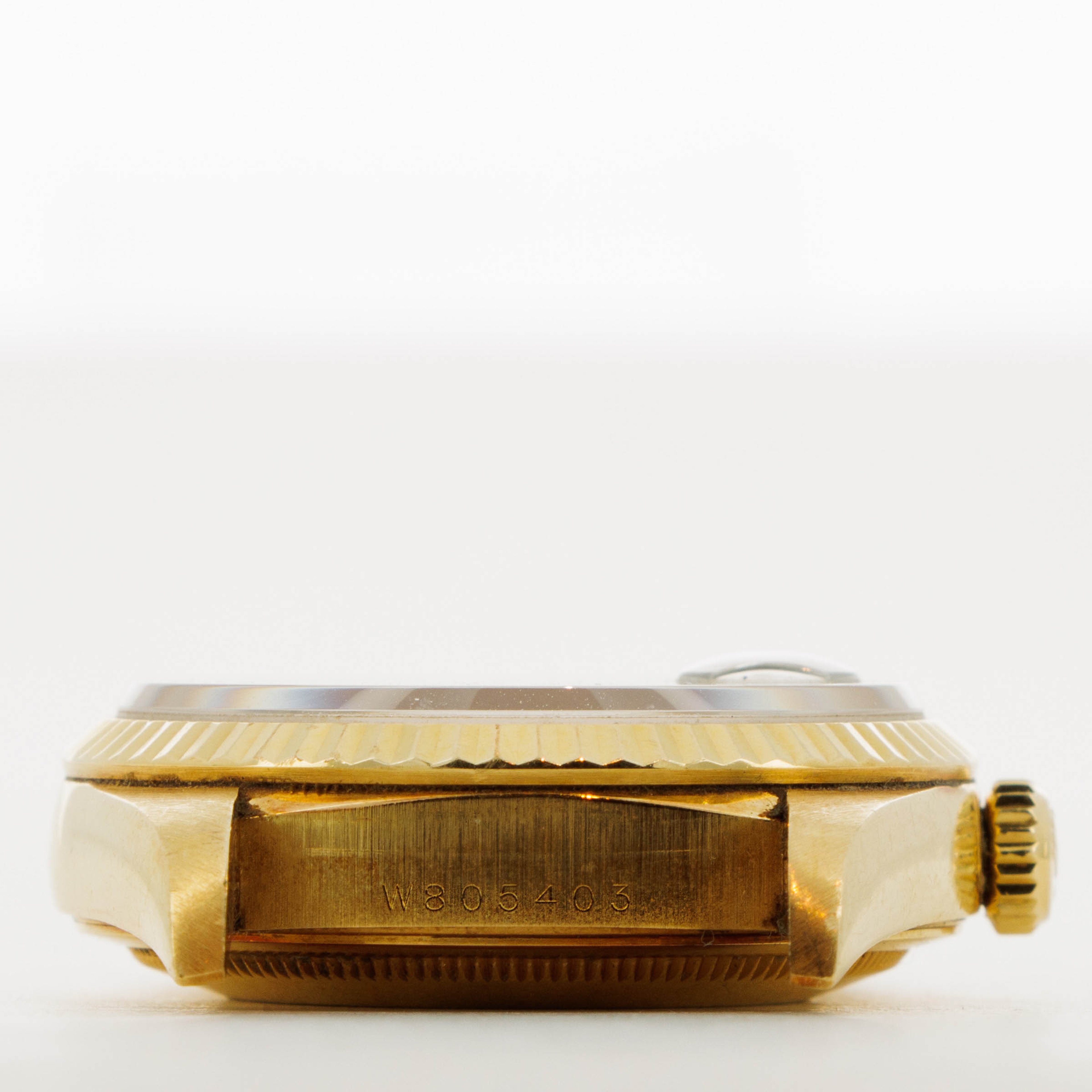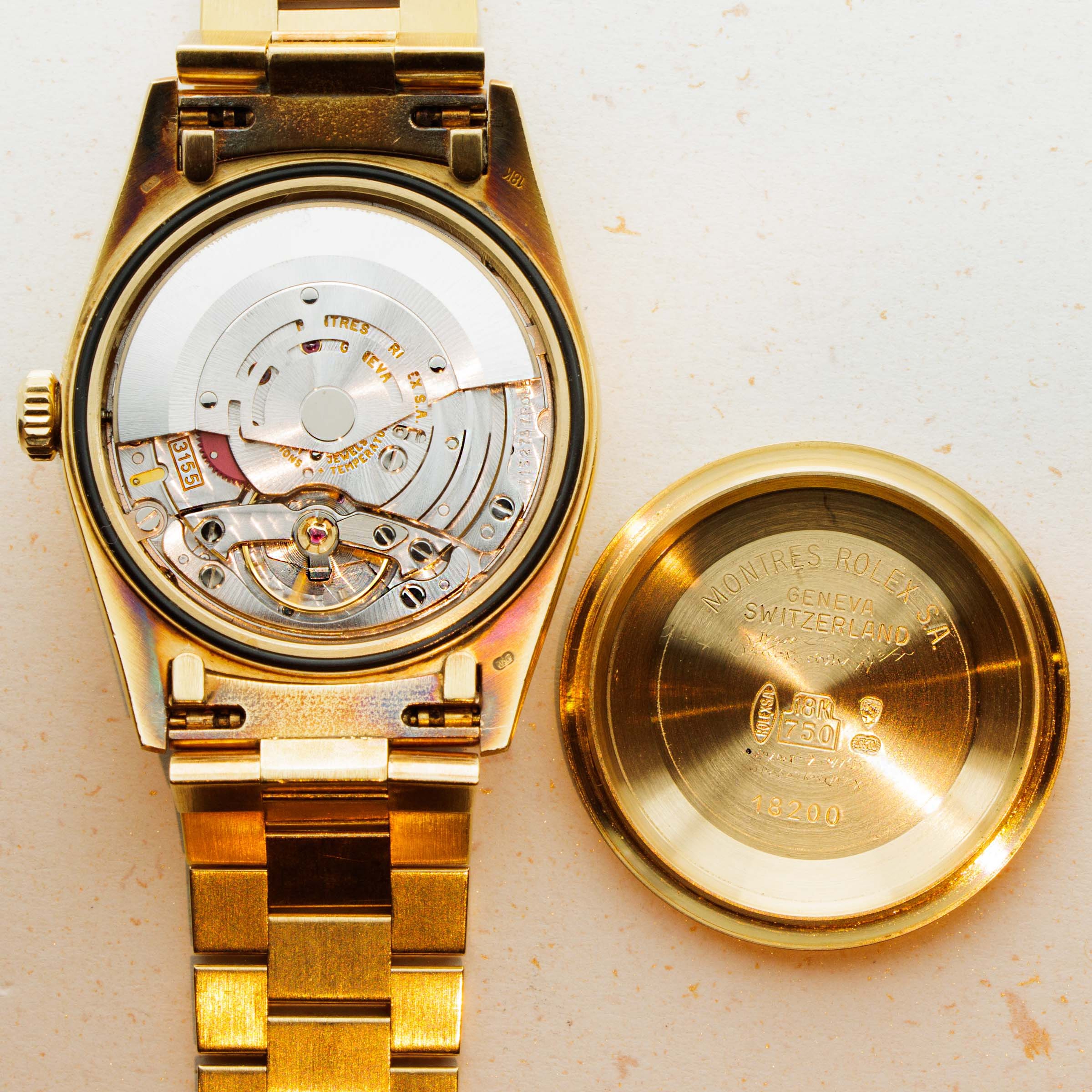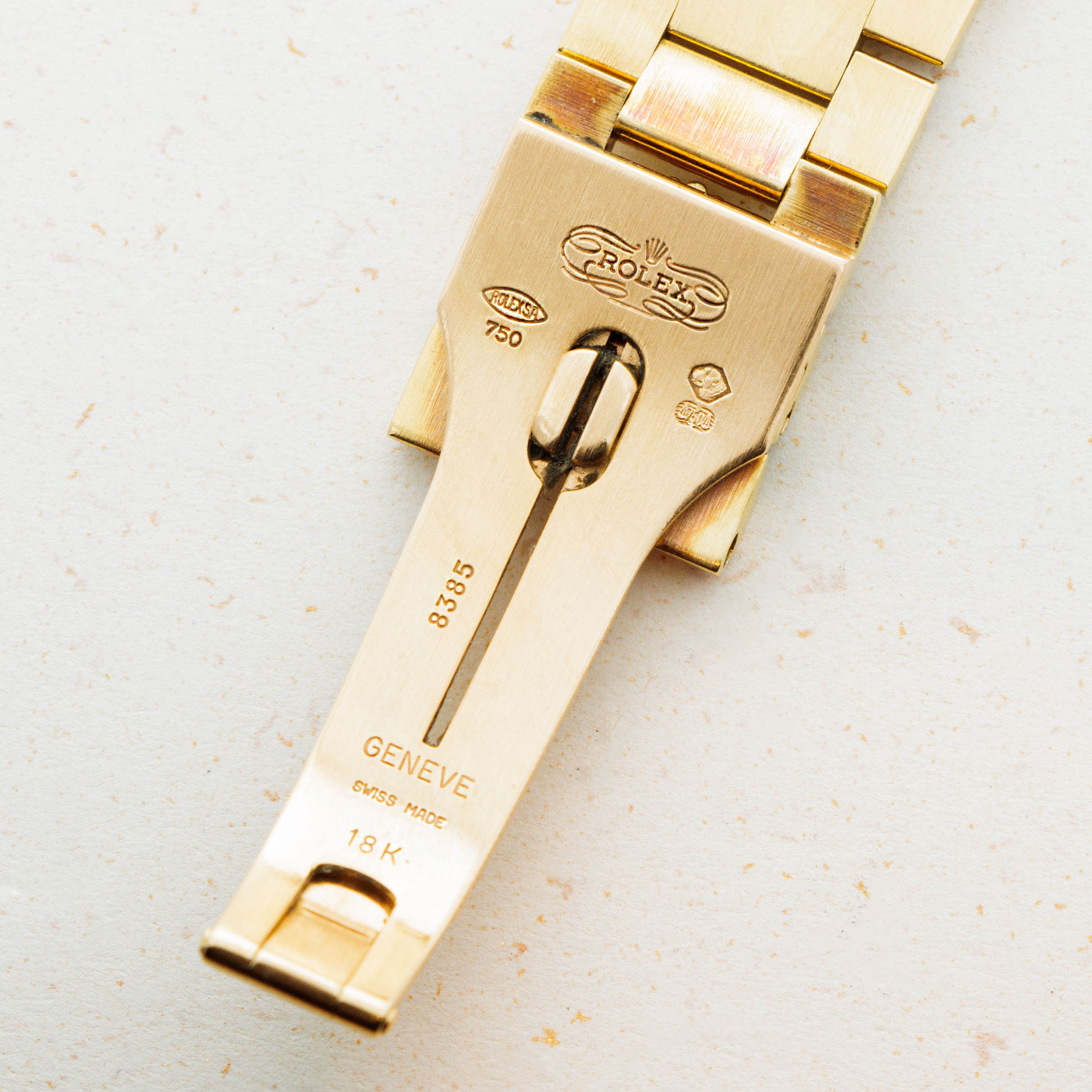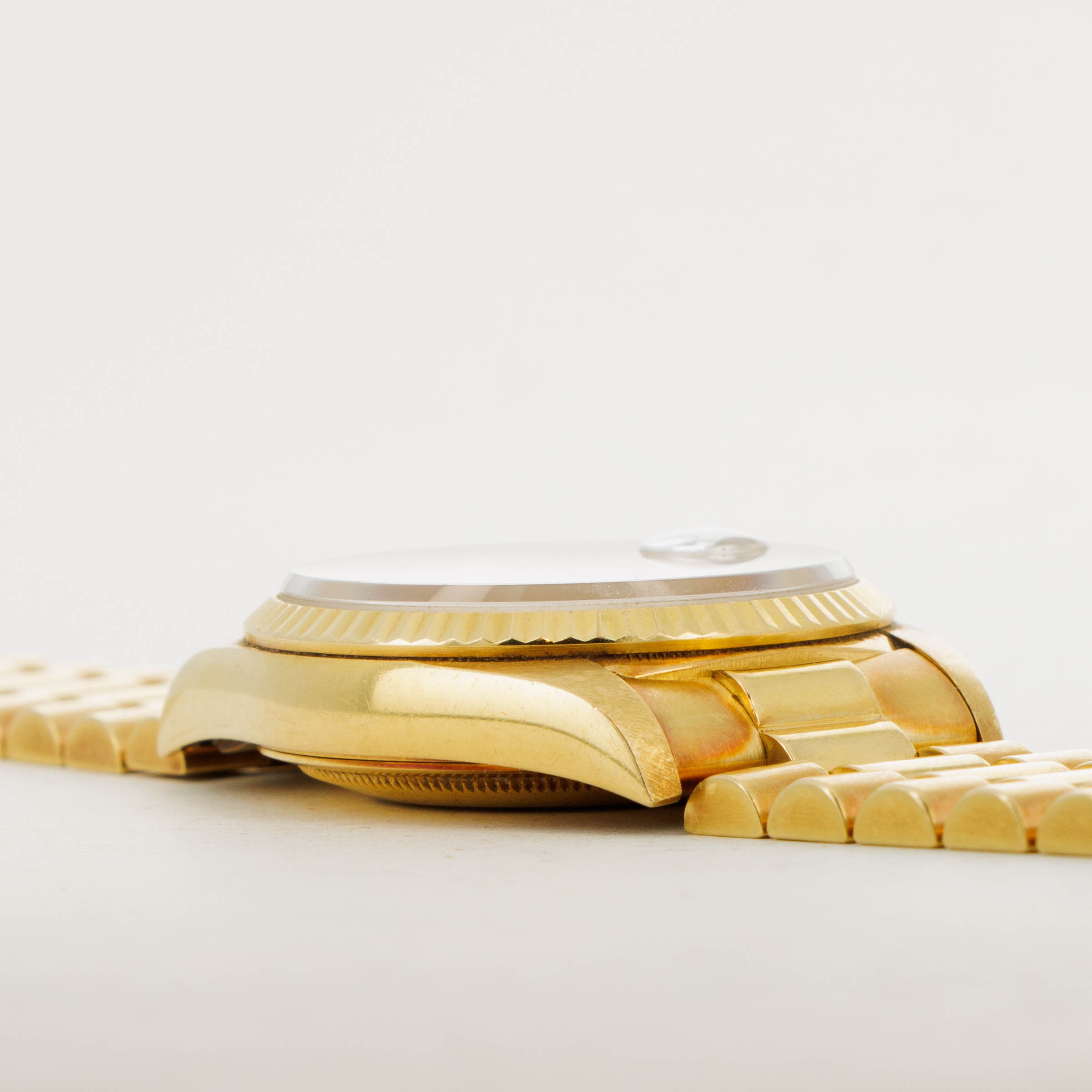 The signature hallmarks of Rolex's luxurious design, this ref. 18238 features a fluted 18k gold bezel and presidential bracelet, which combine to ensure the Day-Date sits on the wrist with a much-deserved sense of luxury. In addition, this wonderfully preserved example's 18kt gold construction has aged to include a rich orange patina that is just beautiful.