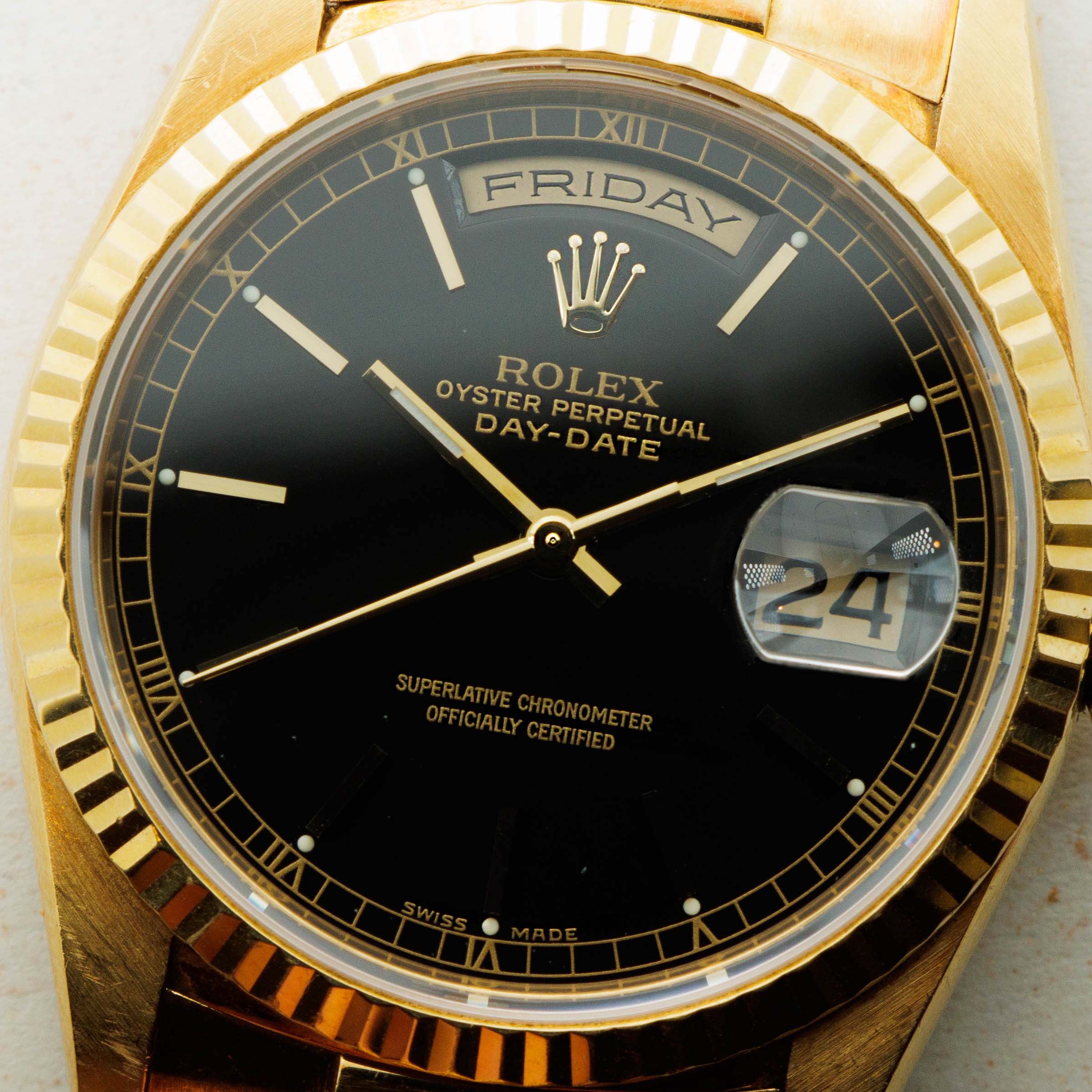 Featuring a stunning black dial, this Day-Date's display features gold inscriptions, hands and indices to match its construction and highlight the depth of its character.