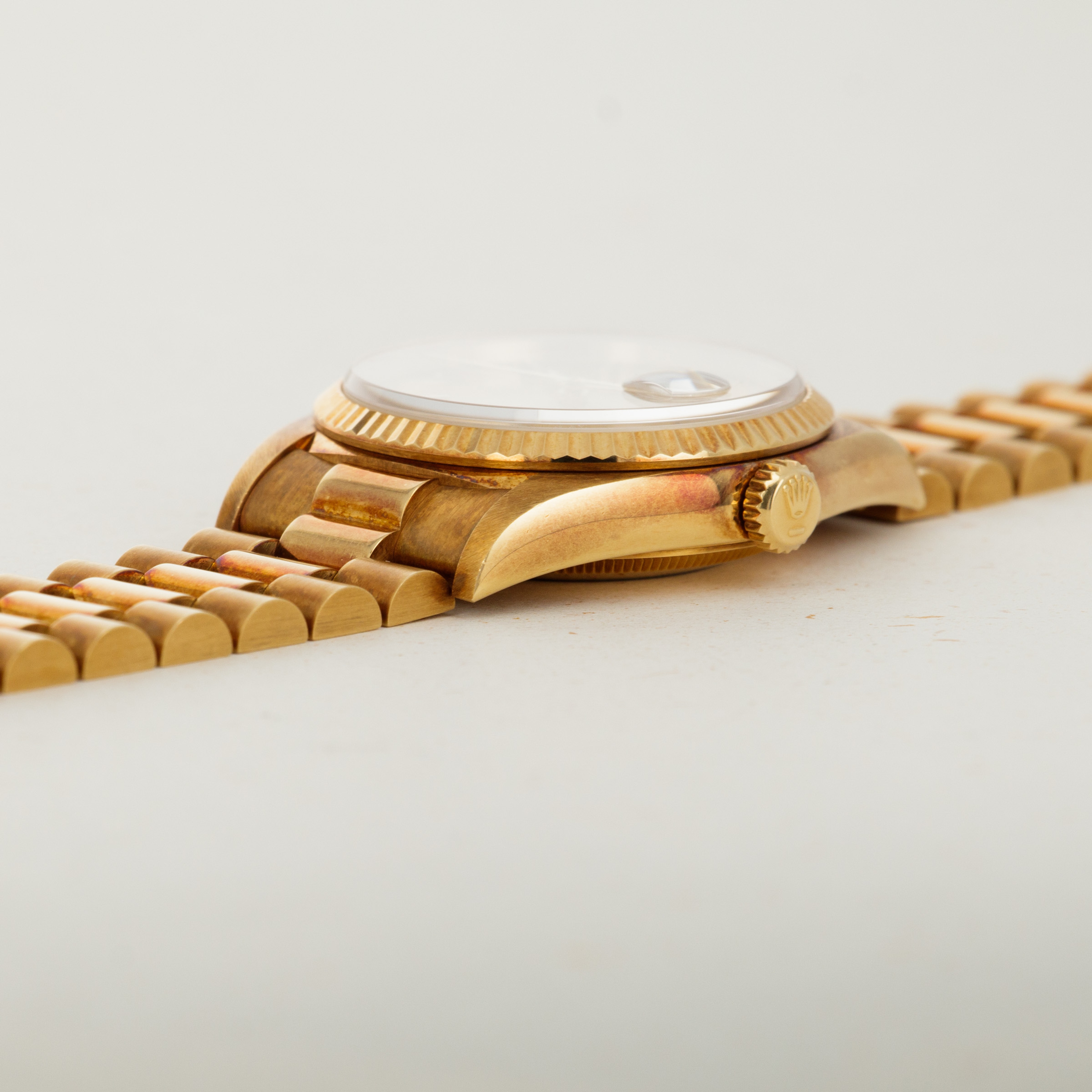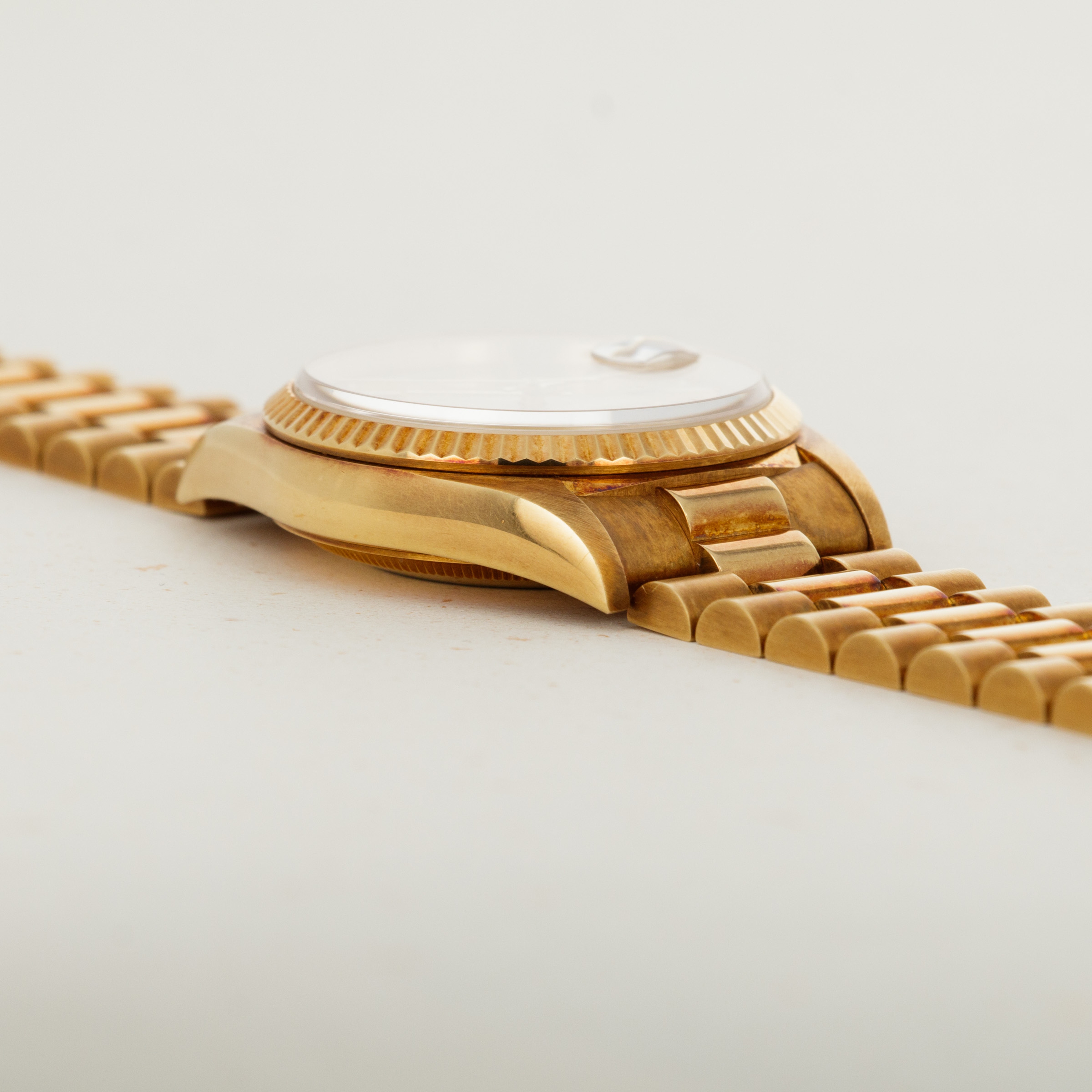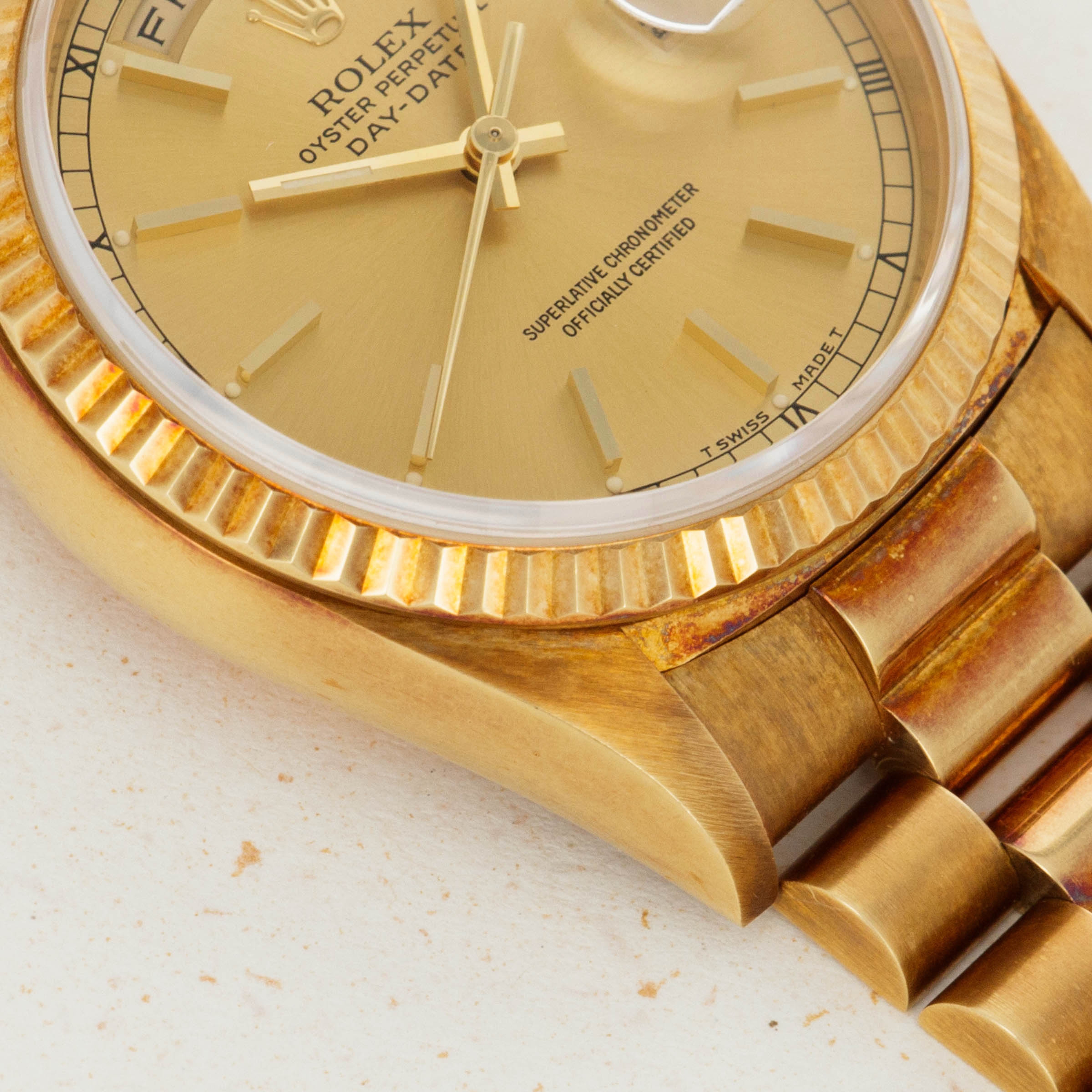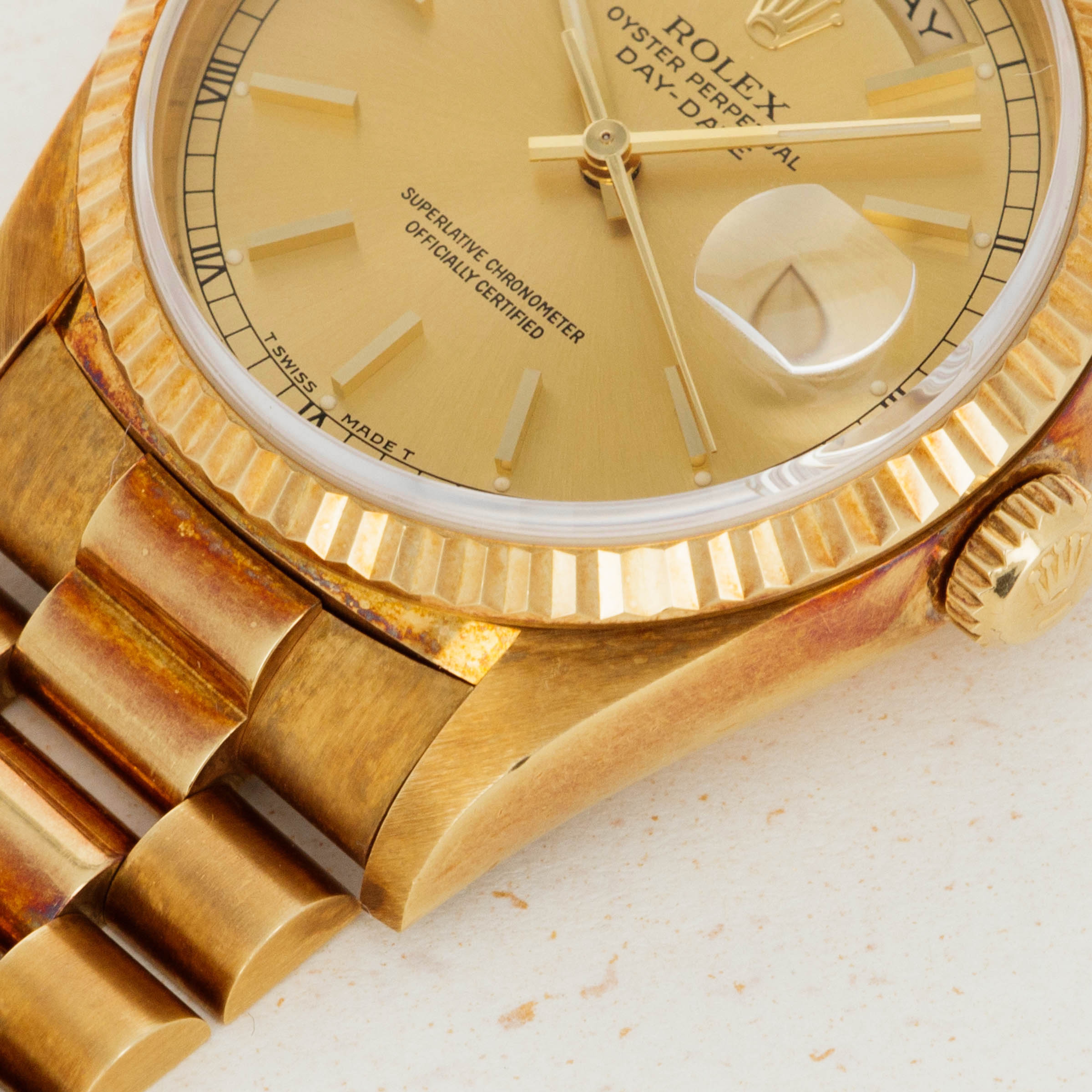 This ref. 18238's 18kt yellow gold construction is entirely classical in its design with the Day-Date's traditional 36mm case, iconic Presidential bracelet and wonderful fluted bezel. However, this example does include a wonderful patina across the surfaces of its case and bracelet that have given it a unique aesthetic on the wrist.