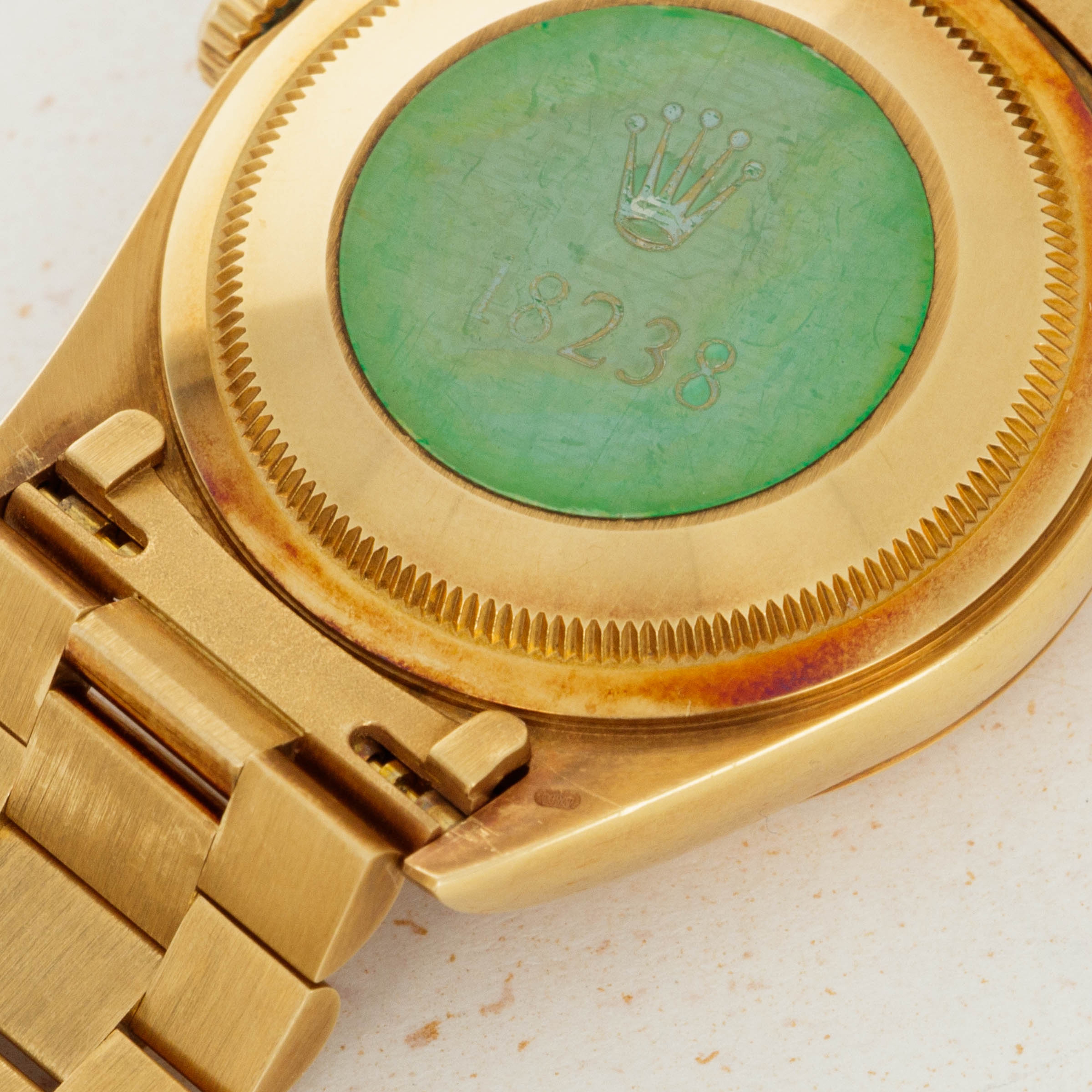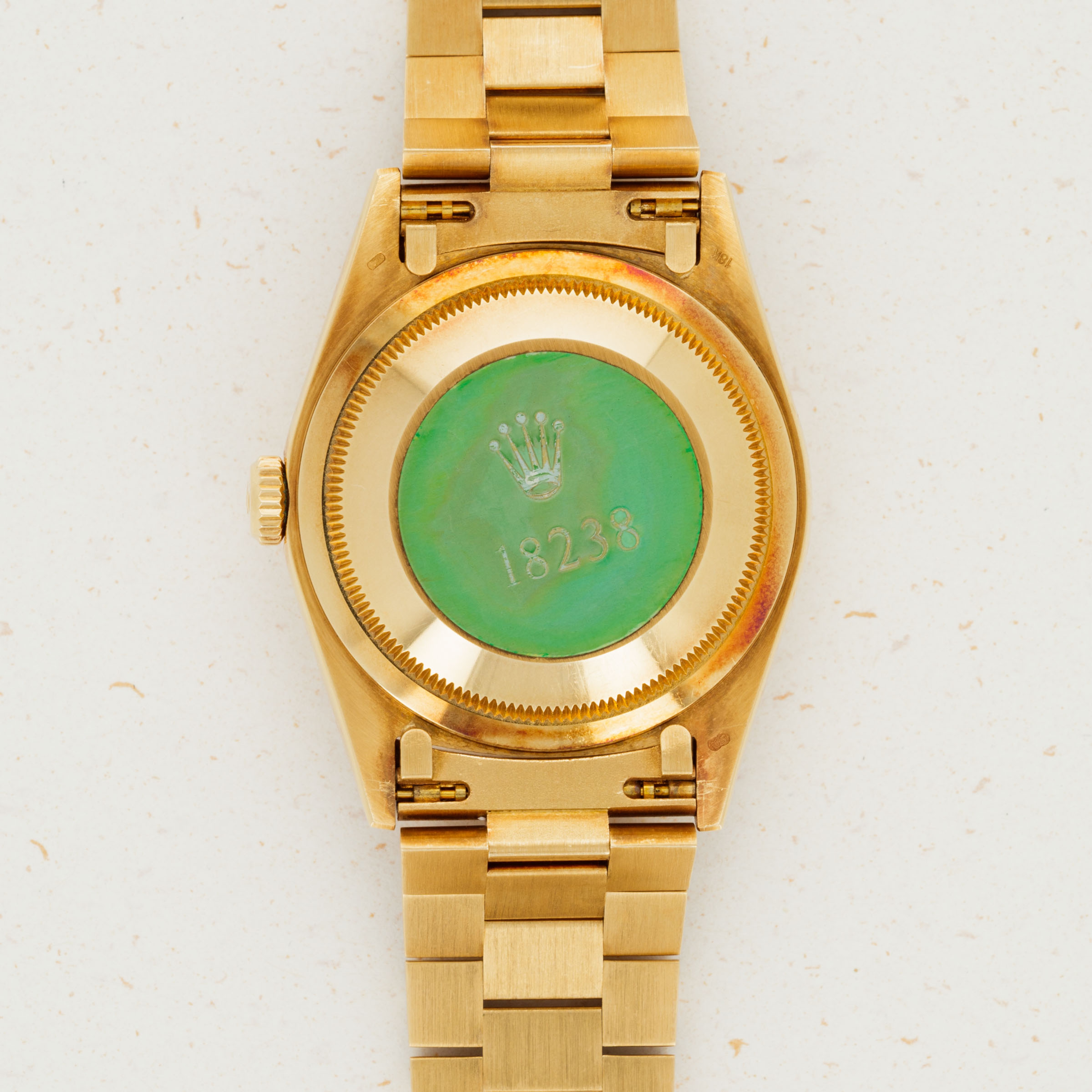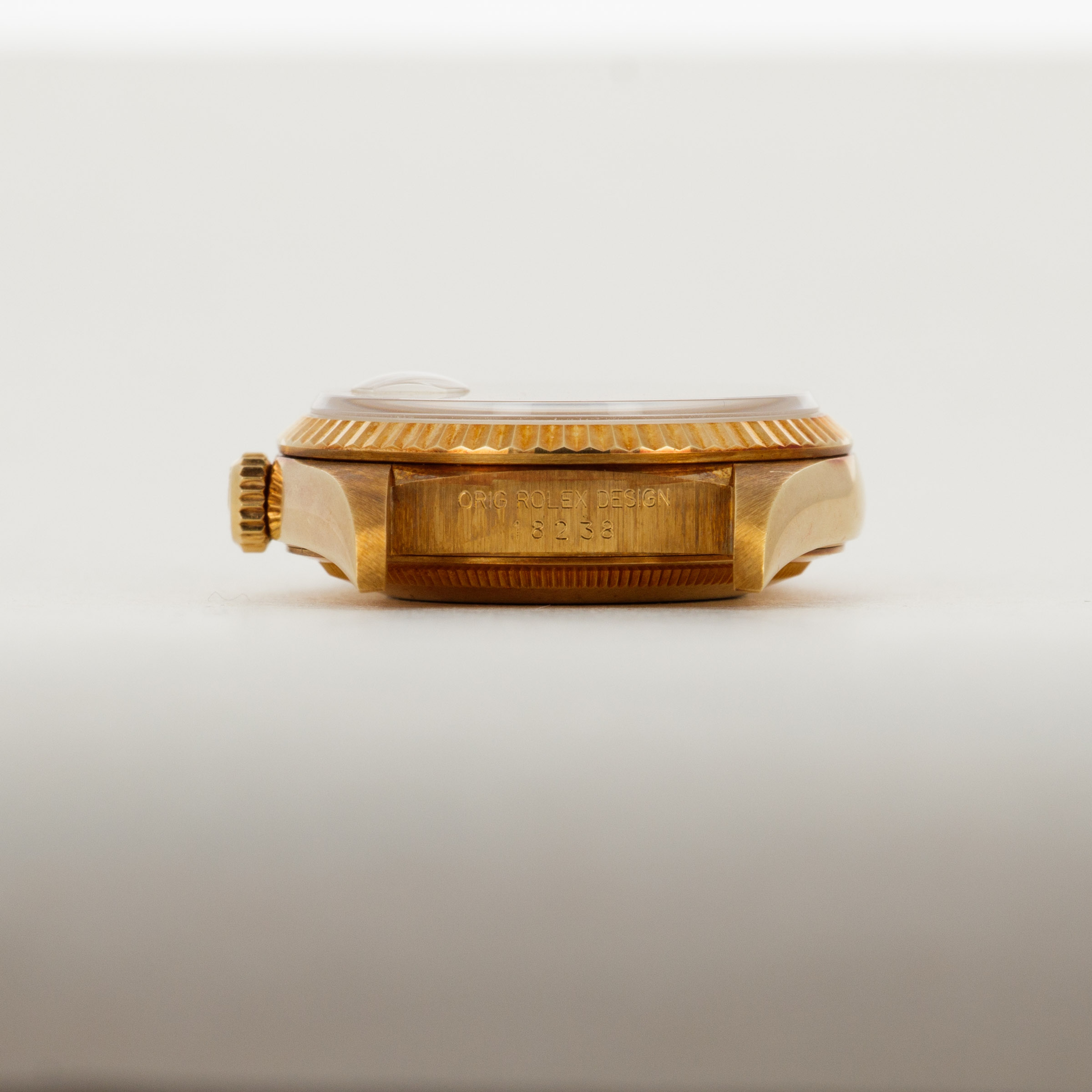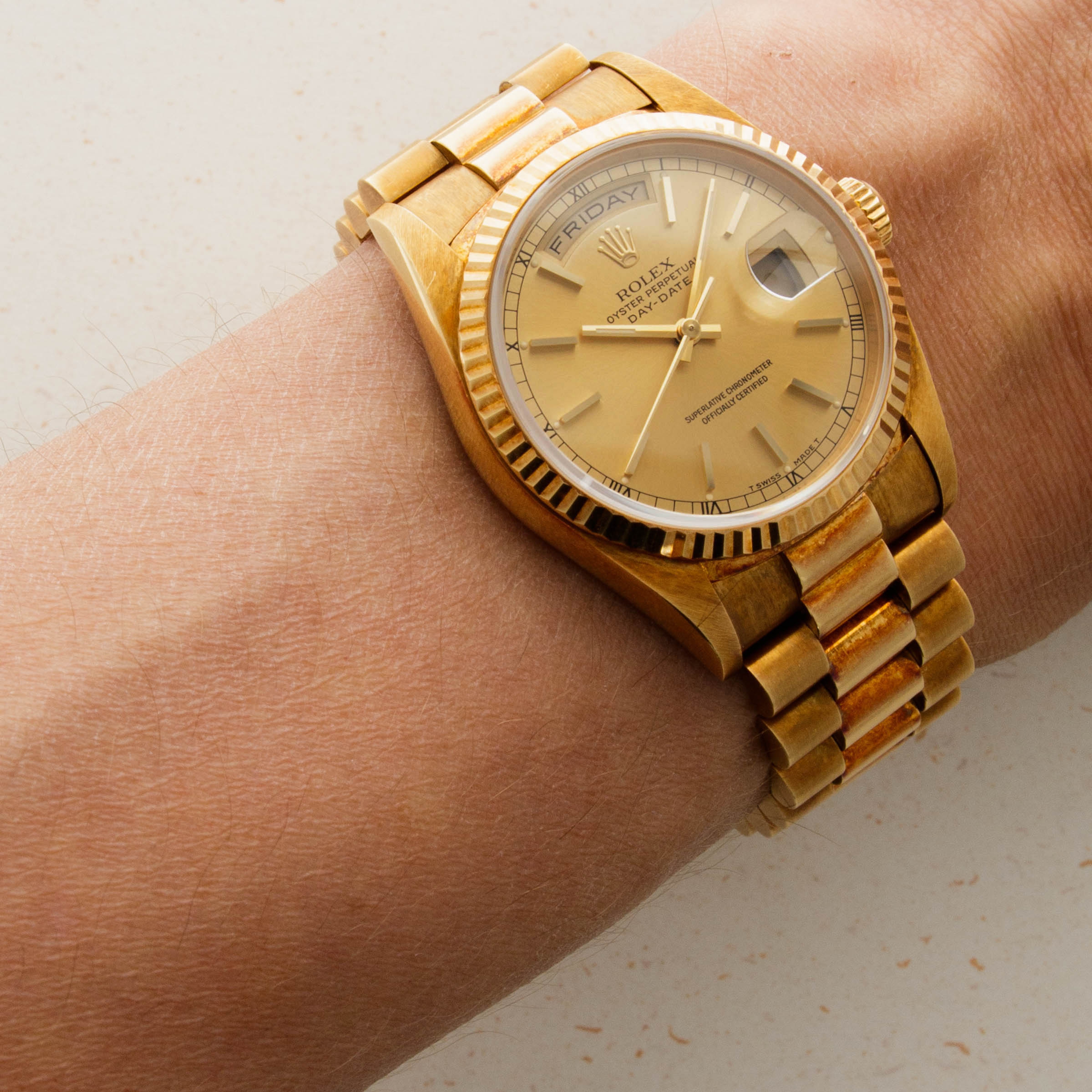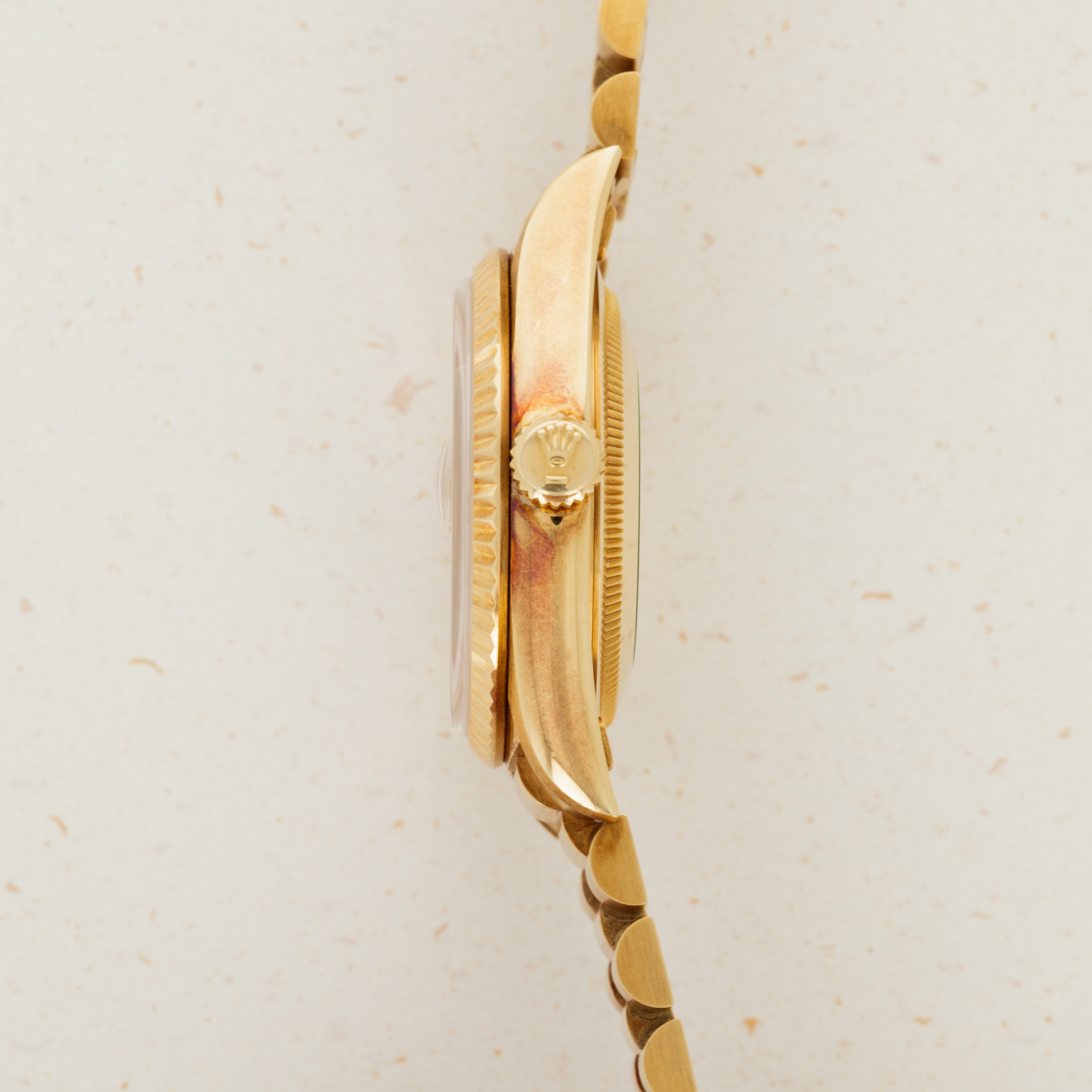This ref. 18238's 18kt yellow gold construction is entirely classical in its design with the Day-Date's traditional 36mm case, iconic Presidential bracelet and wonderful fluted bezel. However, this example does include a wonderful patina across the surfaces of its case and bracelet that have given it a unique aesthetic on the wrist.