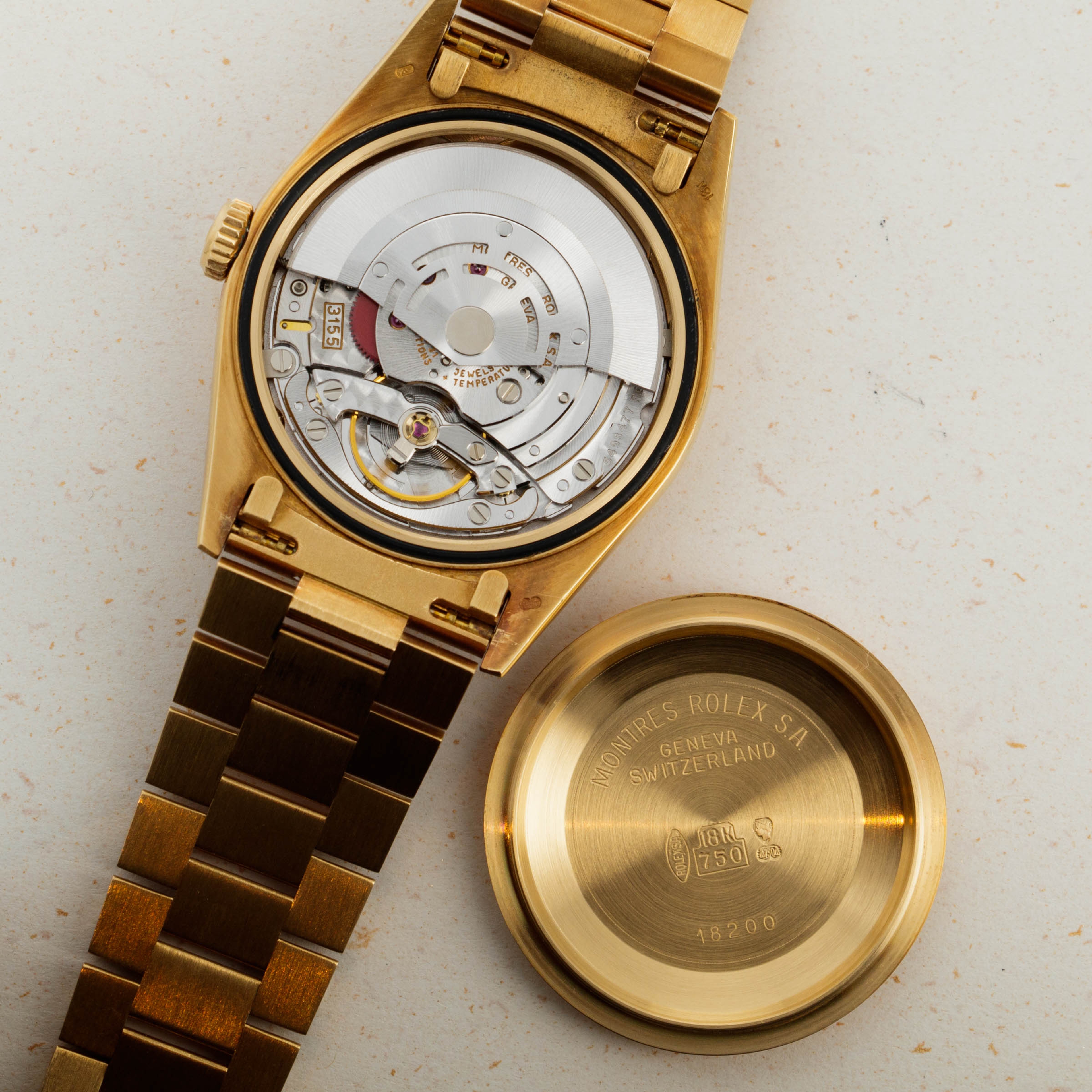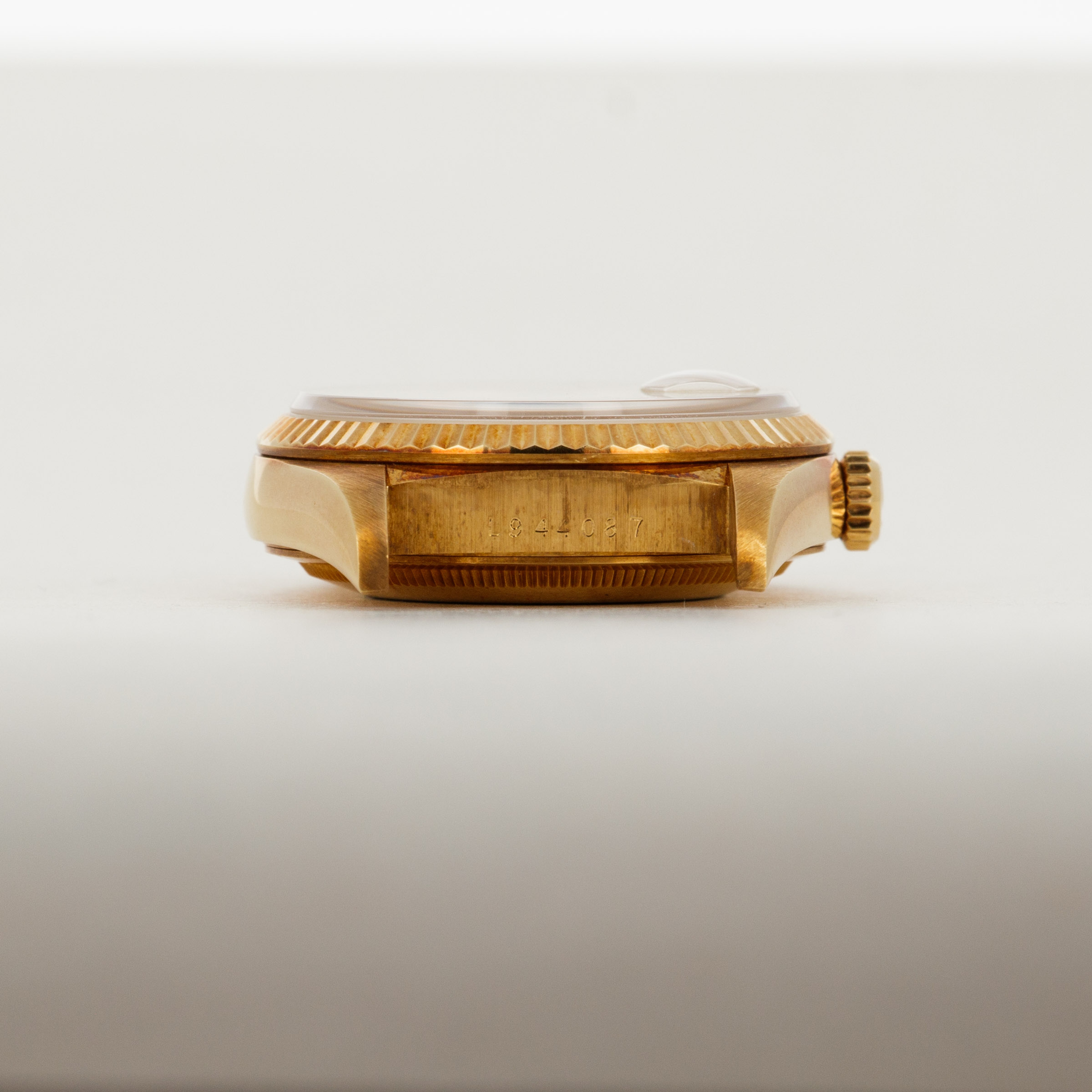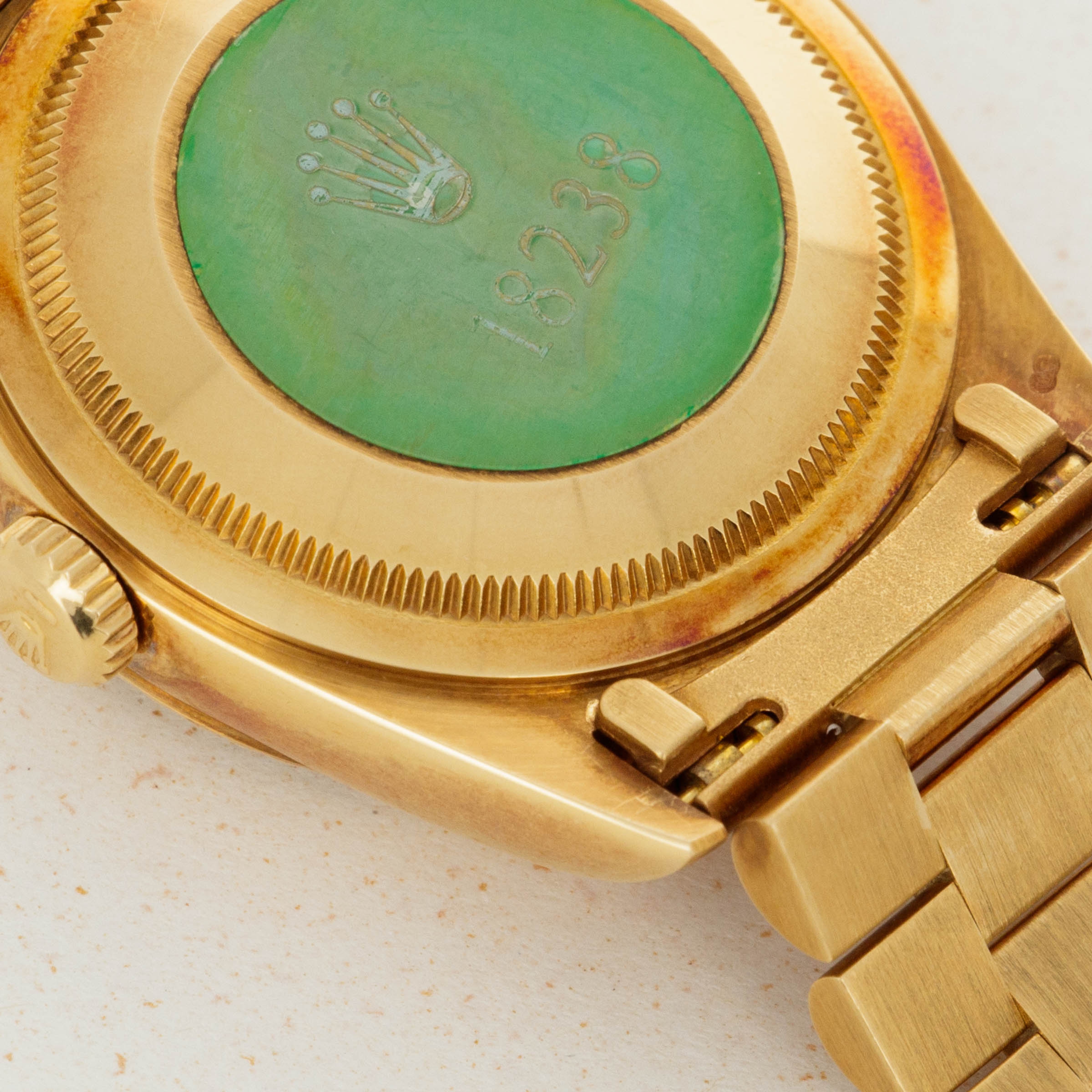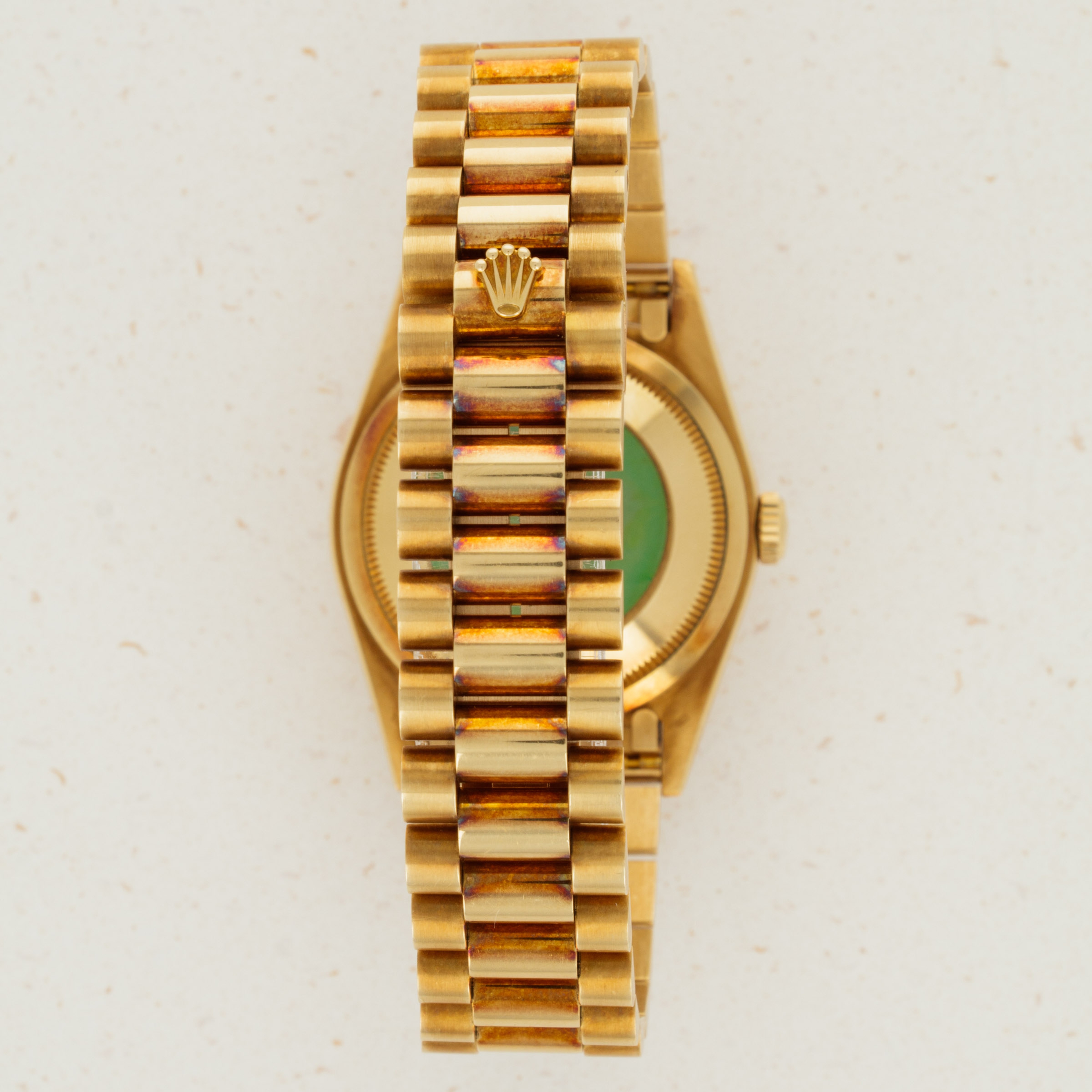 This ref. 18238's 18kt yellow gold construction is entirely classical in its design with the Day-Date's traditional 36mm case, iconic Presidential bracelet and wonderful fluted bezel. However, this example does include a wonderful patina across the surfaces of its case and bracelet that have given it a unique aesthetic on the wrist.