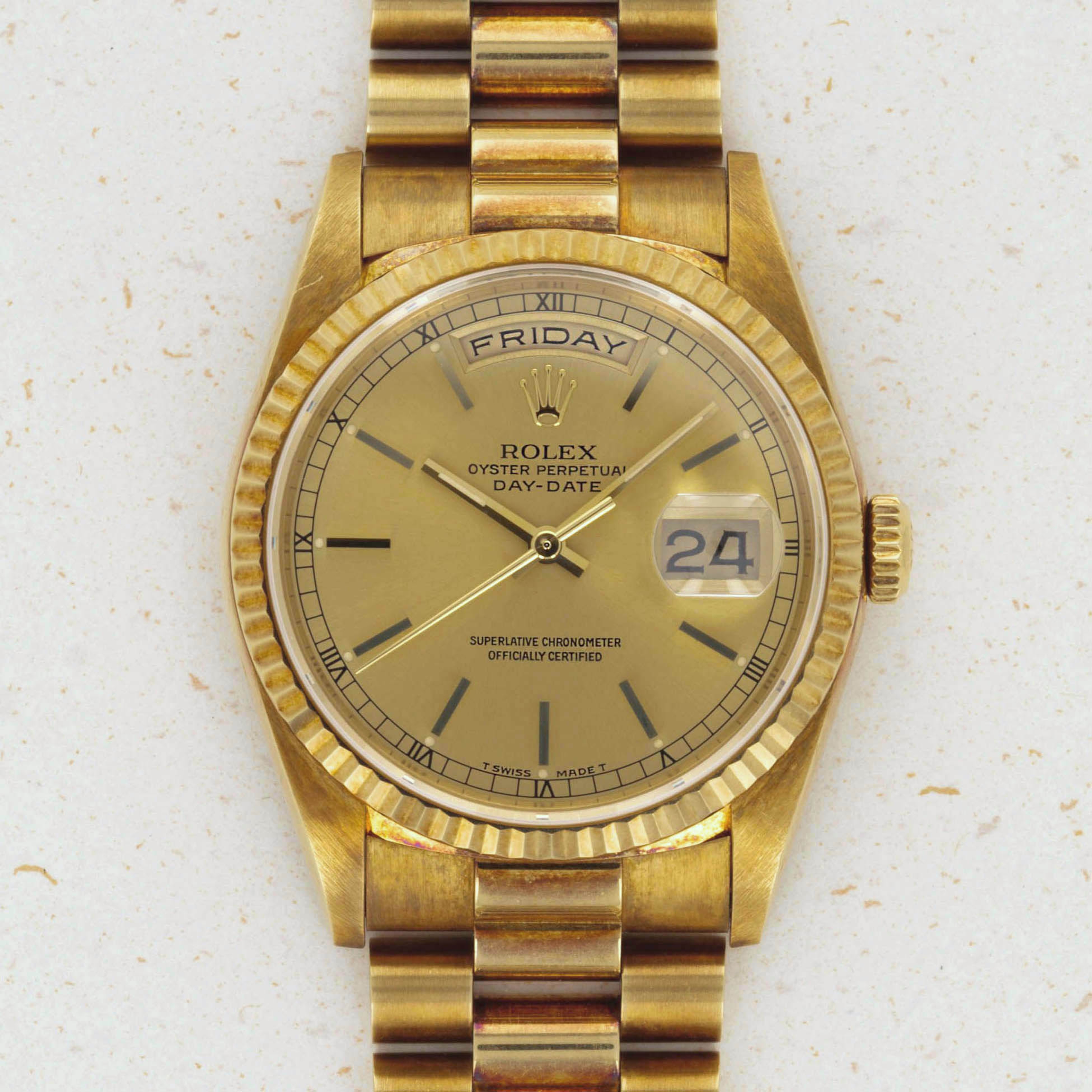 A legendary timepiece with an unrivaled history, the Rolex Day-Date has earned its place as "The Ultimate Watch of Prestige" from its decades on the wrists of the world's most influential people. Released in 1956, the Day-Date quickly became synonymous with luxury, prestige, and exclusivity thanks to being the watch of choice for the world's athletes, visionaries, and world leaders alike. Only ever constructed of precious metals, the Day-Date's aesthetic is that of sheer elegance and grace. Aside from the beautiful array of dial options that have been available over the decades, the Day-Date's most iconic piece of design is its three-piece "Presidential" or "President" bracelet. Forming the bedrock of its design, the Presidential bracelet has become synonymous with Rolex's flagship collection and their desire to create the very best and most iconic watches that the world has ever seen. With its timeless design and inescapable impact on horology, the Day-Date stands as a vivid reminder of just how successful they have been in realizing that very mission.