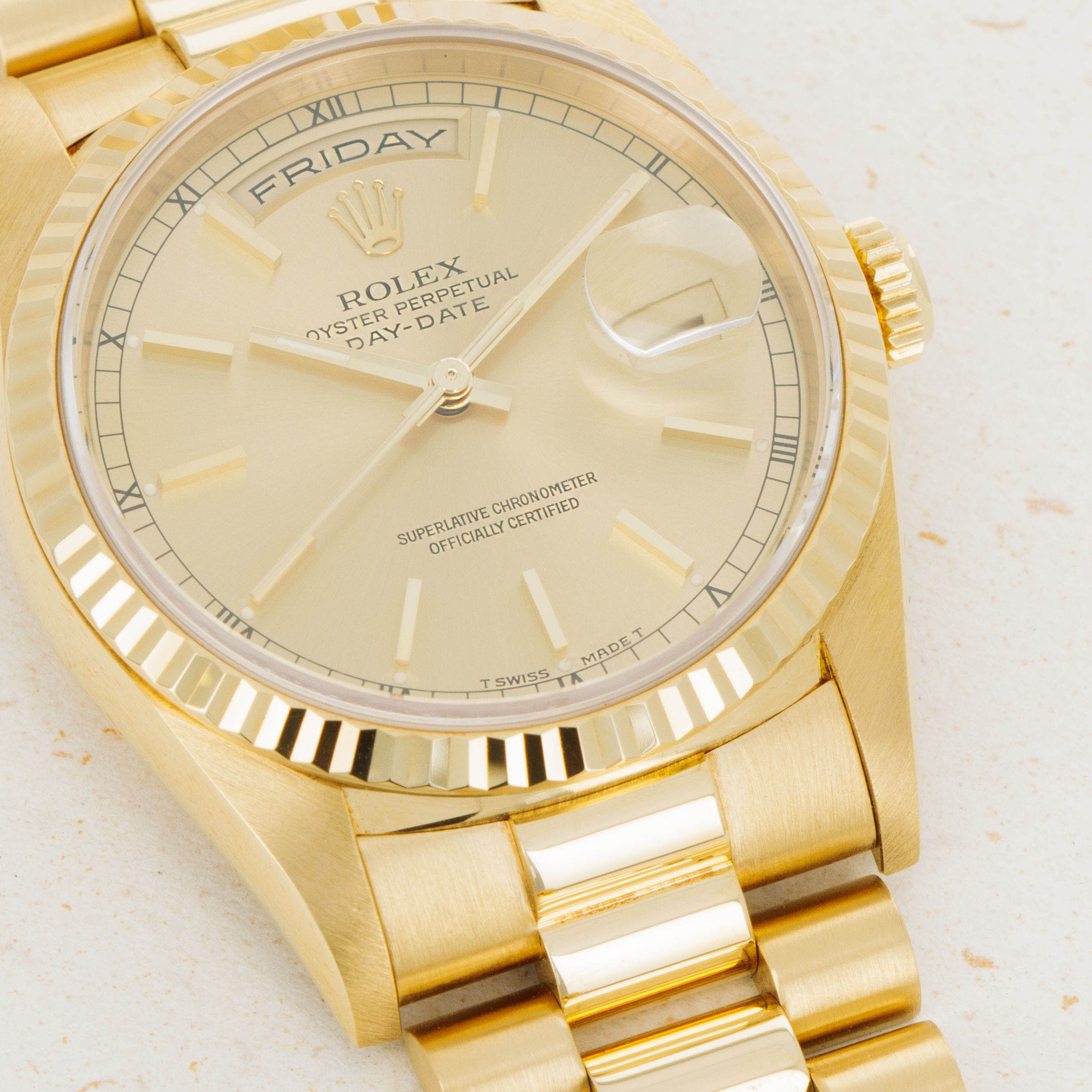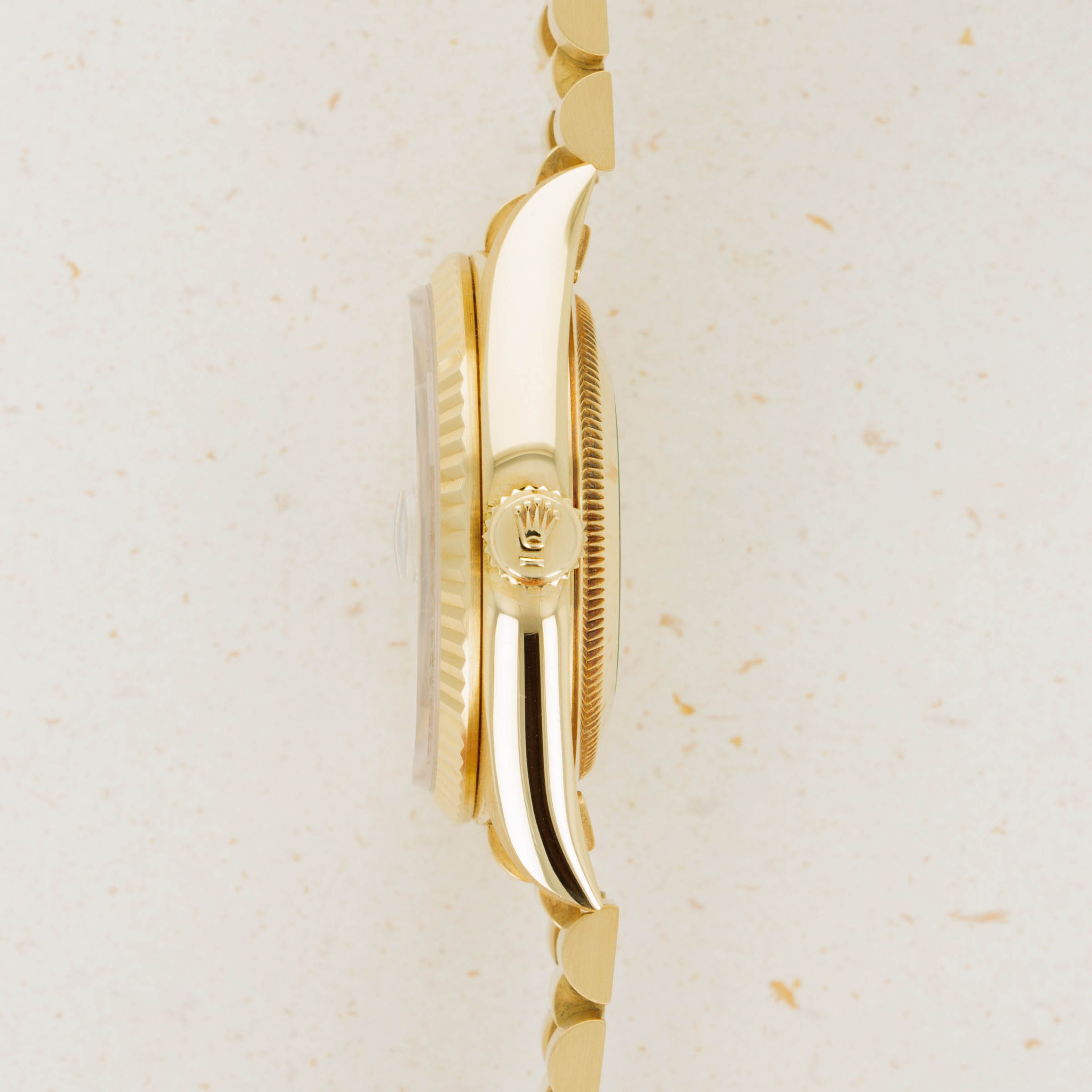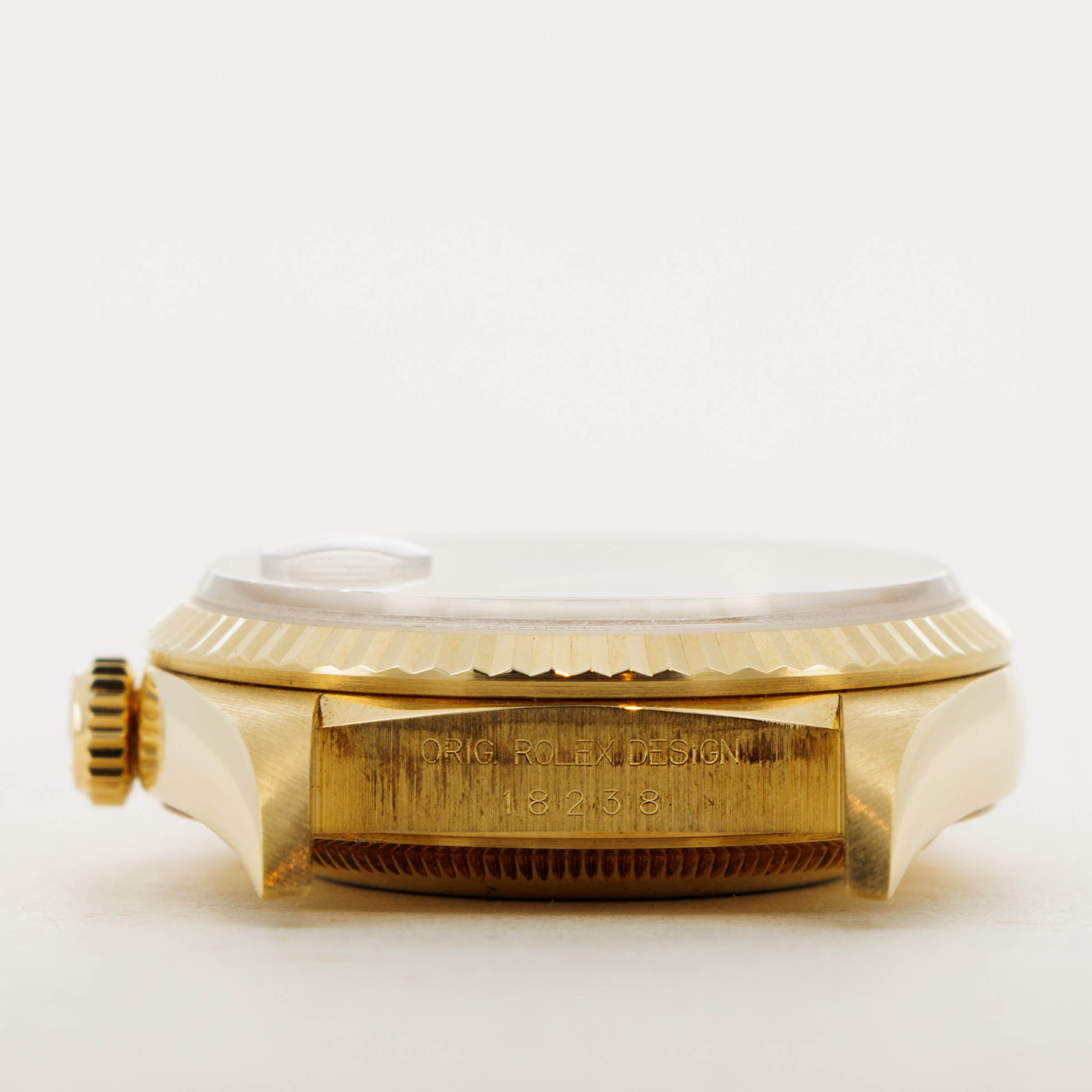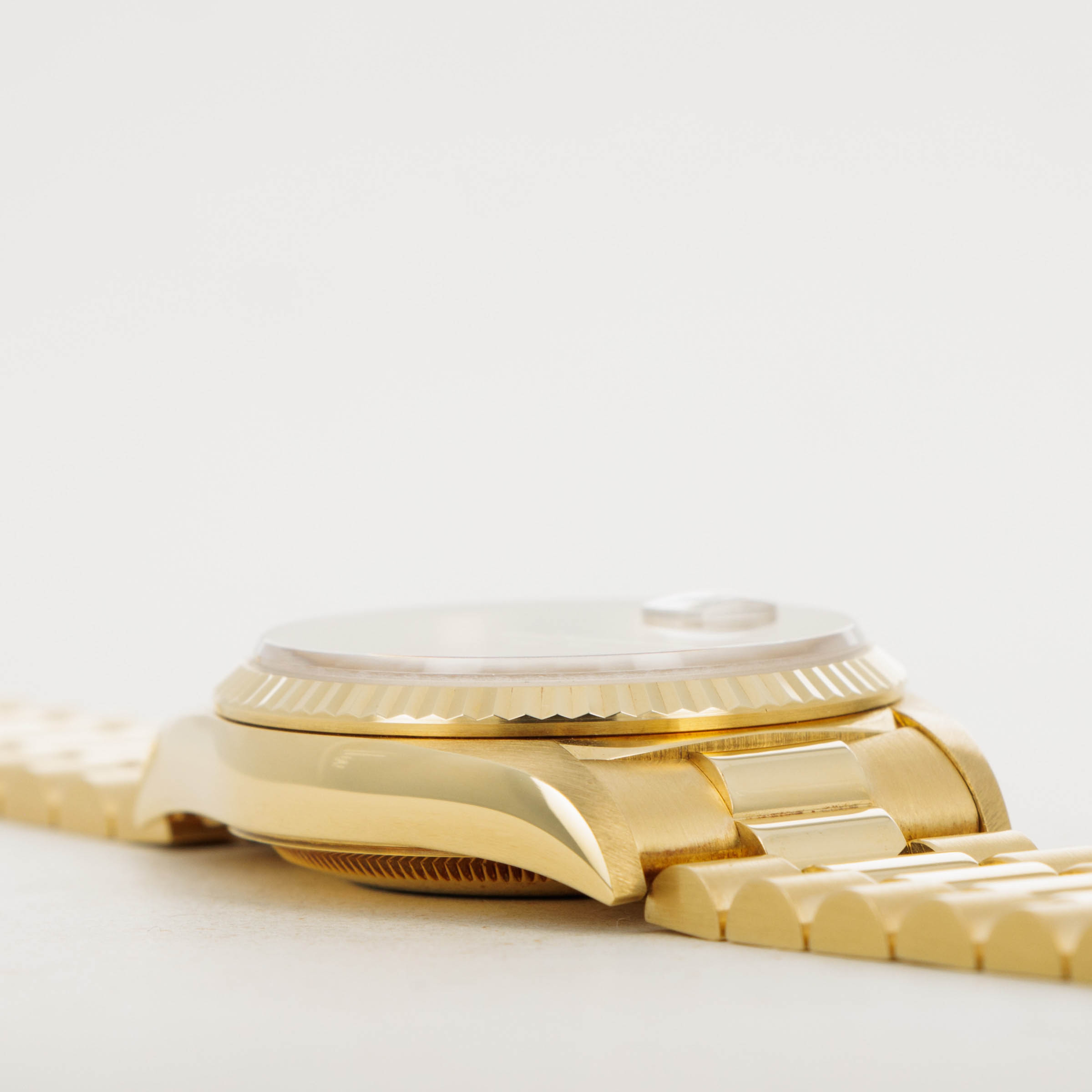 This ref. 18238's 18kt yellow gold construction is entirely classical in its design with the Day-Date's traditional 36mm case, iconic Presidential bracelet and wonderful fluted bezel.