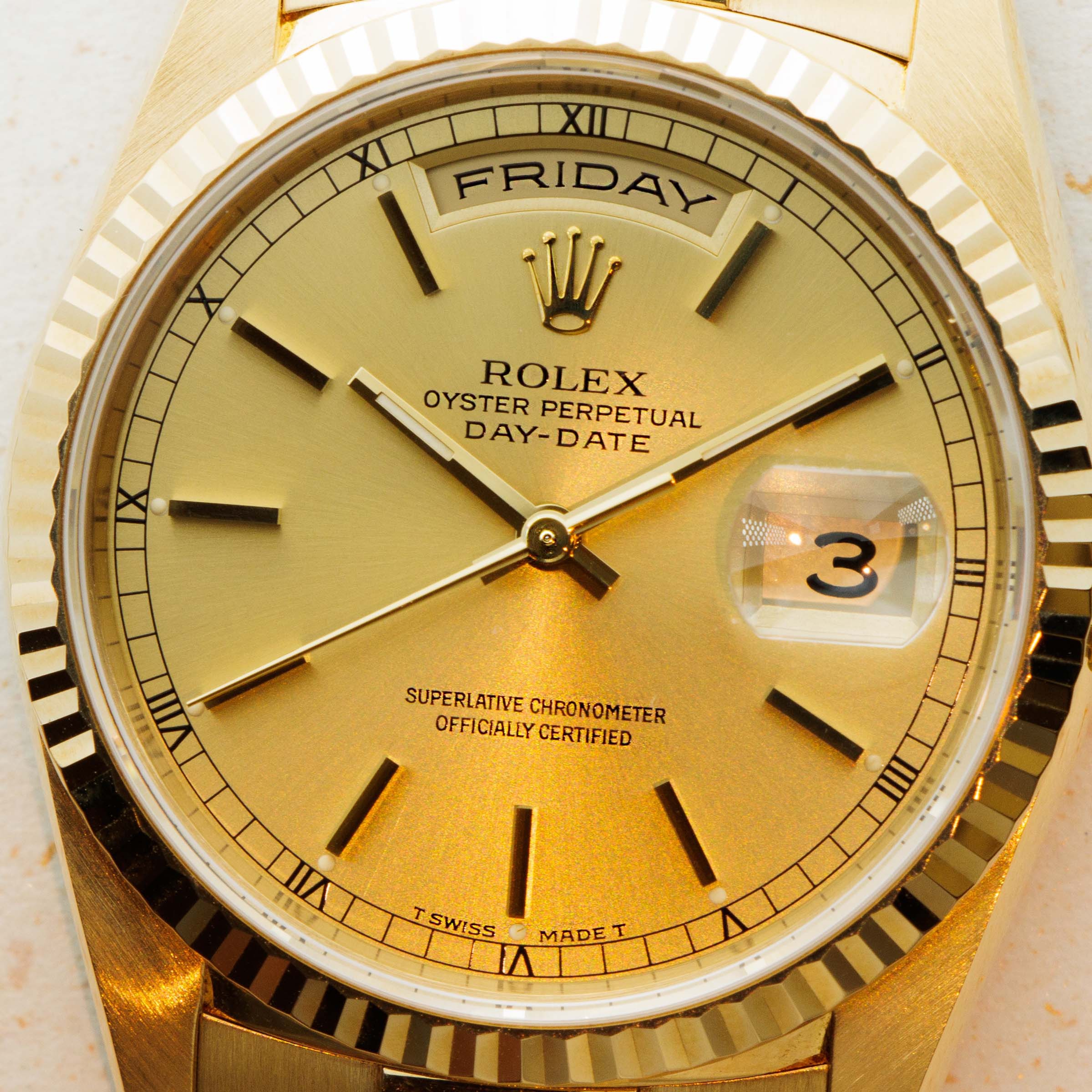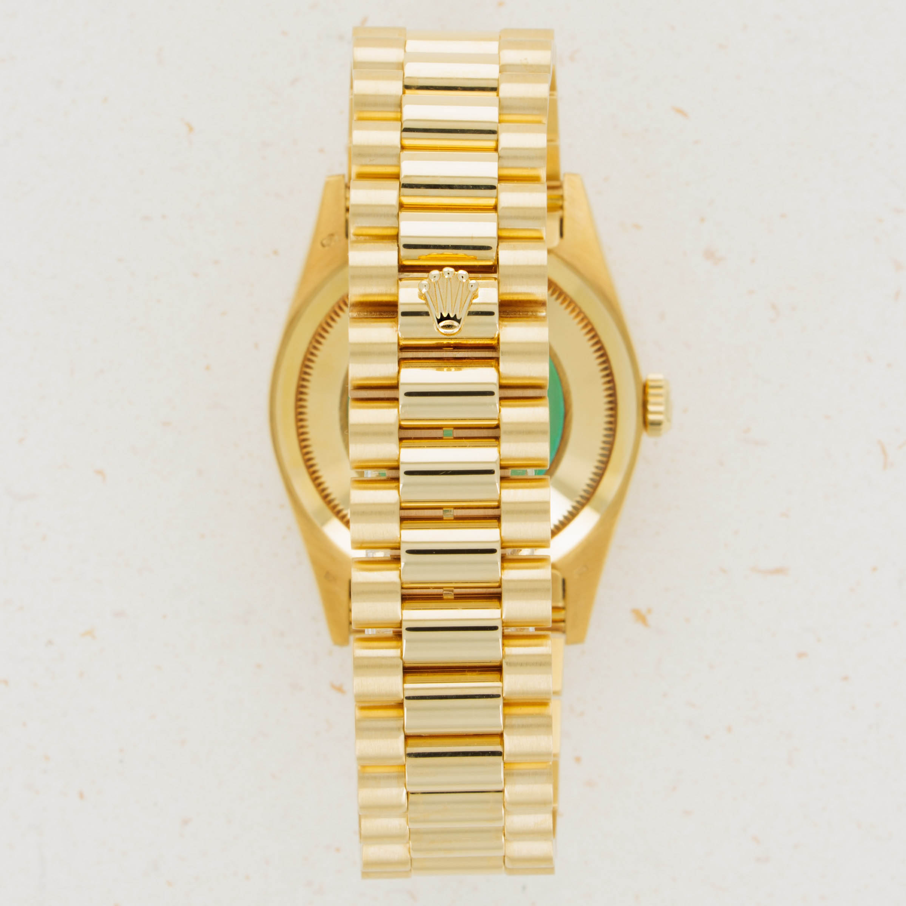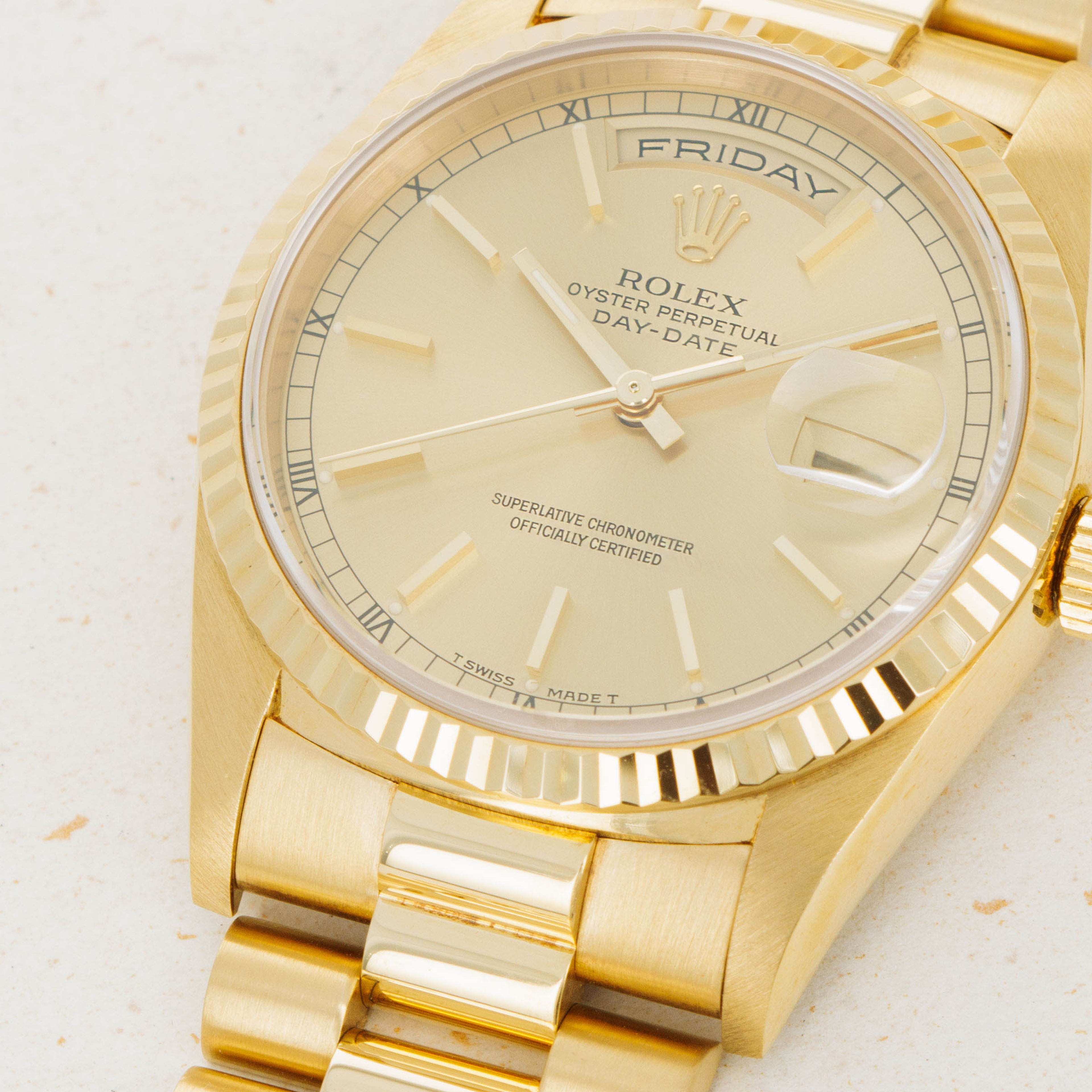 This ref. 18238's 18kt yellow gold construction is entirely classical in its design with the Day-Date's traditional 36mm case, iconic Presidential bracelet and wonderful fluted bezel.