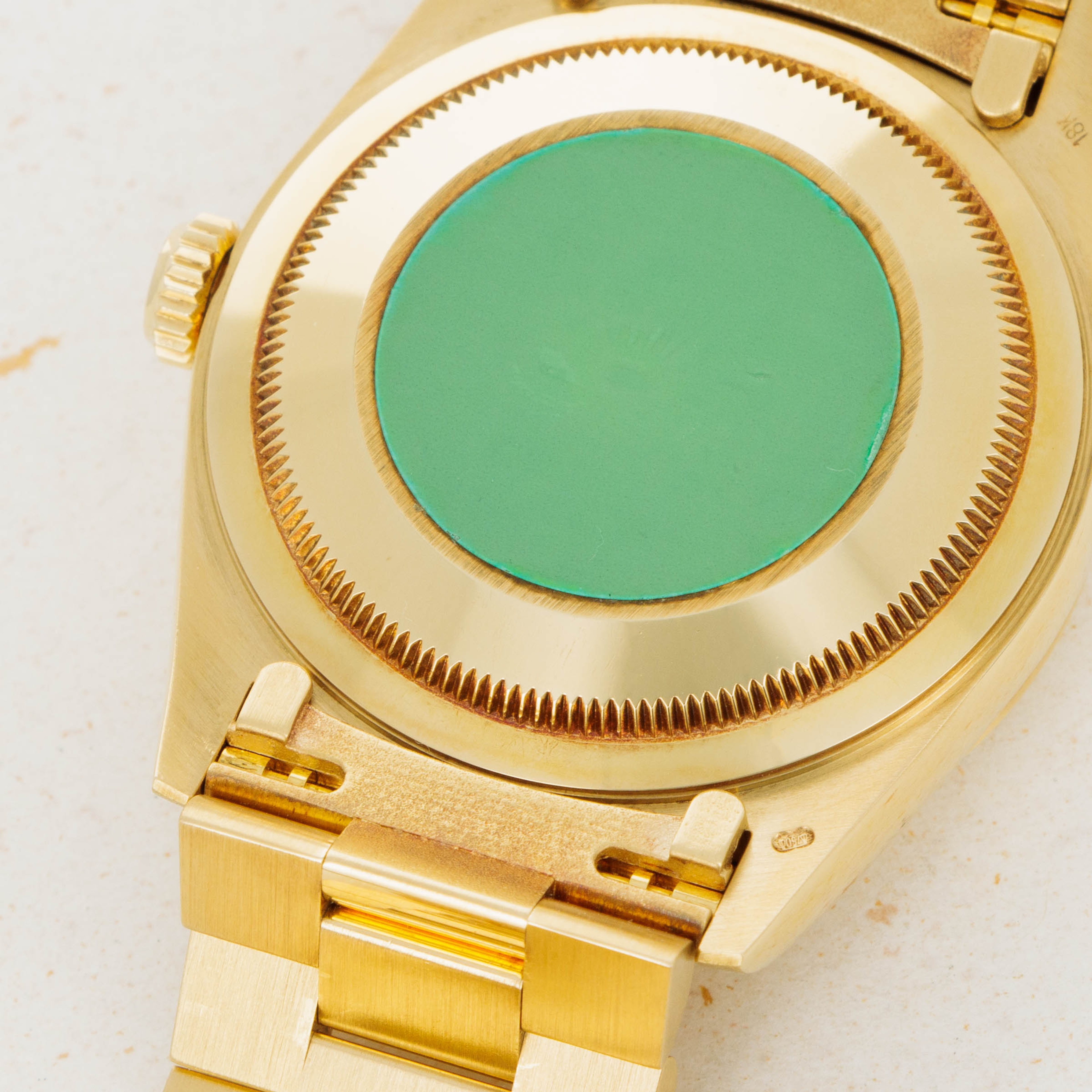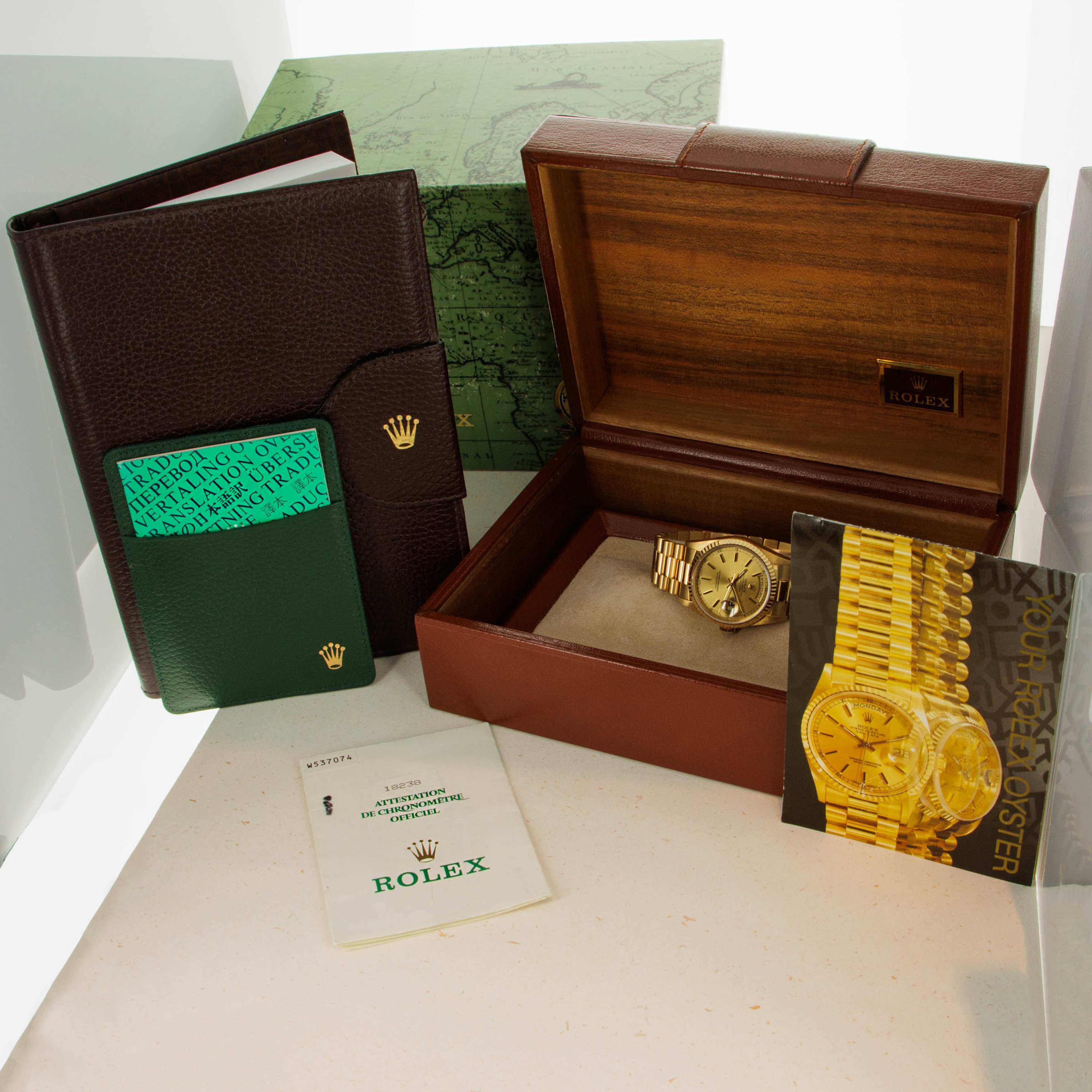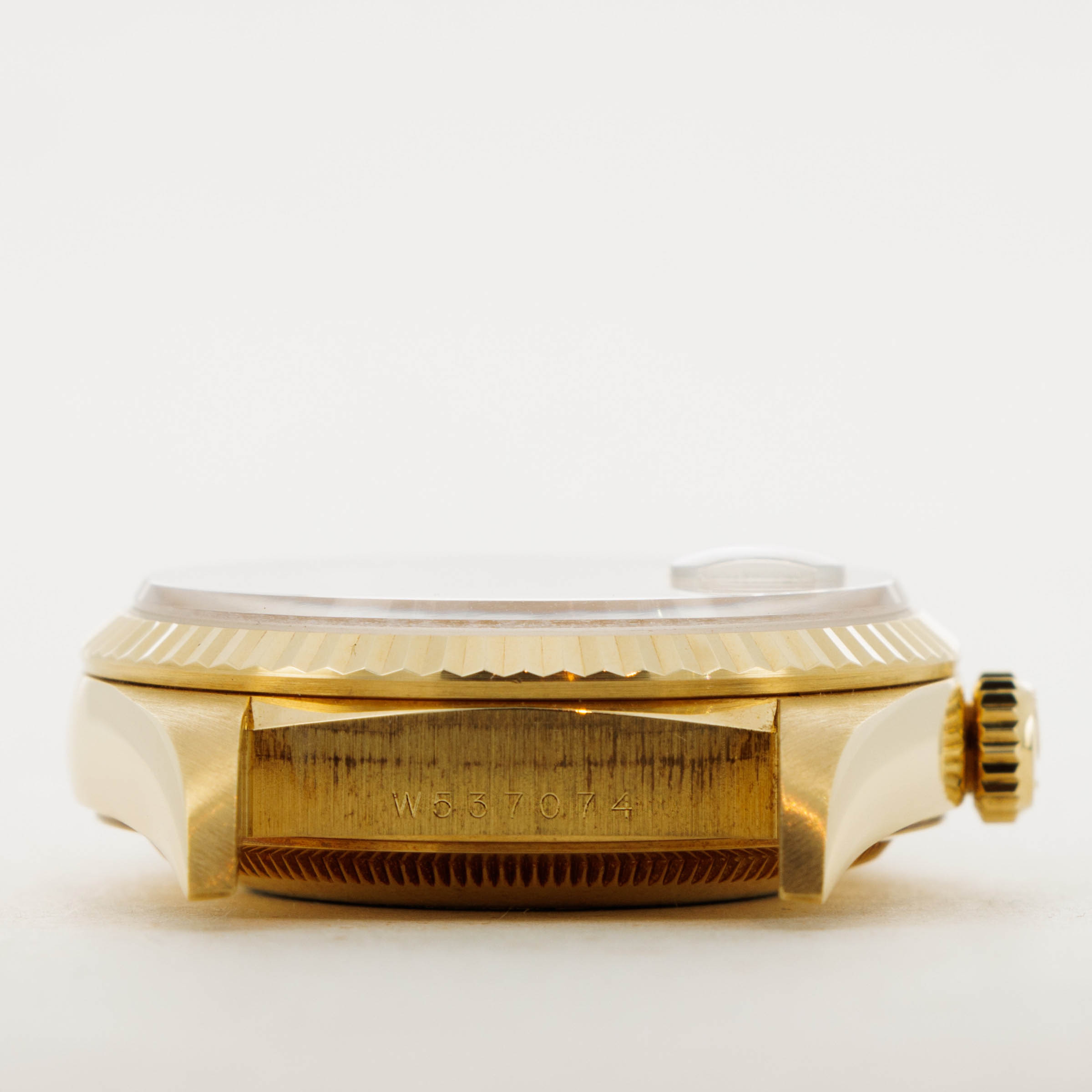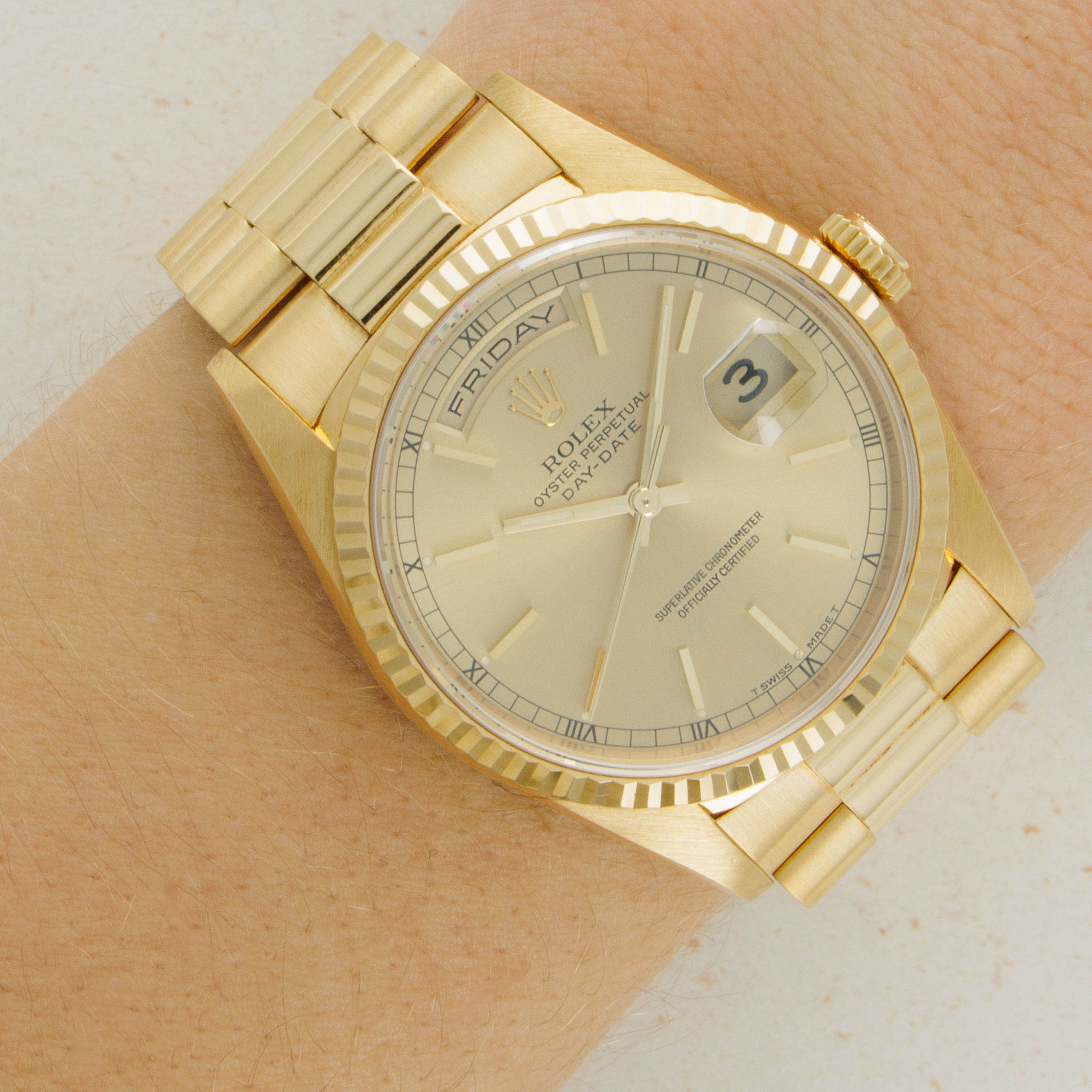 This ref. 18238's 18kt yellow gold construction is entirely classical in its design with the Day-Date's traditional 36mm case, iconic Presidential bracelet and wonderful fluted bezel.